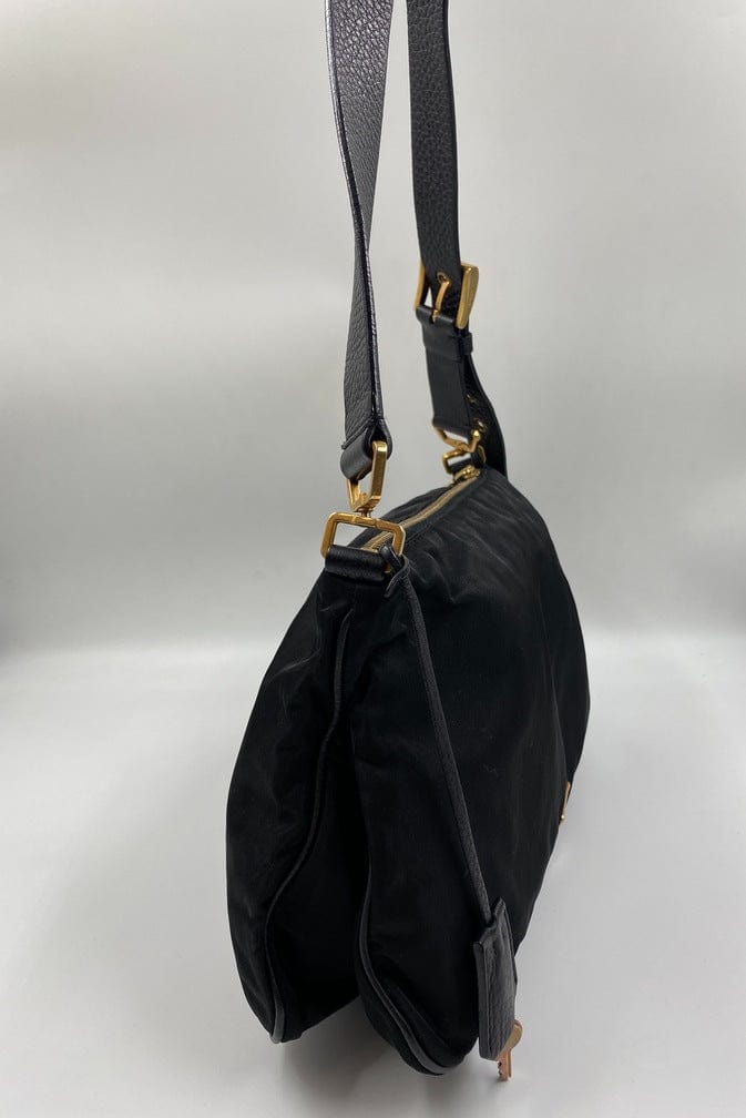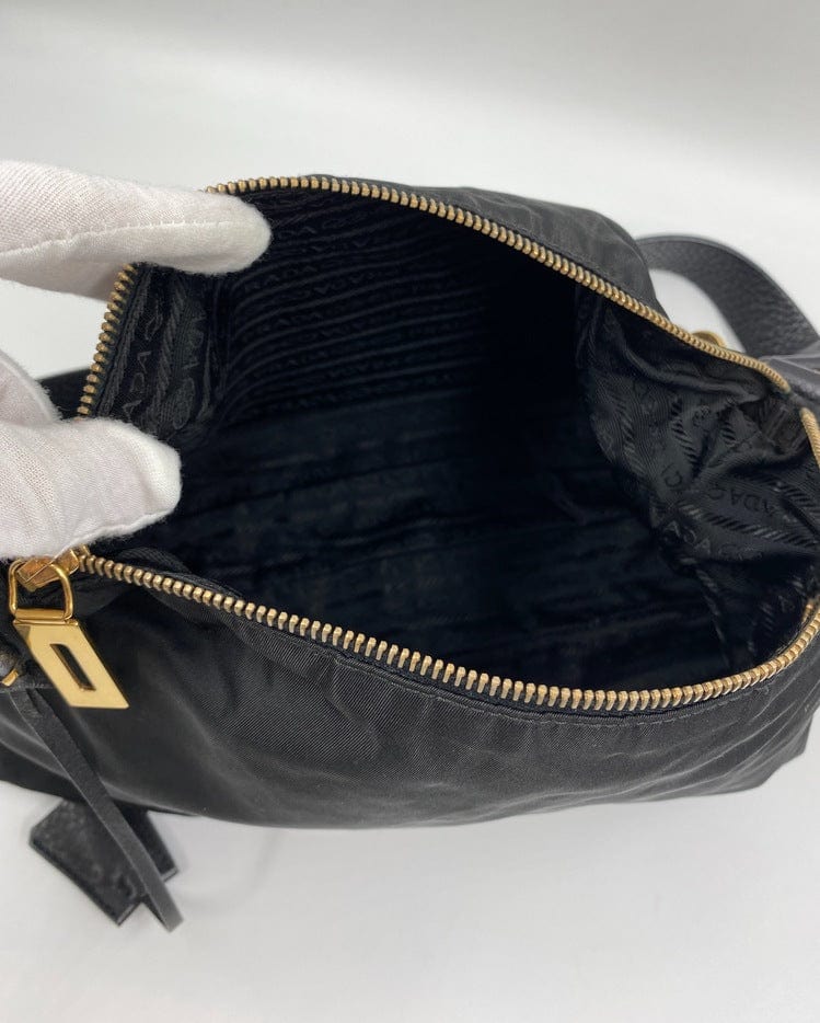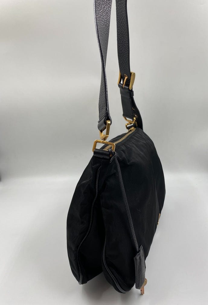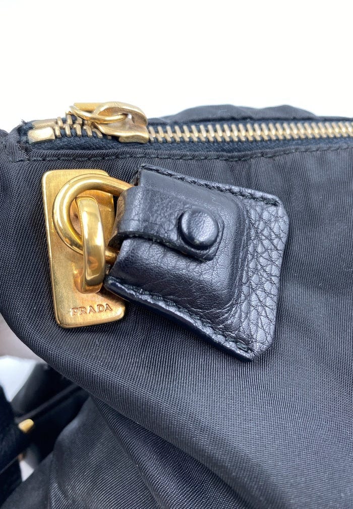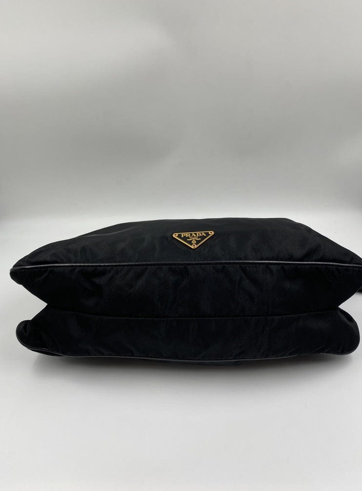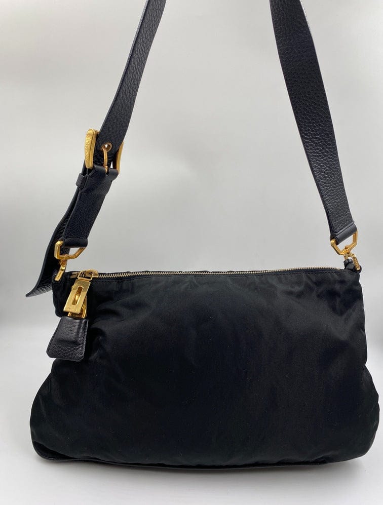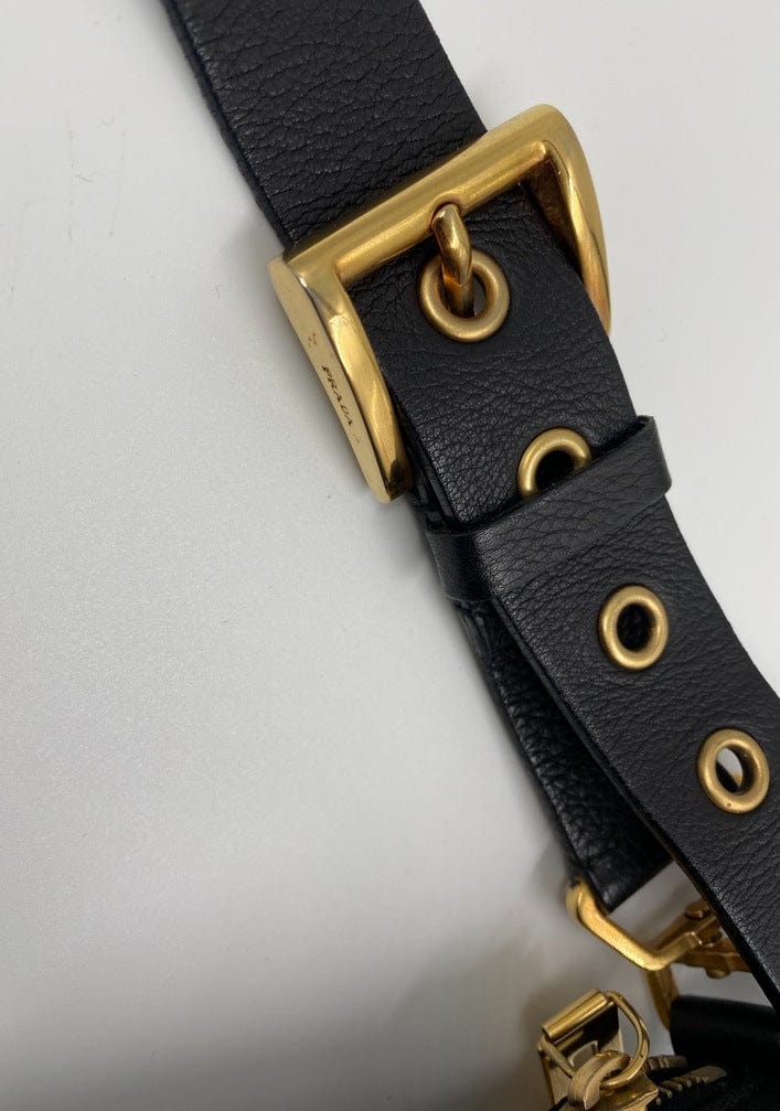 A super cool nylon Prada shoulder bag with Prada branded gold hardware. This bag has a Prada branded padlock plus the keys to lock. This bag has the iconic Prada ceramic plaque on the front. The shoulder strap is make from black leather and has a buckle to adjust the length. It can be worn as either a shoulder bag or a short crossbody. At the shortest the handle drop is 32cm and at its longest the drop is 37cm. Inside the bag is lined with the famous Prada logo nylon lining and has an interior pocket for valuables.