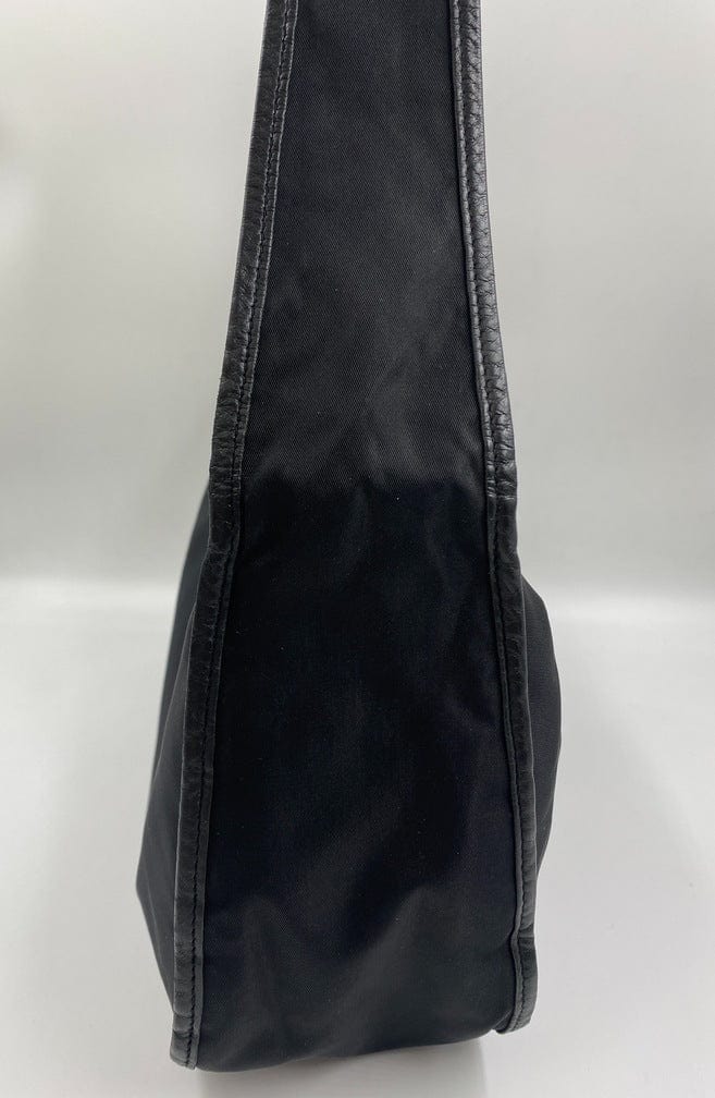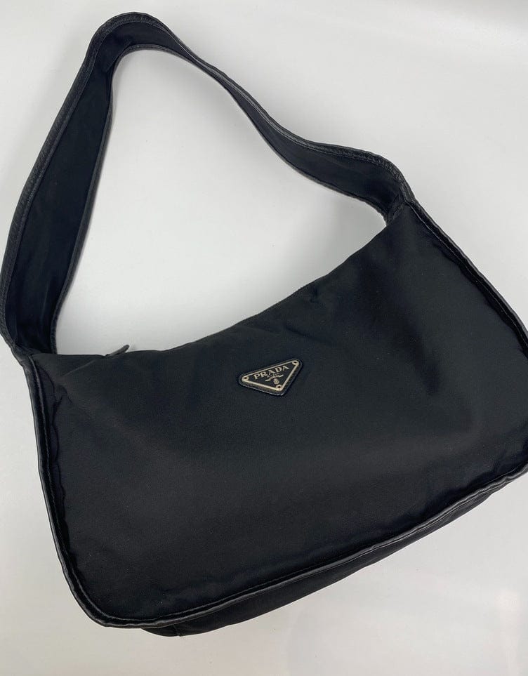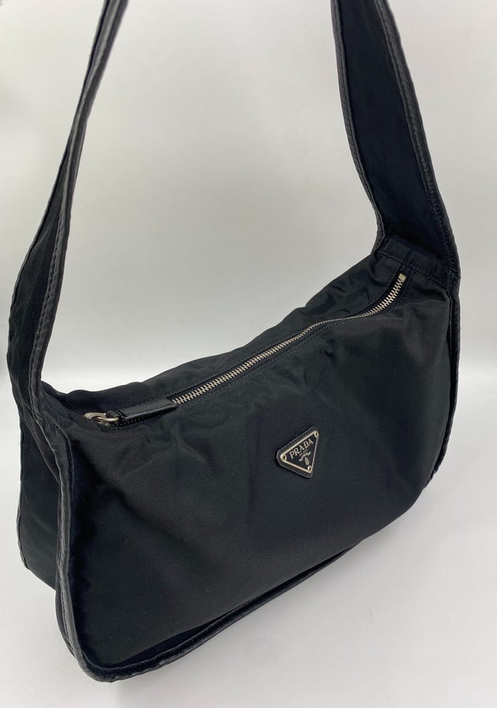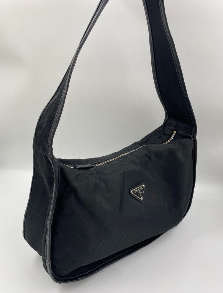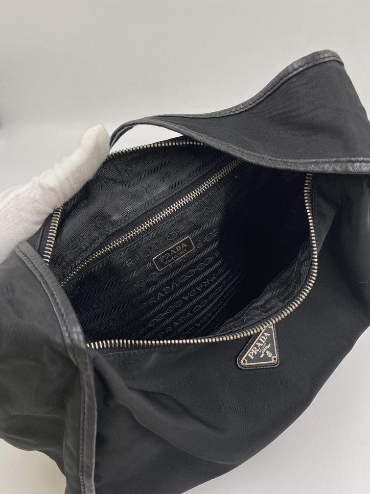 A black Prada nylon shoulder bag with a leather trim. The inside of the bag is lined with the famous Prada logo nylon lining. There is an interior zipped pocket for valuables.