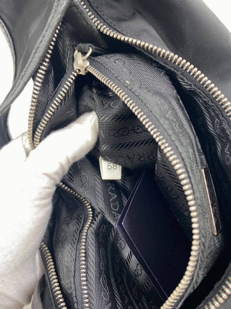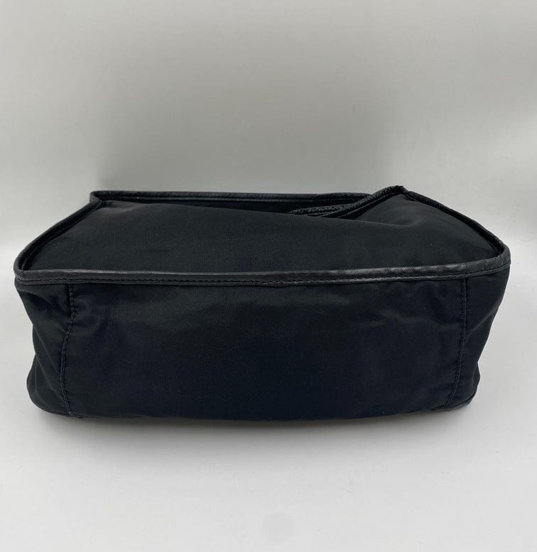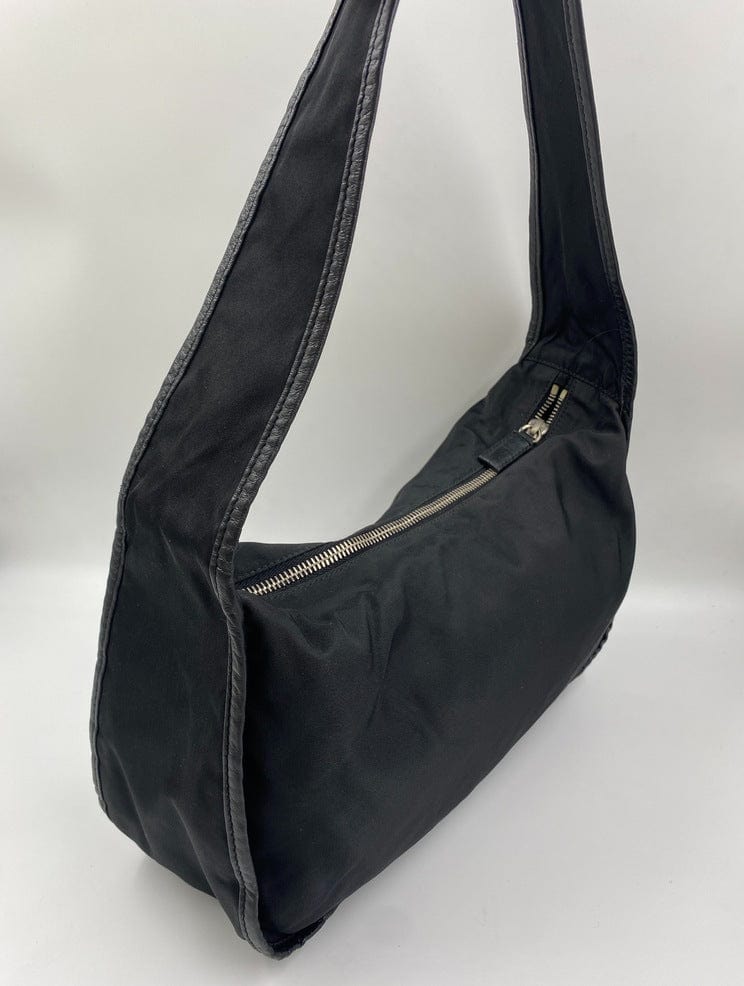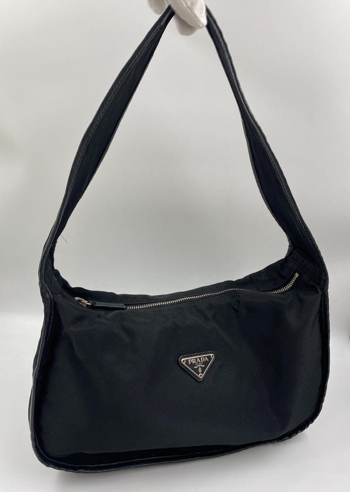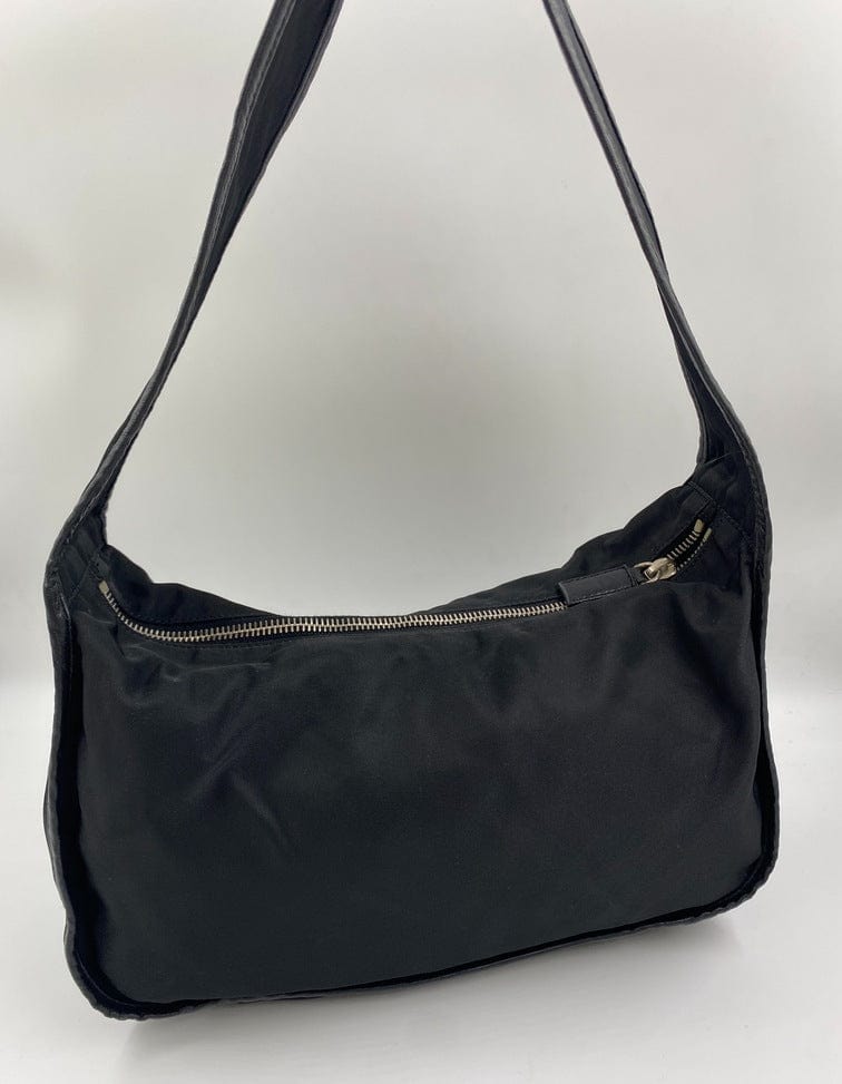 A black Prada nylon shoulder bag with a leather trim. The inside of the bag is lined with the famous Prada logo nylon lining. There is an interior zipped pocket for valuables.