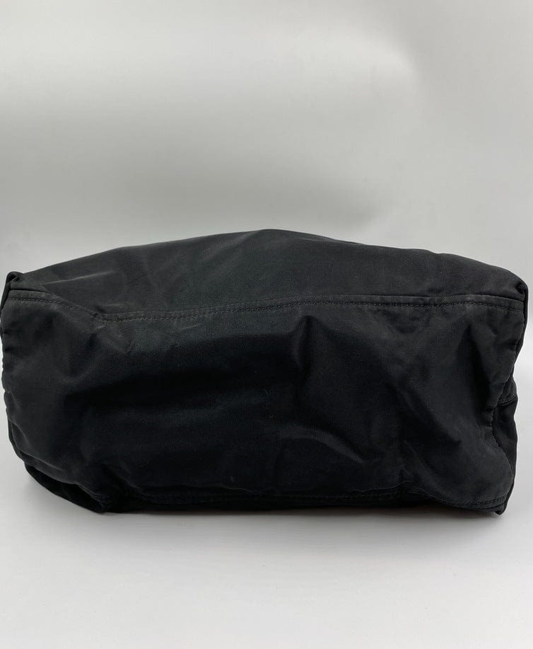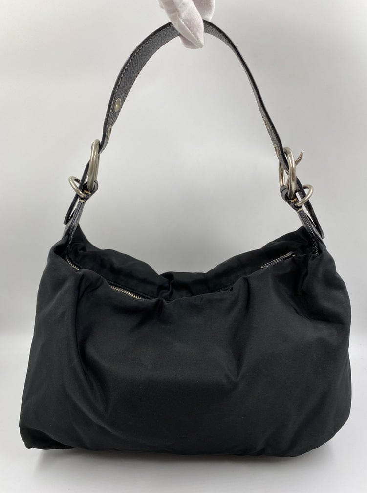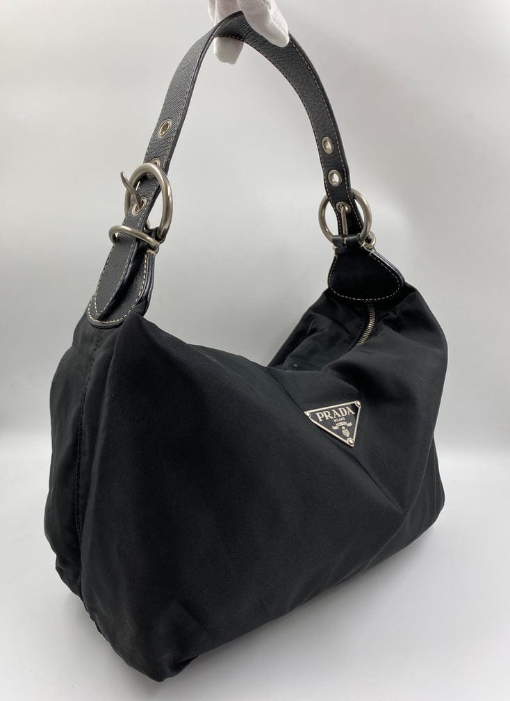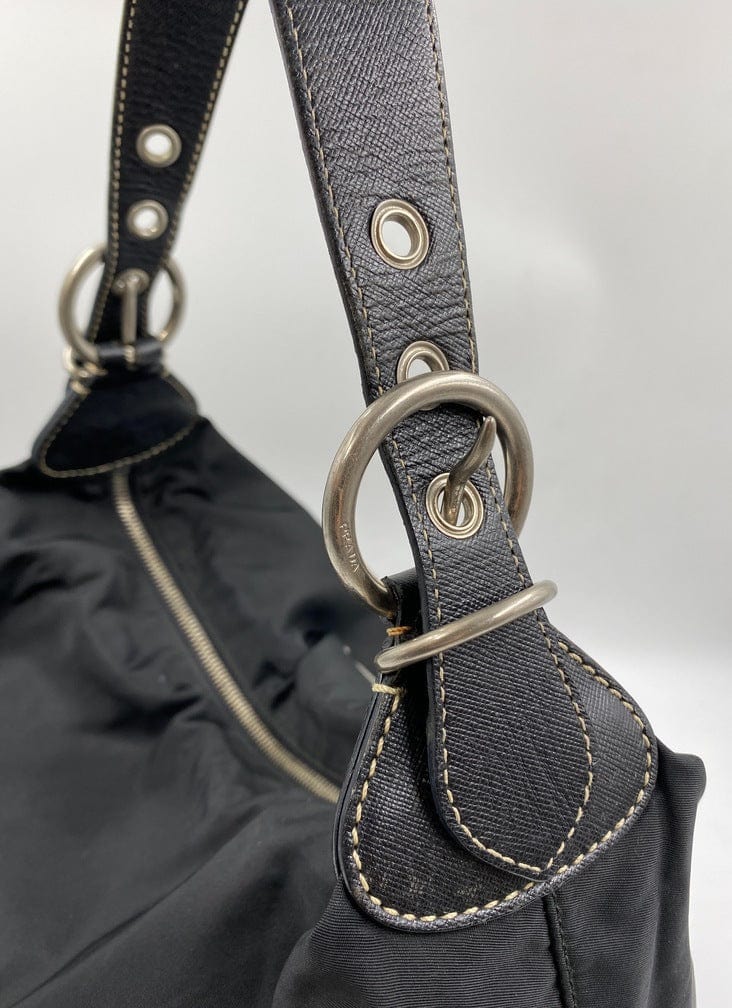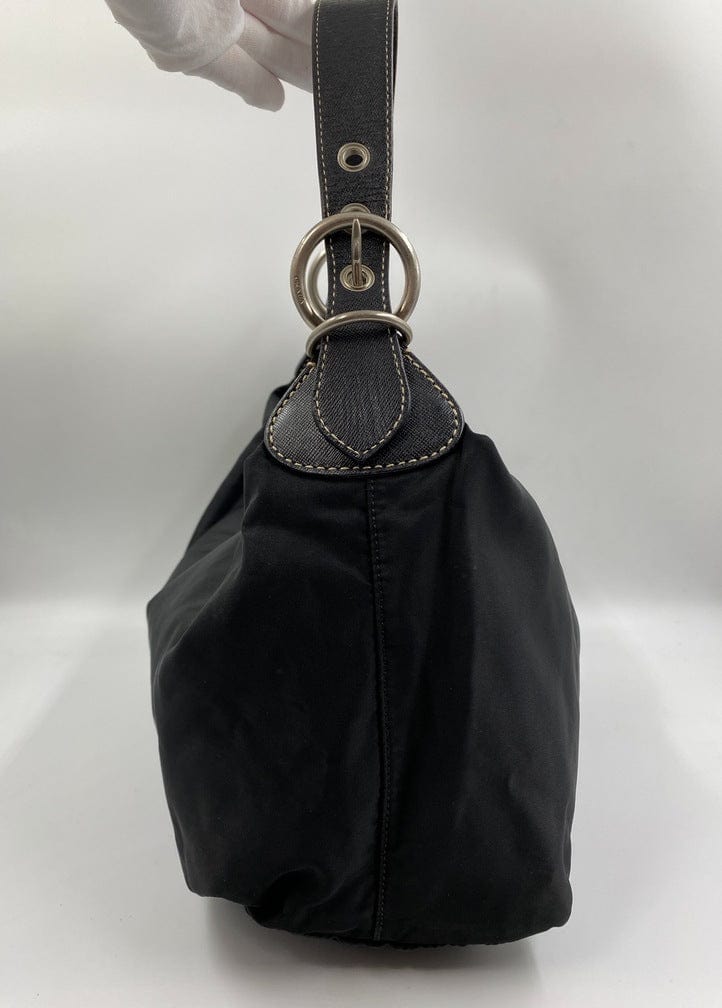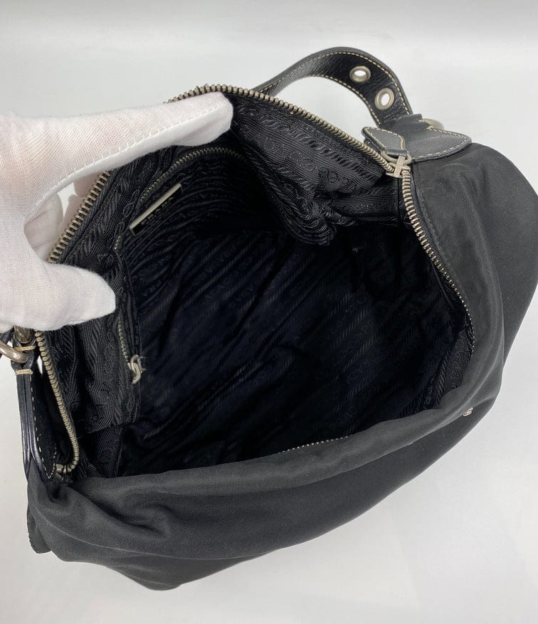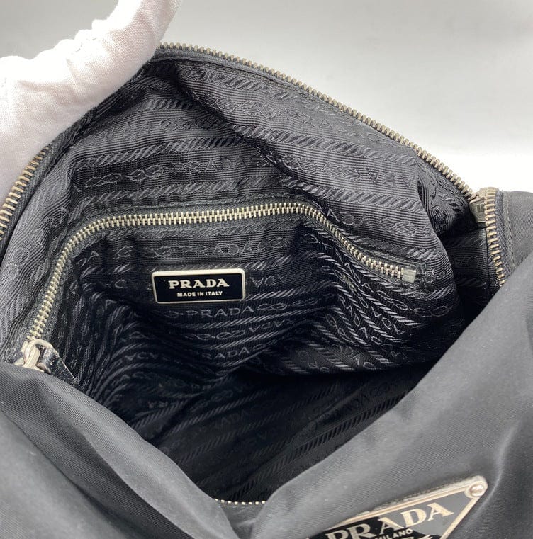 A black Prada nylon shoulder bag with a leather adjustable shoulder strap with contrast stitch detail and silver hardware. The inside of the bag is lined with the famous Prada logo nylon lining. There is an interior zipped pocket for valuables.