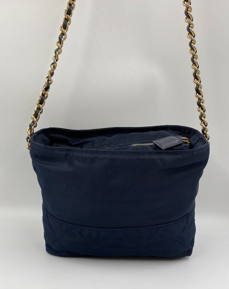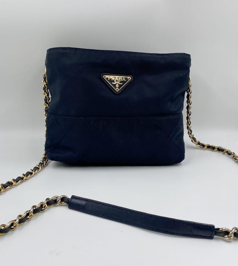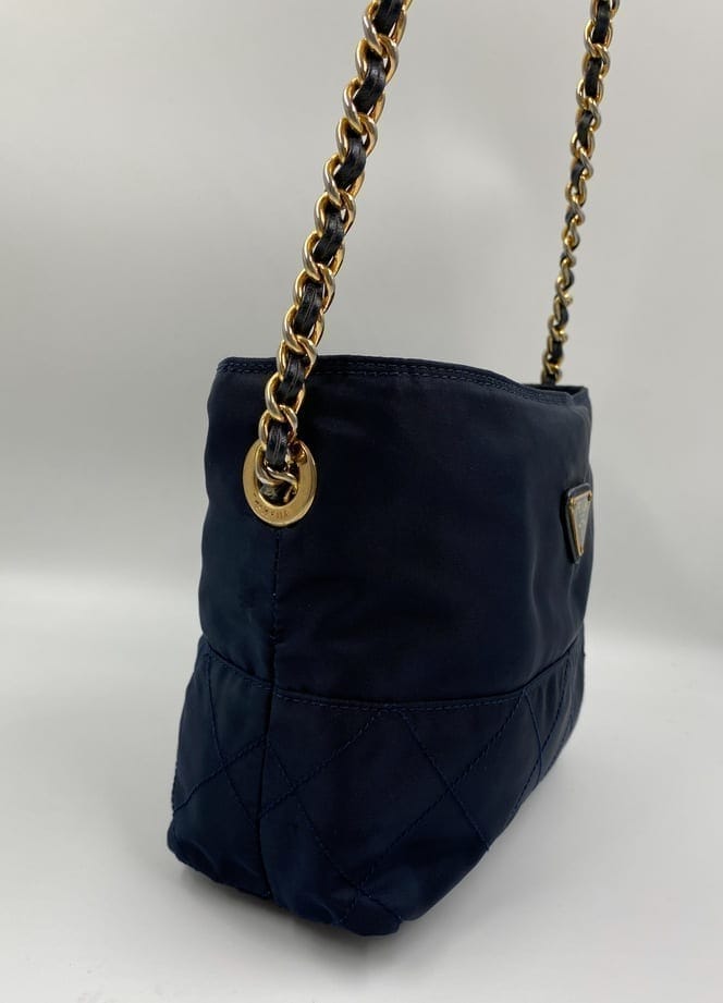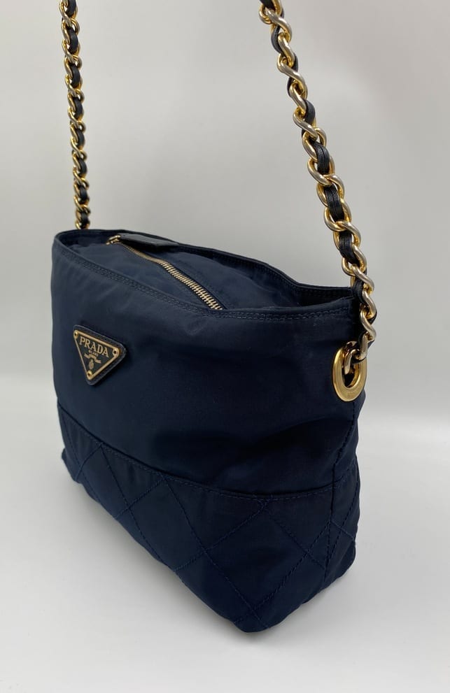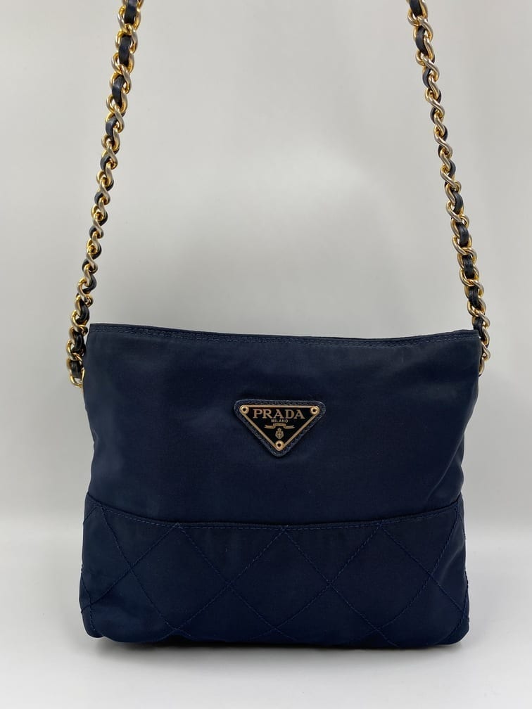 The perfect everyday Prada bag. Made from the classic Prada nylon which has been quilted and features a gold chain shoulder strap with navy leather threaded through. Fastened by a top zip, the bag is lined with the classic Prada jacquard lining and has a zipped pocket inside for your valuables.