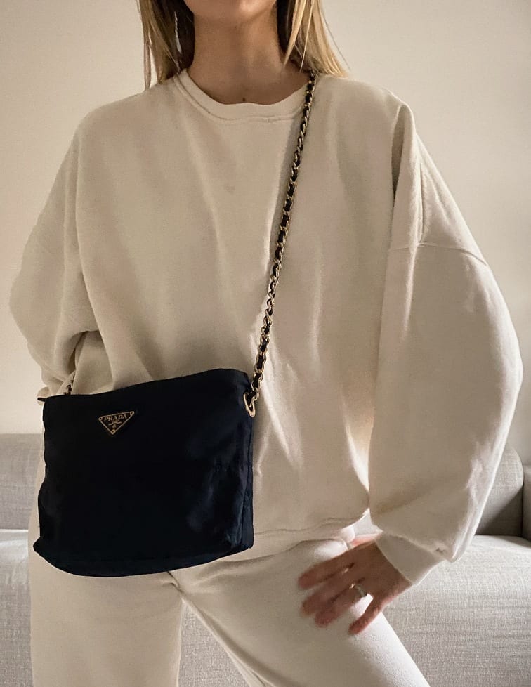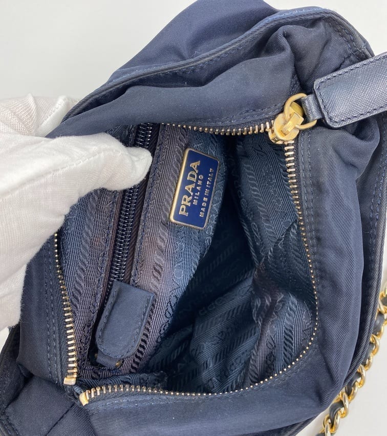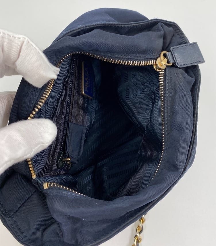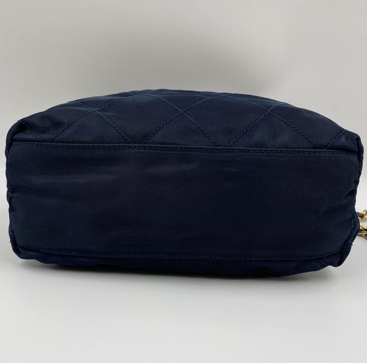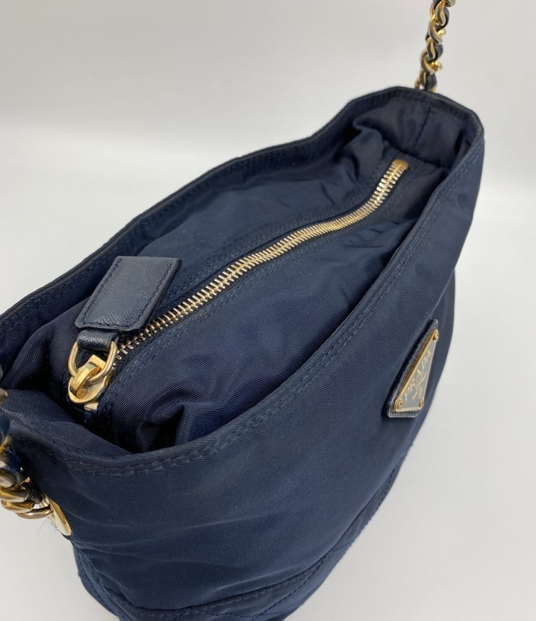 The perfect everyday Prada bag. Made from the classic Prada nylon which has been quilted and features a gold chain shoulder strap with navy leather threaded through. Fastened by a top zip, the bag is lined with the classic Prada jacquard lining and has a zipped pocket inside for your valuables.