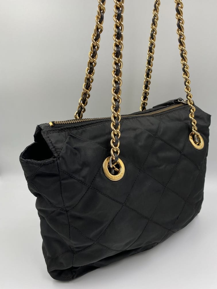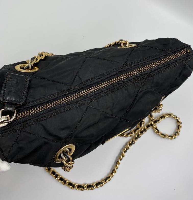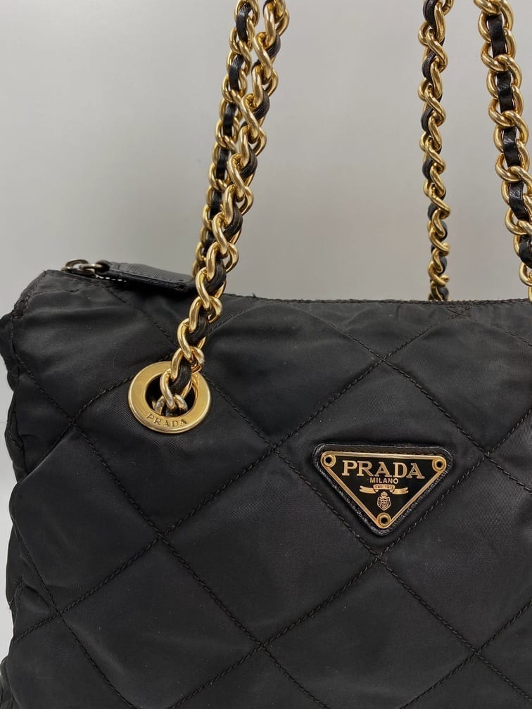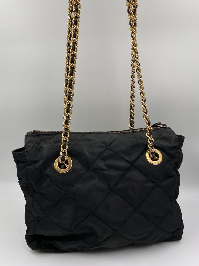 The perfect everyday Prada bag. Made from the classic Prada nylon which has been quilted and features a gold chain shoulder strap with black leather threaded through. Fastened by a top zip, the bag is lined with the classic Prada jacquard lining and has a zipped pocket inside for your valuables.