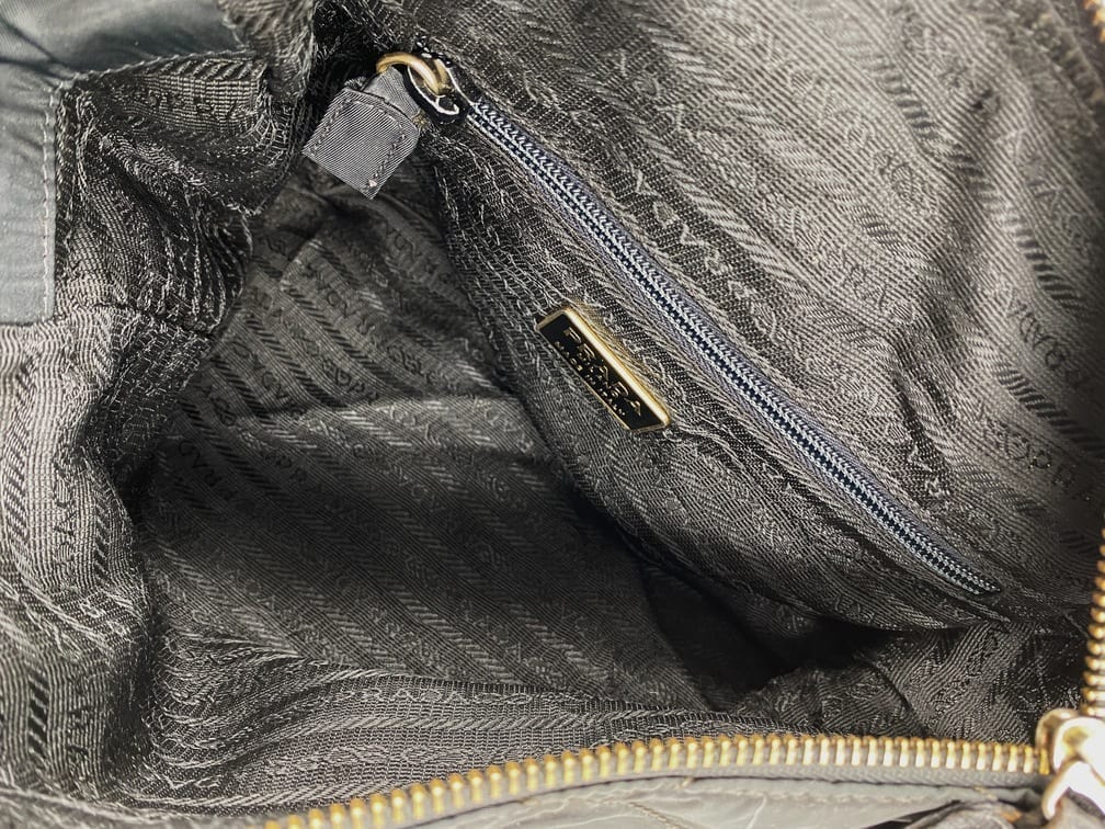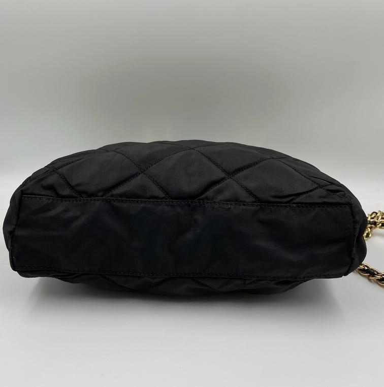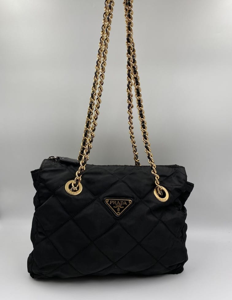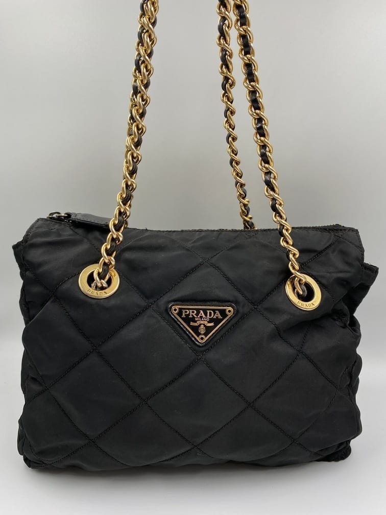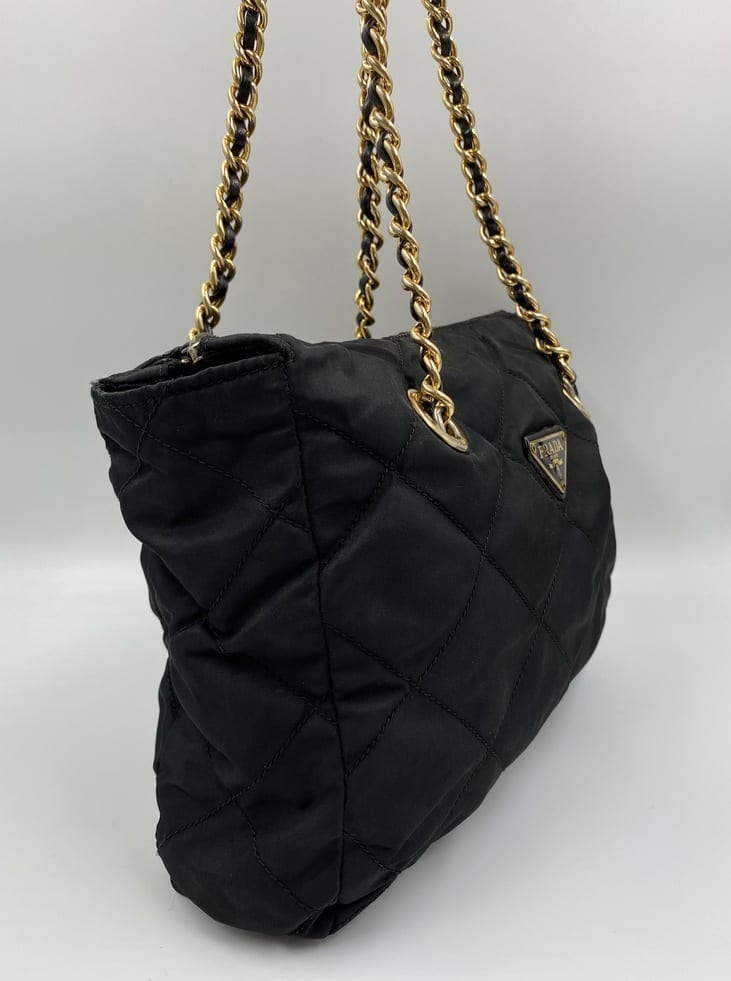 The perfect everyday Prada bag. Made from the classic Prada nylon which has been quilted and features a gold chain shoulder strap with black leather threaded through. Fastened by a top zip, the bag is lined with the classic Prada jacquard lining and has a zipped pocket inside for your valuables.