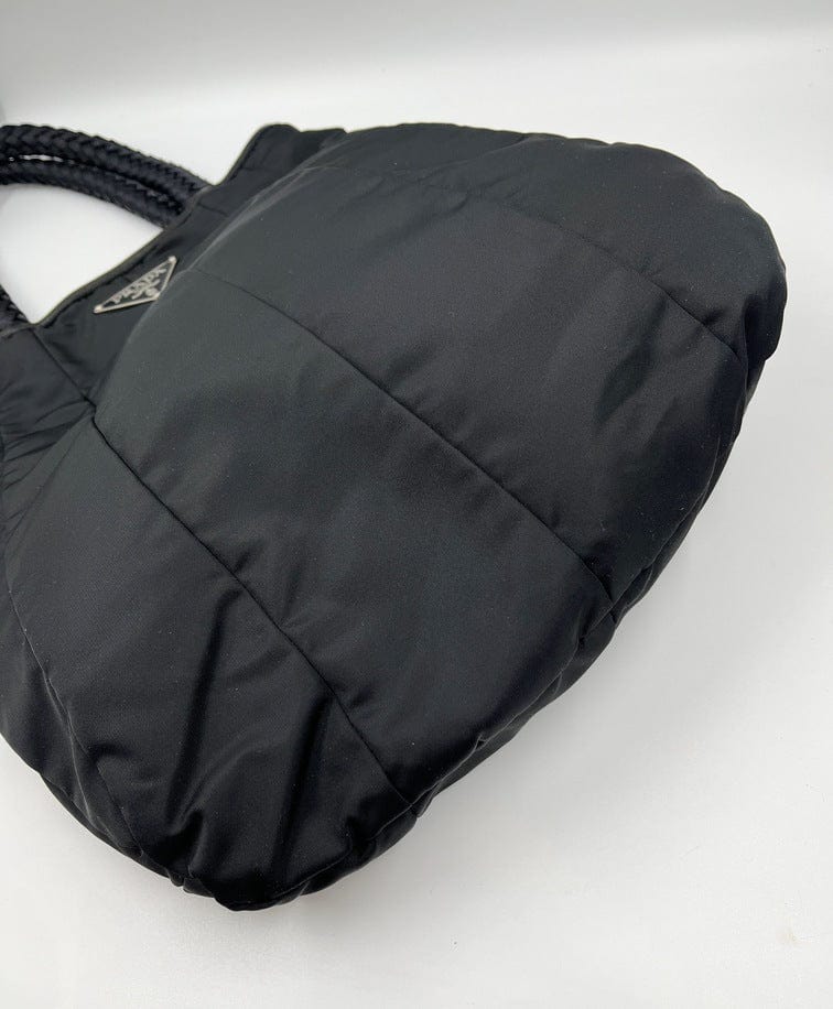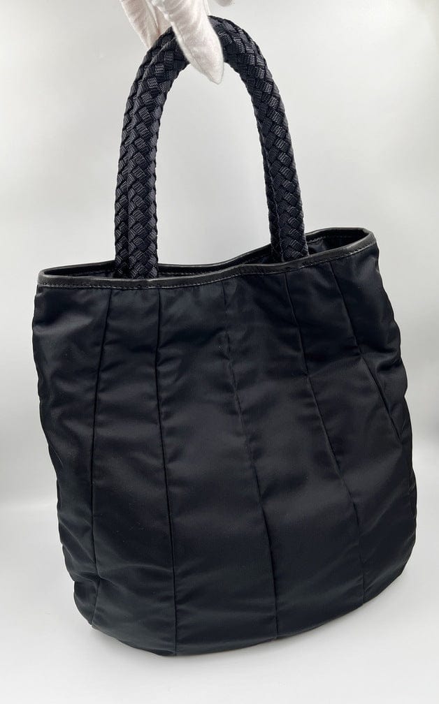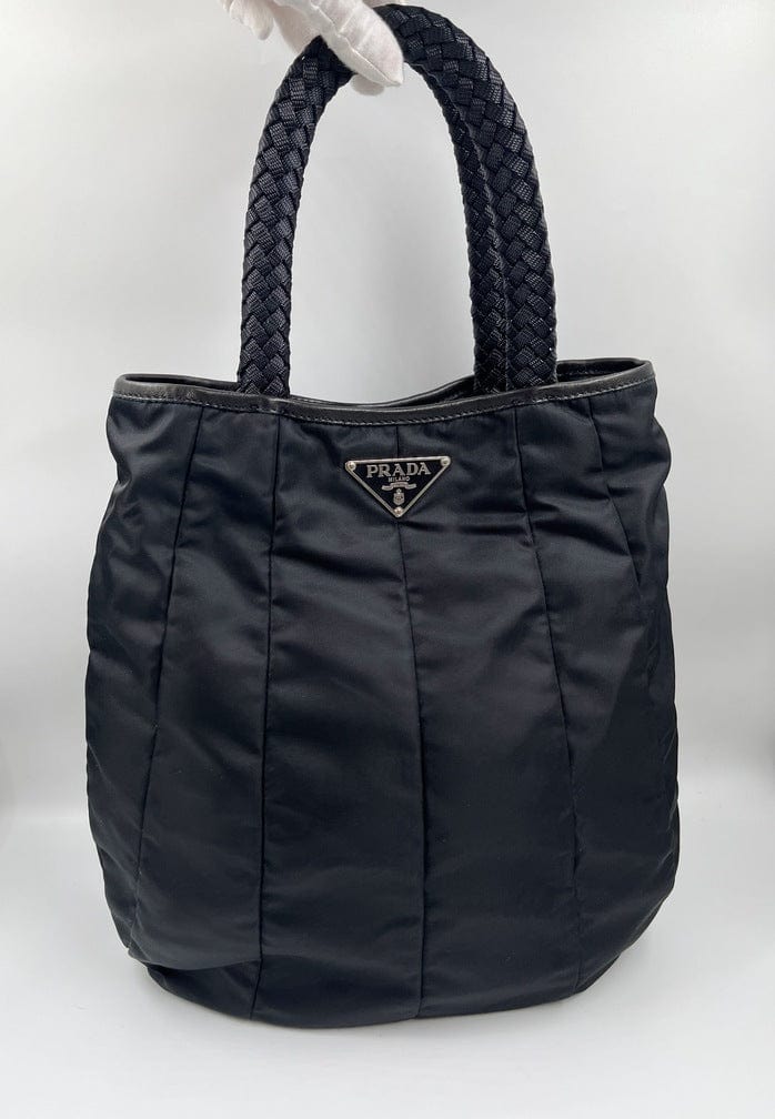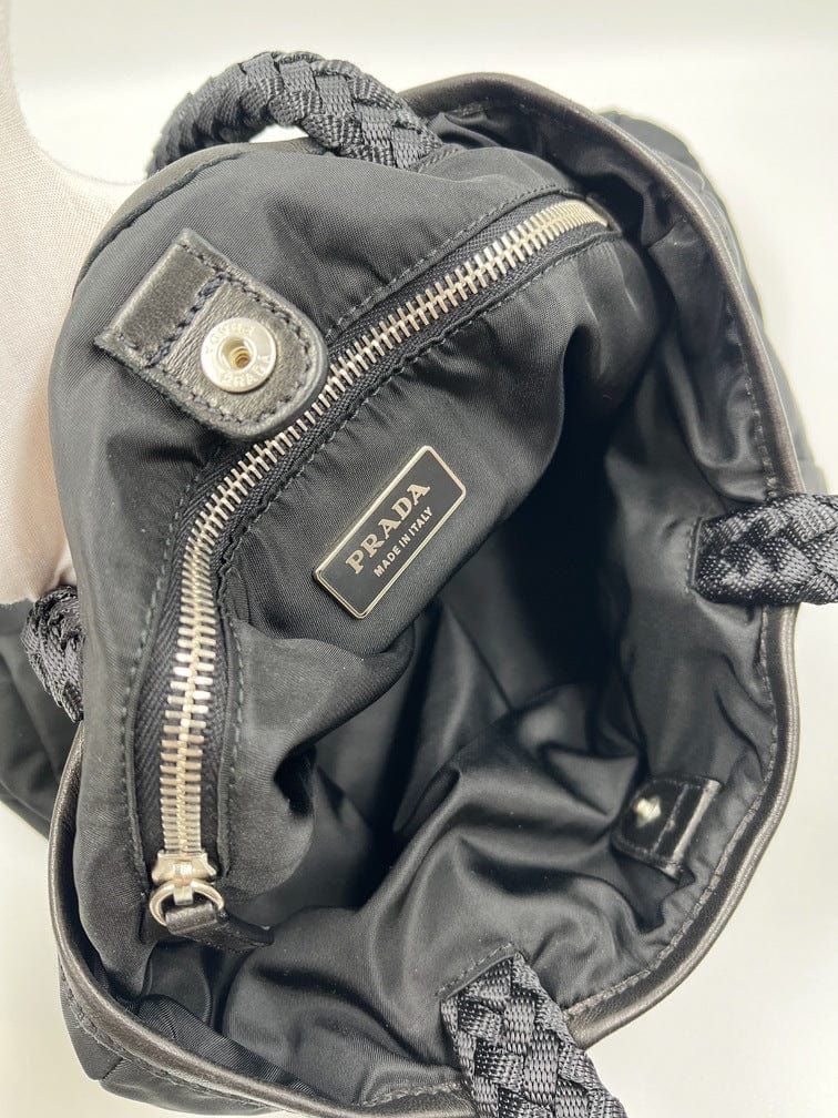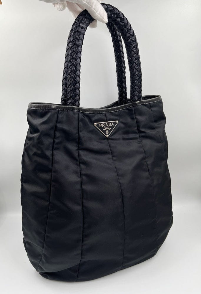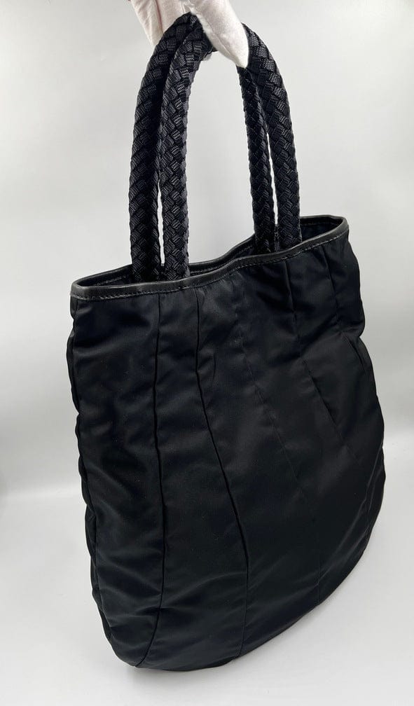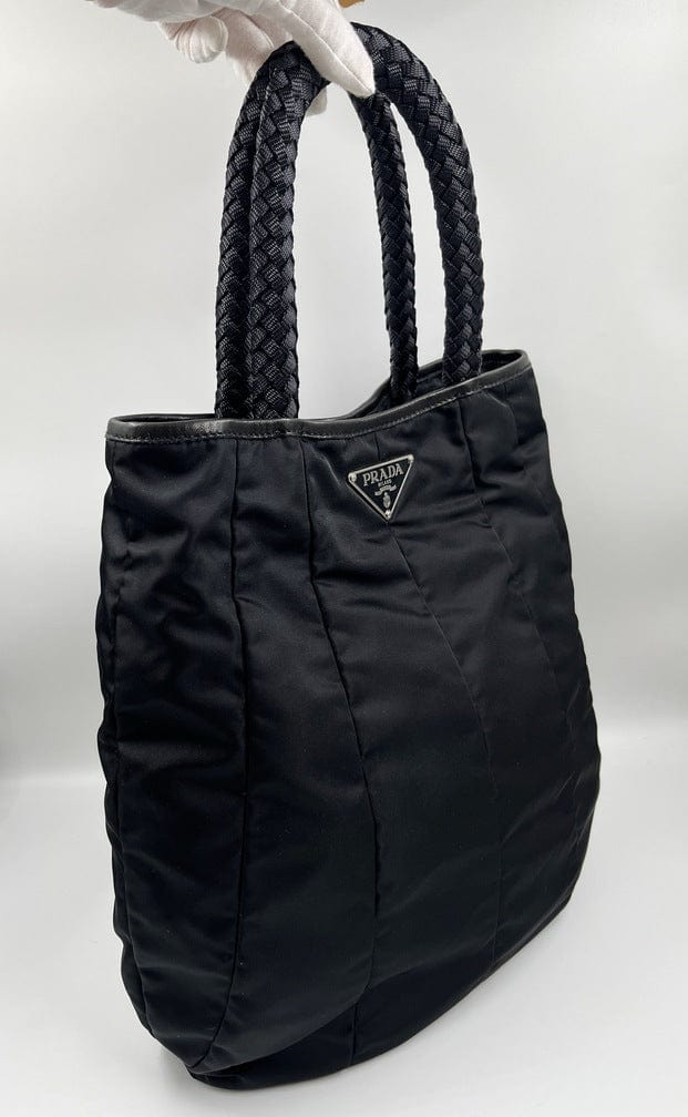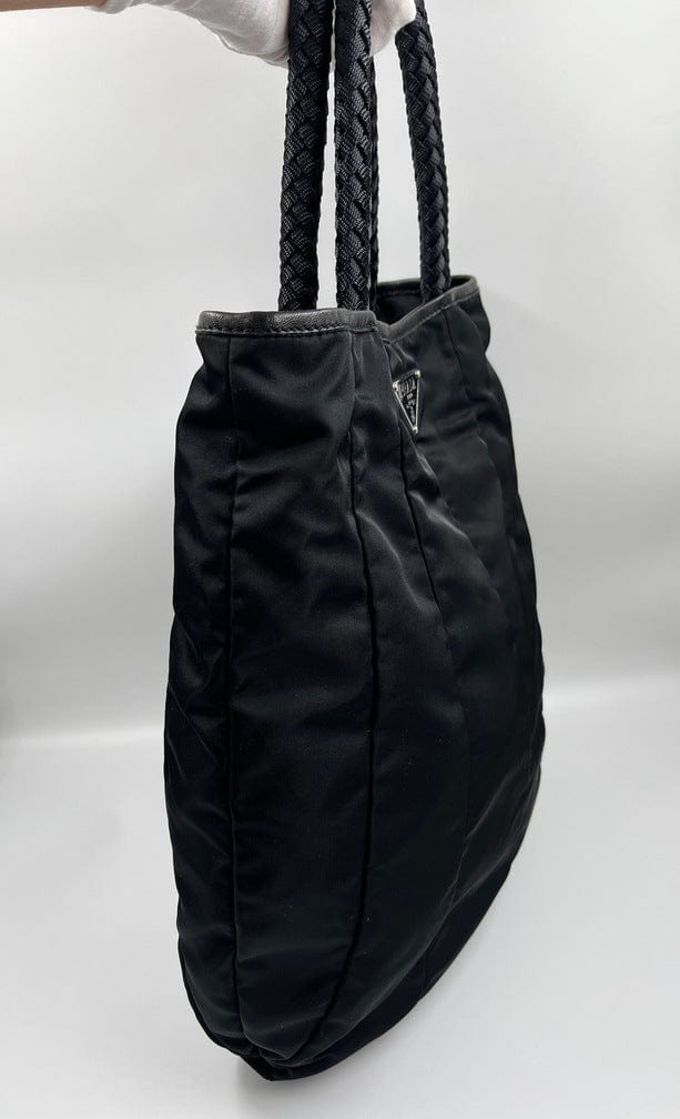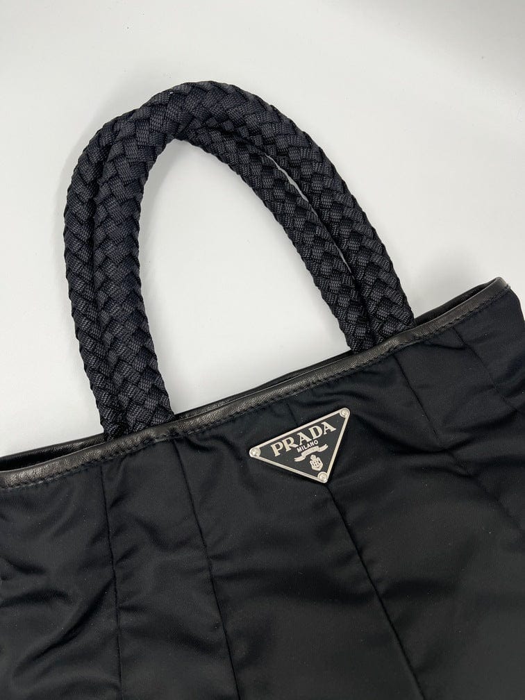A super cool nylon Prada tote bag with fun braided handles.Inside the bag is lined with the famous Prada logo nylon lining and has an interior zipped pocket for valuables.