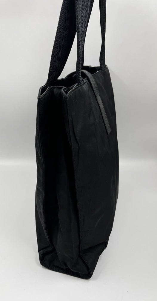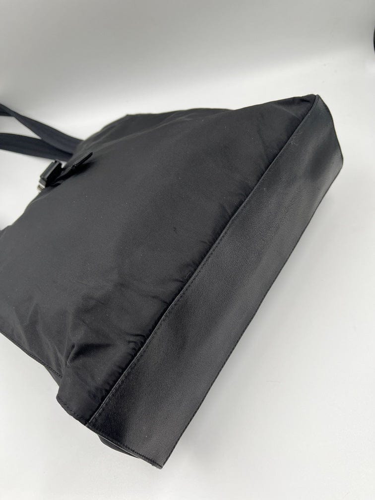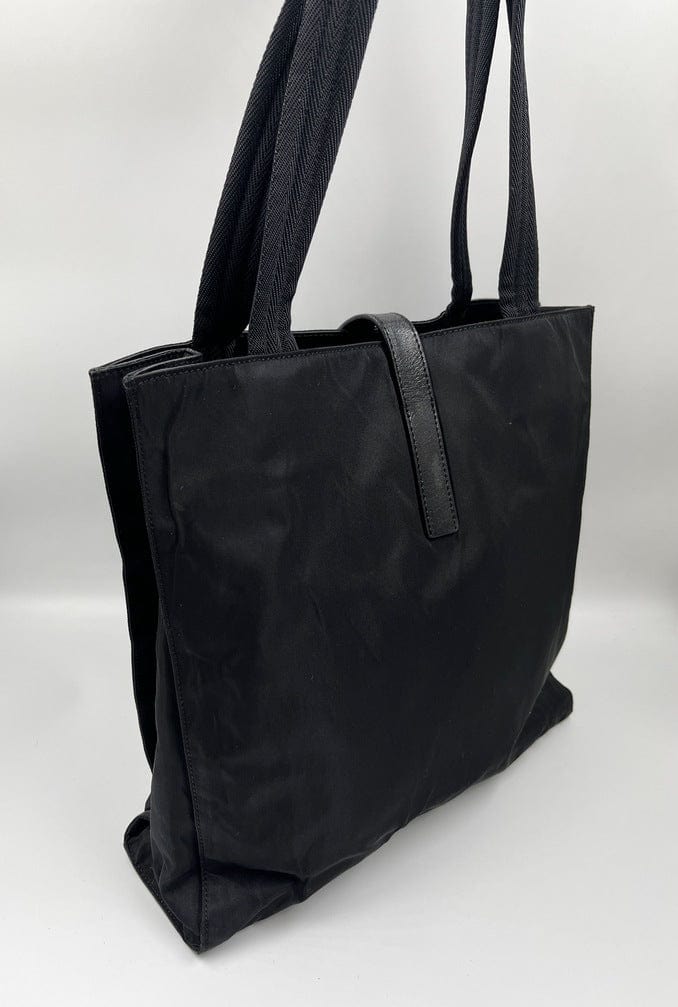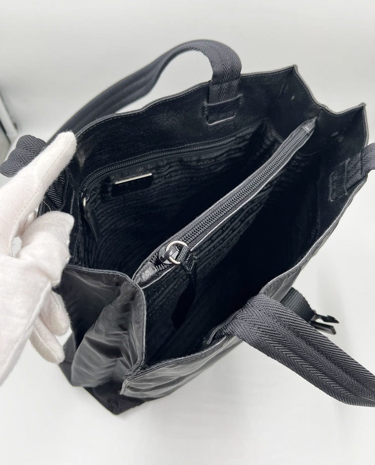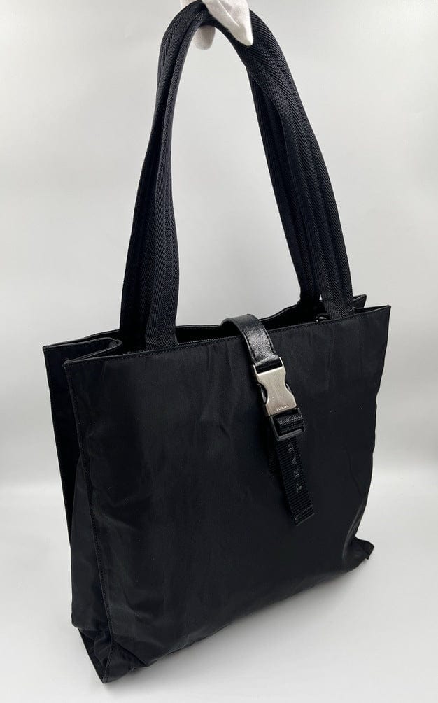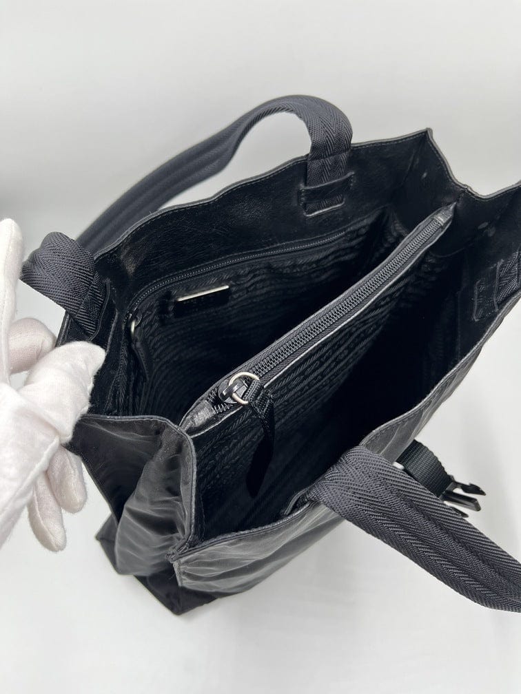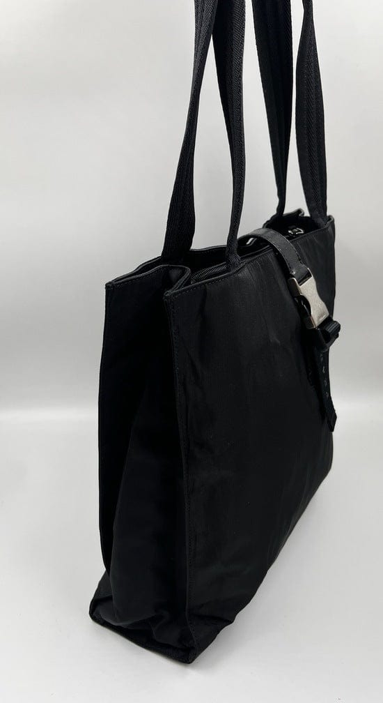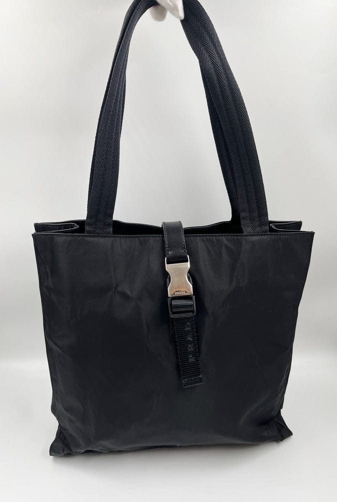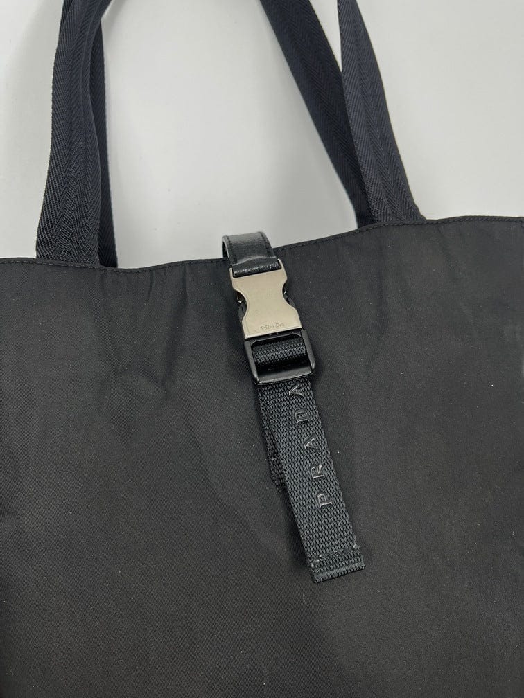 A super cool nylon Prada tote bag with a silver parachute clip fastening. The the bag is lined with the famous Prada logo nylon lining and has an interior middle zipped compartment to keep you organised, plus a smaller interior zipped pocket for your valuables.
