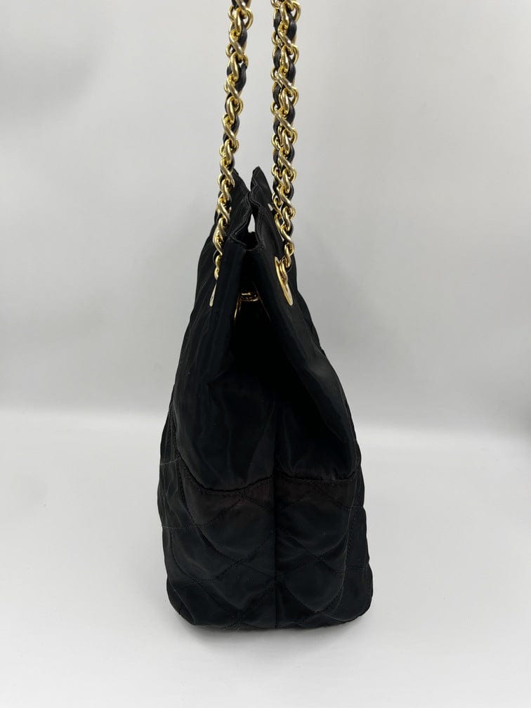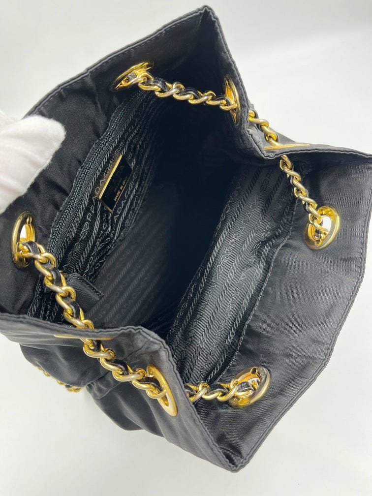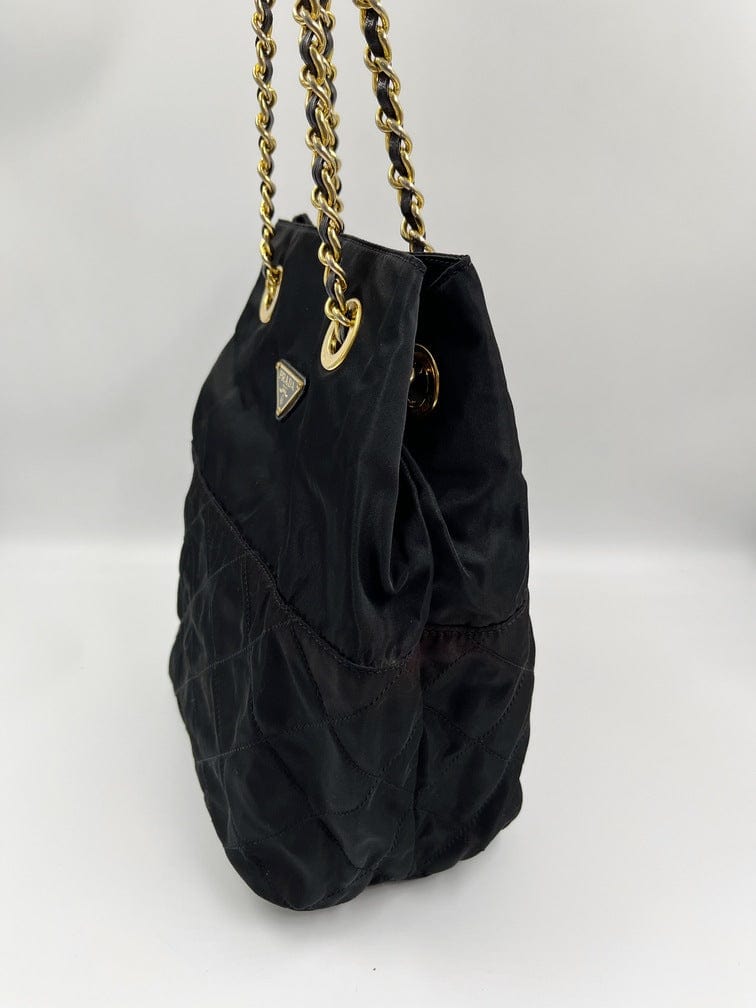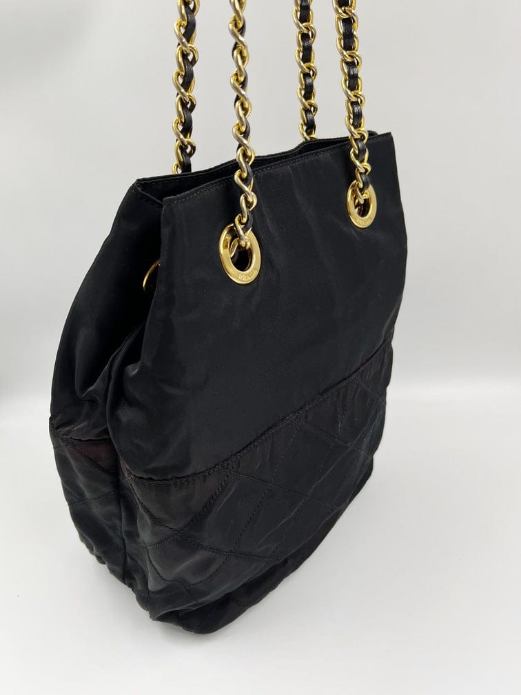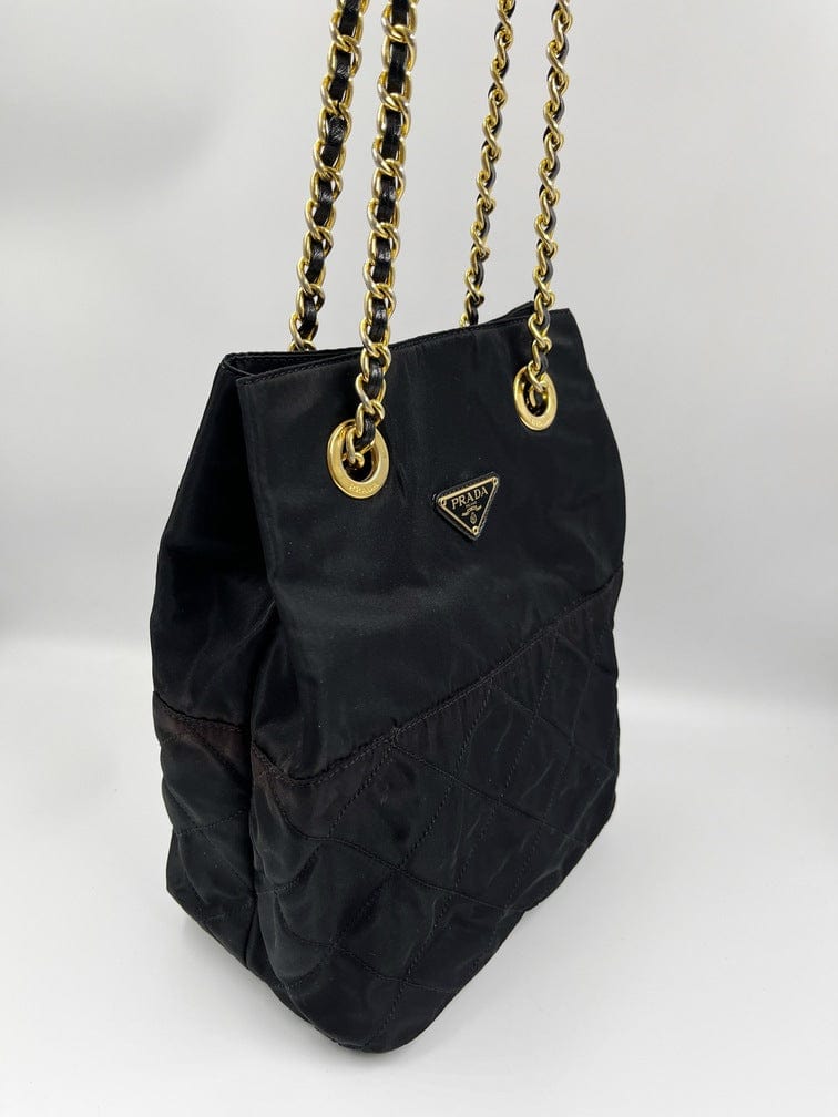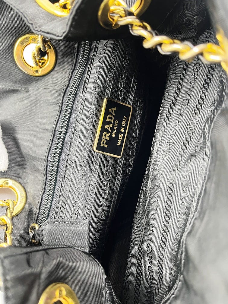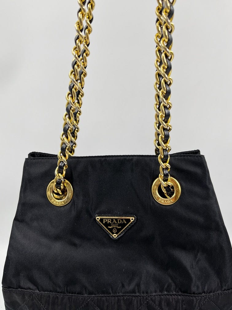 A stunning black Prada nylon tote with gold chain that can be worn on the shoulder or as a crossbody. The gold chain has black leather threaded through. Inside the bag is lined with the famous Prada logo nylon lining. There is a zipped pocket for valuables.