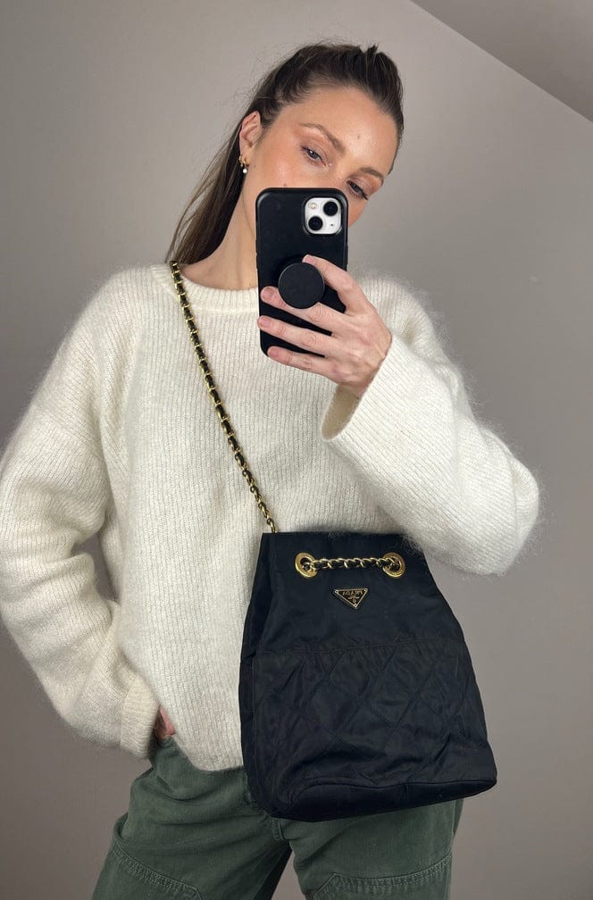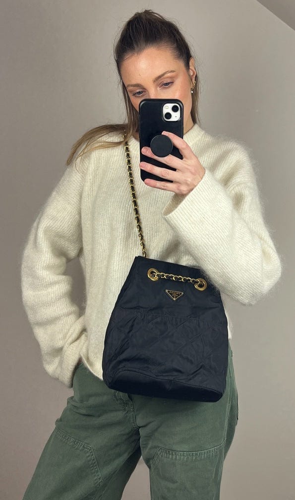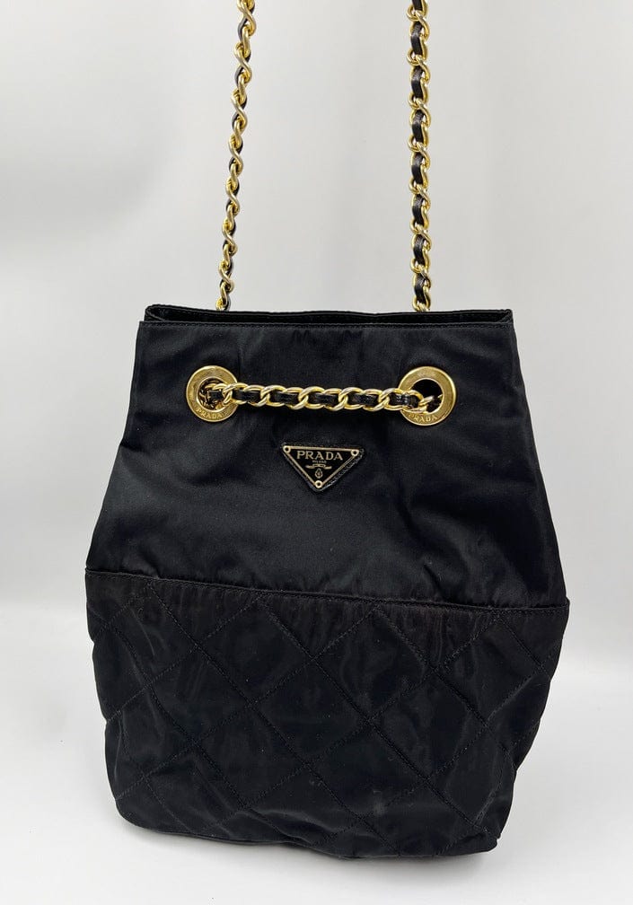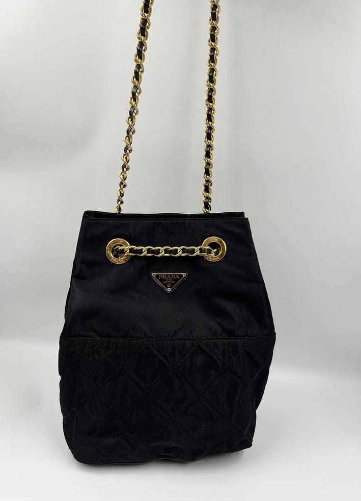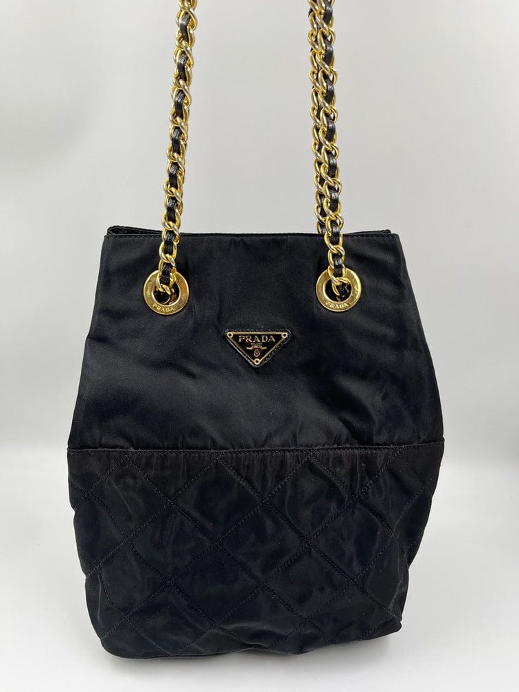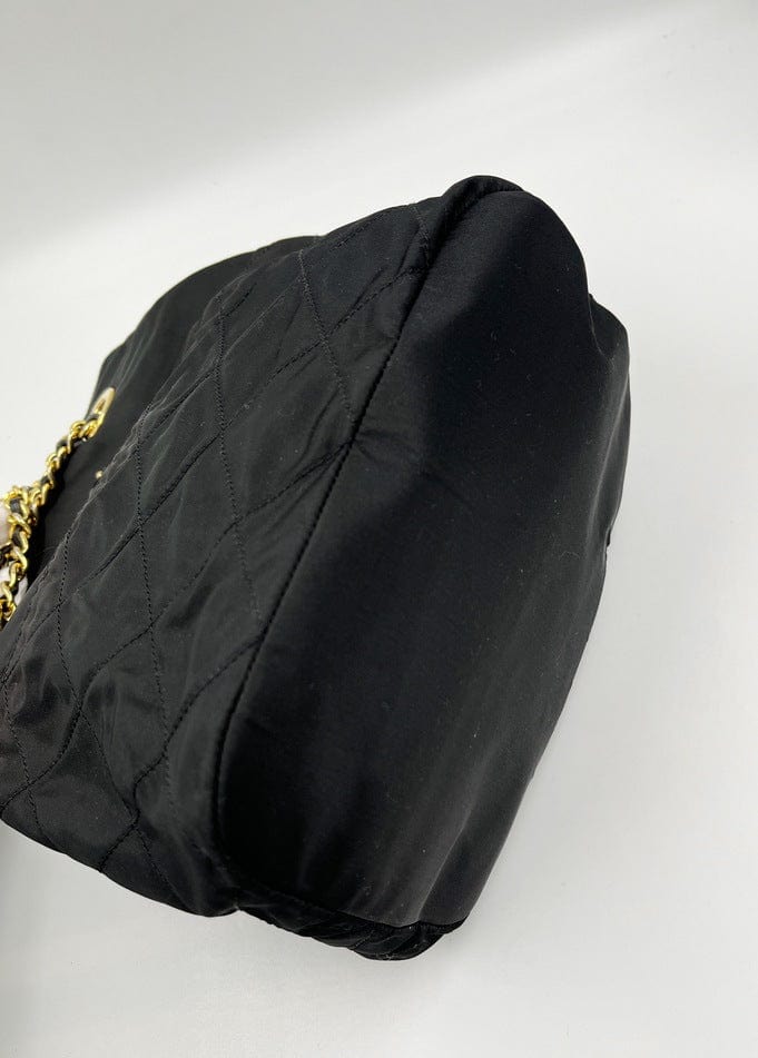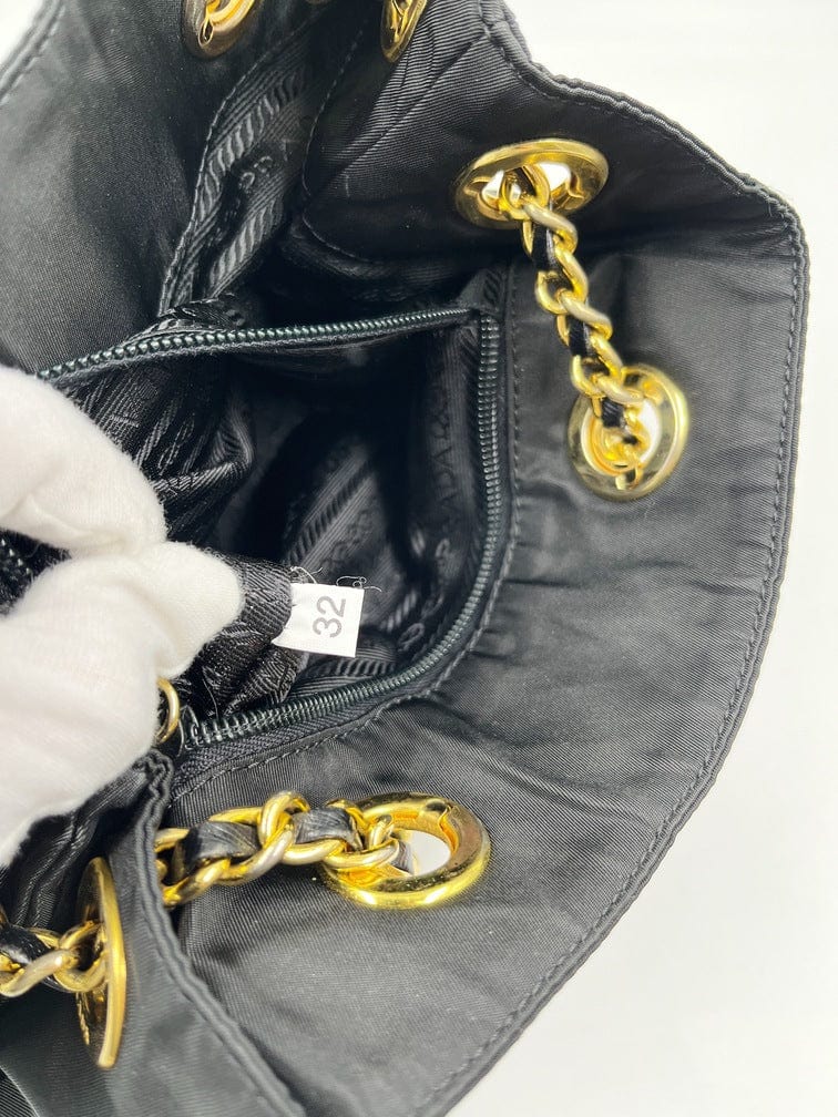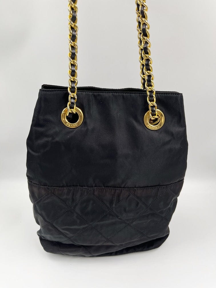 A stunning black Prada nylon tote with gold chain that can be worn on the shoulder or as a crossbody. The gold chain has black leather threaded through. Inside the bag is lined with the famous Prada logo nylon lining. There is a zipped pocket for valuables.