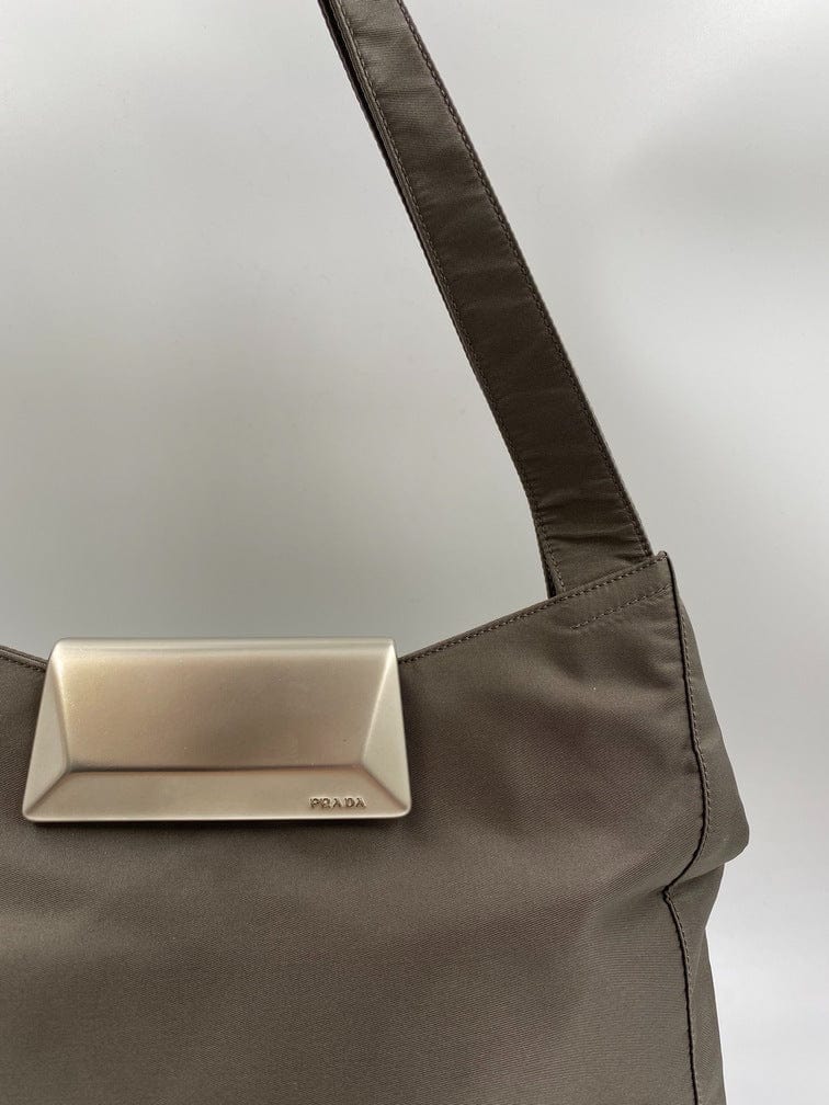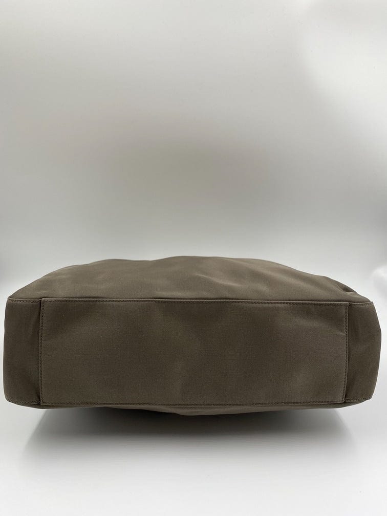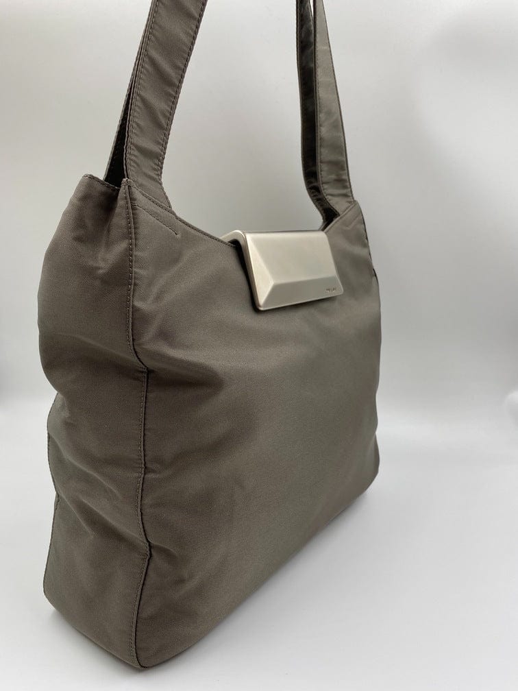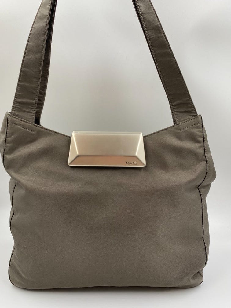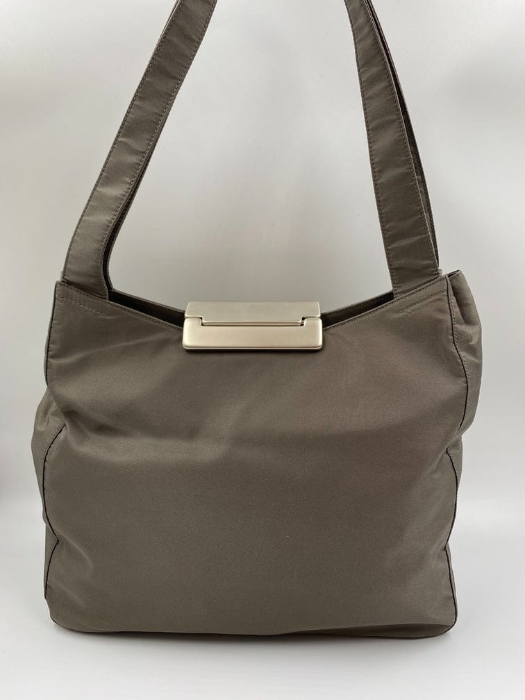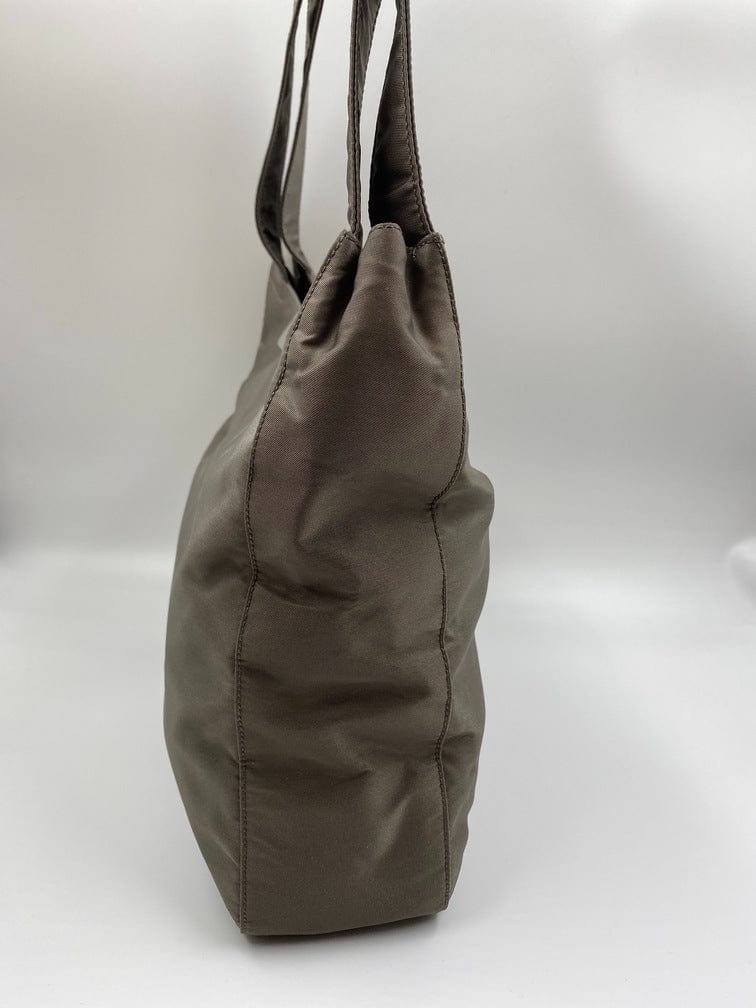 A chic everyday Prada nylon Tessuto shopping bag. This bag is a Dark Olive Green colour with Silver Prada branded hardware. In great condition overall for a Vintage piece but there is a slight smell of smoke.