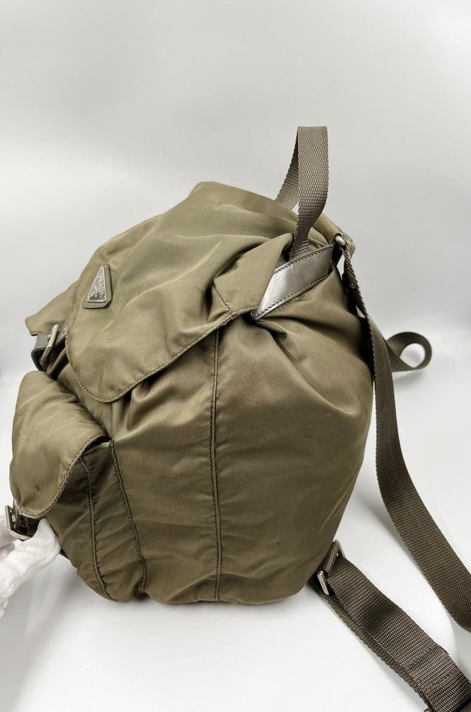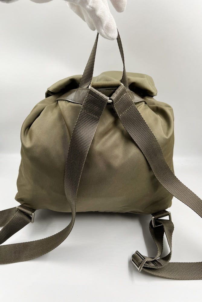 When Prada released its original nylon backpack in 1984 it was an instant hit. This nylon backpack with a modern, minimalist design is decorated with the Prada enamel triangle logo. Underneath the flap with a leather strap and buckle, is a drawstring closure.