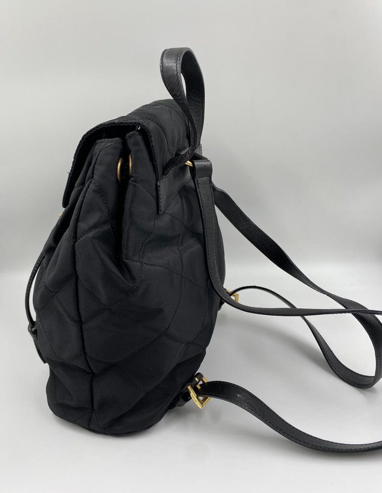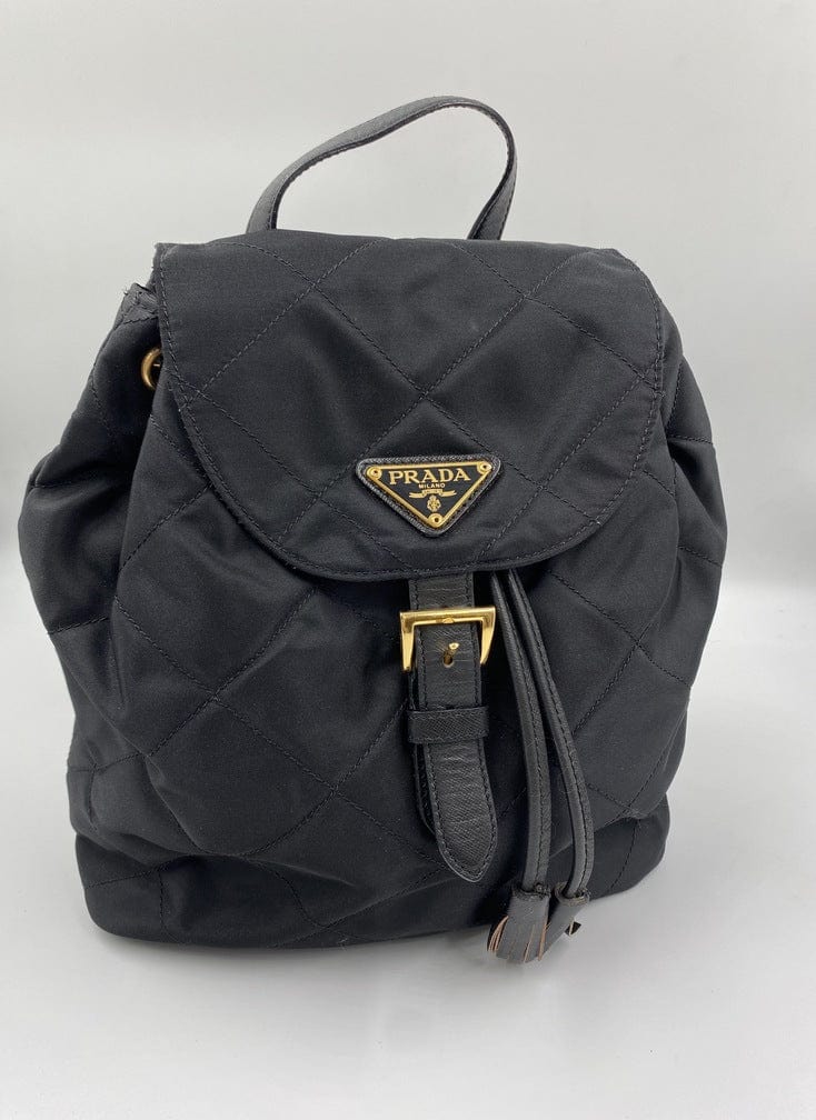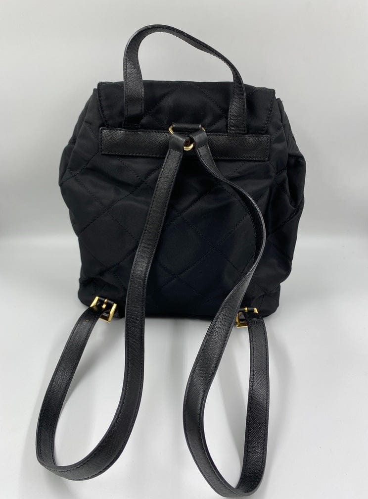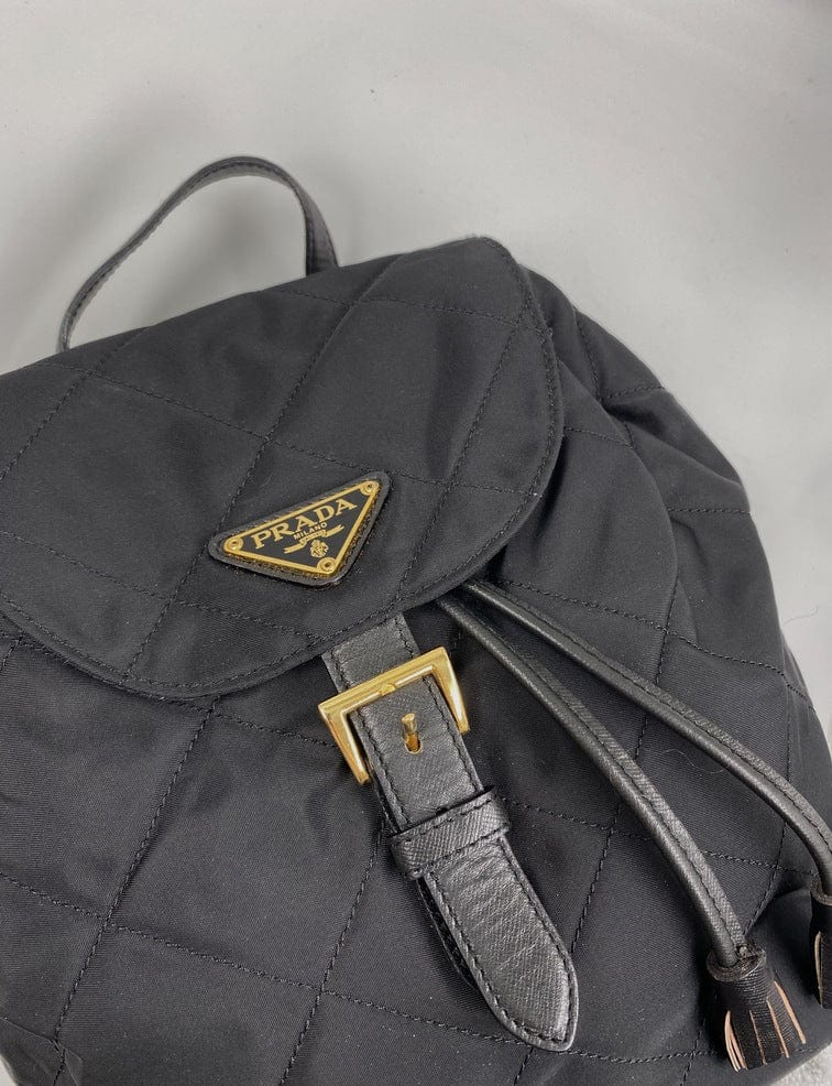 A fabulous Prada quilted nylon backpack with gold hardware details. The flap is secured with a press stud and buckle with the infamous ceramic Prada plaque. Under the flap the bag can be secured by a leather drawstring. Inside the bag is lined with the Prada logo lining and there is an internal zipped pocket for your valuables. The shoulder straps and top handle are made from Saffiano leather and the shoulder straps are adjustable.