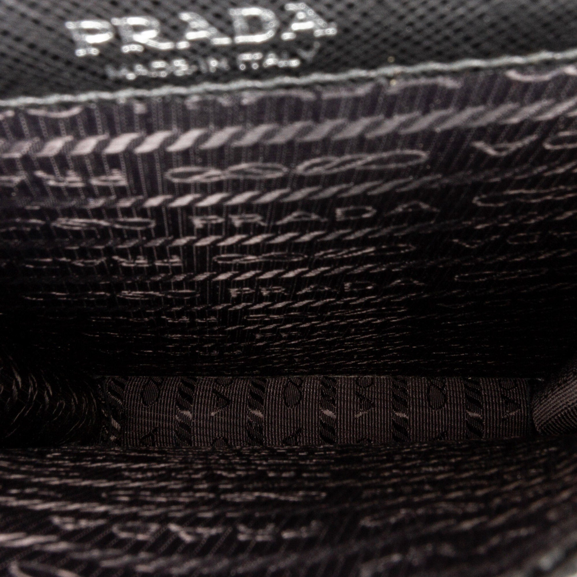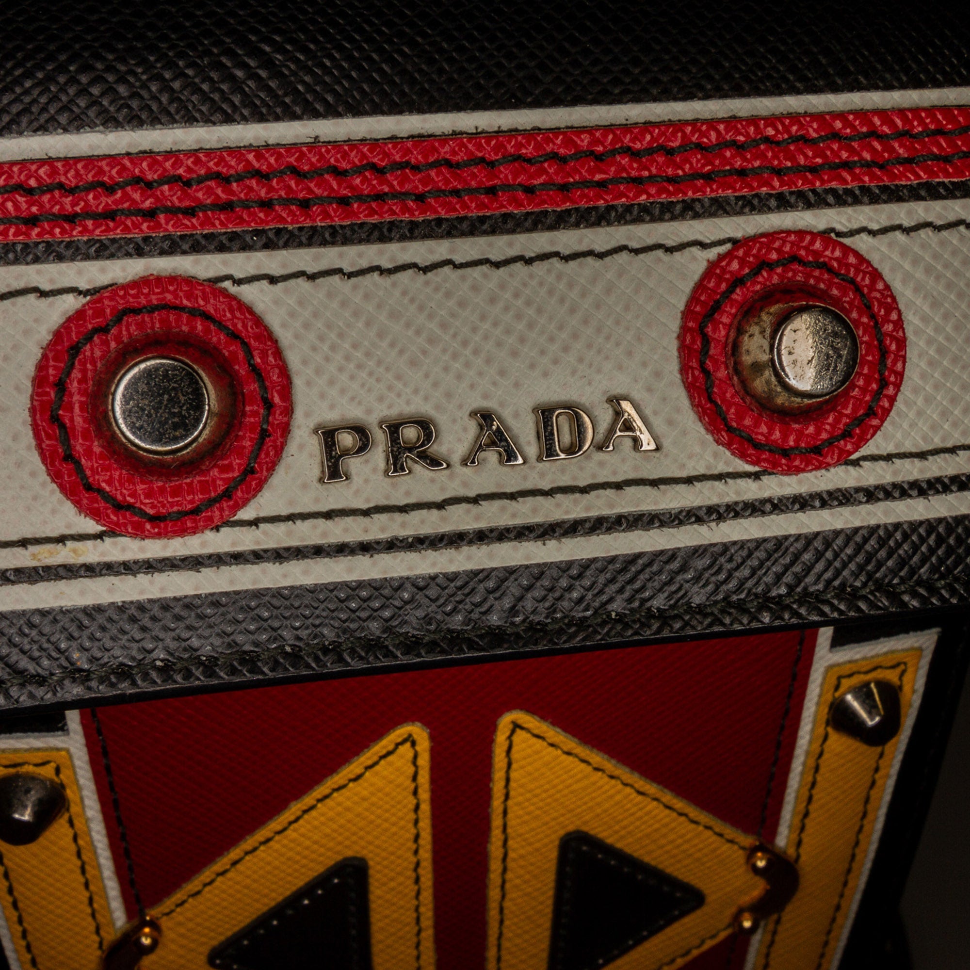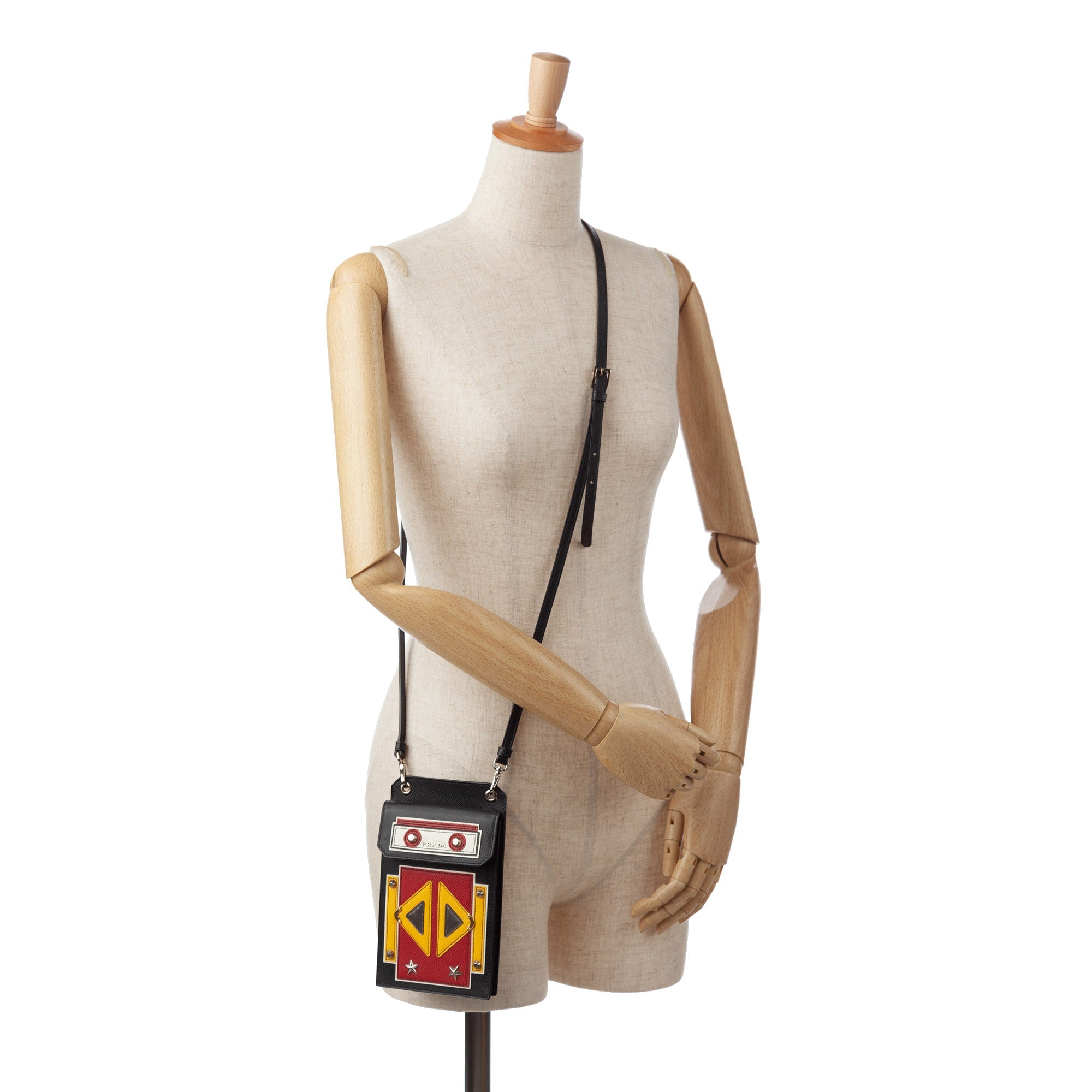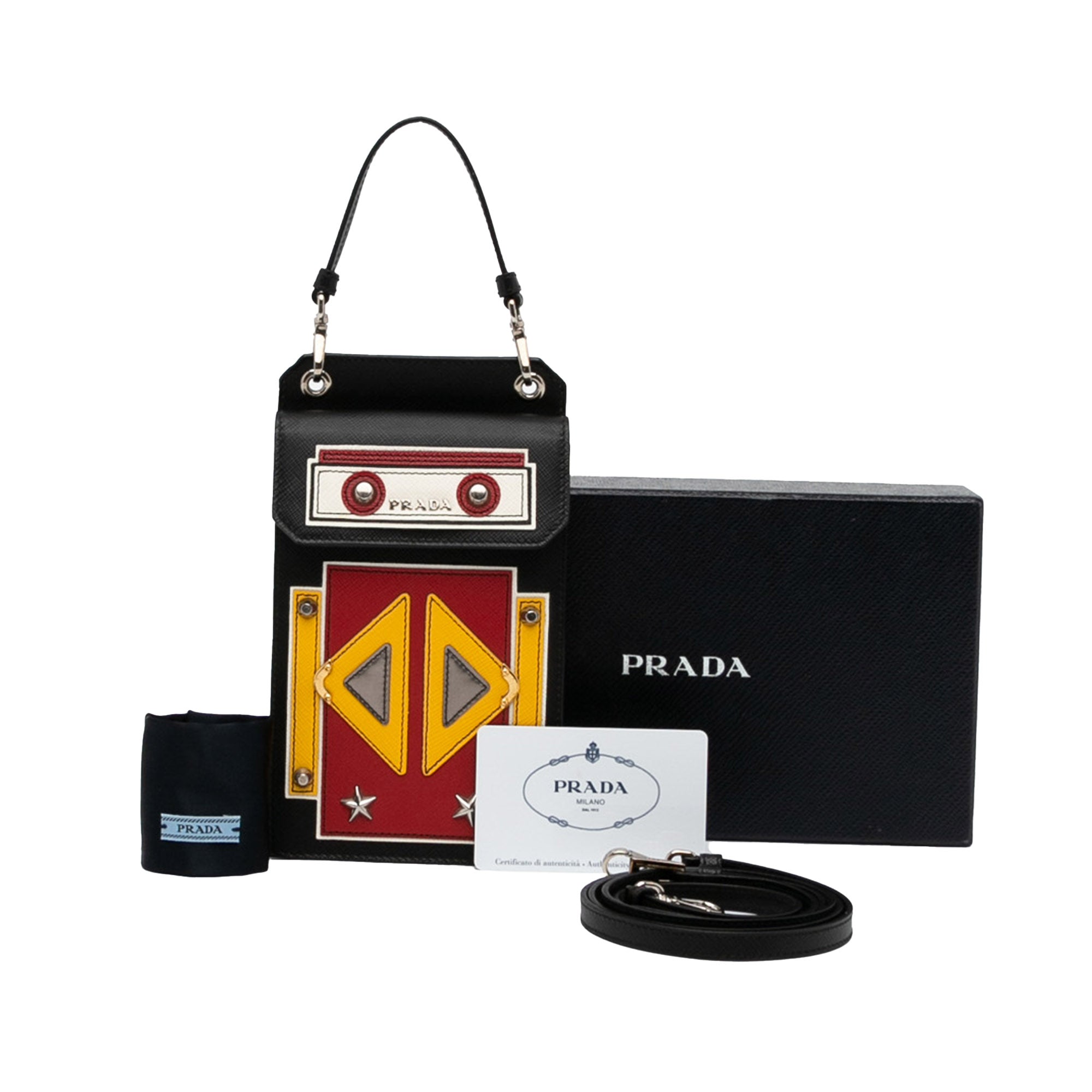 This Prada Womens Robot Motif Case Crossbody Bag is crafted of black Saffiano leather and features a snap-fastening flap and a small red Bag on the back. The silver-tone hardware gives the Bag a shiny accent. The Bag can be worn across the body or loosely over the shoulder with the detachable shoulder strap.