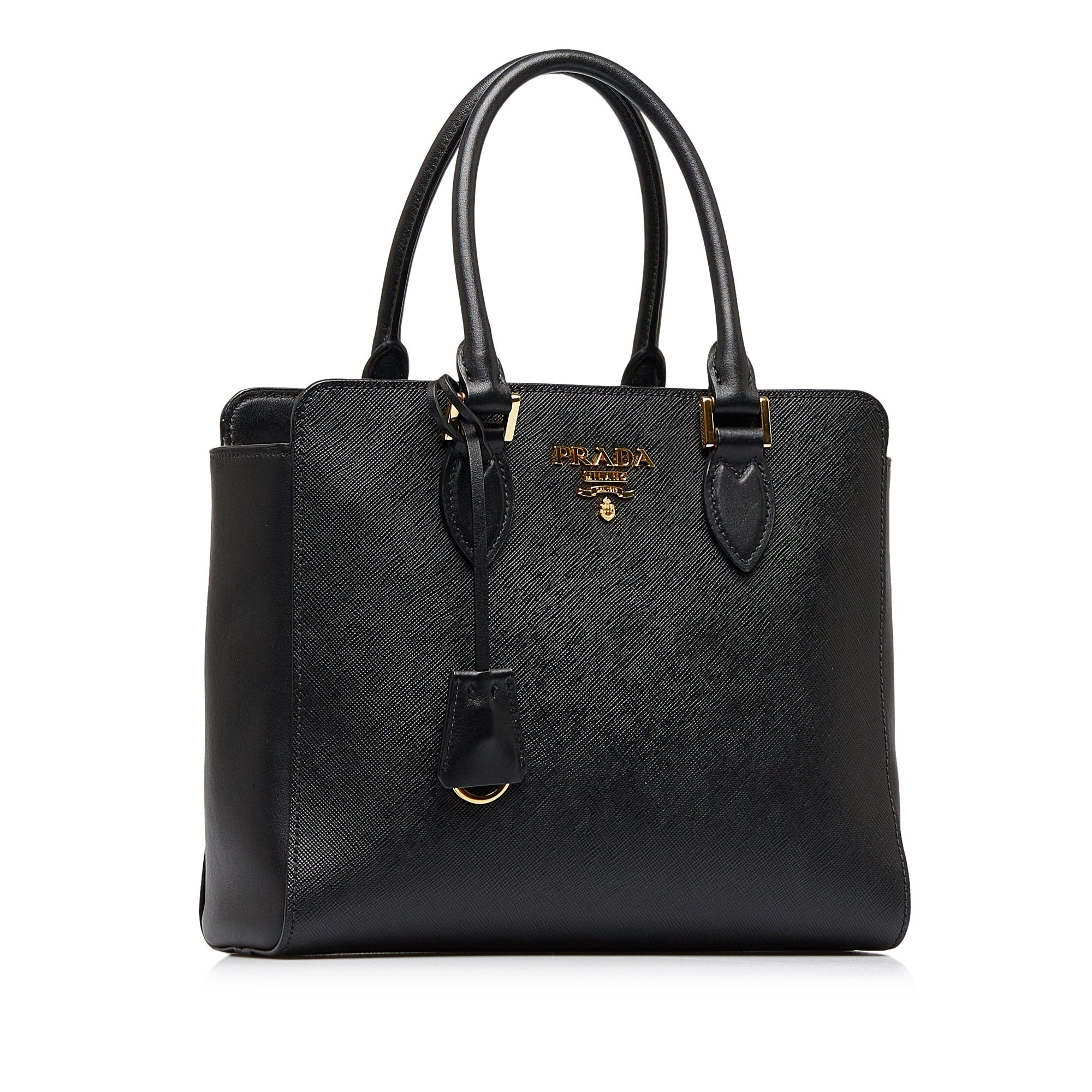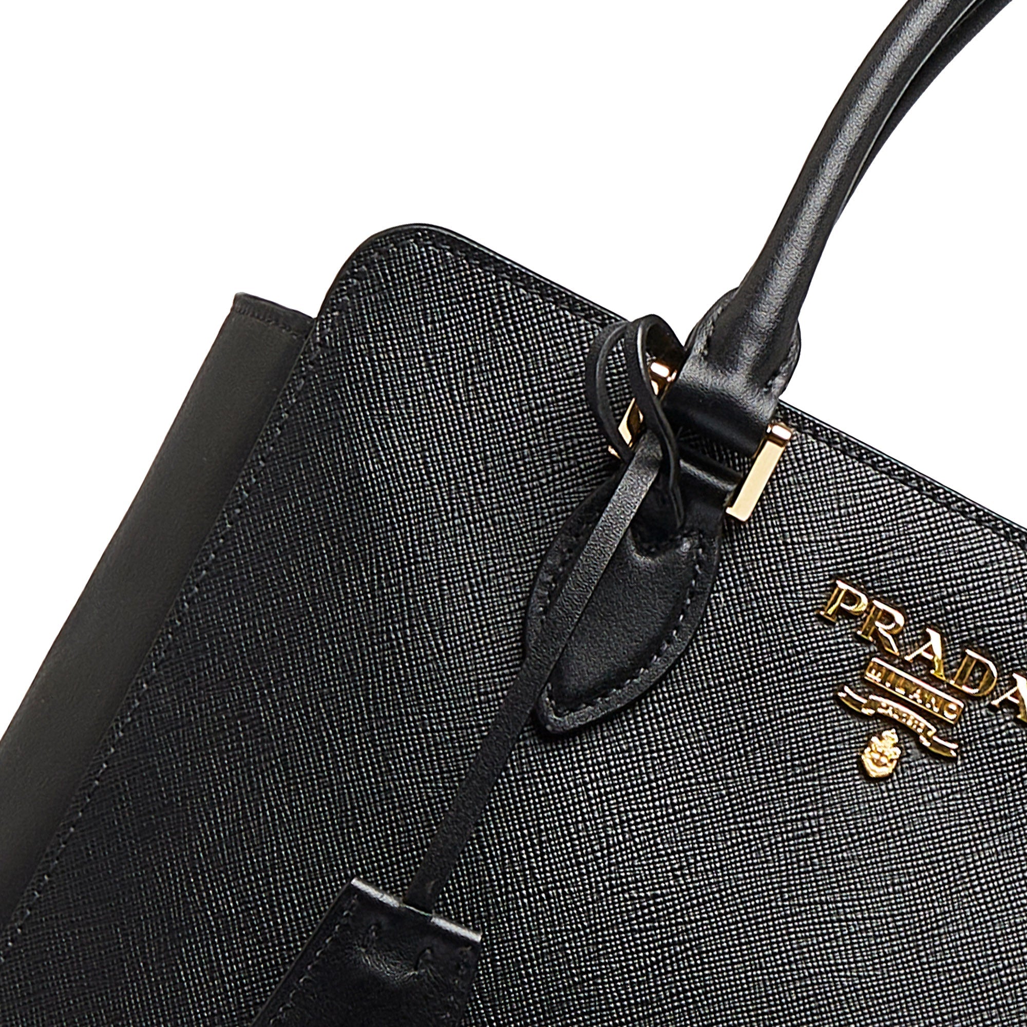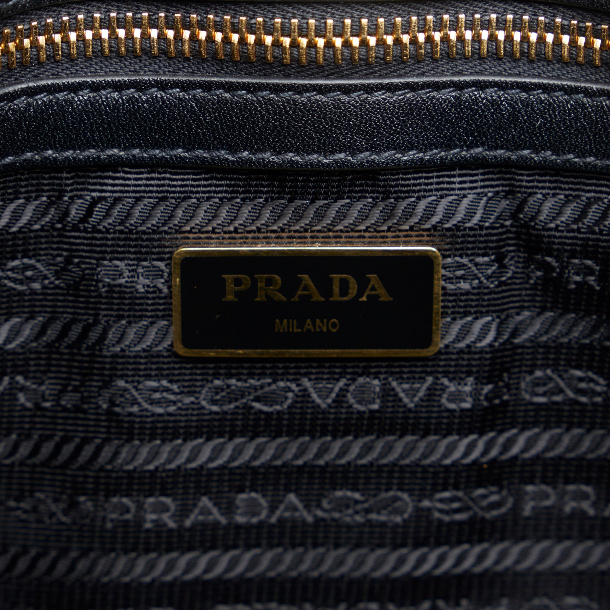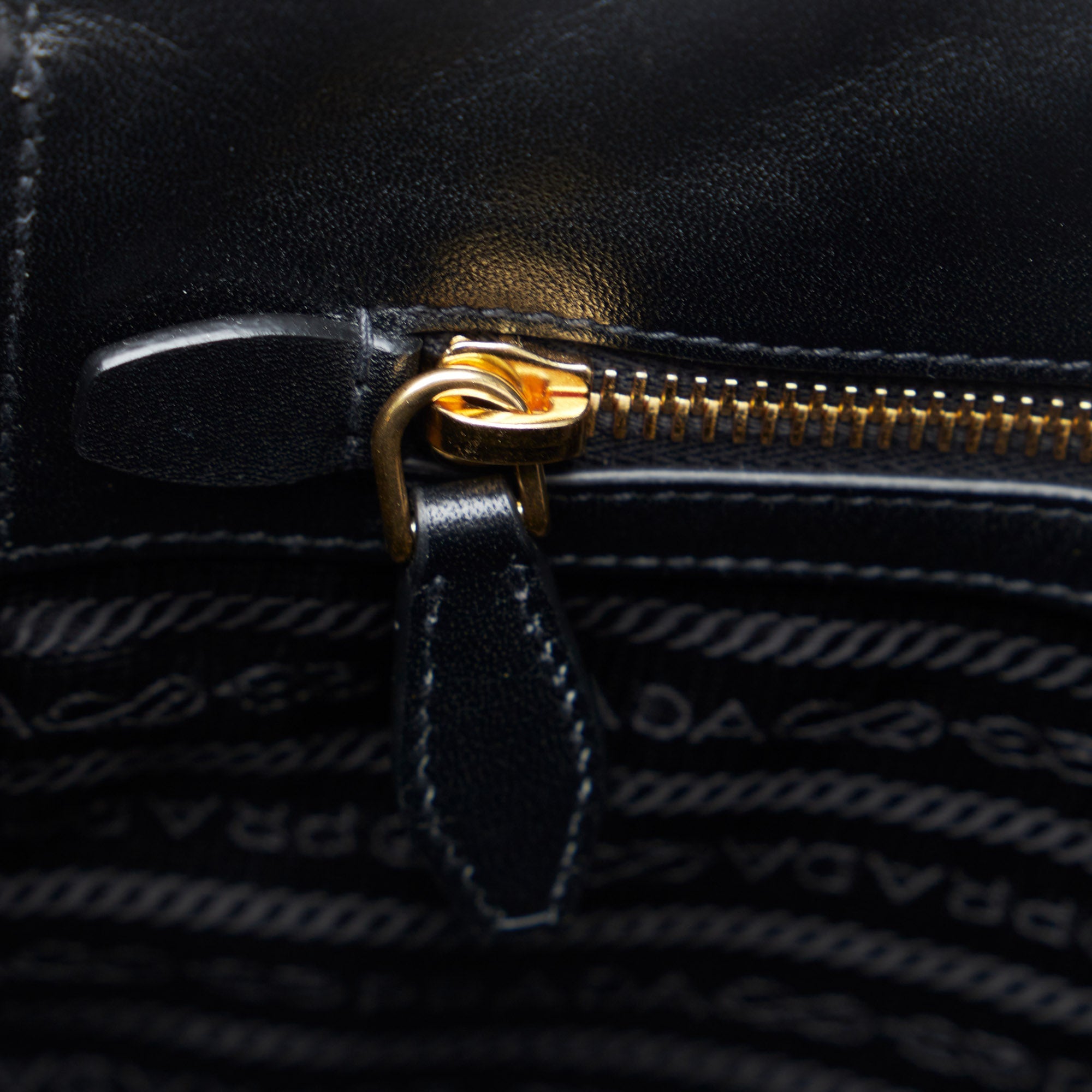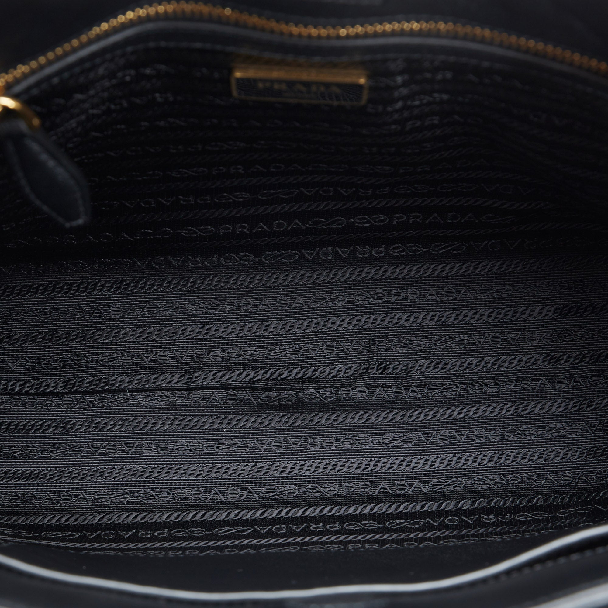 This stunning Prada Saffiano shoulder bag is made of black leather, has rolled leather handles with gold-tone details, a detachable flat leather strap, an open top, and zippered and slip pockets inside. The Bag can be worn comfortably loose over the shoulder or over the arm.
