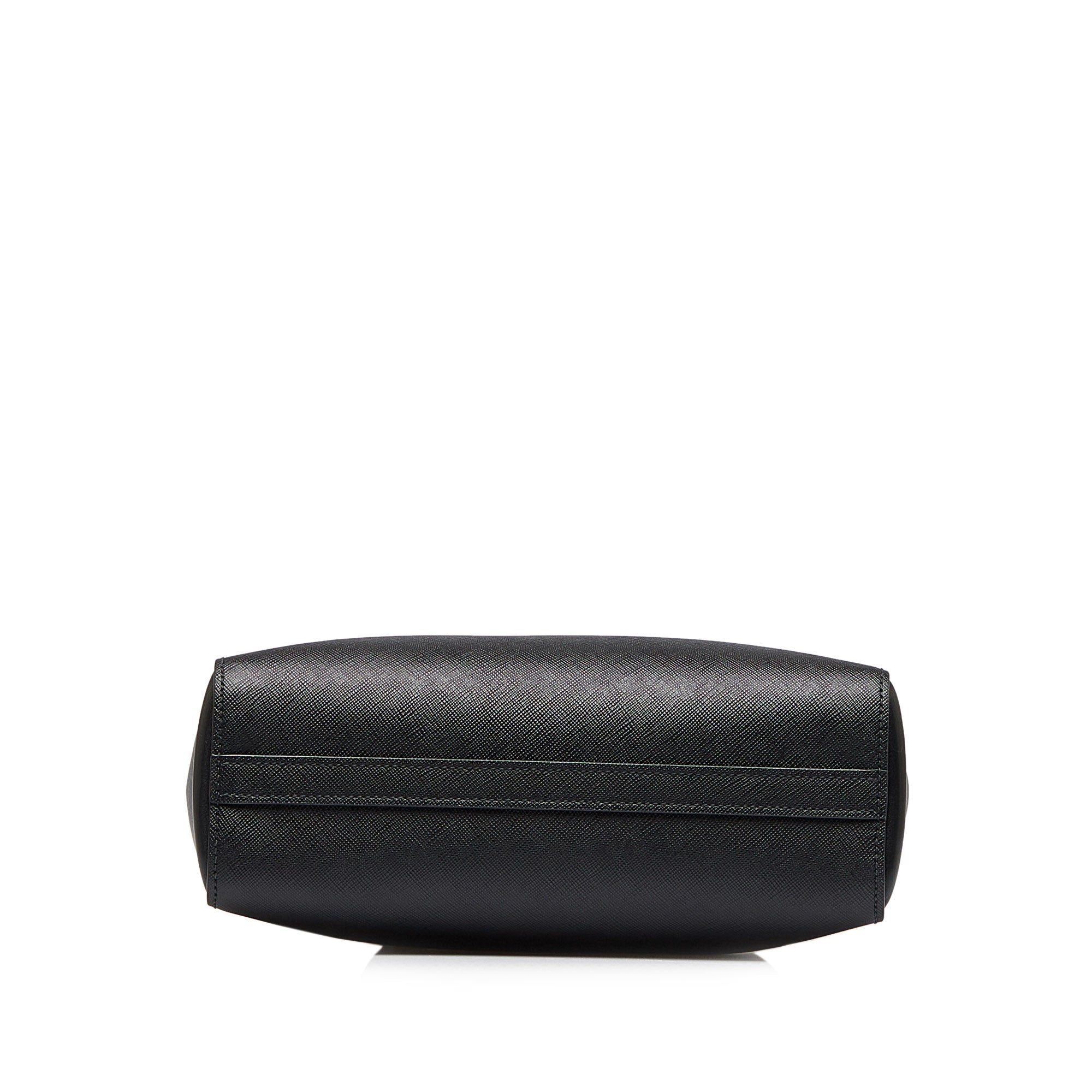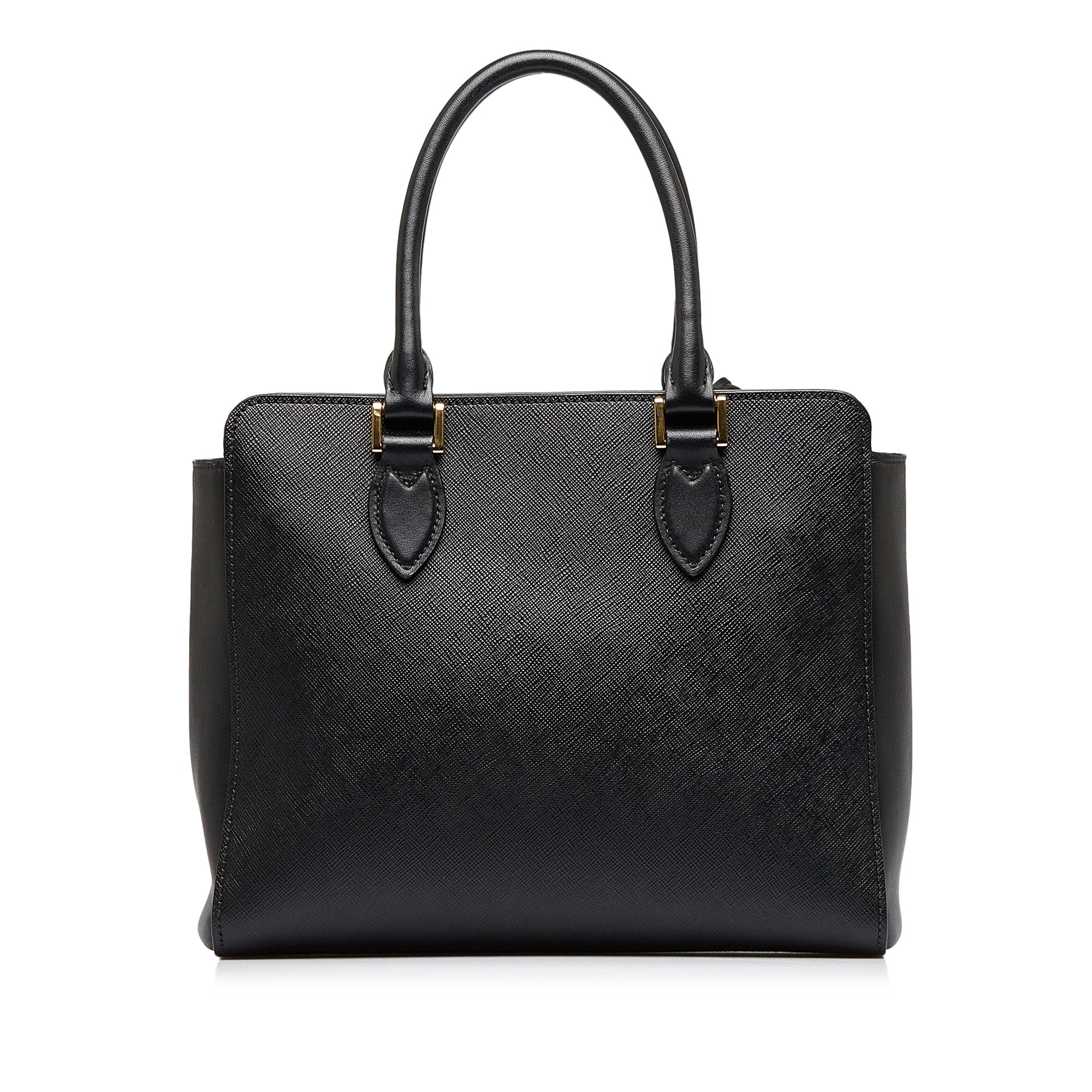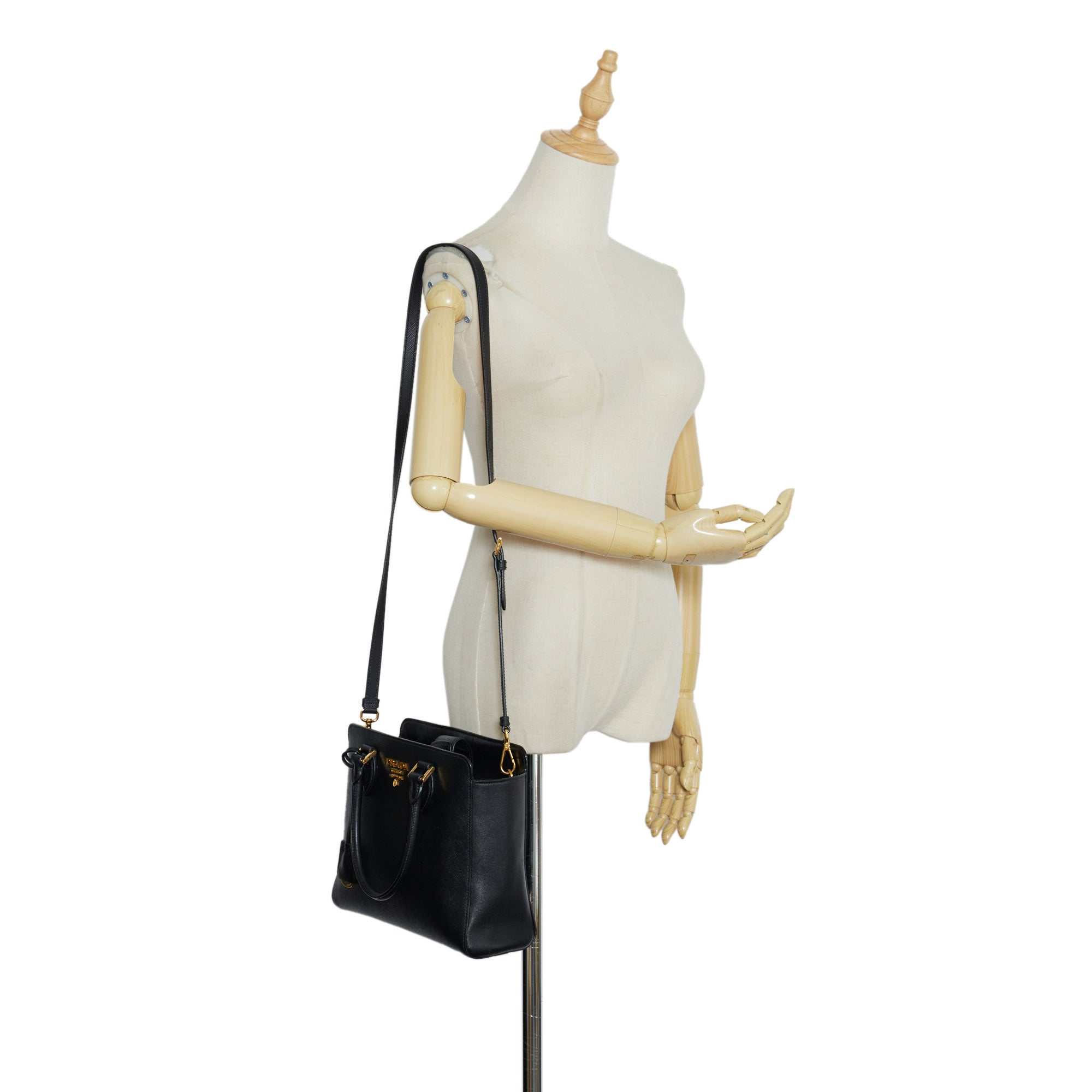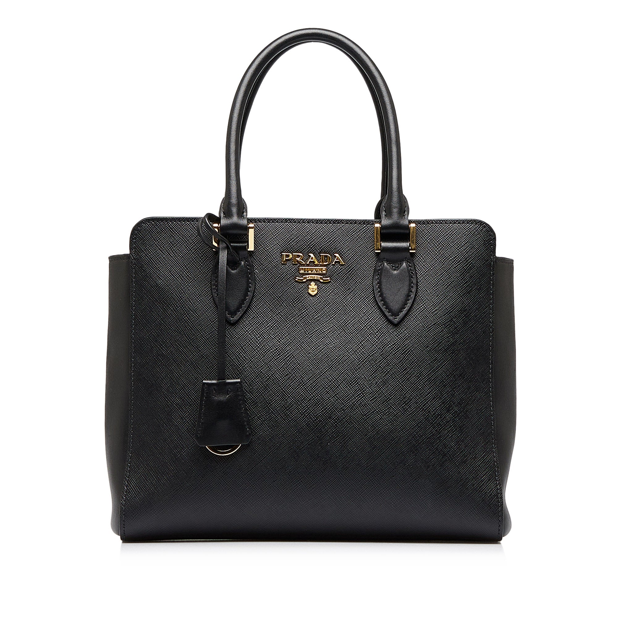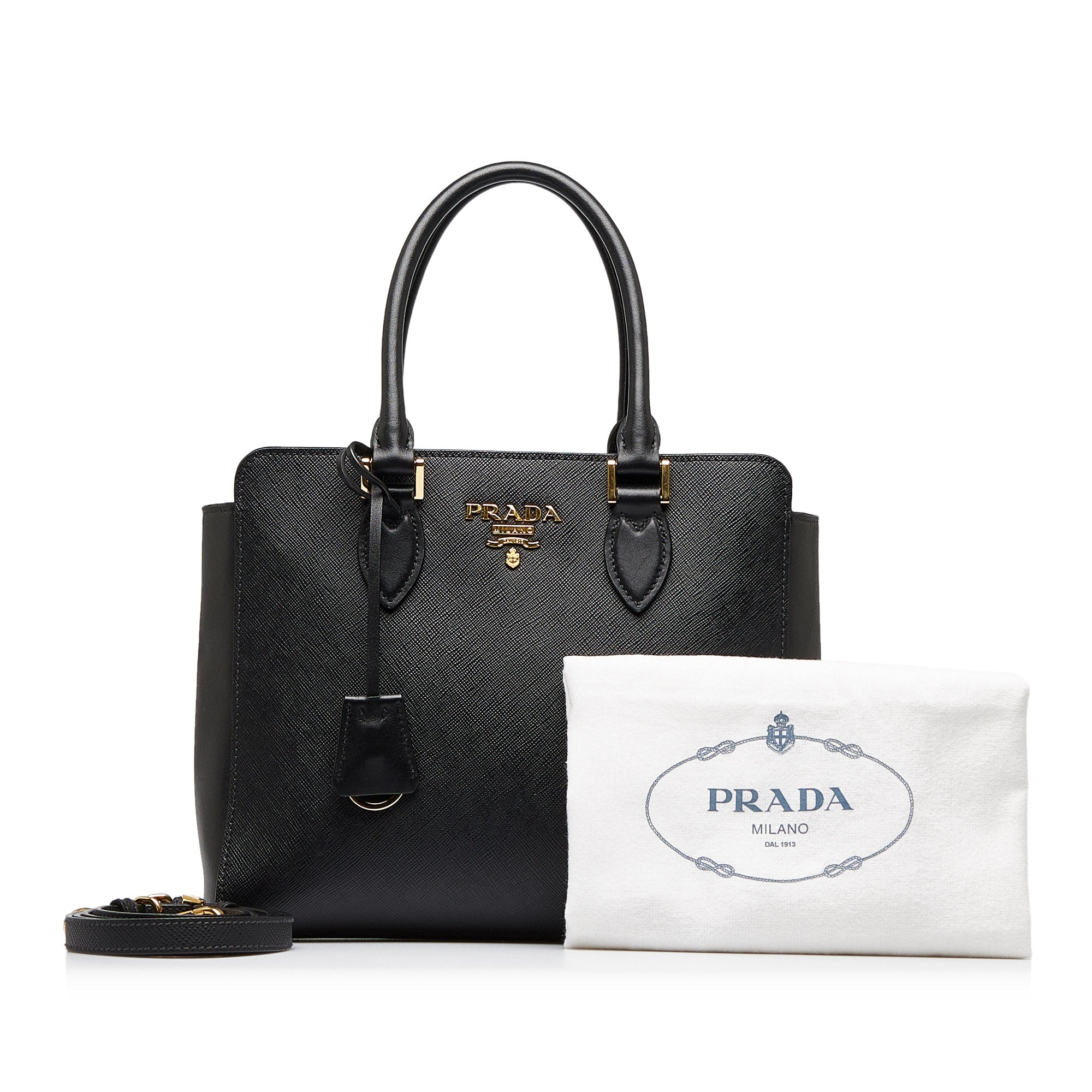 This stunning Prada Saffiano shoulder bag is made of black leather, has rolled leather handles with gold-tone details, a detachable flat leather strap, an open top, and zippered and slip pockets inside. The Bag can be worn comfortably loose over the shoulder or over the arm.