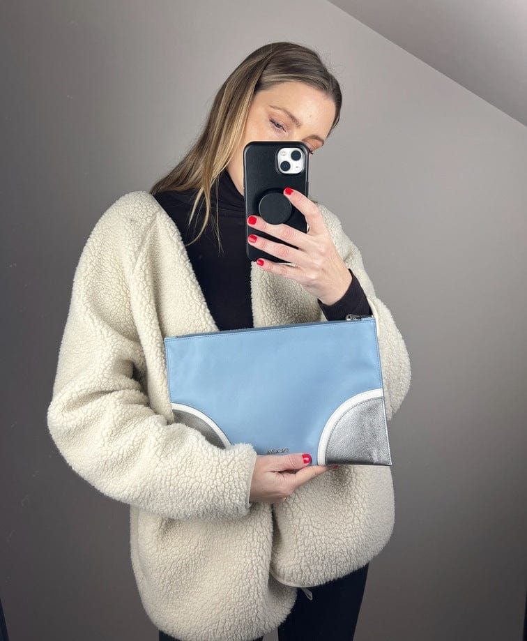 Top zip closure and inside there is a further zipped pocket plus a slip pocket for valuables. There is also a little strap on back panel to make it easier to hold as a clutch bag.