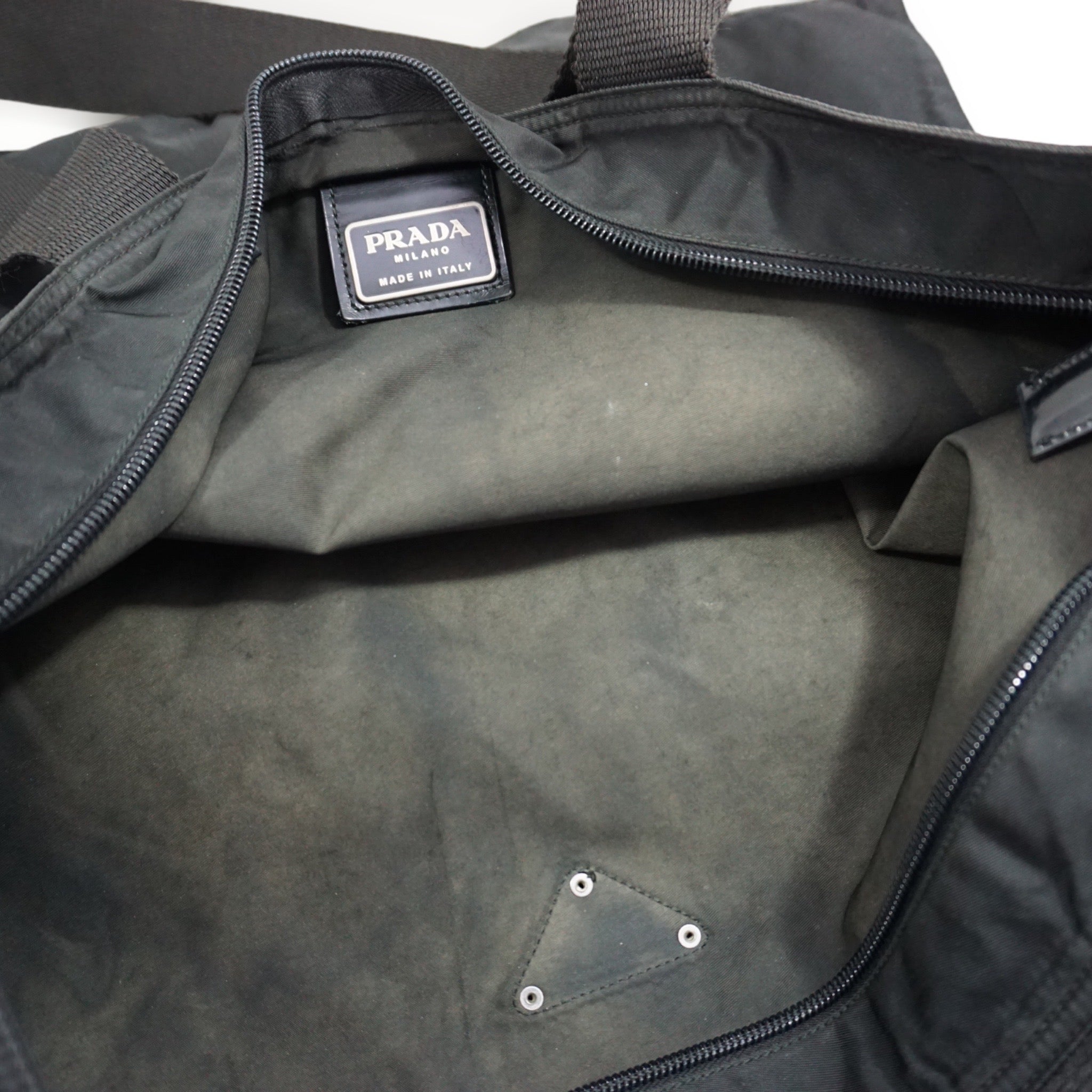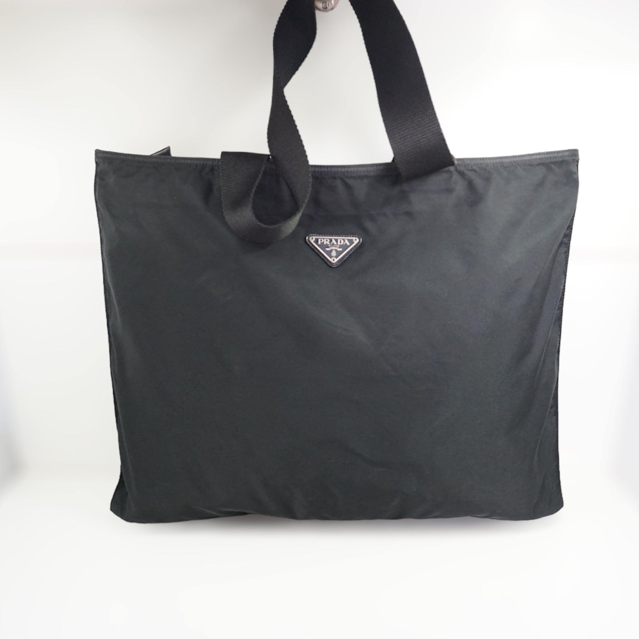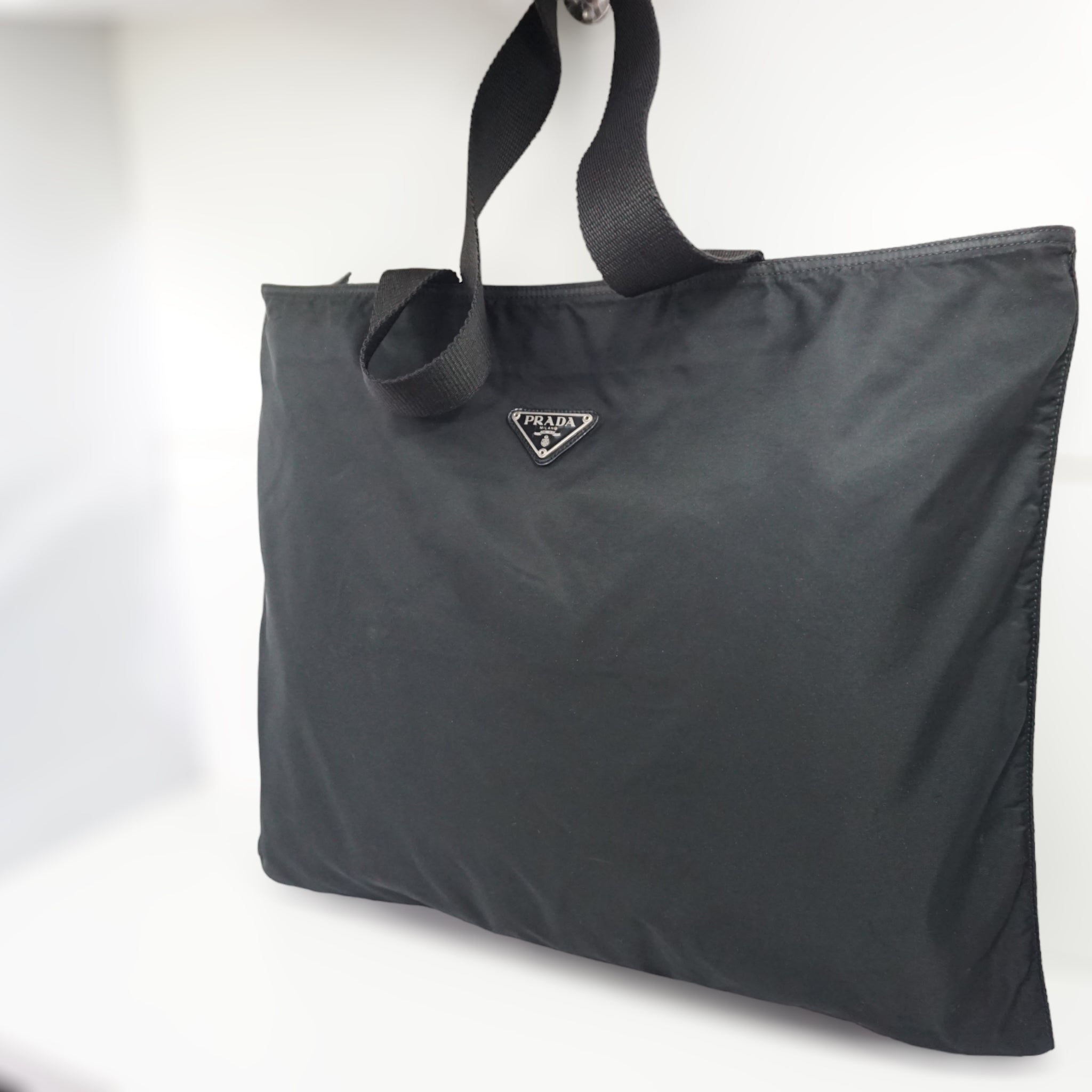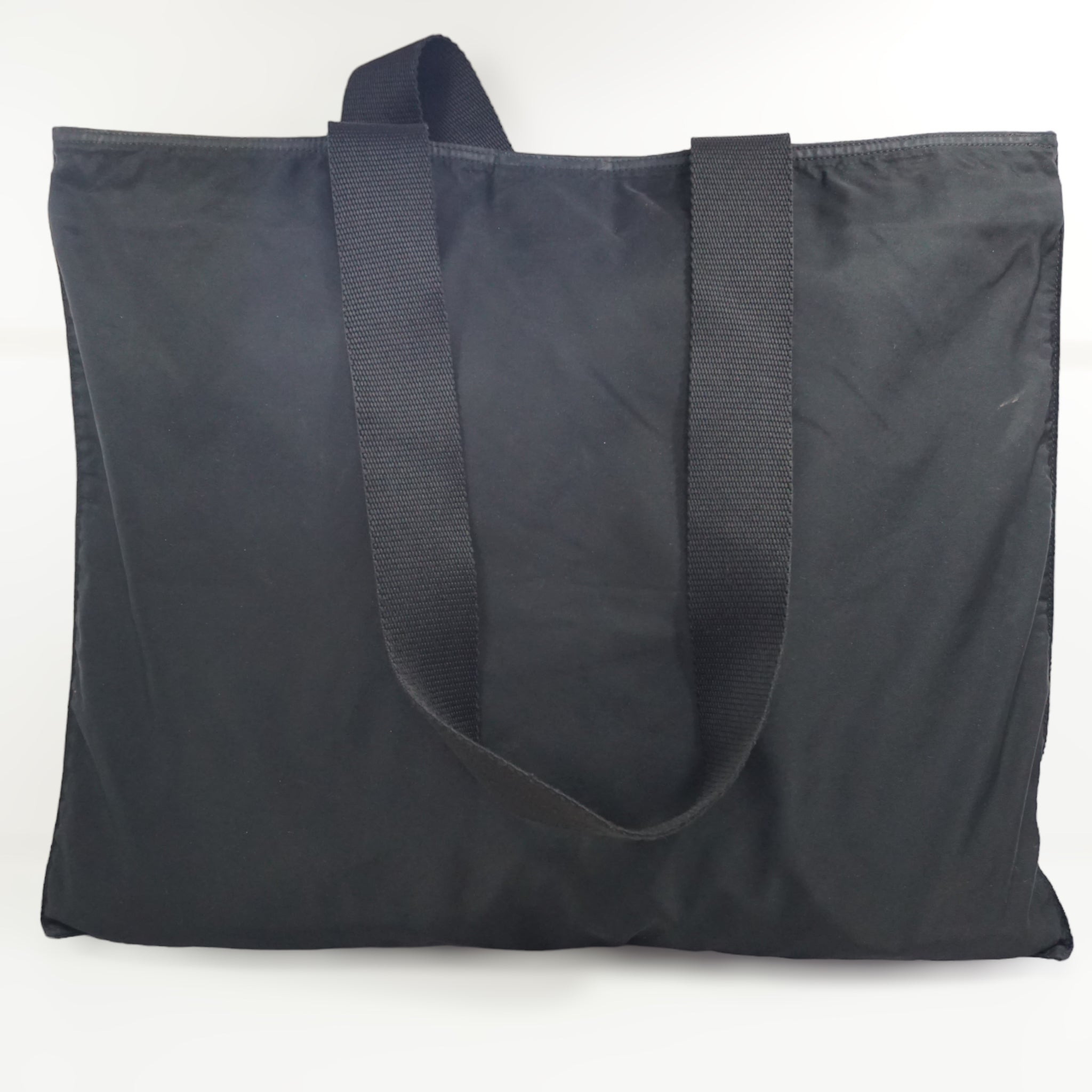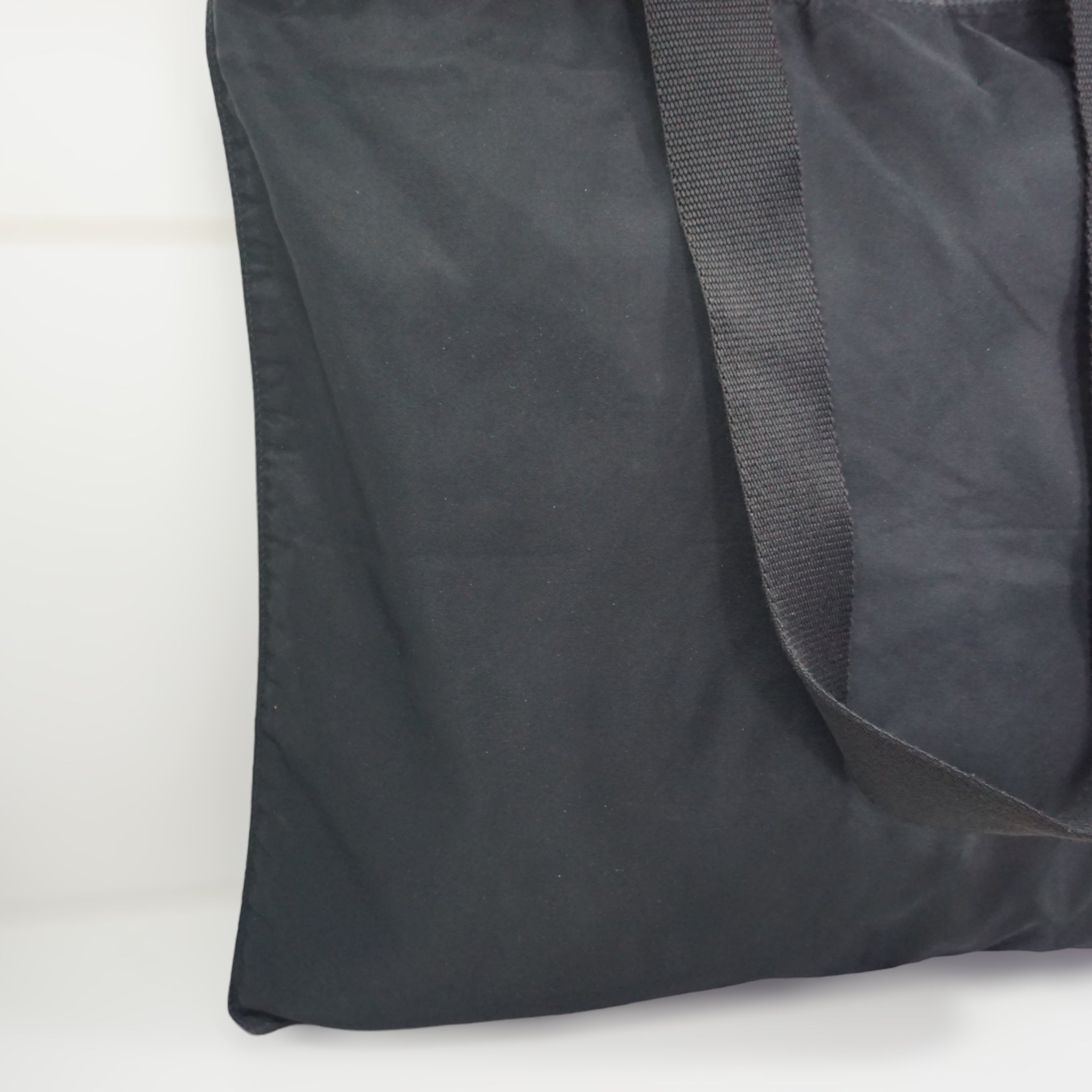 Prada skuldertaske i sort nylon og canvas skulderrem. Tasken kan rumme en laptop og er oplagt til studiebrug.