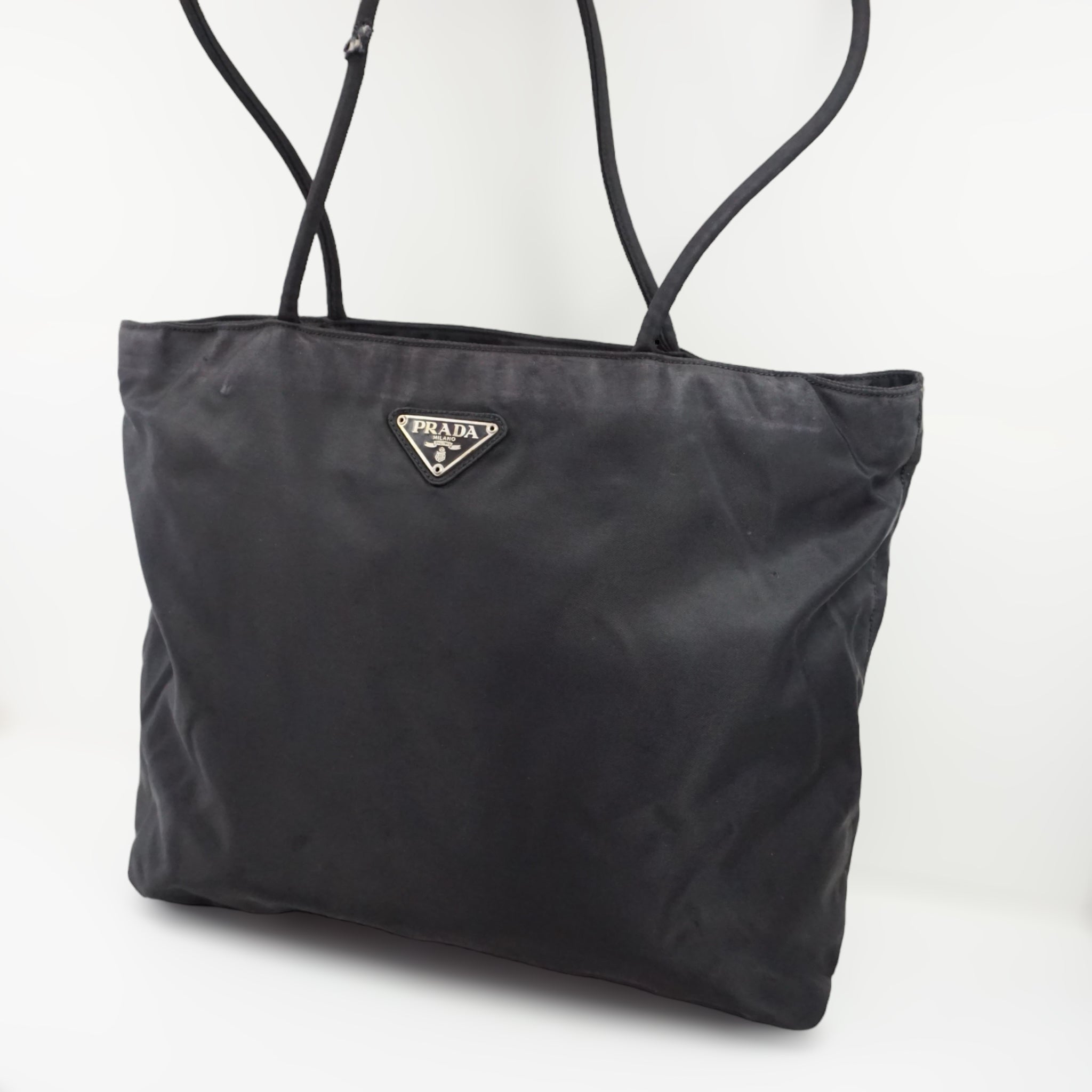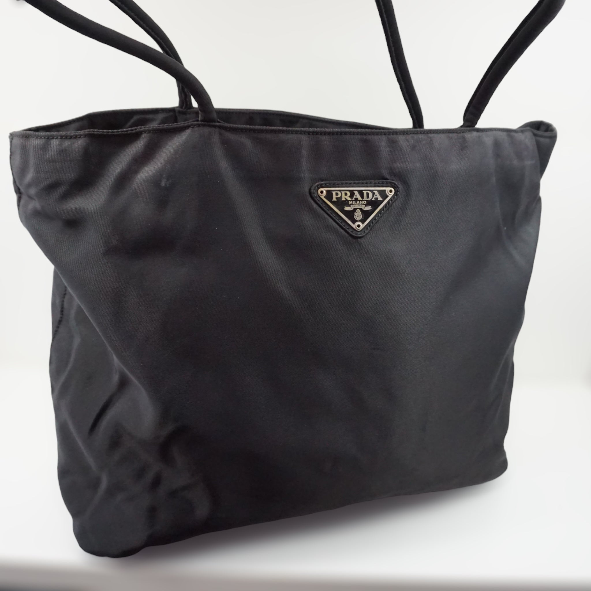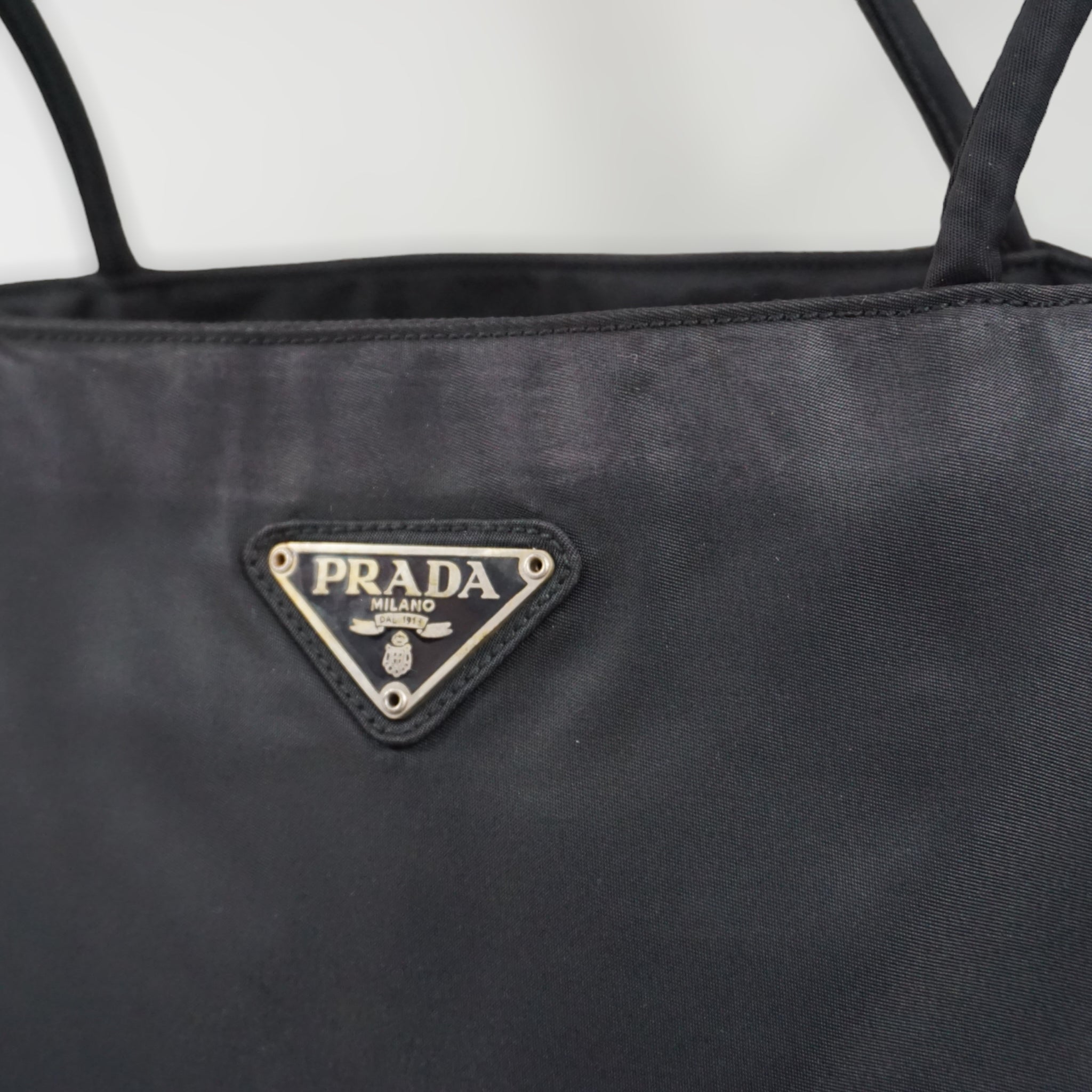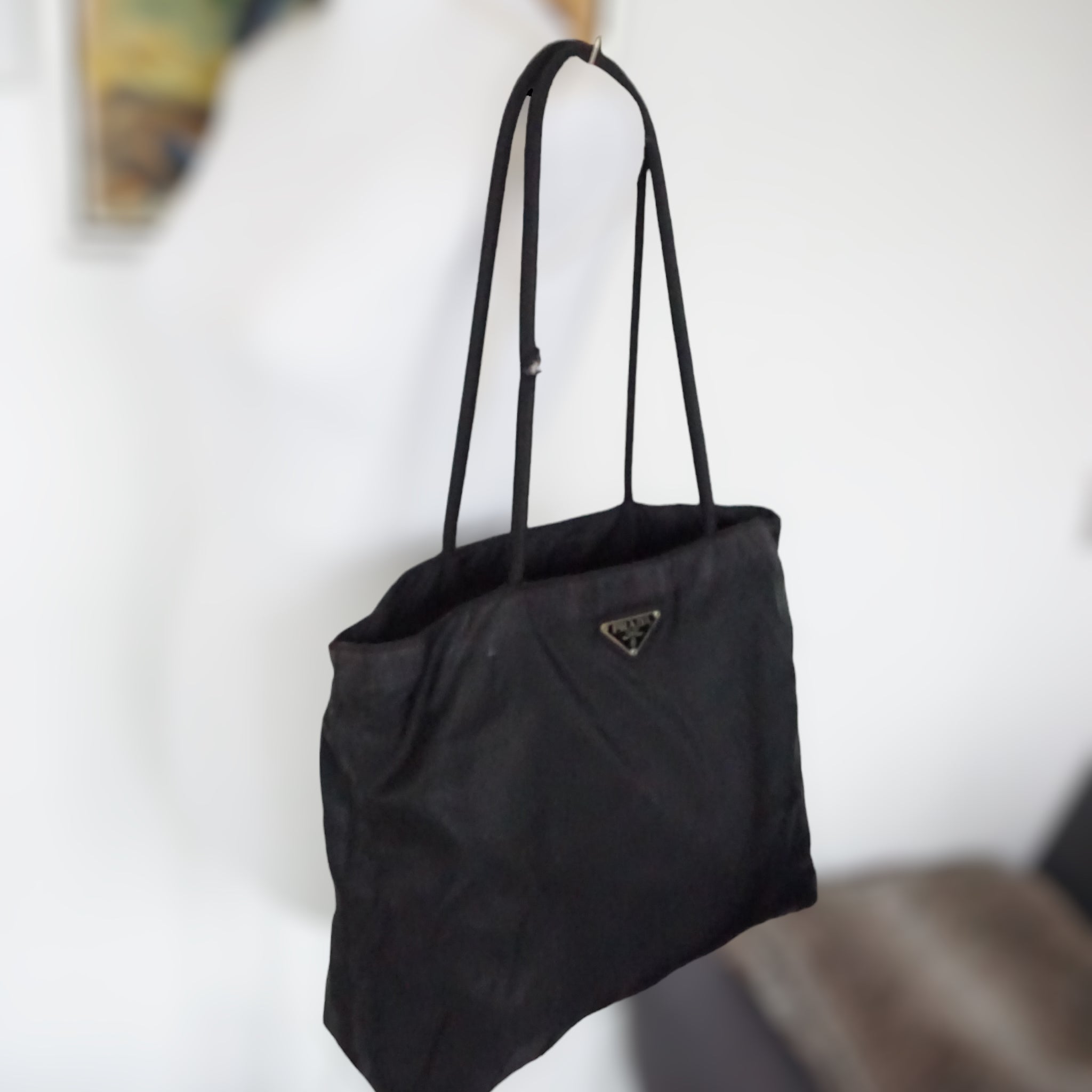 Klassisk Prada skuldertaske i sort nylon.