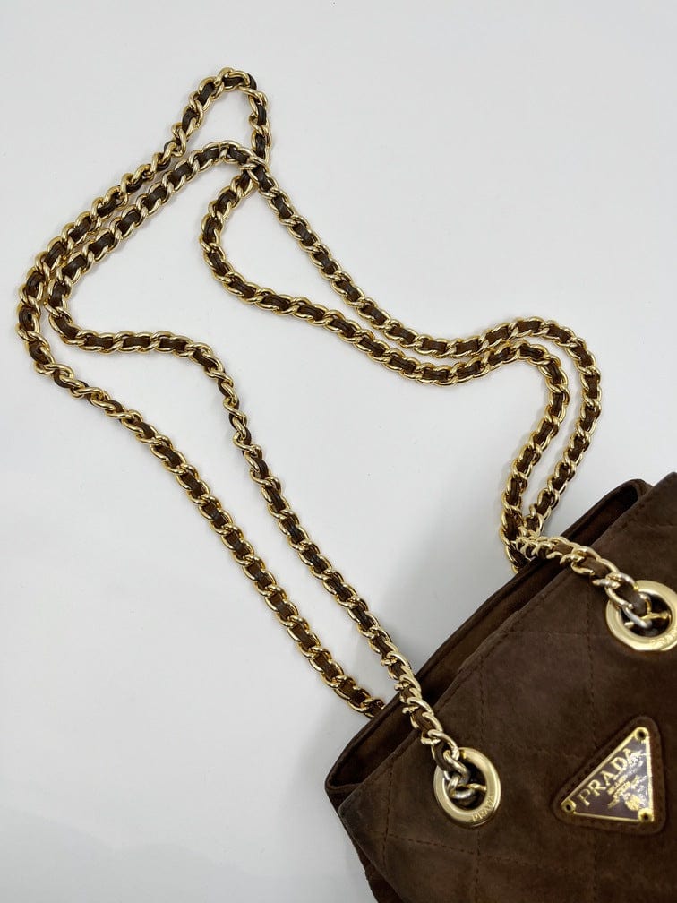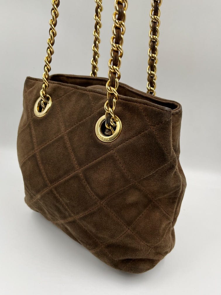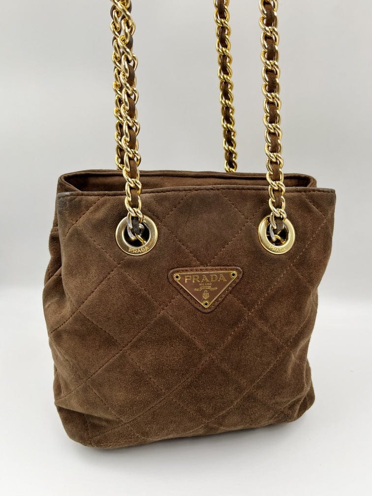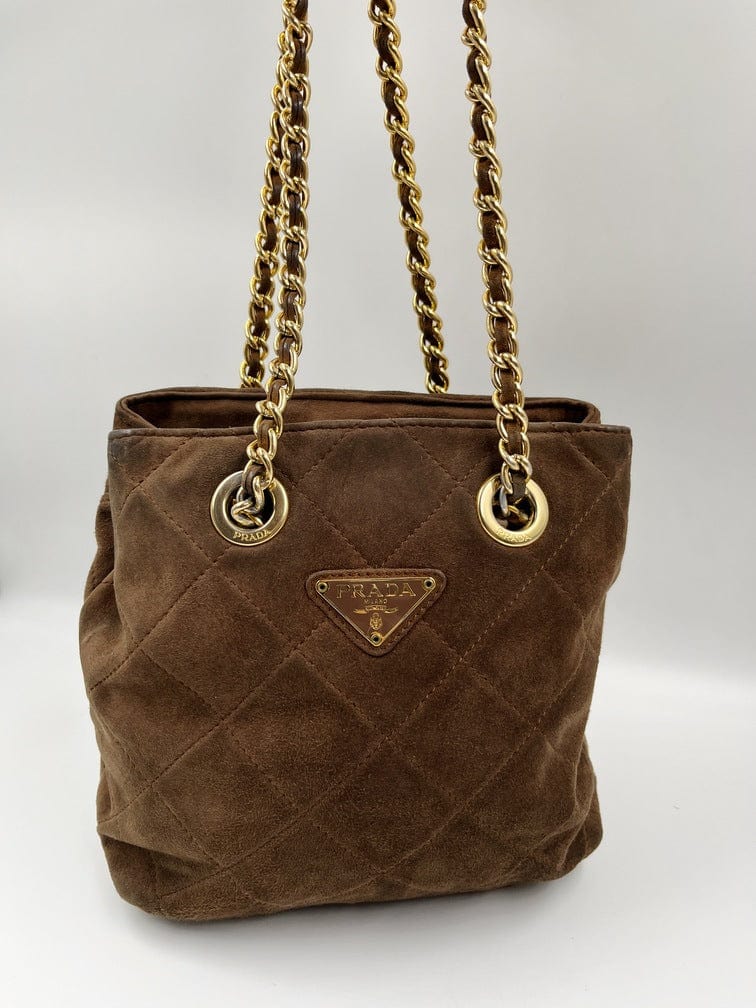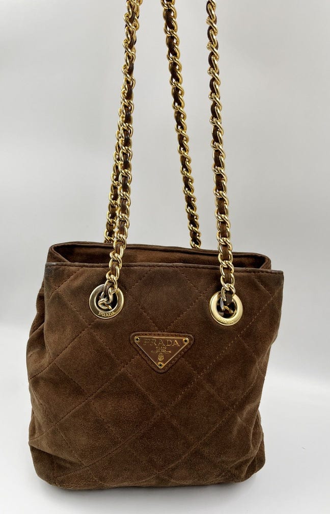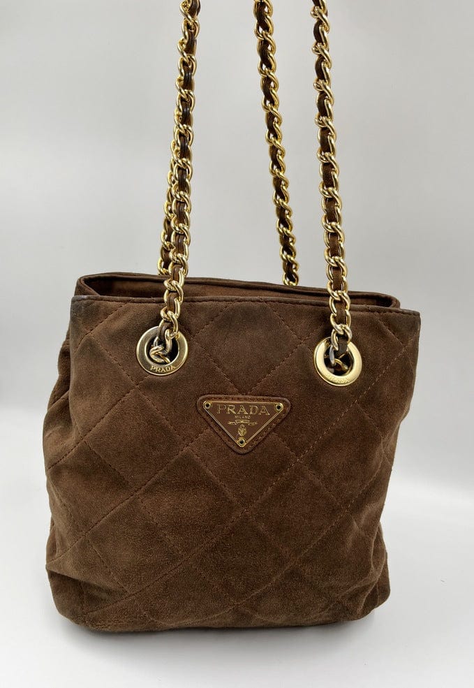A stunning suede brown Prada tote with a double chain handle. The gold chain has brown suede threaded through. Inside the bag is lined with the famous Prada logo nylon lining. There is an interior zipped pocket for valuables.