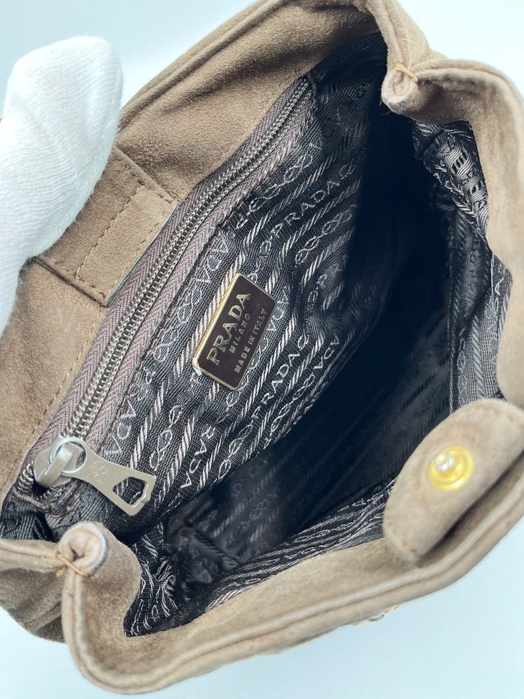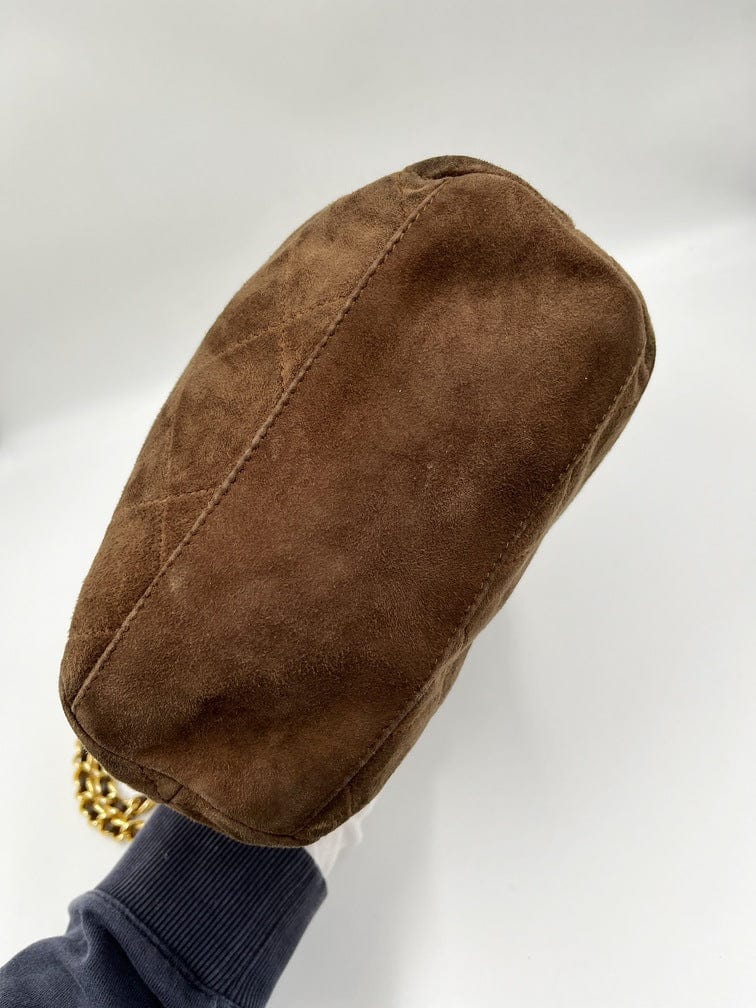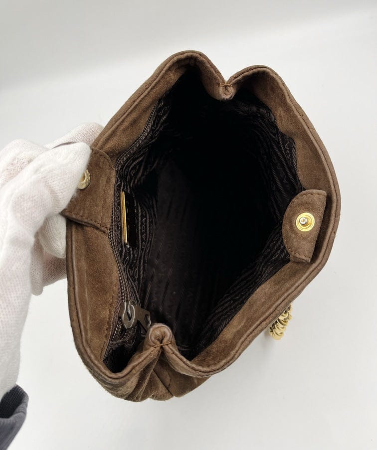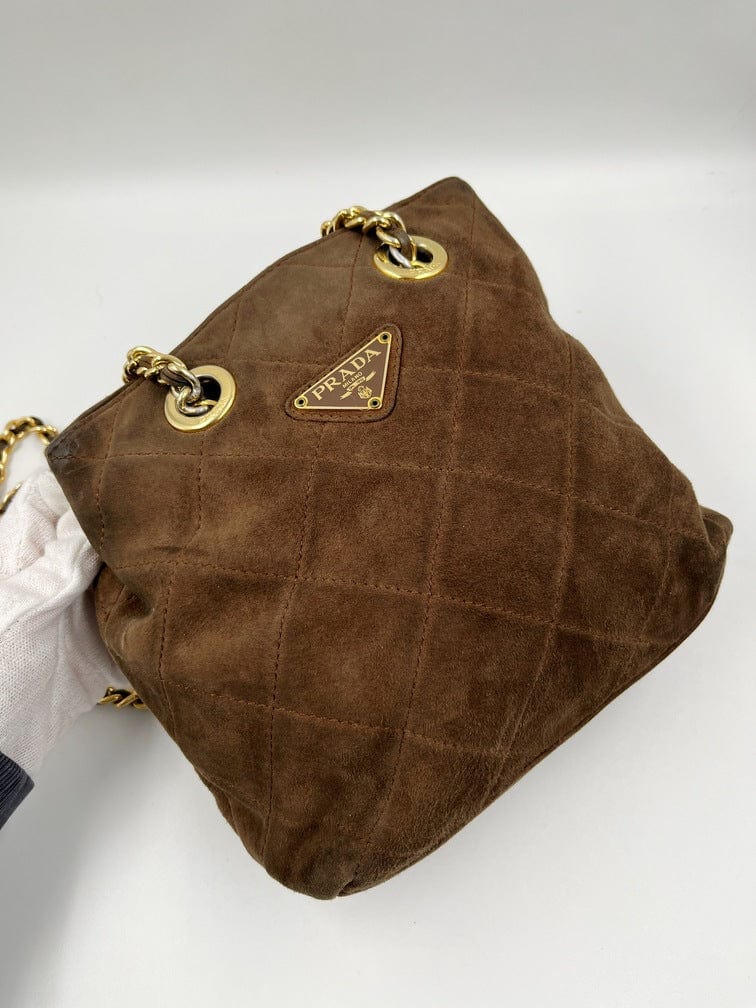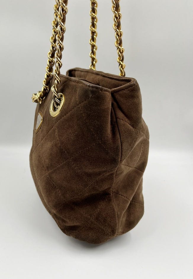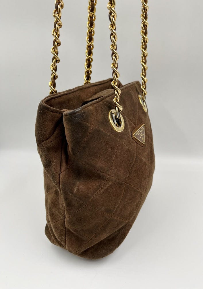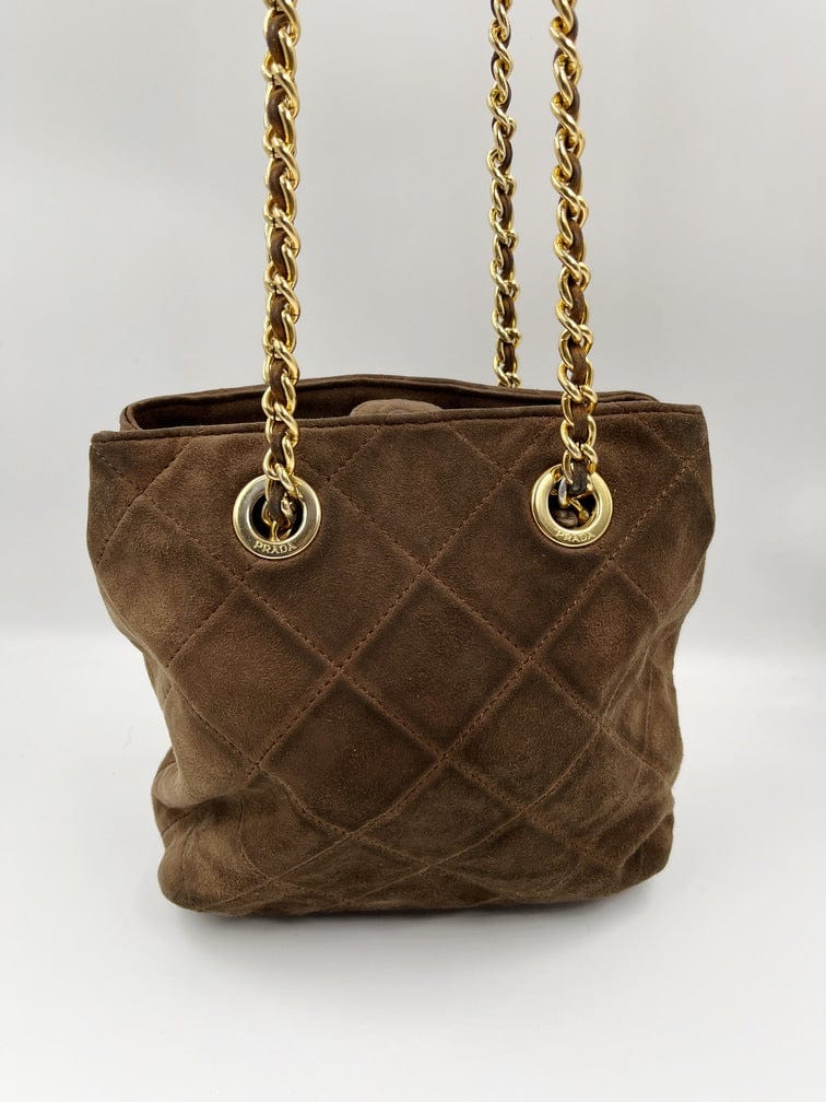 A stunning suede brown Prada tote with a double chain handle. The gold chain has brown suede threaded through. Inside the bag is lined with the famous Prada logo nylon lining. There is an interior zipped pocket for valuables.