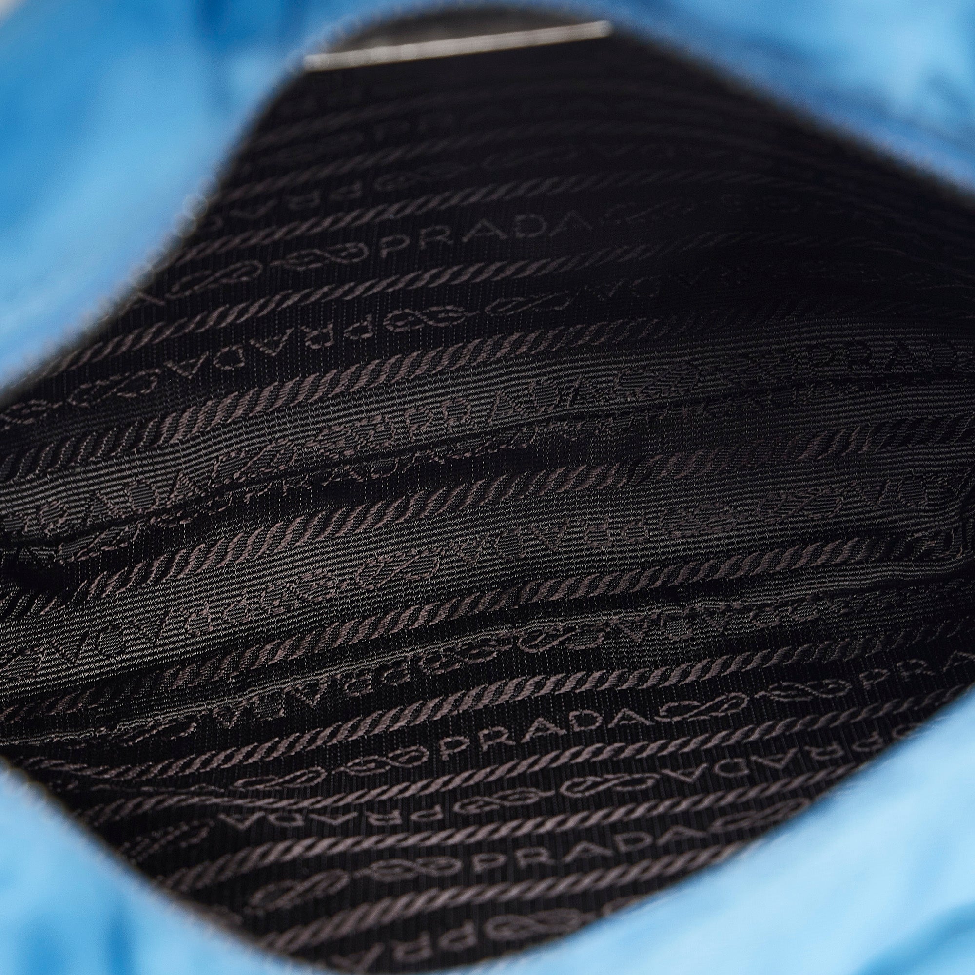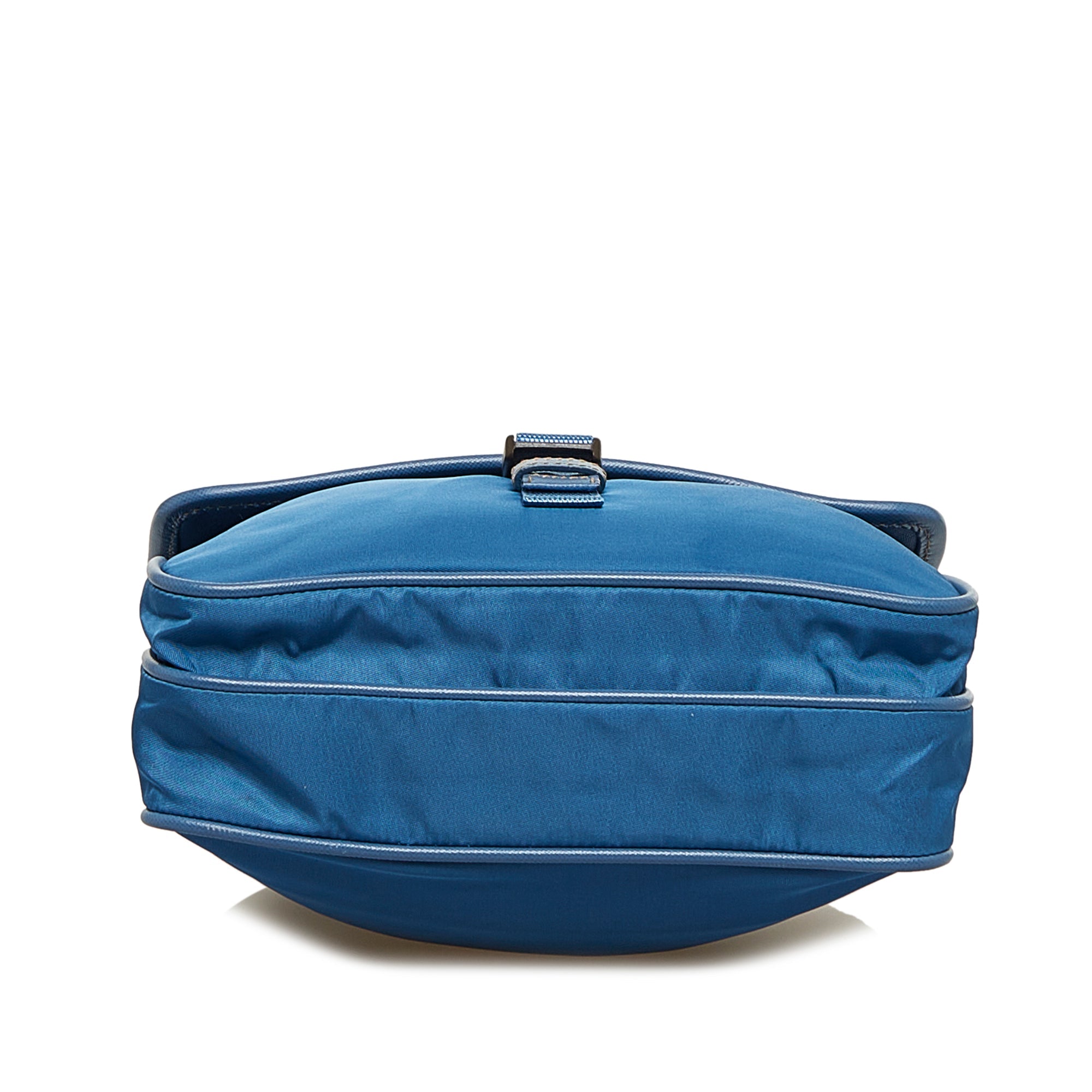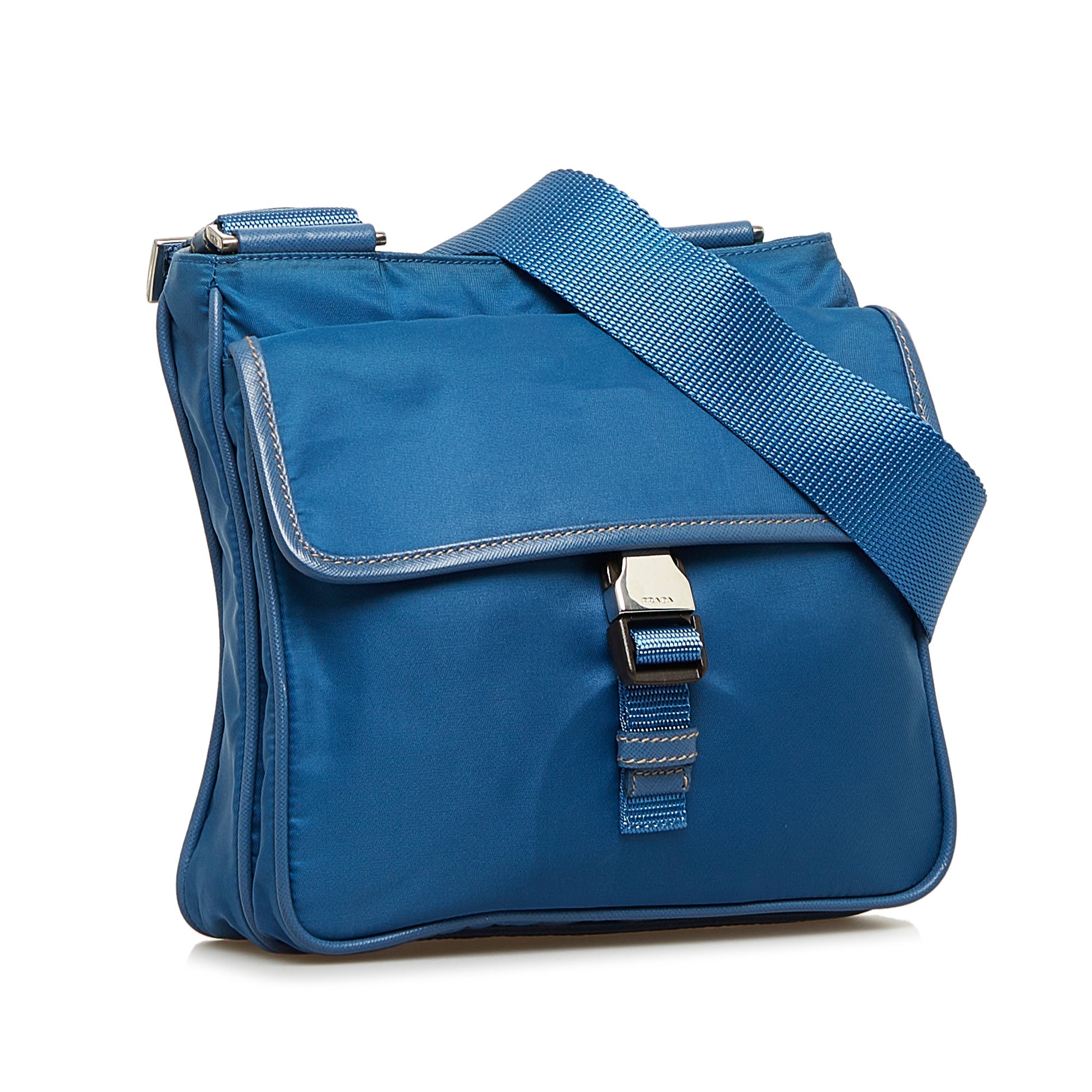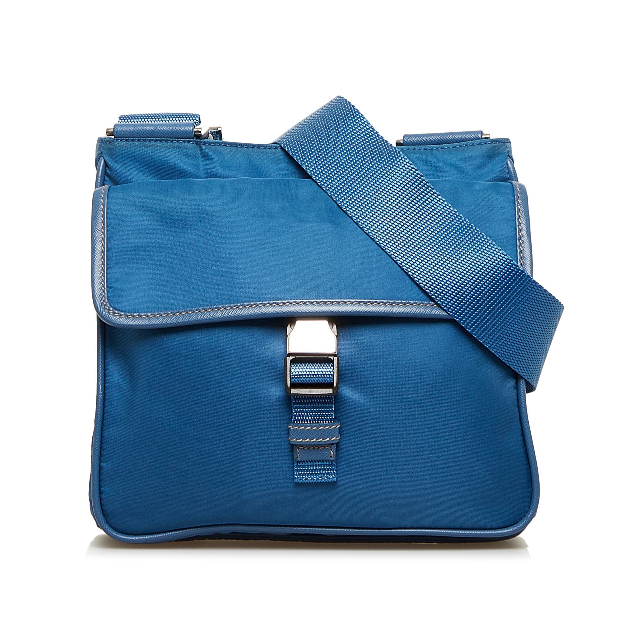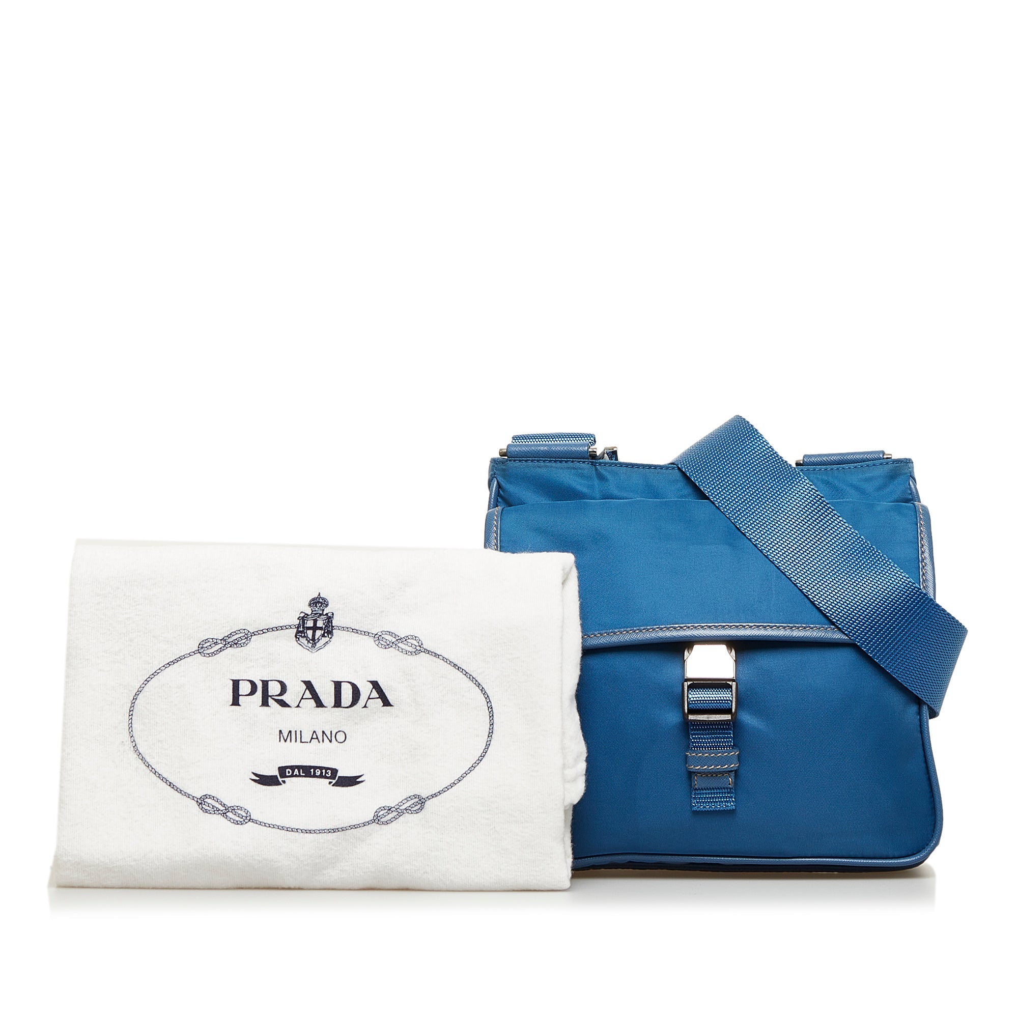 Crafted from light blue nylon fabric, this Prada Tessuto crossbody bag features Saffiano leather trims, gold details, an adjustable flat shoulder strap, and a flap compartment with a buckle closure at the front. The Bag is best worn across the body.