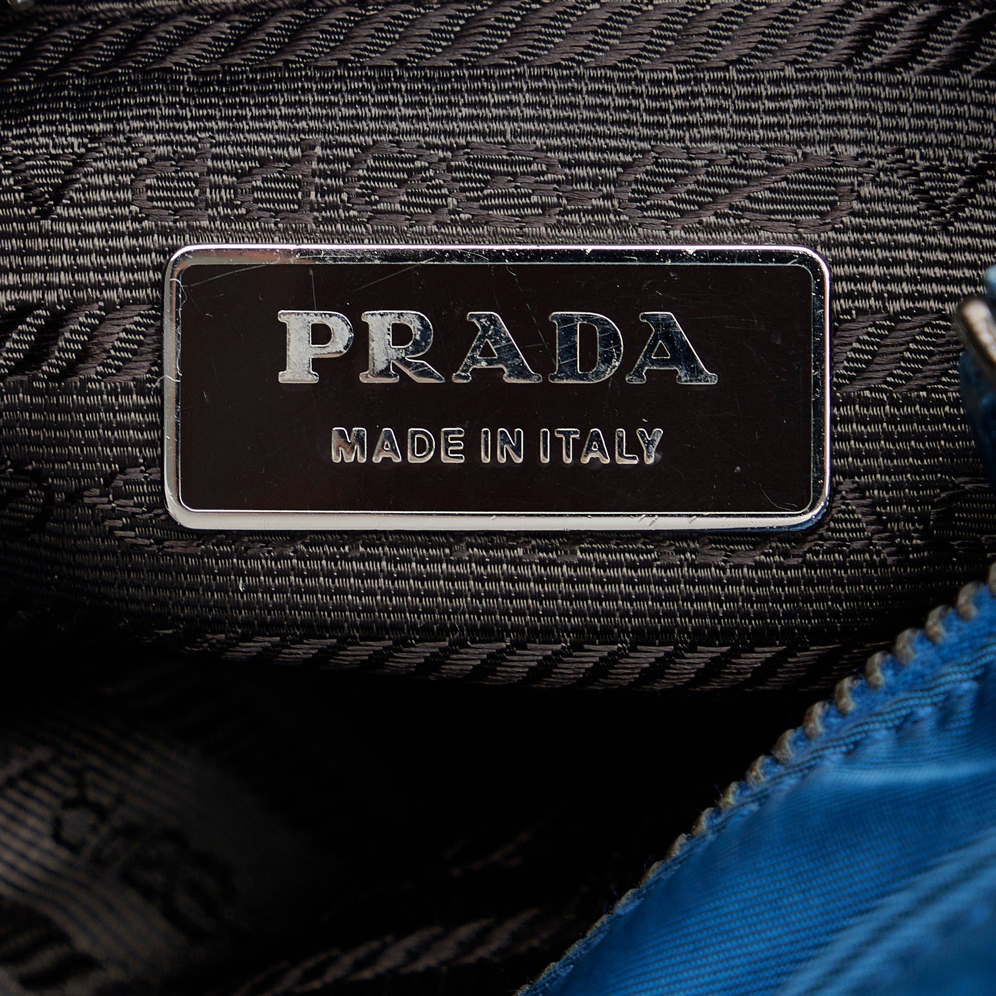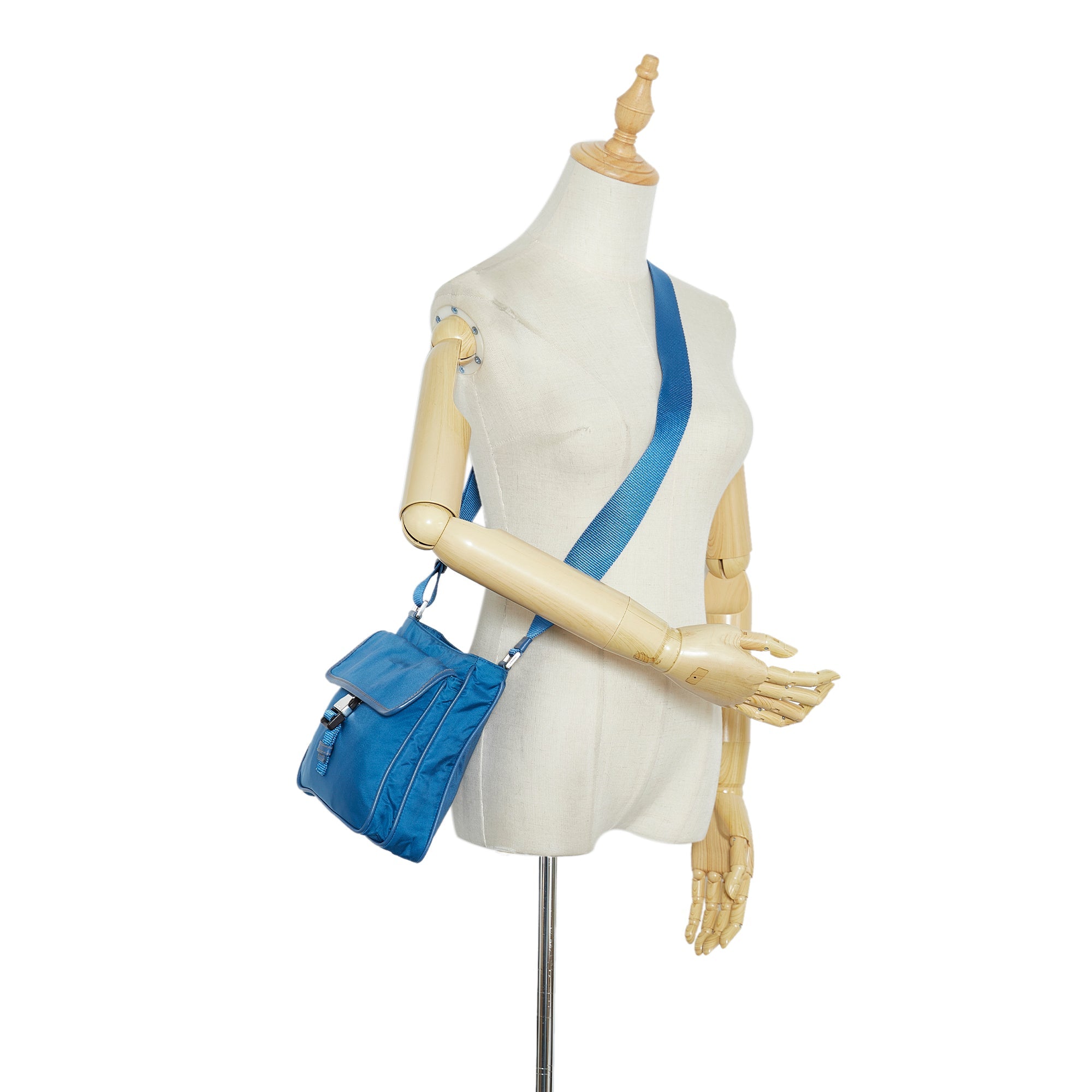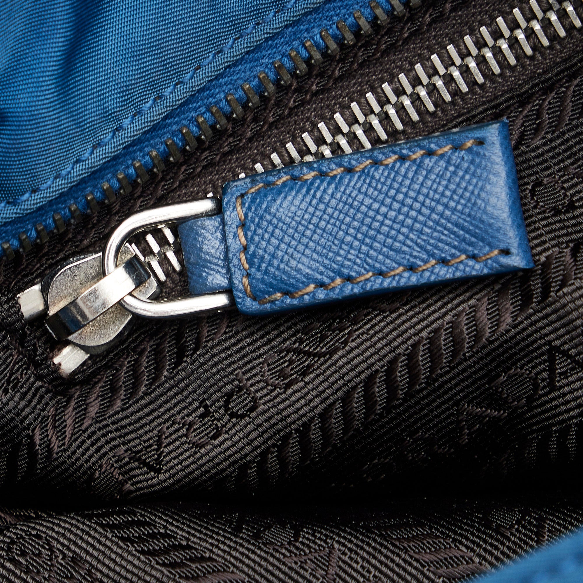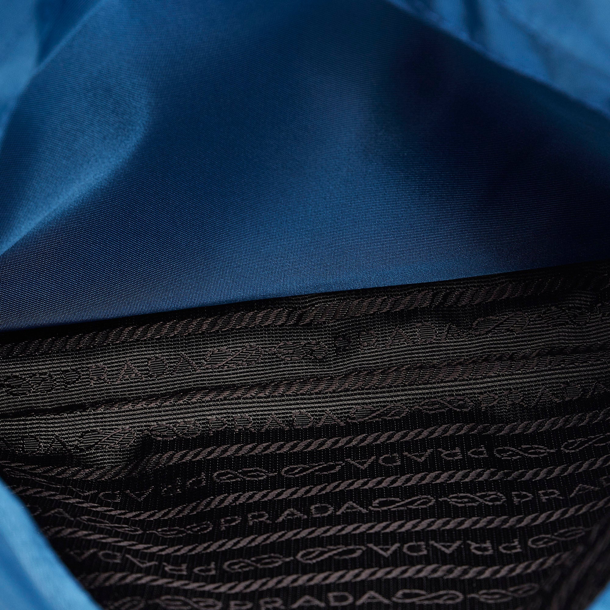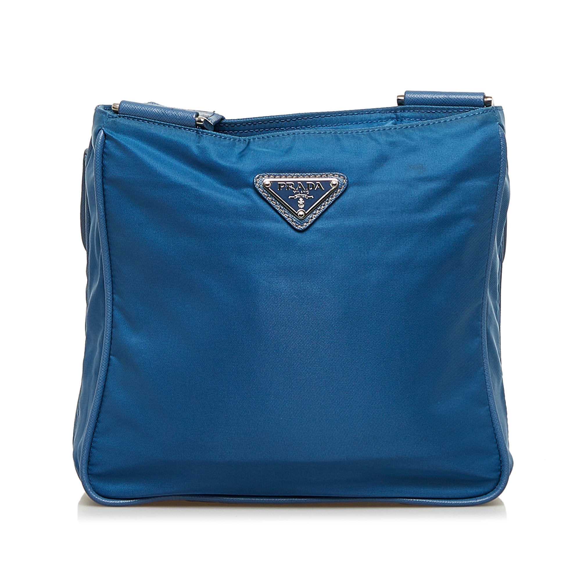 Crafted from light blue nylon fabric, this Prada Tessuto crossbody bag features Saffiano leather trims, gold details, an adjustable flat shoulder strap, and a flap compartment with a buckle closure at the front. The Bag is best worn across the body.