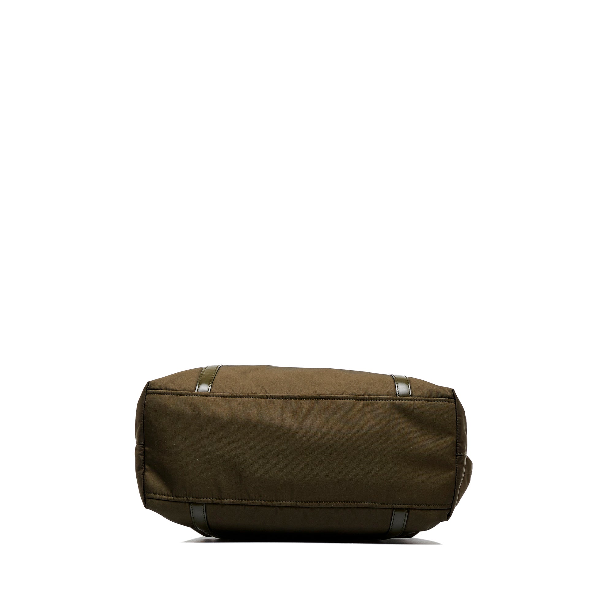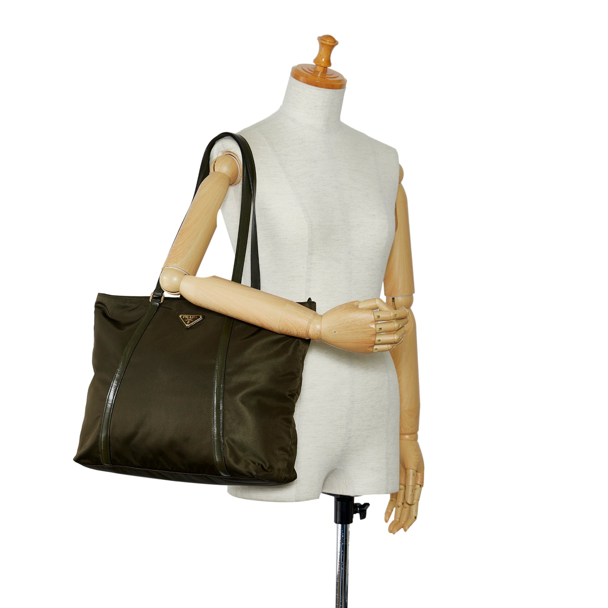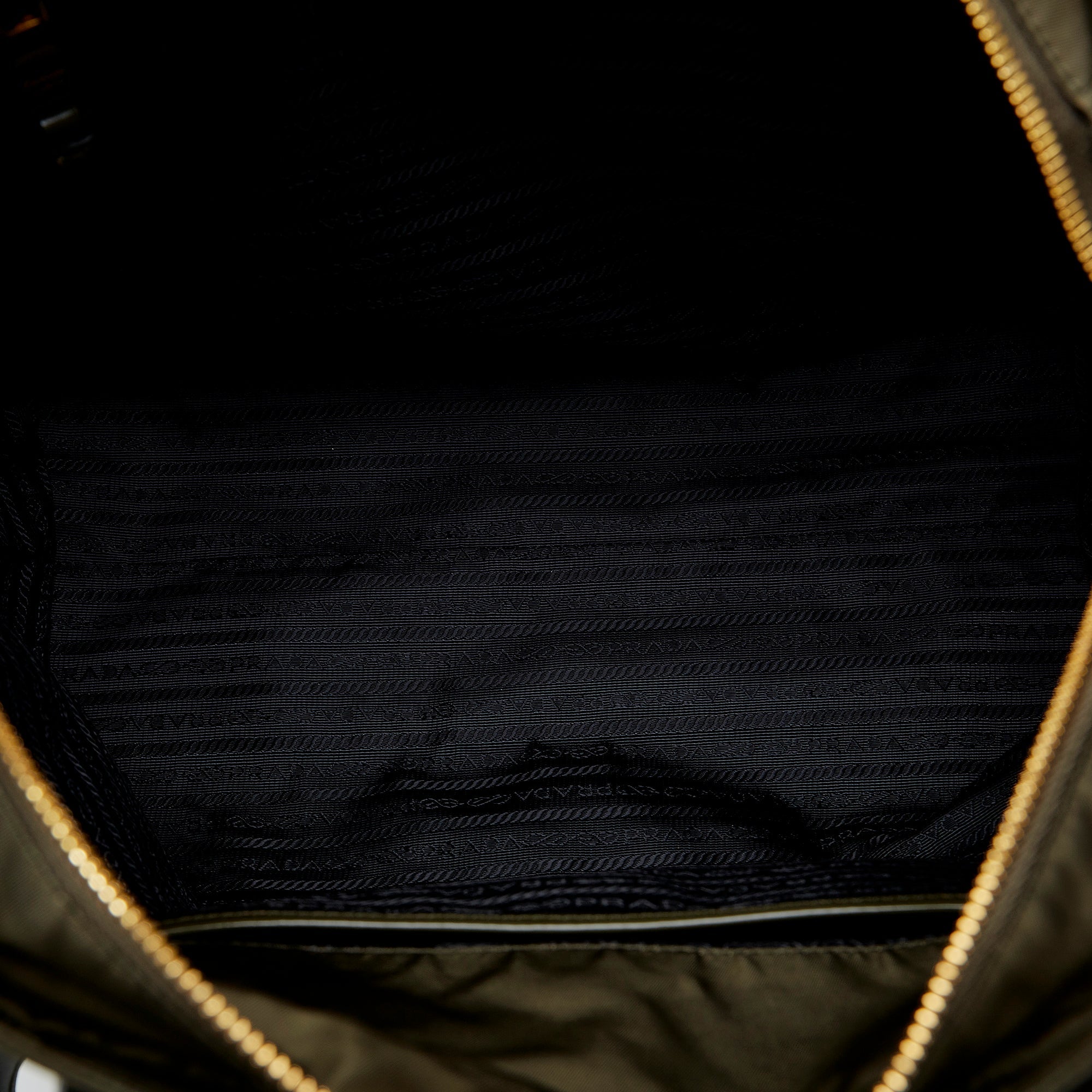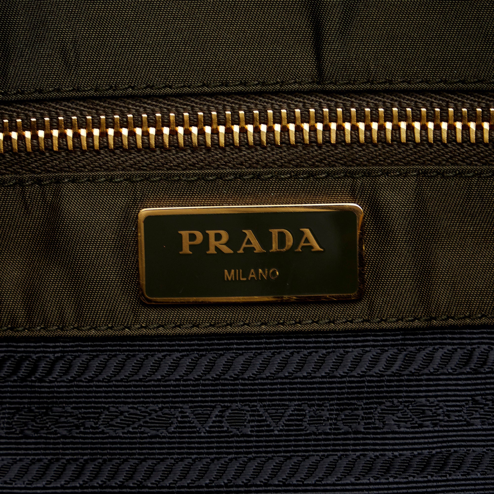 This Prada Tessuto Tote Bag is made of green nylon canvas with dark green leather trim. The well-known brand logo finds its place in the center of the front of the Bag. It has a zipper closure at the top and a zipper pocket inside. With the help of the flat leather straps, the Bag comfortably carried over the shoulder.