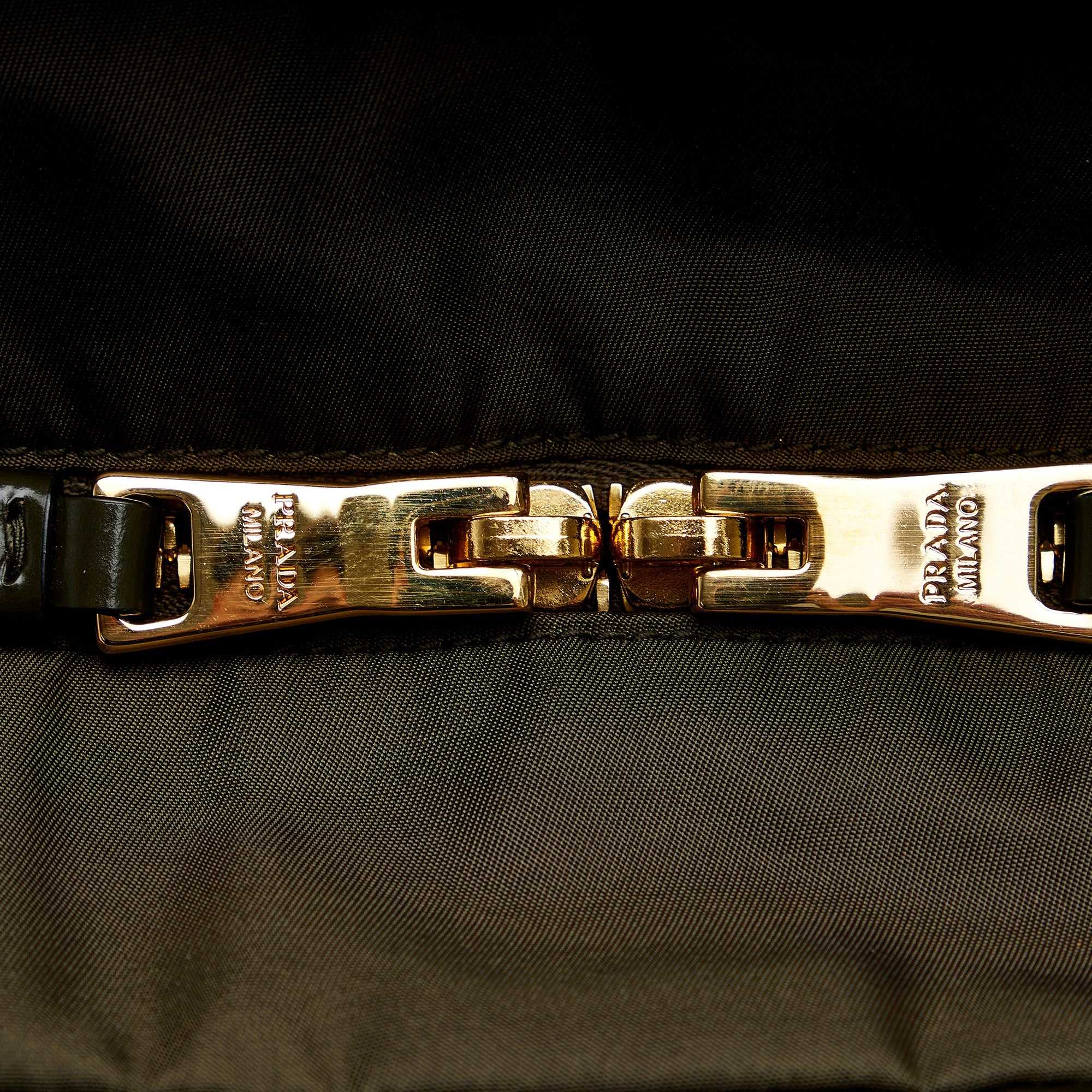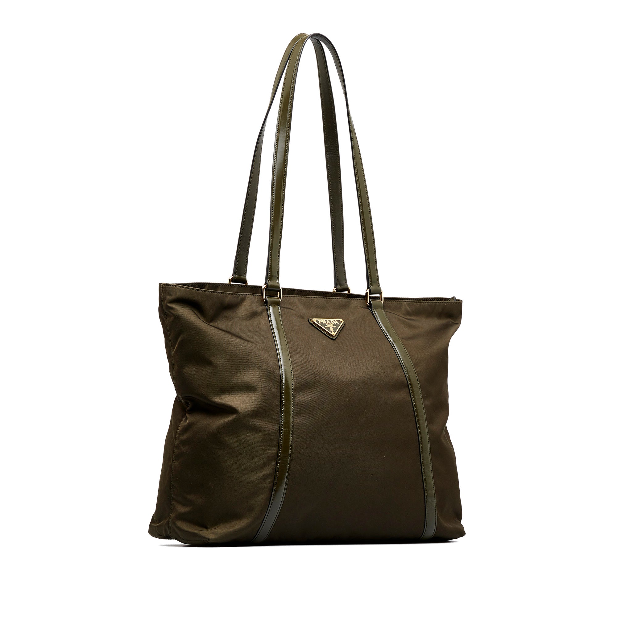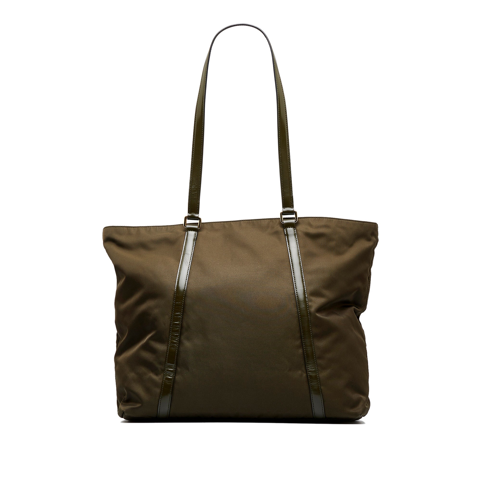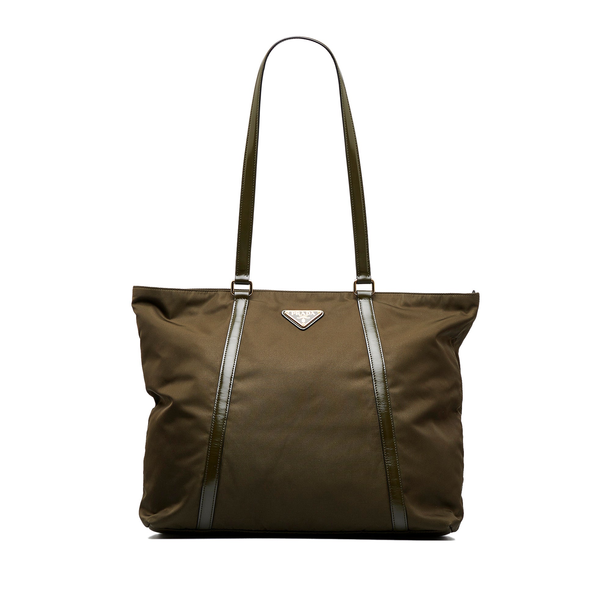 This Prada Tessuto Tote Bag is made of green nylon canvas with dark green leather trim. The well-known brand logo finds its place in the center of the front of the Bag. It has a zipper closure at the top and a zipper pocket inside. With the help of the flat leather straps, the Bag comfortably carried over the shoulder.