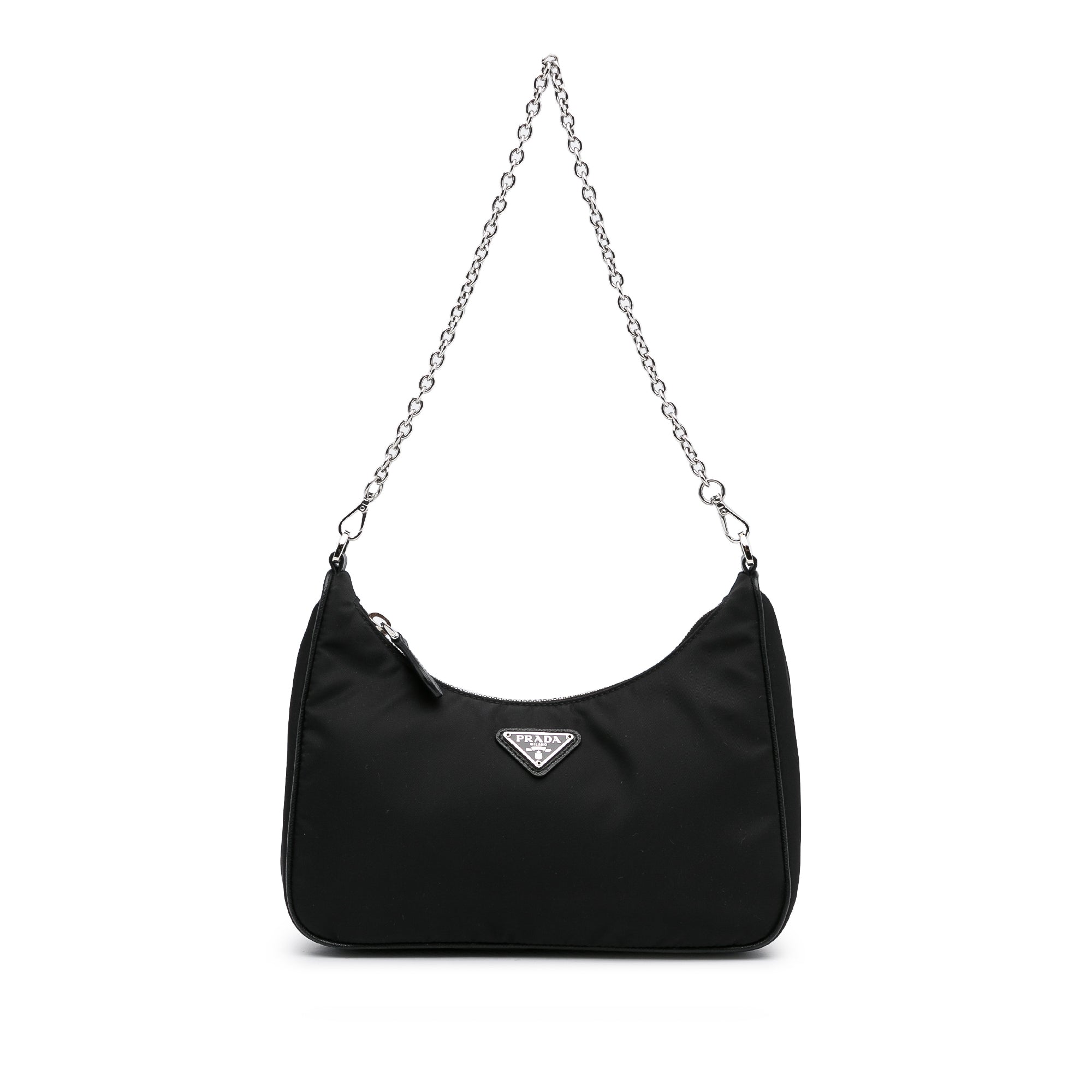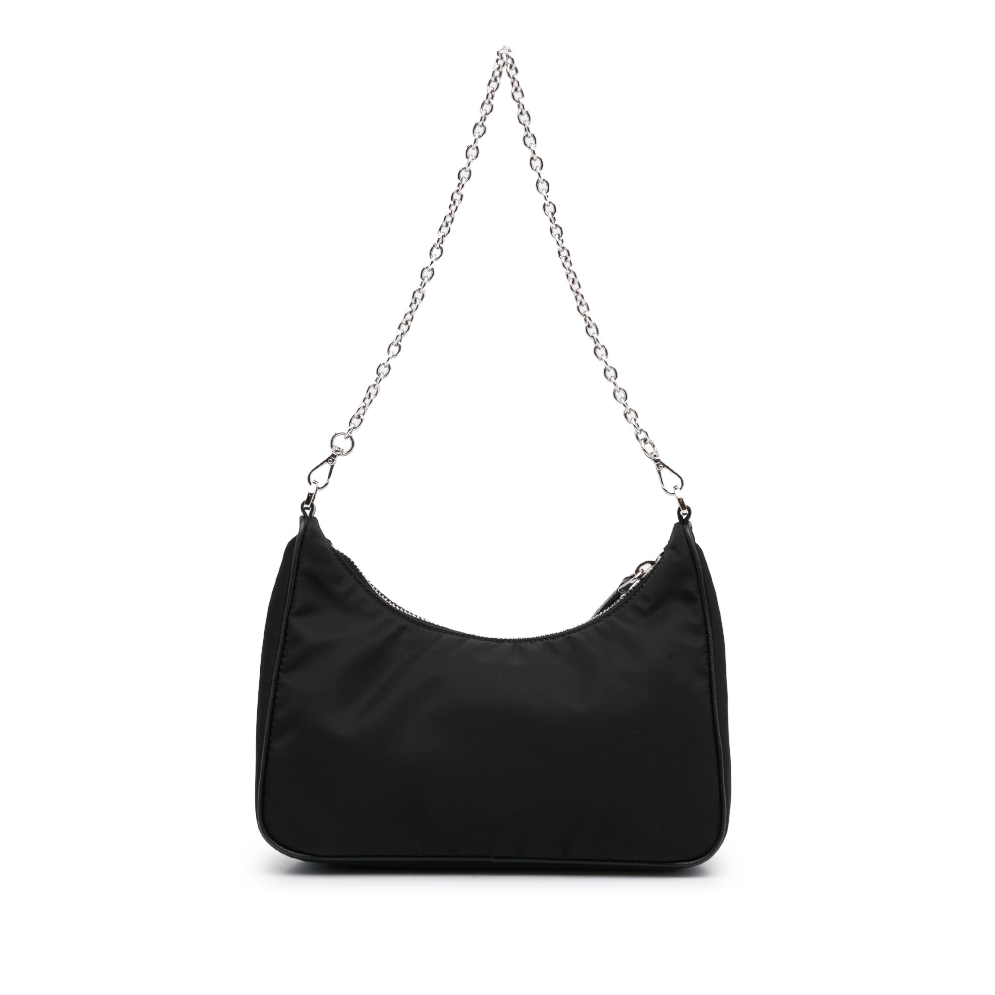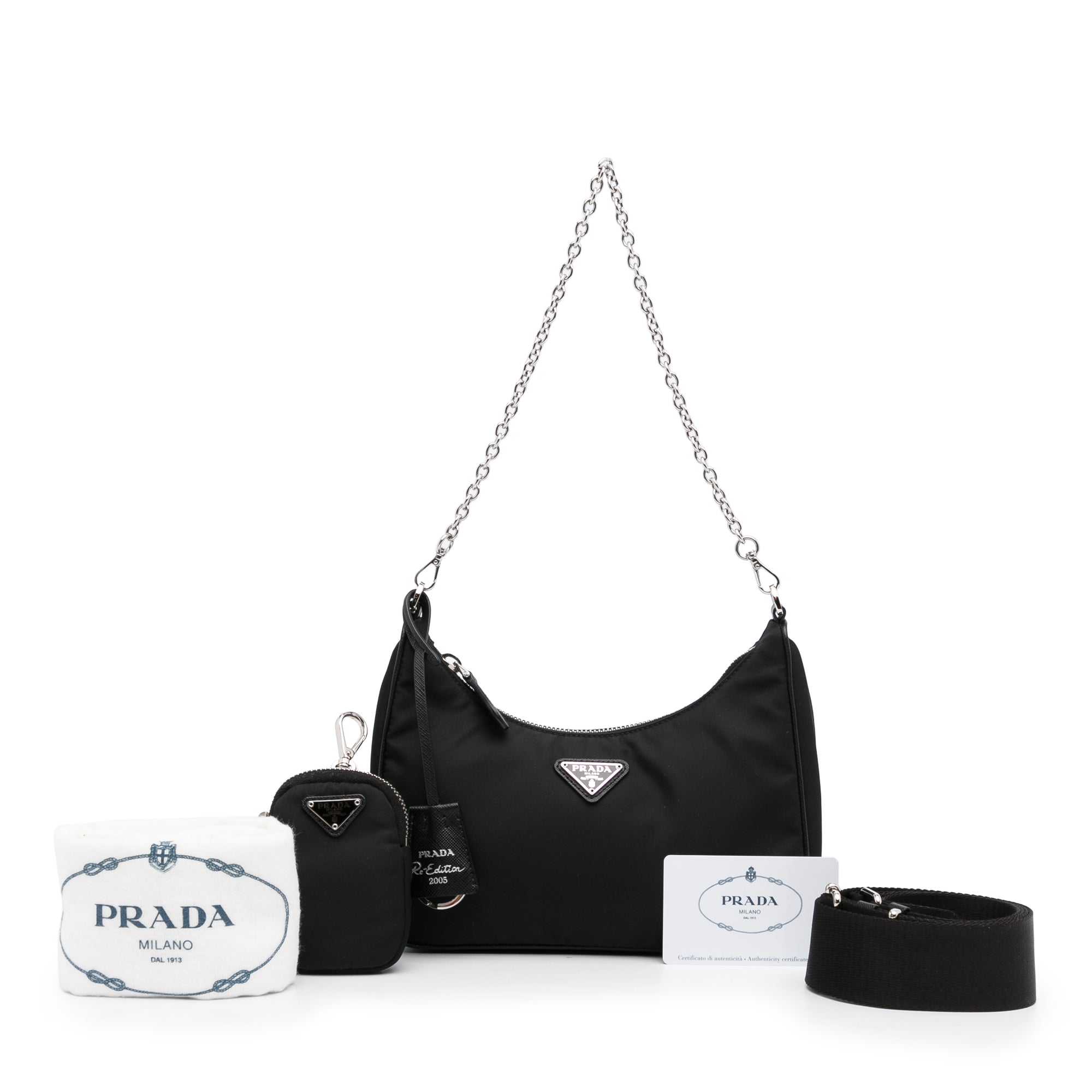 The bags from Prada’s Re-Edition collection revisit the designs of Prada’s Tessuto bags from the 2000s. This Tessuto Re-Edition 2005 Bag features a silver chain strap for close carry on the shoulder or in the hand. Likewise, the Bag comes with a wide canvas shoulder strap. With this the Bag be worn comfortably crossbody. In the interior has the Bag has a zippered compartment. The Bag comes with a small pouch that can be attached to the strap. Very cool.