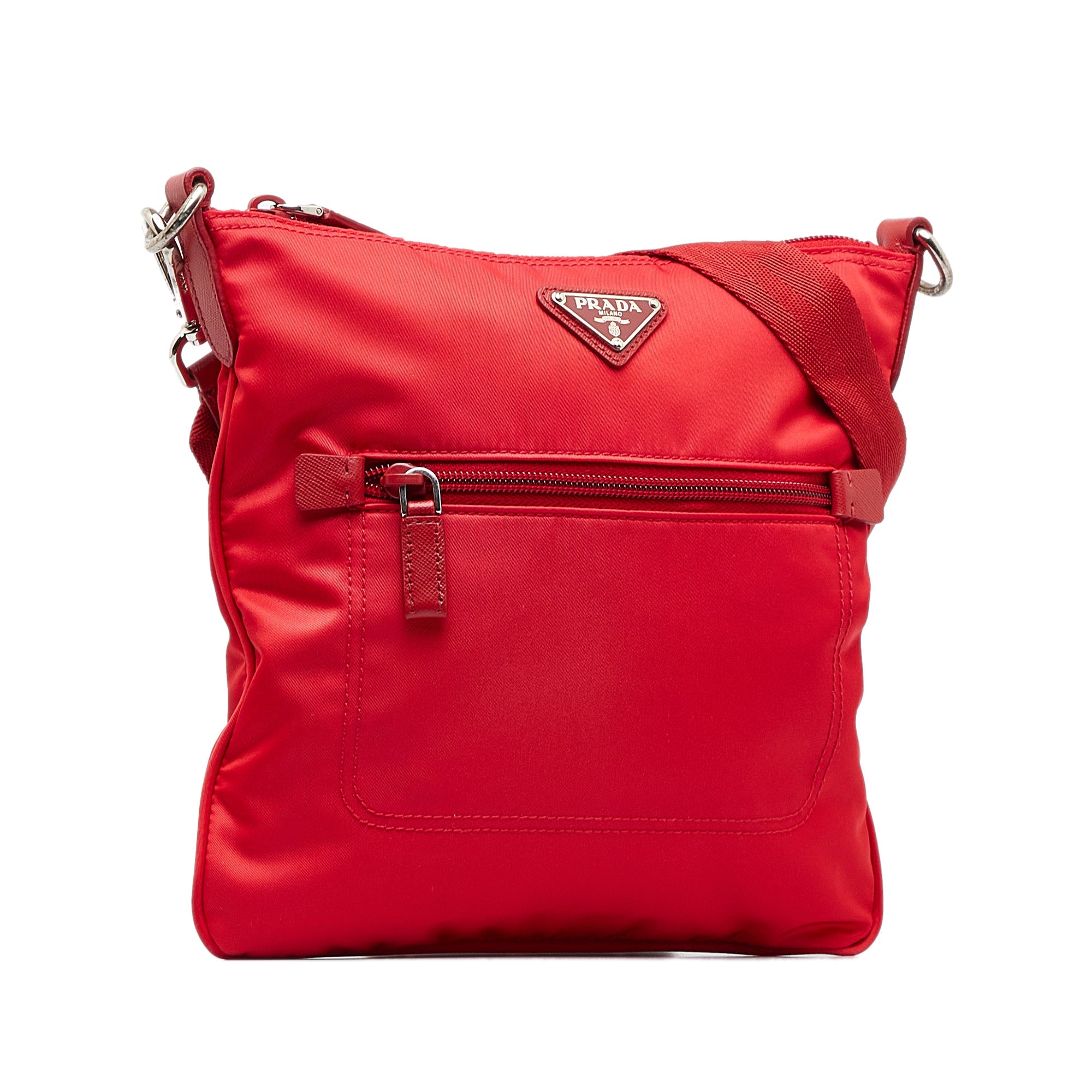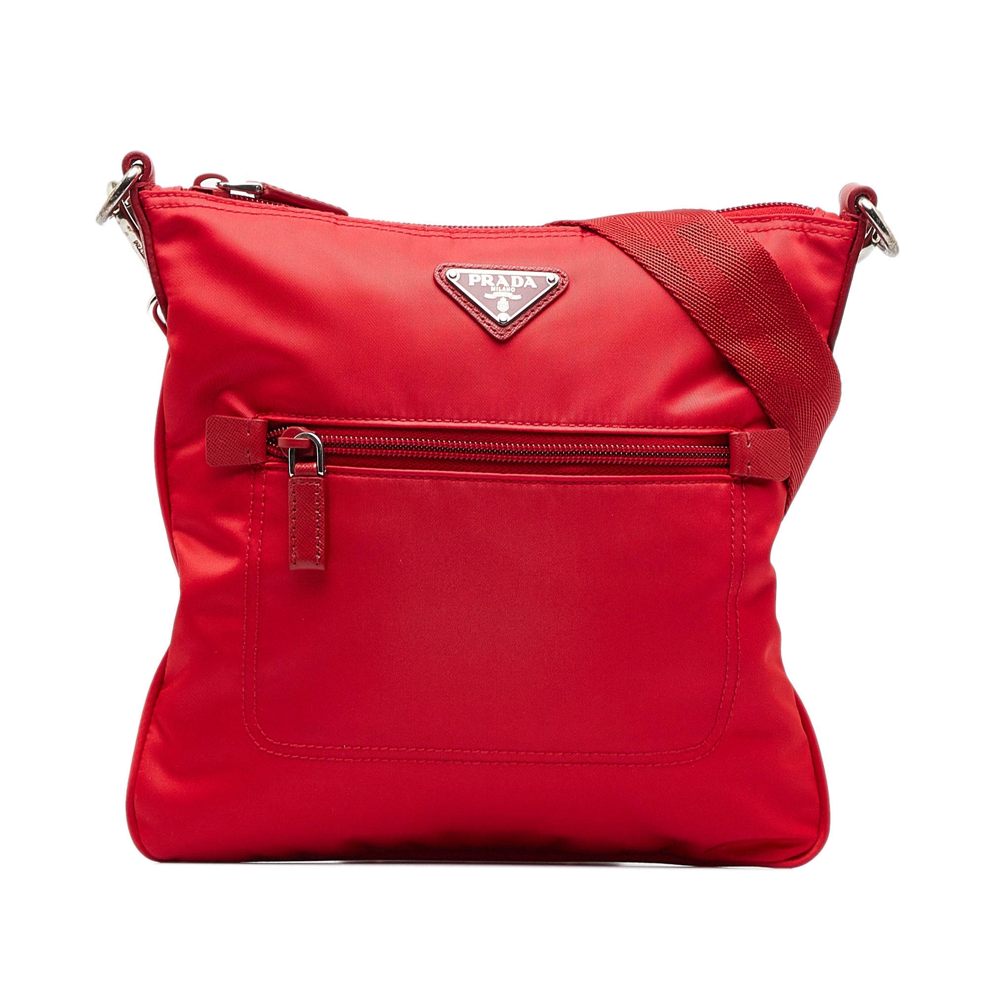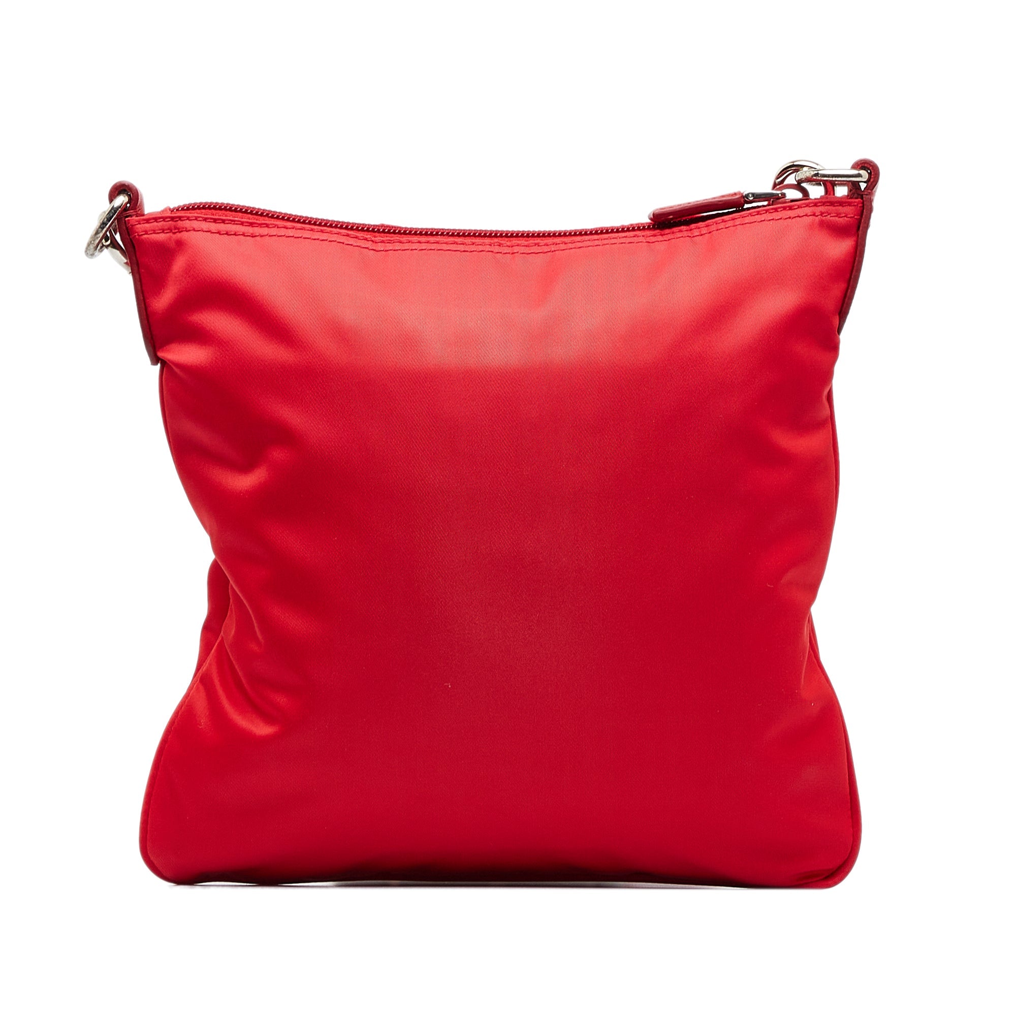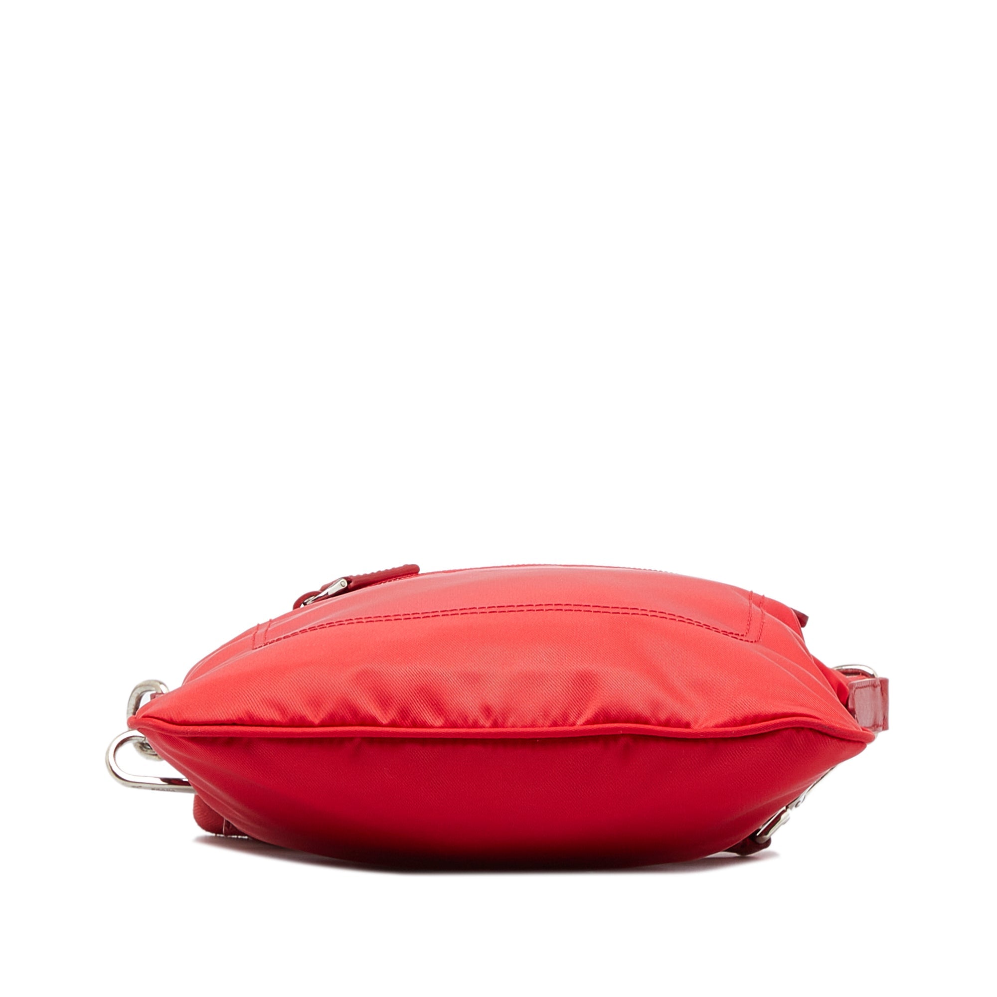This cool Prada Tessuto was made of trendy red nylon. The Bag is comfortably worn crossbody thanks to the shoulder strap. The silver details give the Bag that certain something. On the front is an additional compartment with zipper.