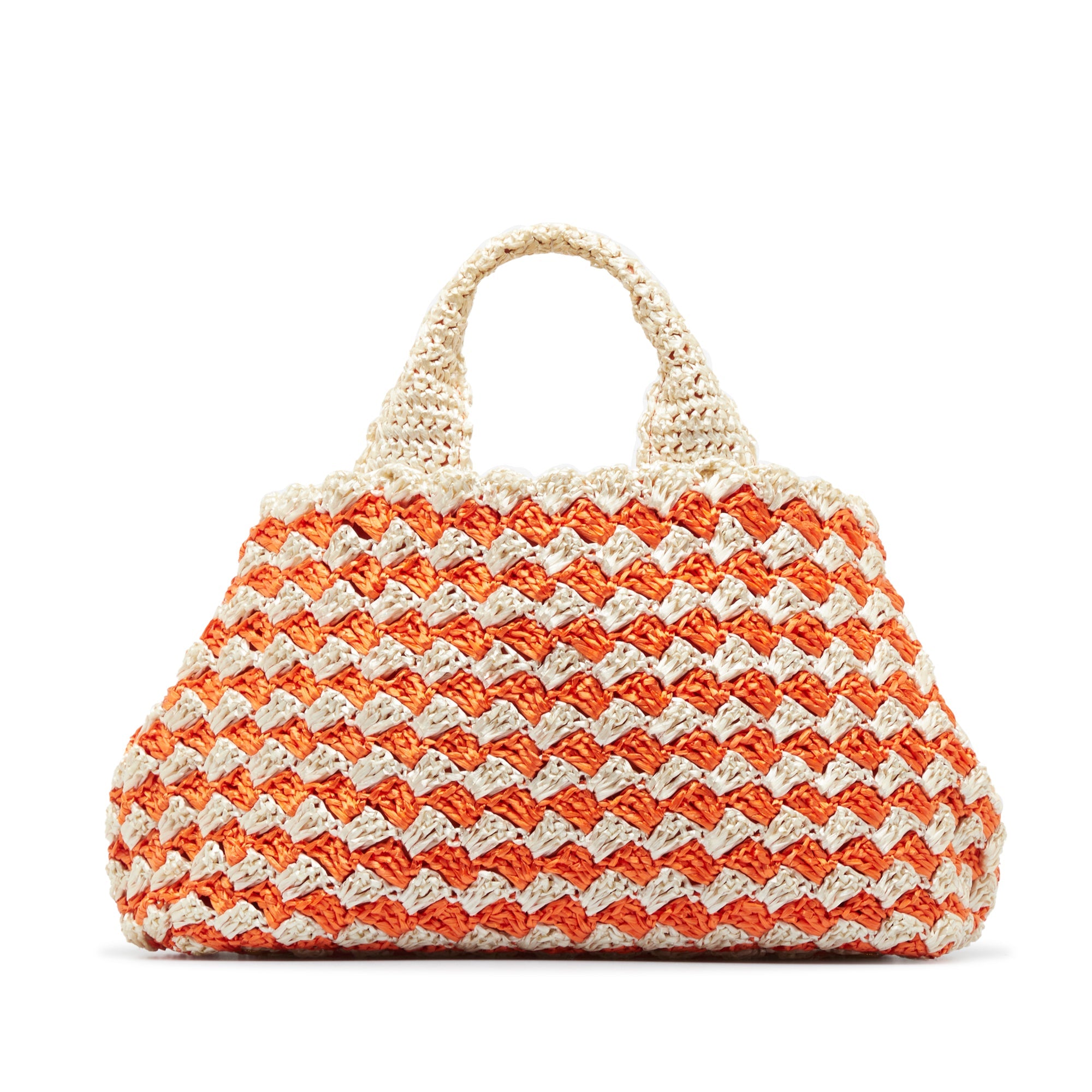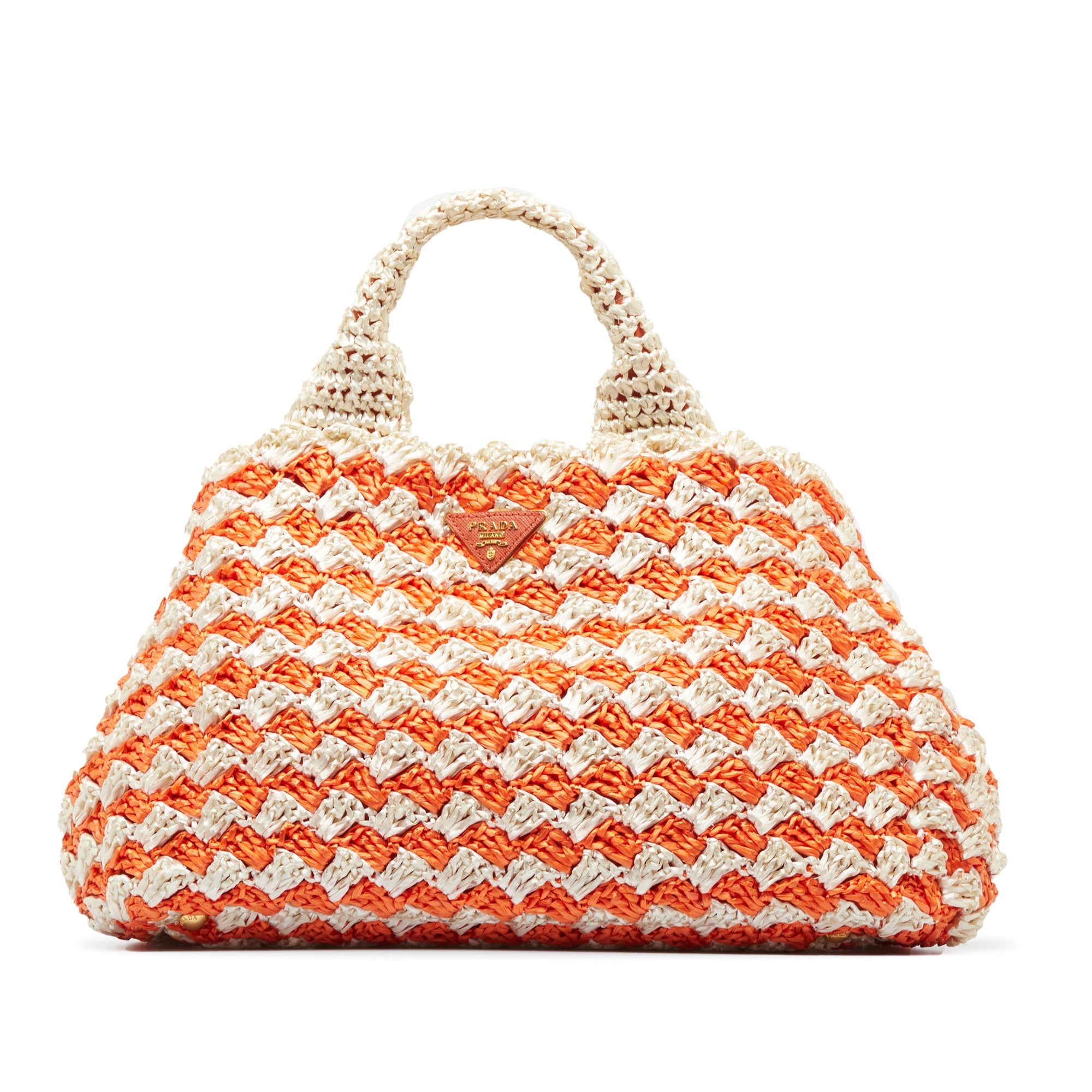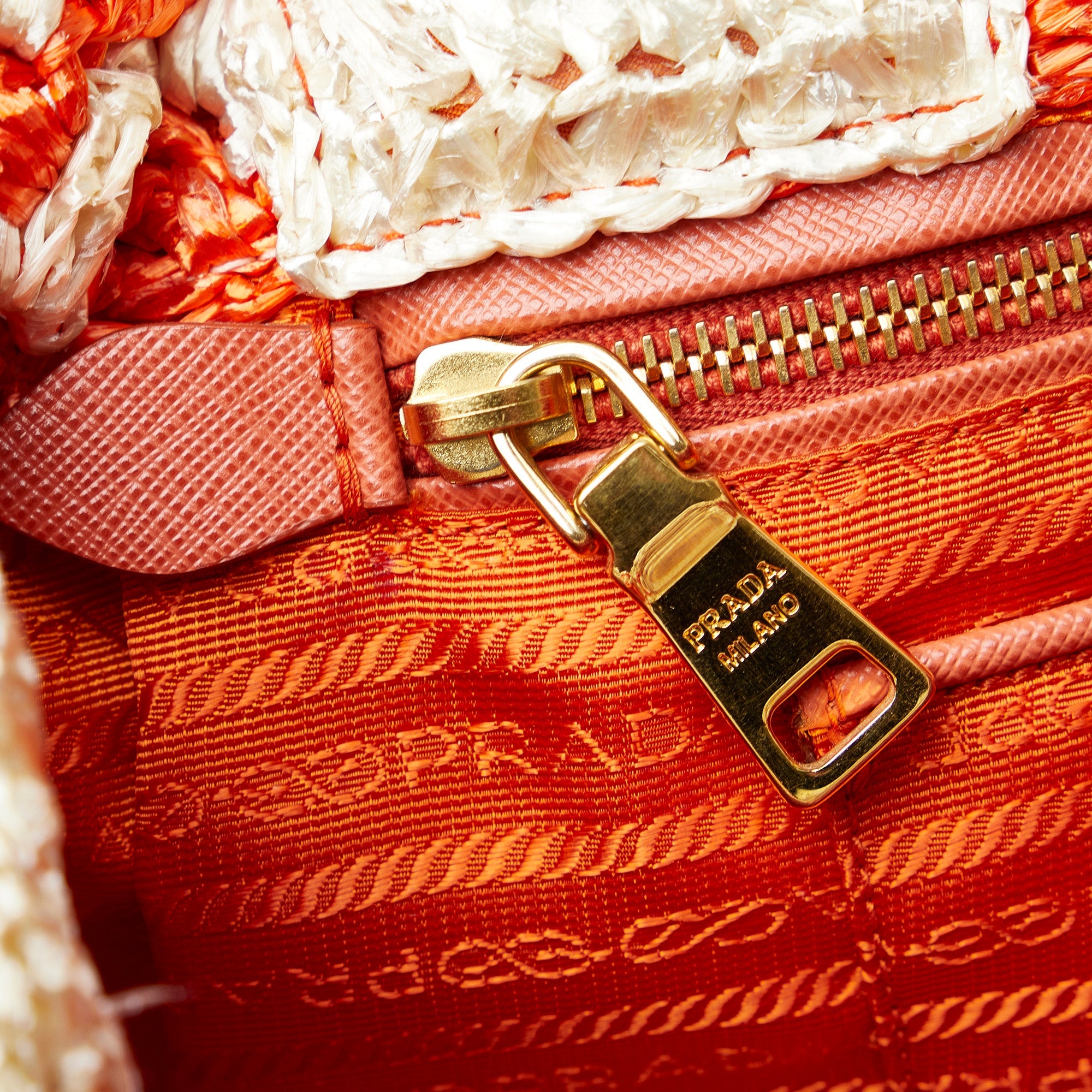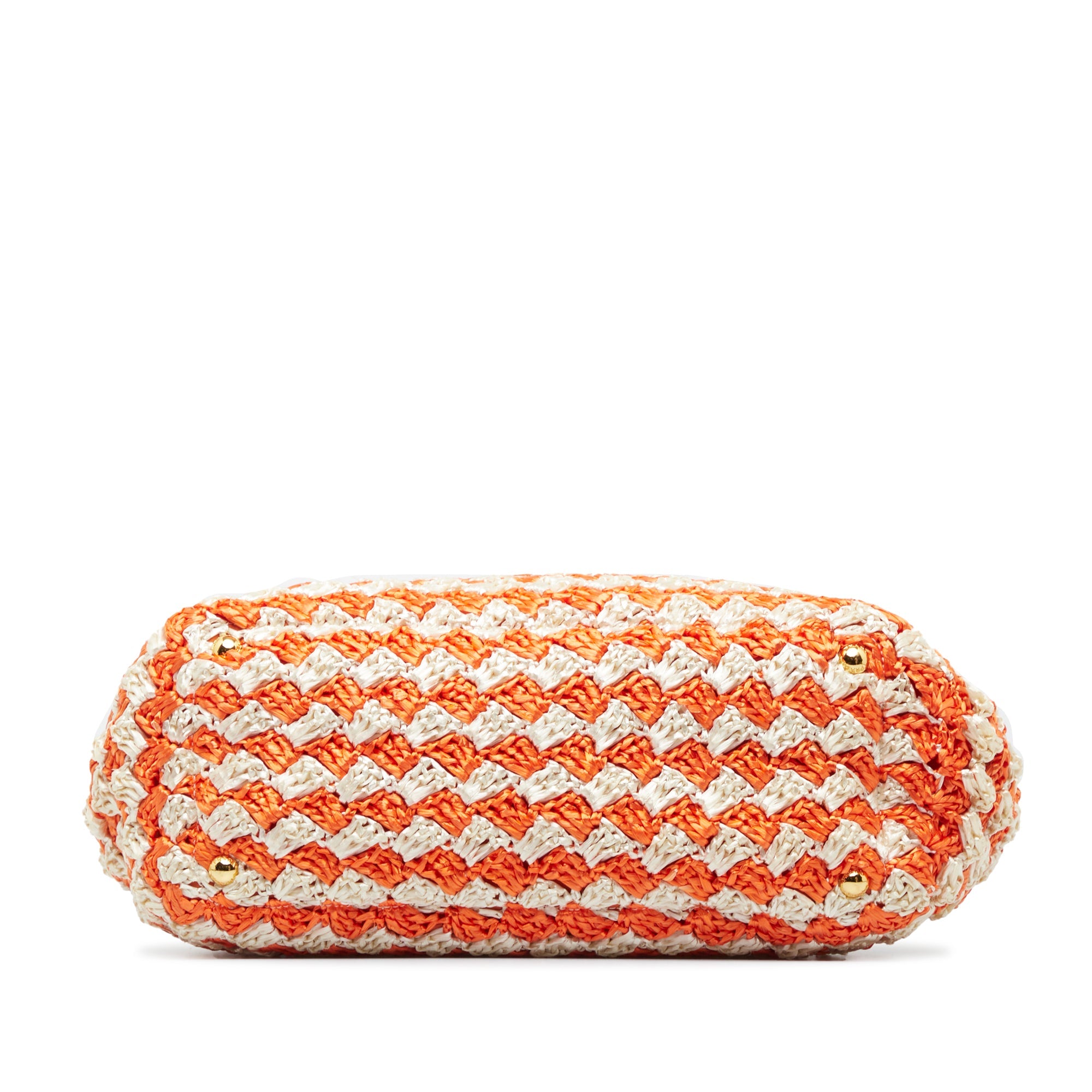This Tote Bag is made of orange and white woven raffia. It has rolled handles, an open top, and zippered and slip pockets inside.
