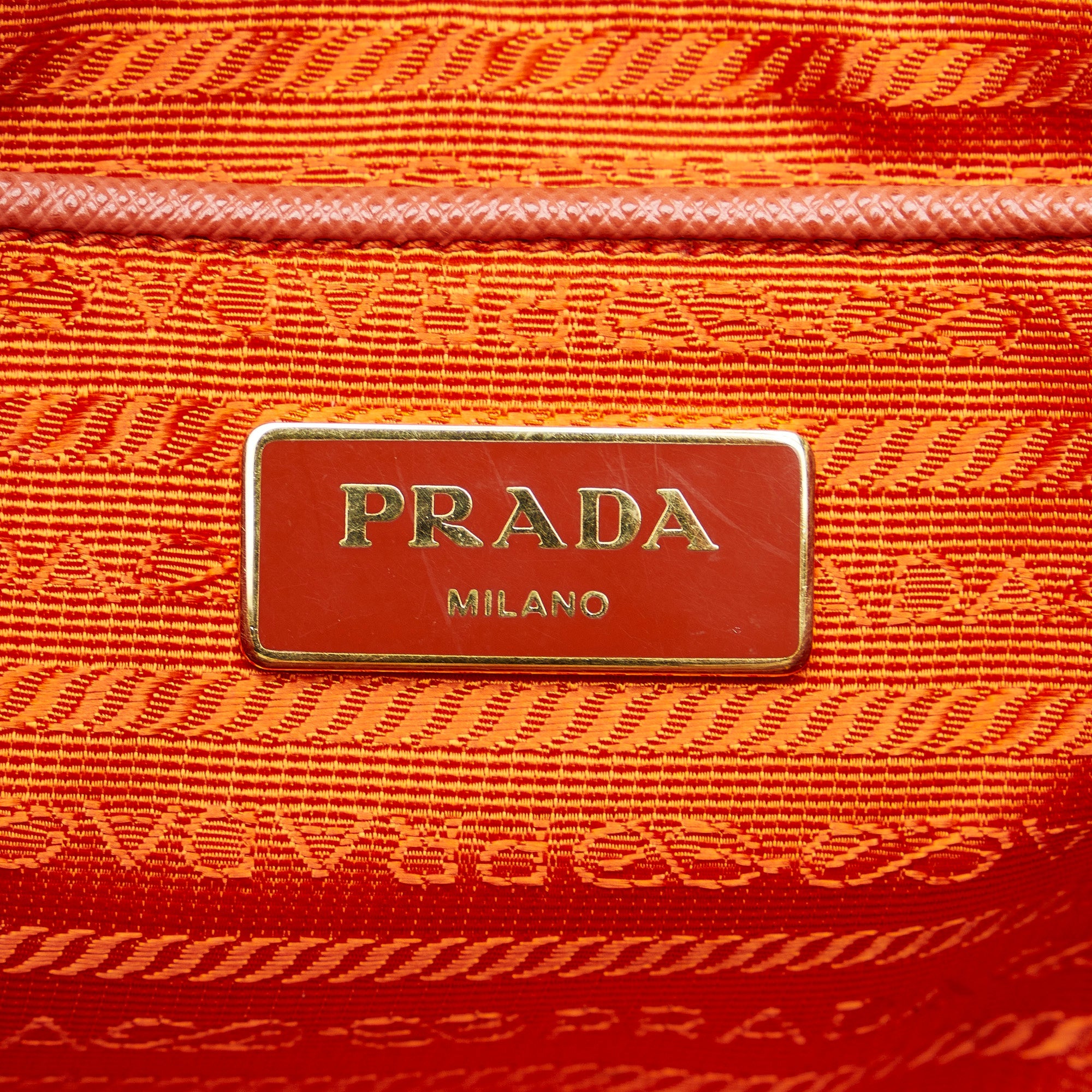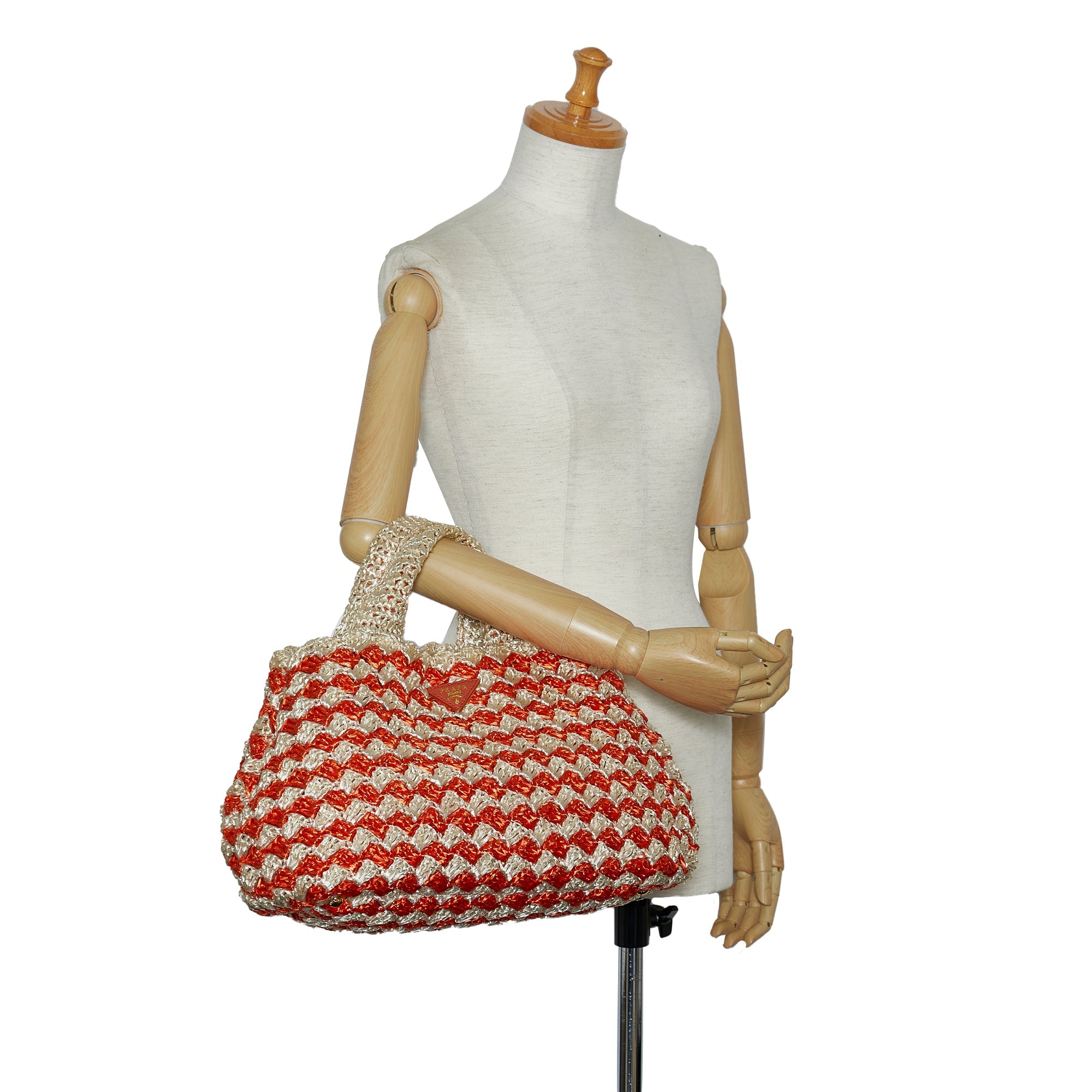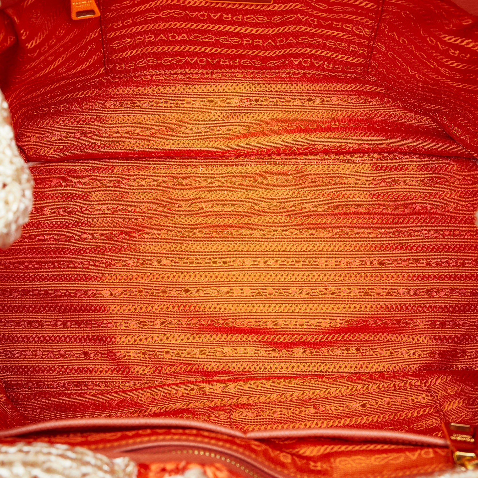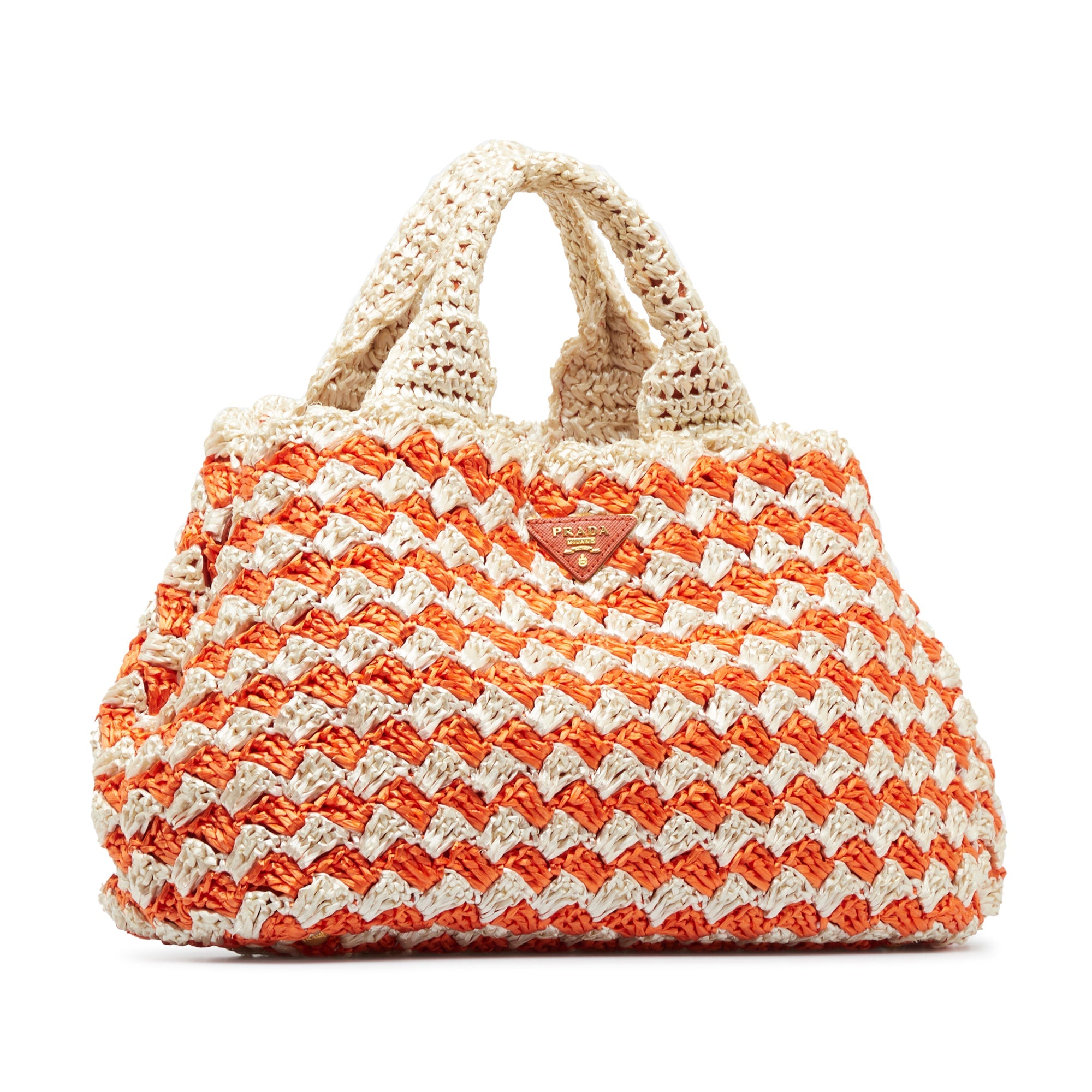 This Tote Bag is made of orange and white woven raffia. It has rolled handles, an open top, and zippered and slip pockets inside.