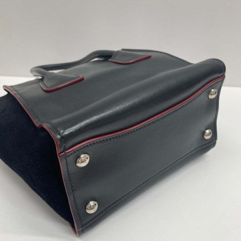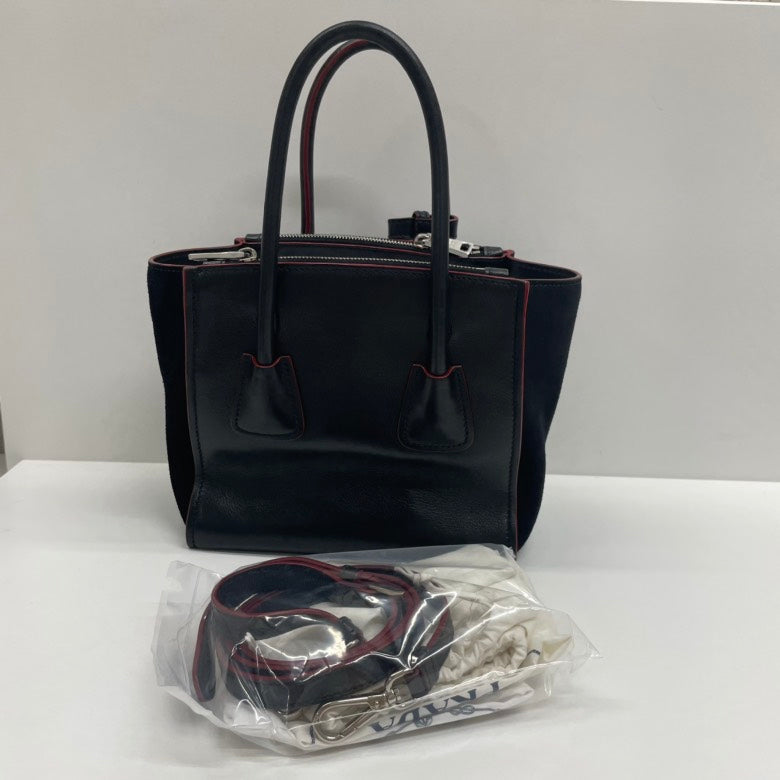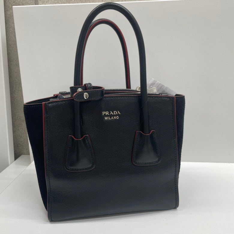 This product is in Excellent condition.This is an PRADA Saffiano Bicolor Tote . Beautifully crafted from black luxury leather with red piping, this stylish tote bag is beautifully crafted. The bag features rolled leather top handles, an optional adjustable shoulder strap, silver-tone hardware and zip pockets along the top edge on both sides. Opening the bag reveals a black monogram jacquard interior with a zip and patch pockets.