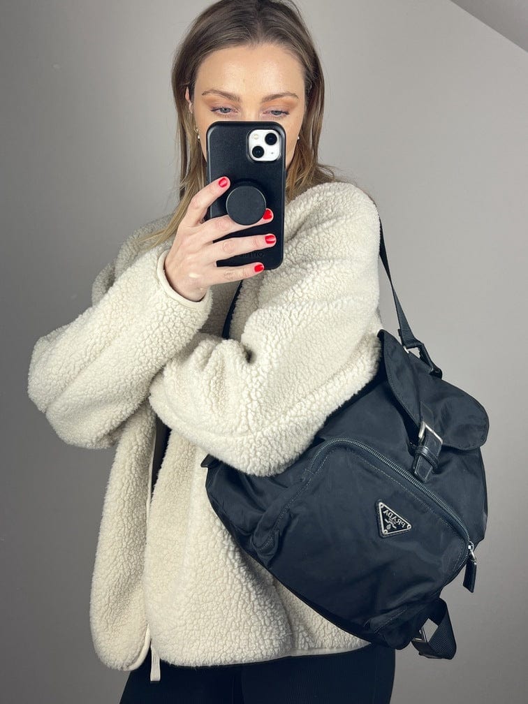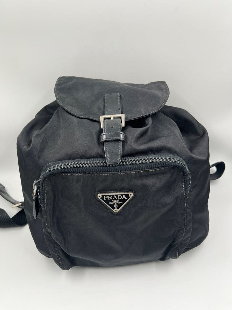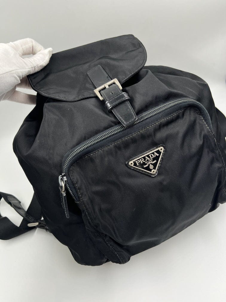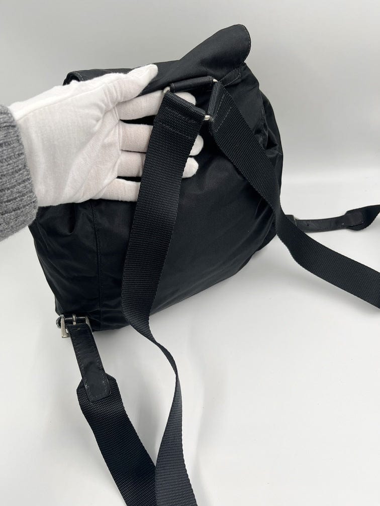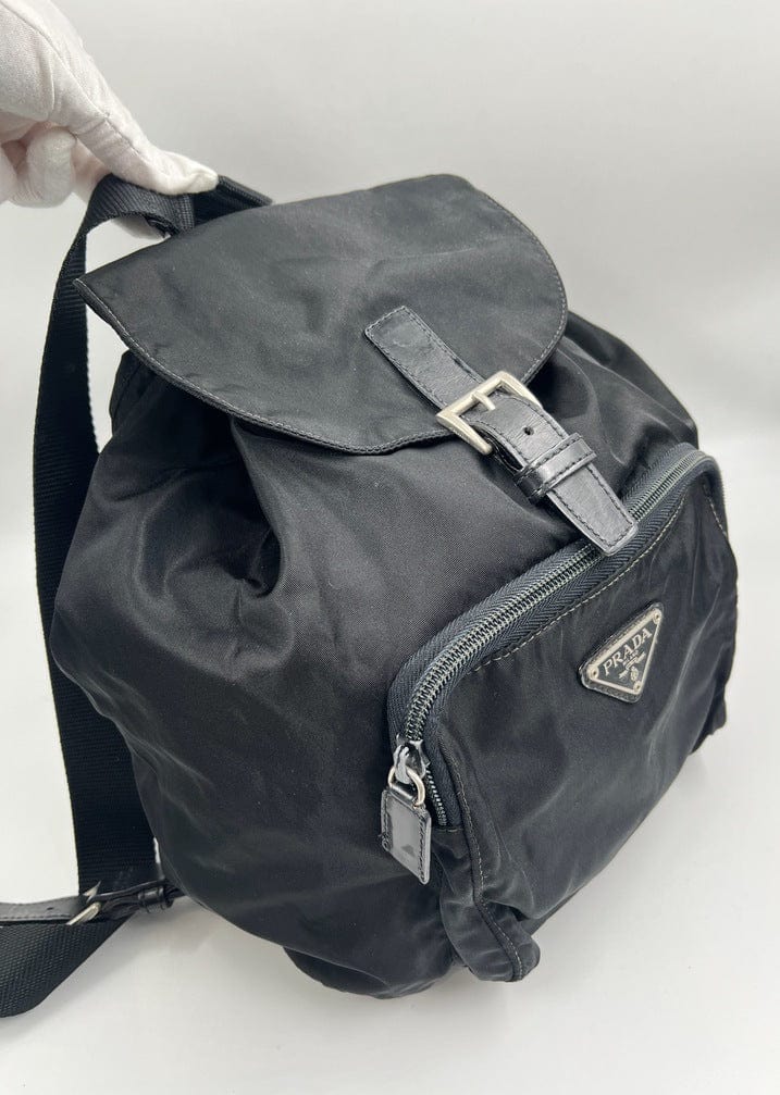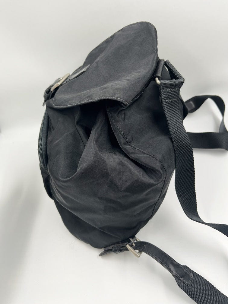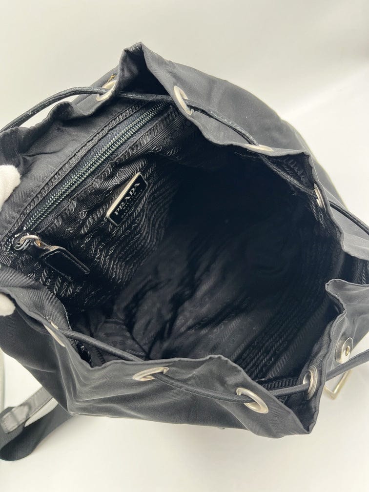 With drawstring closure and buckle closure to flap. Inside there is a zipped pocket for valuables and an external pocket also on the front main body.