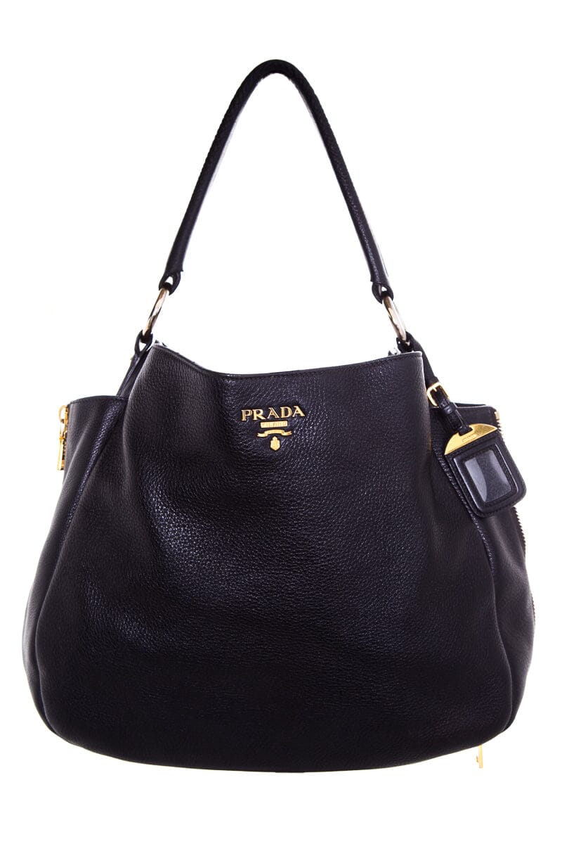 Prada Vitello Donna LargeĀ Black Grained LeatherĀ Tote With Gold tone Hardware. This item is in good; some slight wear to leather on corners.