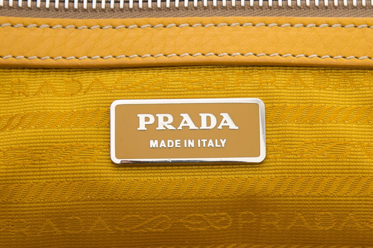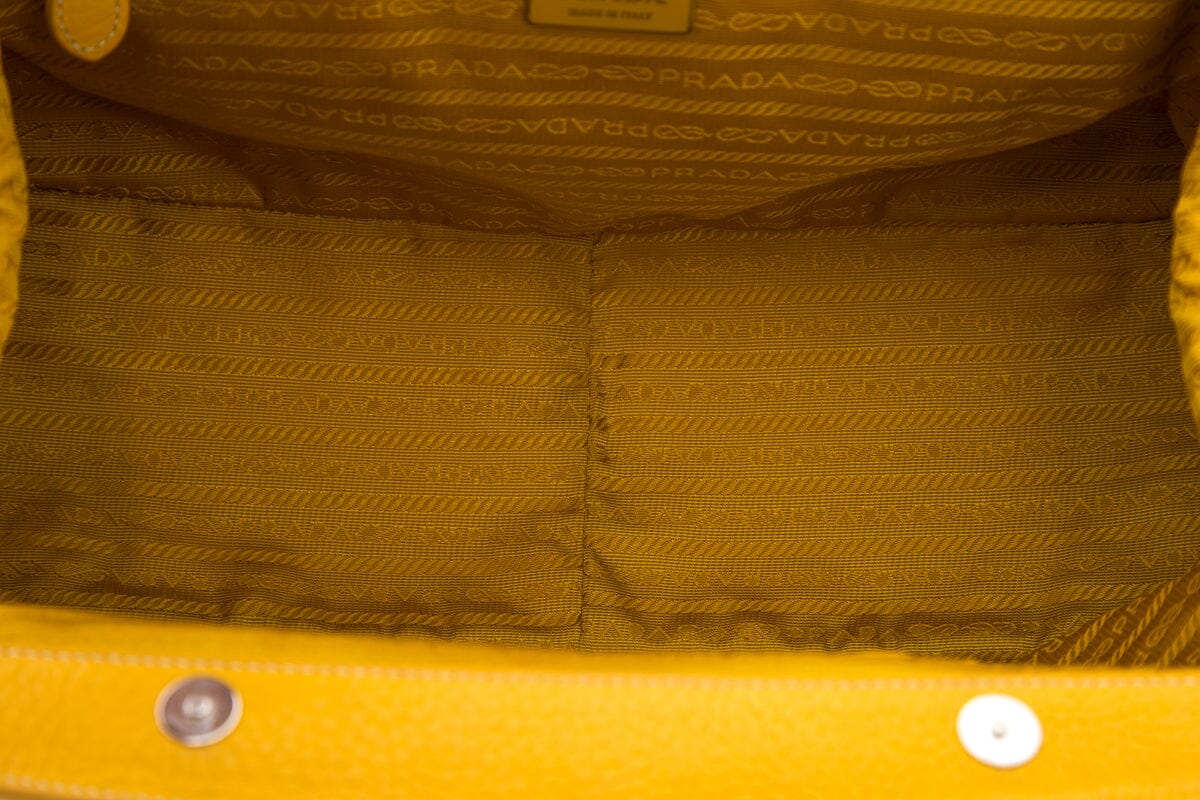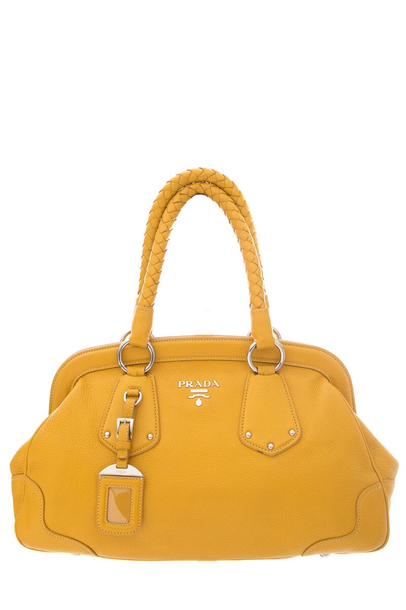 Prada Yellow Vitello Daino Leather Handbag with Braided Handle Detail. This item is in good condition; some slight wear to leather on piping and corners on bottom exterior.