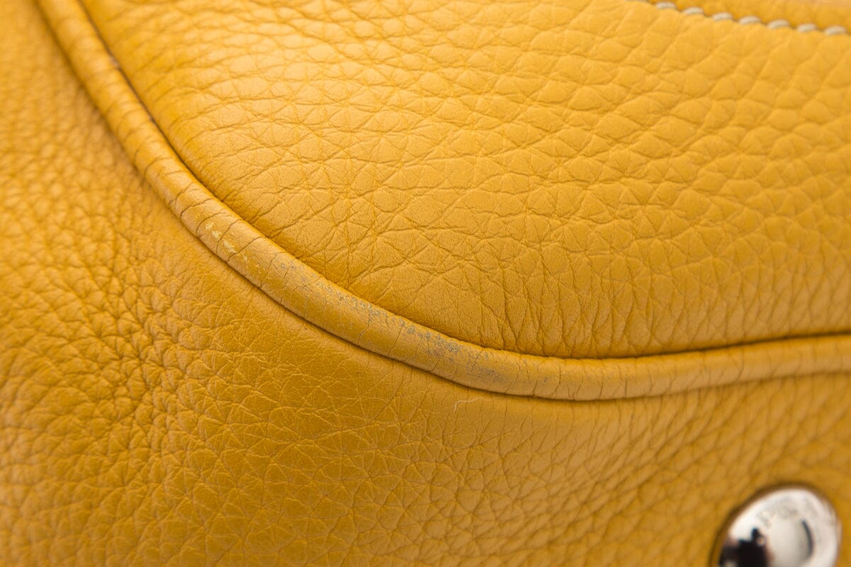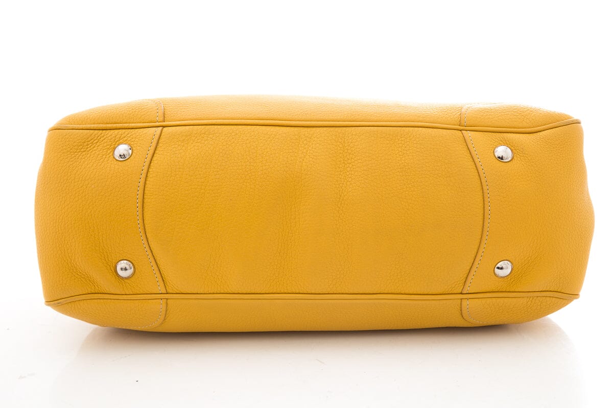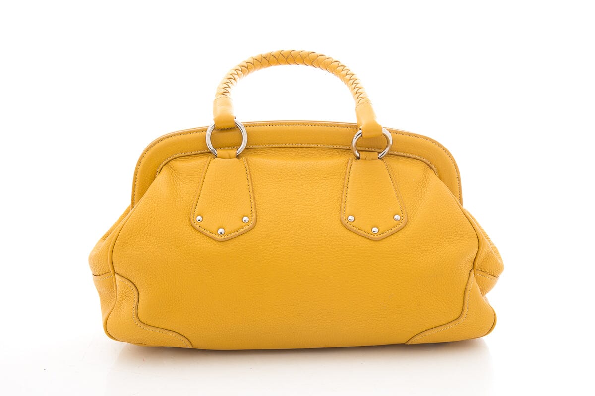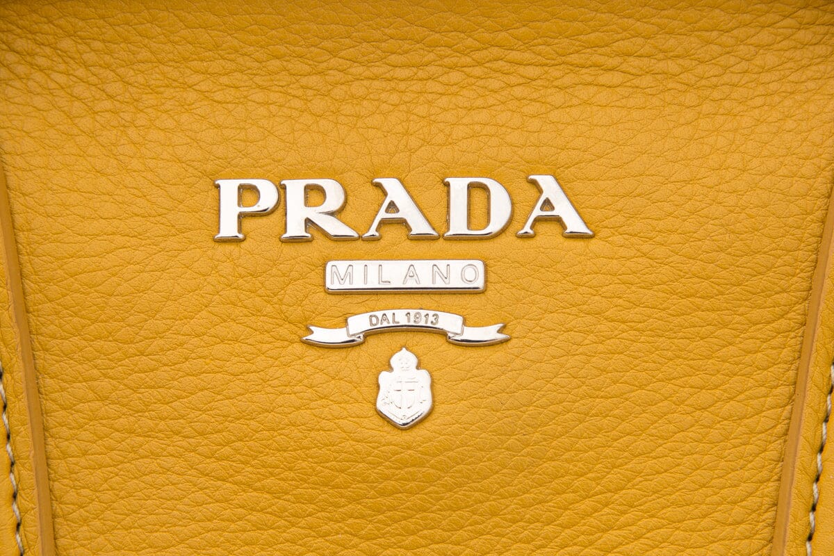 Prada Yellow Vitello Daino Leather Handbag with Braided Handle Detail. This item is in good condition; some slight wear to leather on piping and corners on bottom exterior.