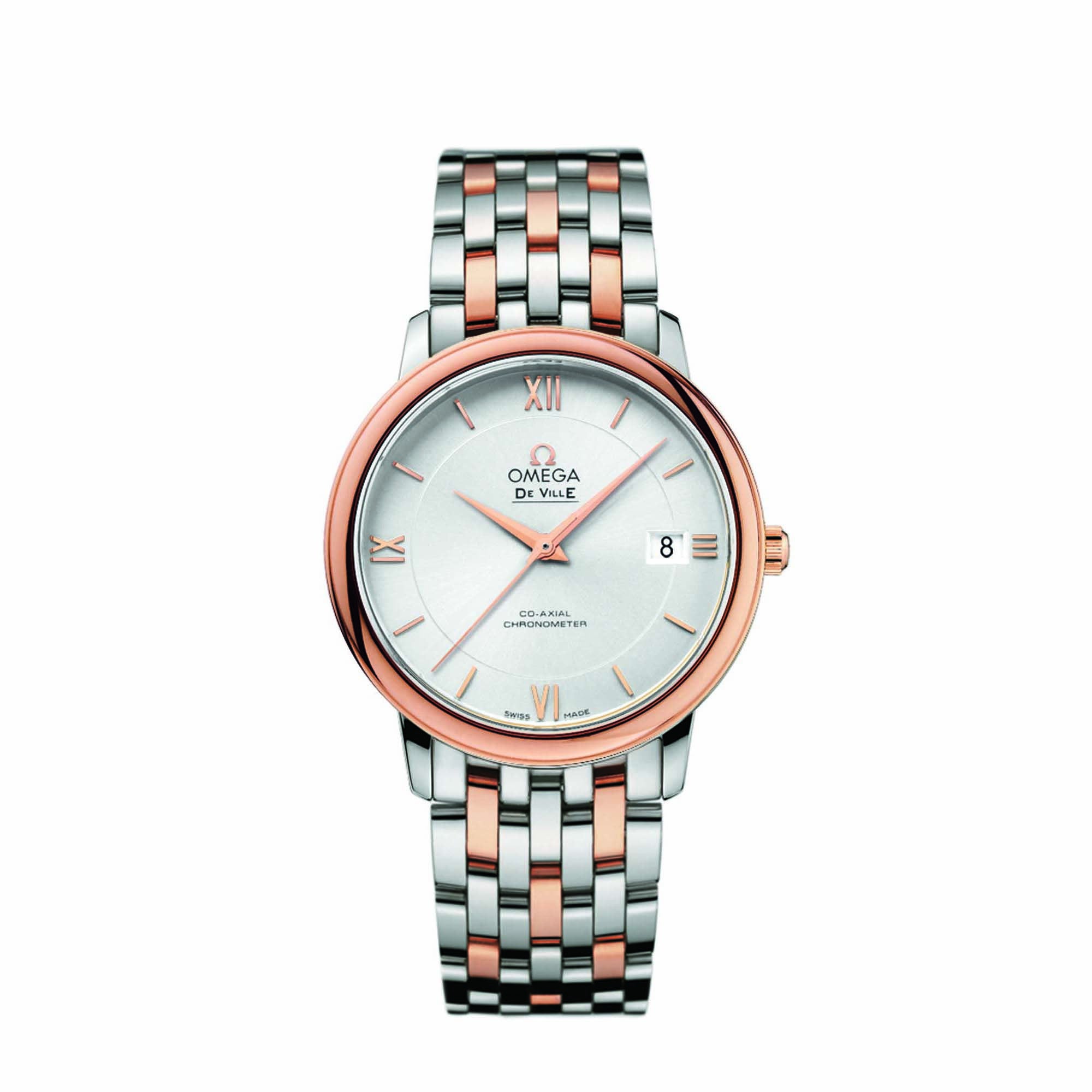 The OMG De Ville Prestige collection has attracted a large and loyal following with its classic, elegant design. These timepieces are characterised by pure styling with luxury finishes, and exude a timeless design. This model features an impressive two-zone silvery dial with 18K red gold-plated indexes and Roman numerals at the 3, 6, 9 and 12 o’clock positions. The striking dial, with its date window at the 3 o’clock position, is protected by a scratch-resistant sapphire crystal. The 18K red gold bezel is mounted on a 36.8 mm stainless steel casebody and is presented on a two-tone red gold-steel bracelet. At the heart of this timepiece is the Co-Axial calibre 2500.