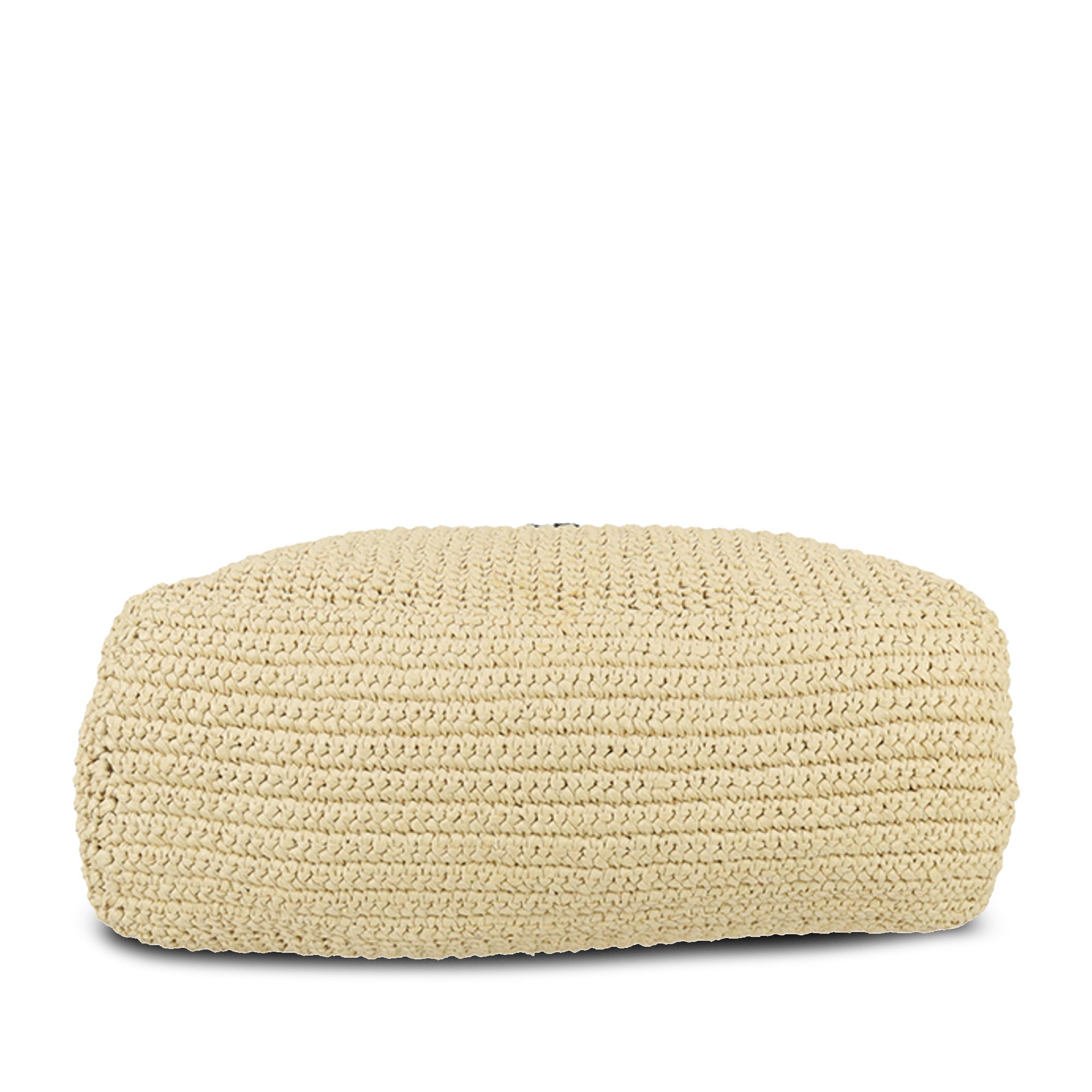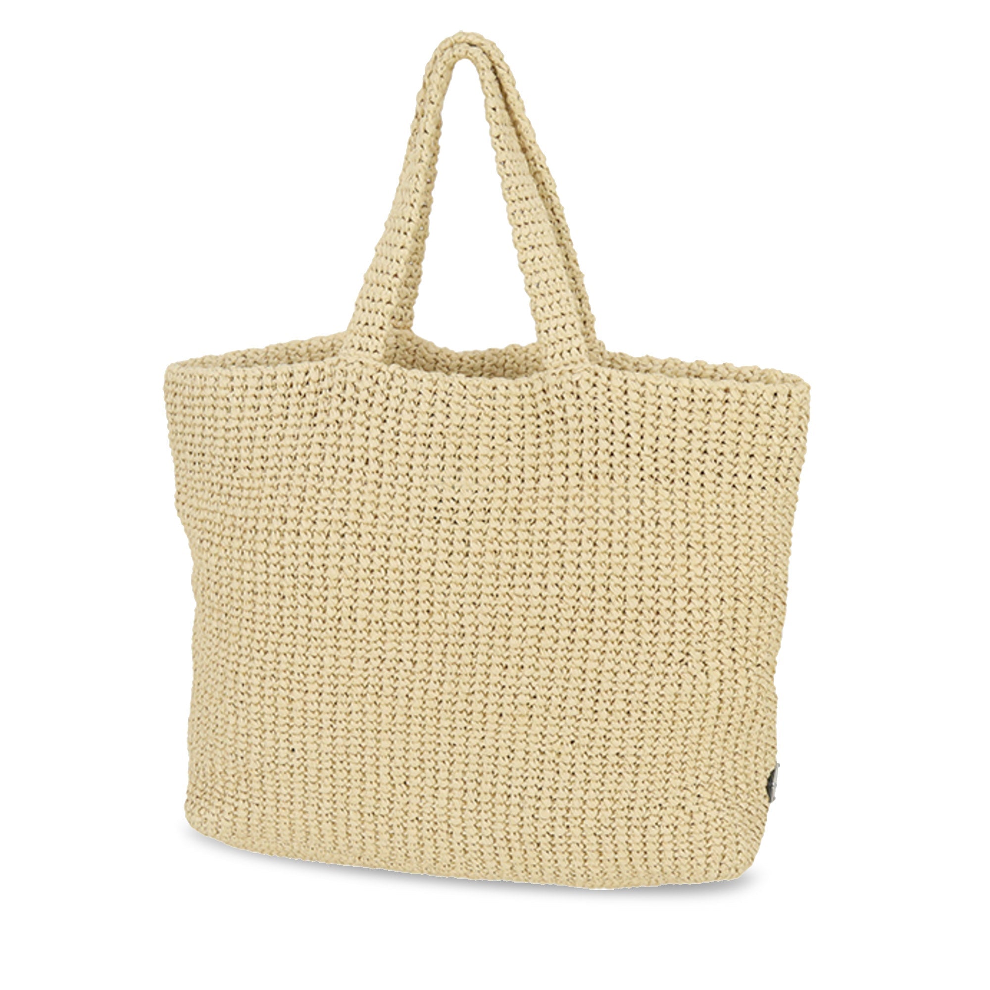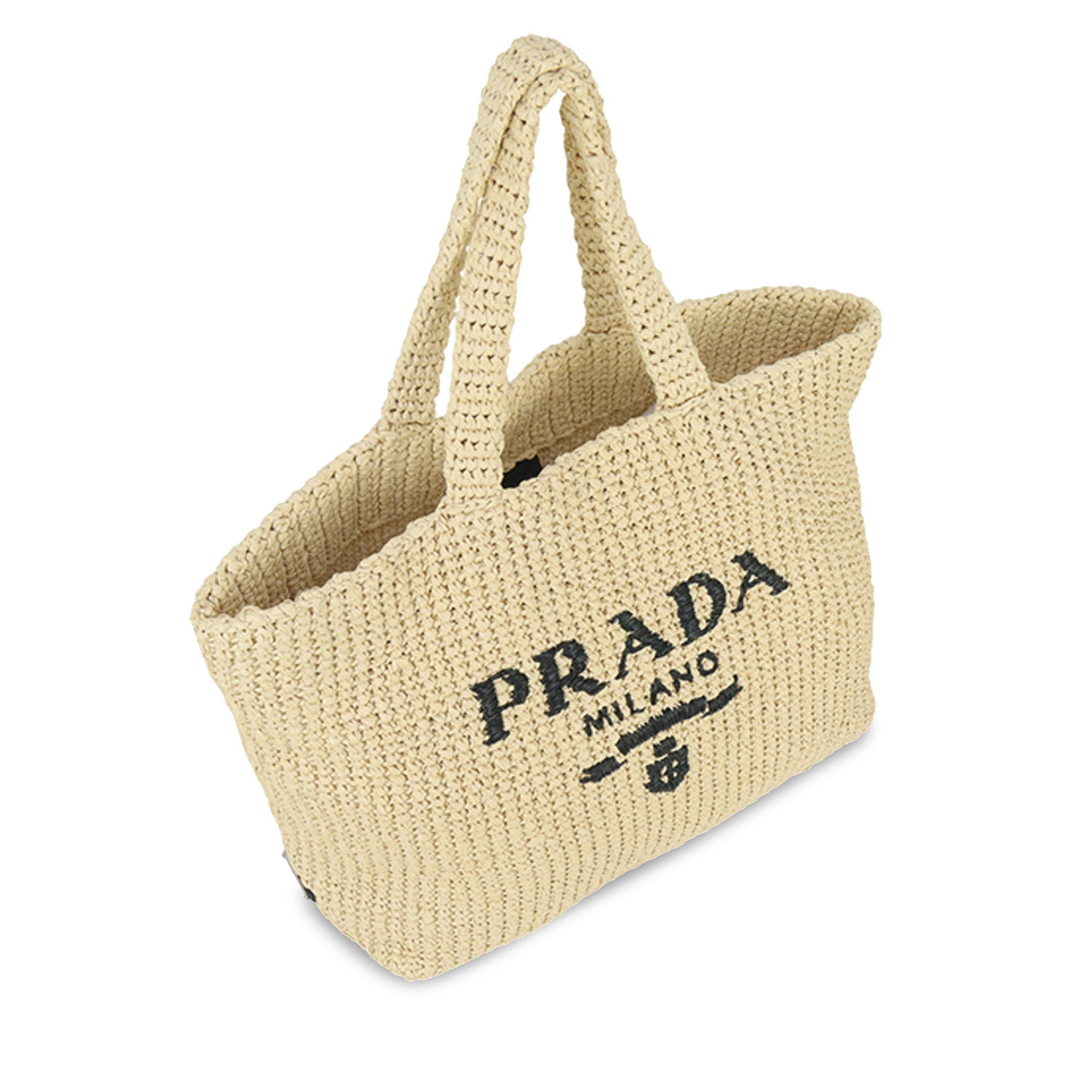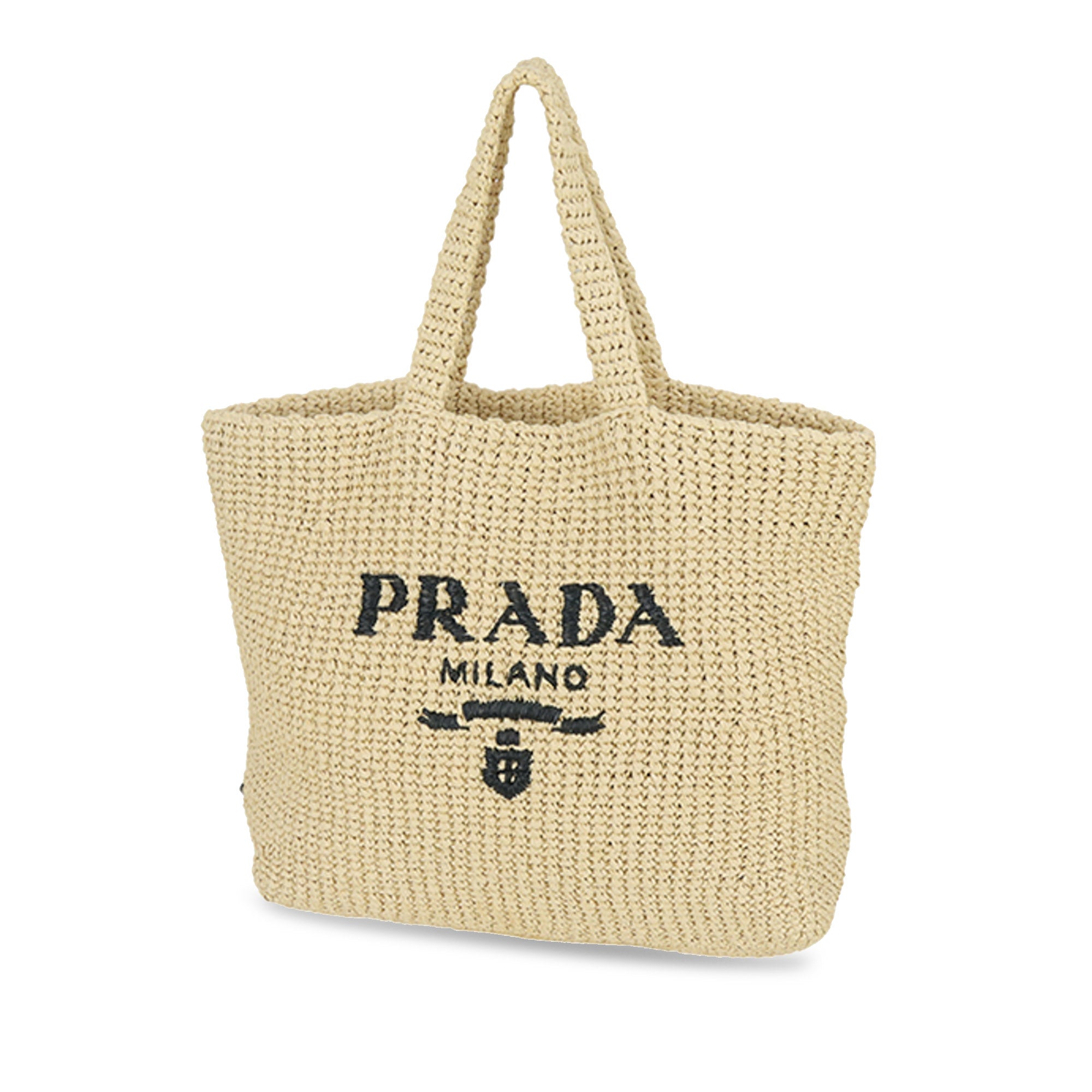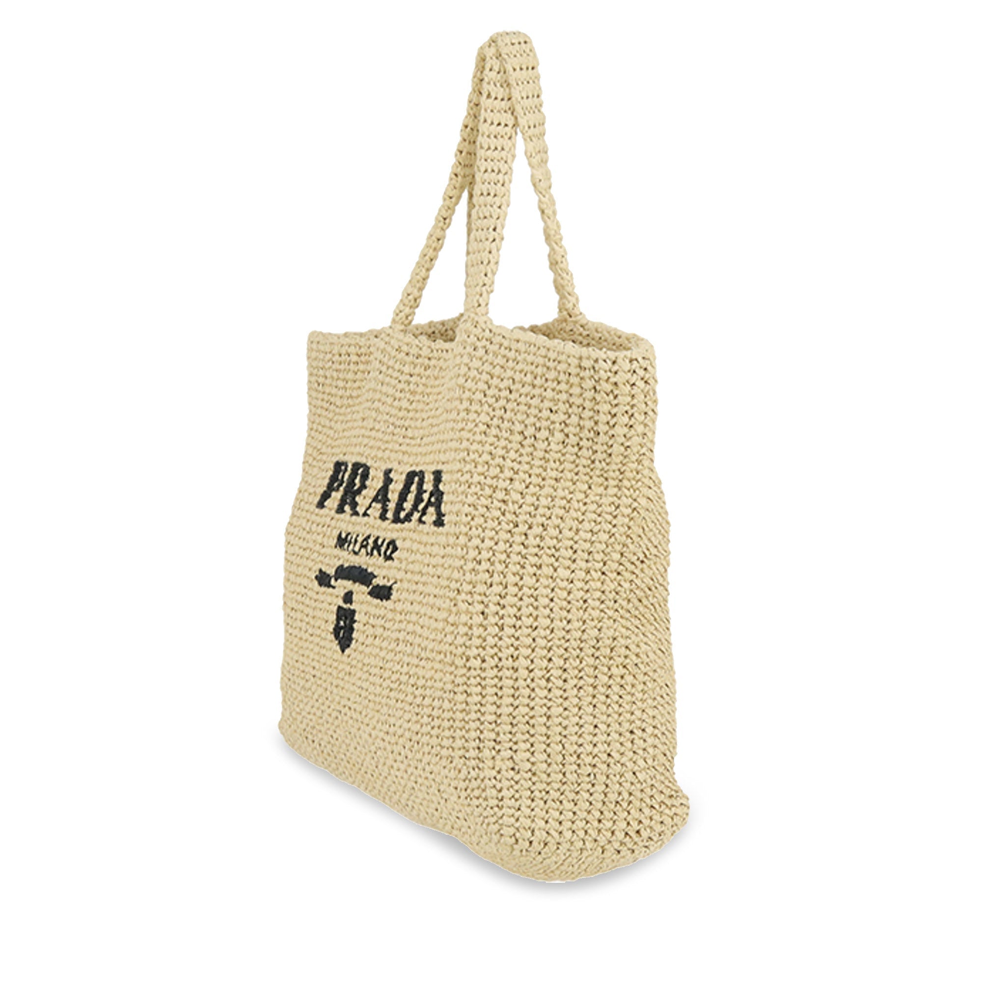 This Tote bag with a soft, deconstructed design is made from raffia-effect yarn, a light, natural material with a summery appeal. The large, iconic Prada lettering embroidered on the front emphasizes the silhouette.