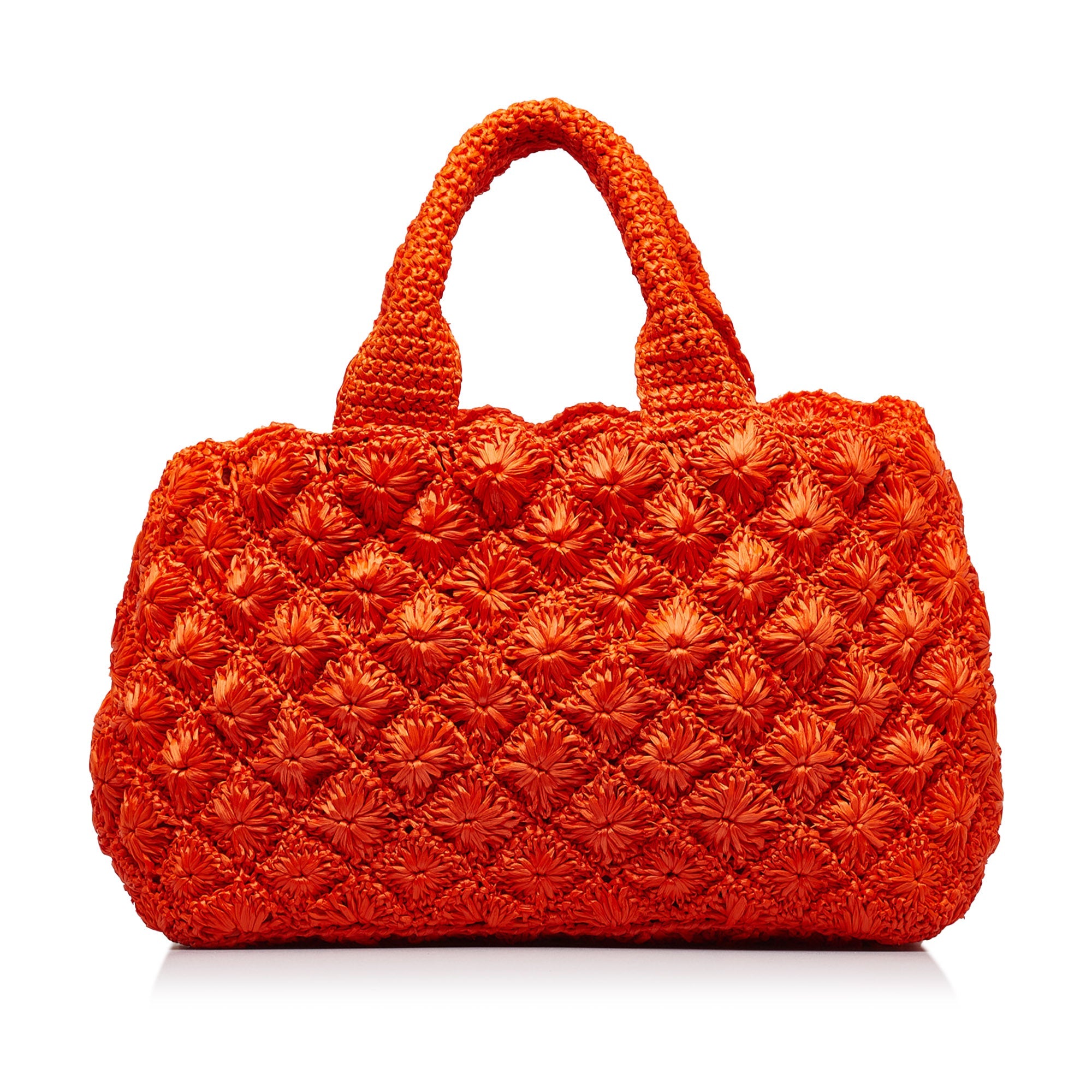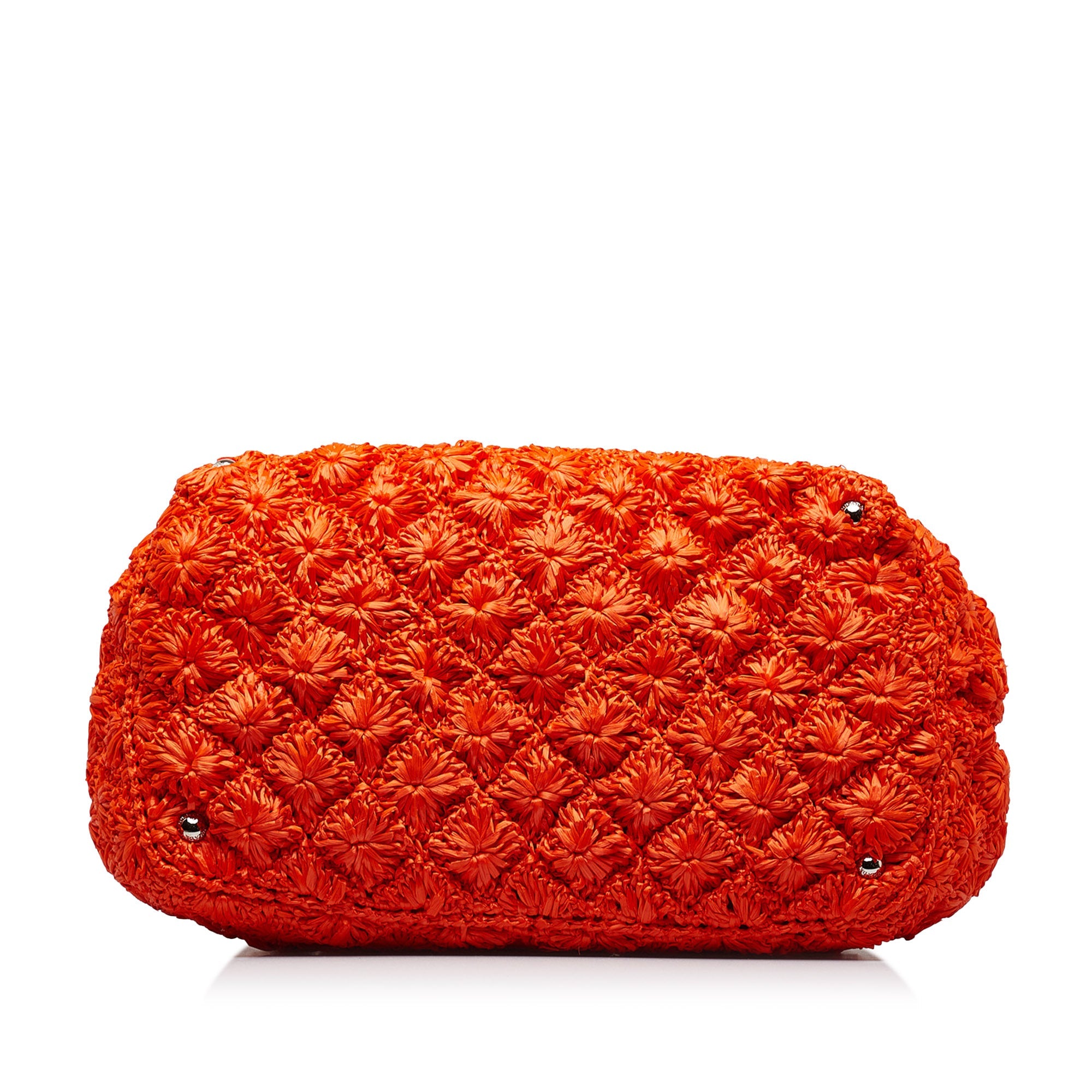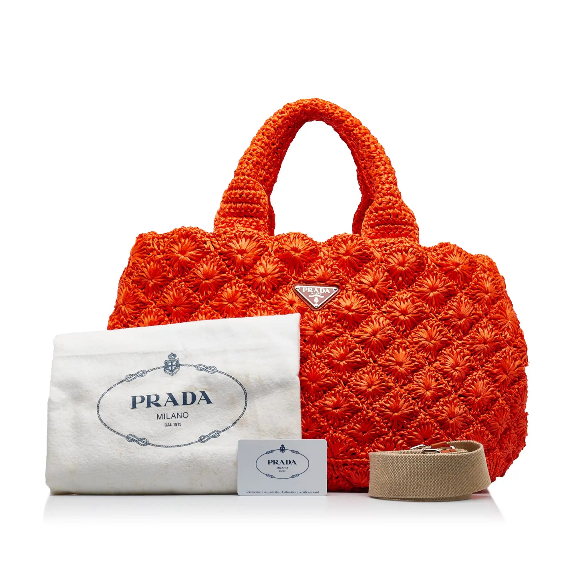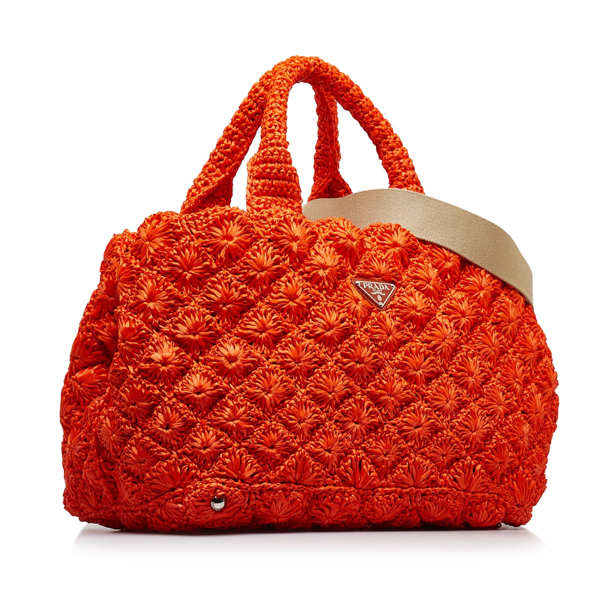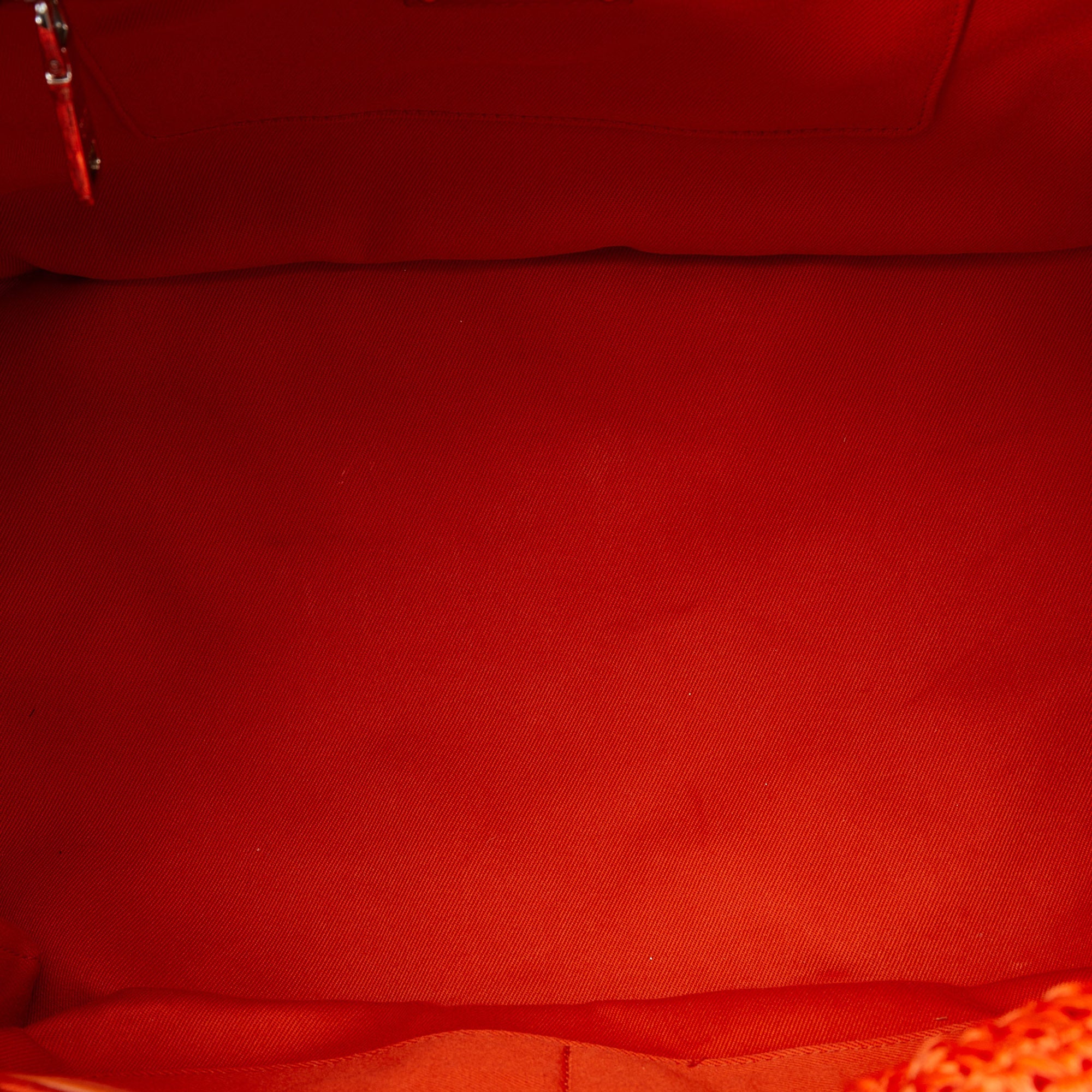 This Bag has an orange raffia body, rolled handles, a detachable flat canvas strap, an open top and zipped and slip pockets inside.