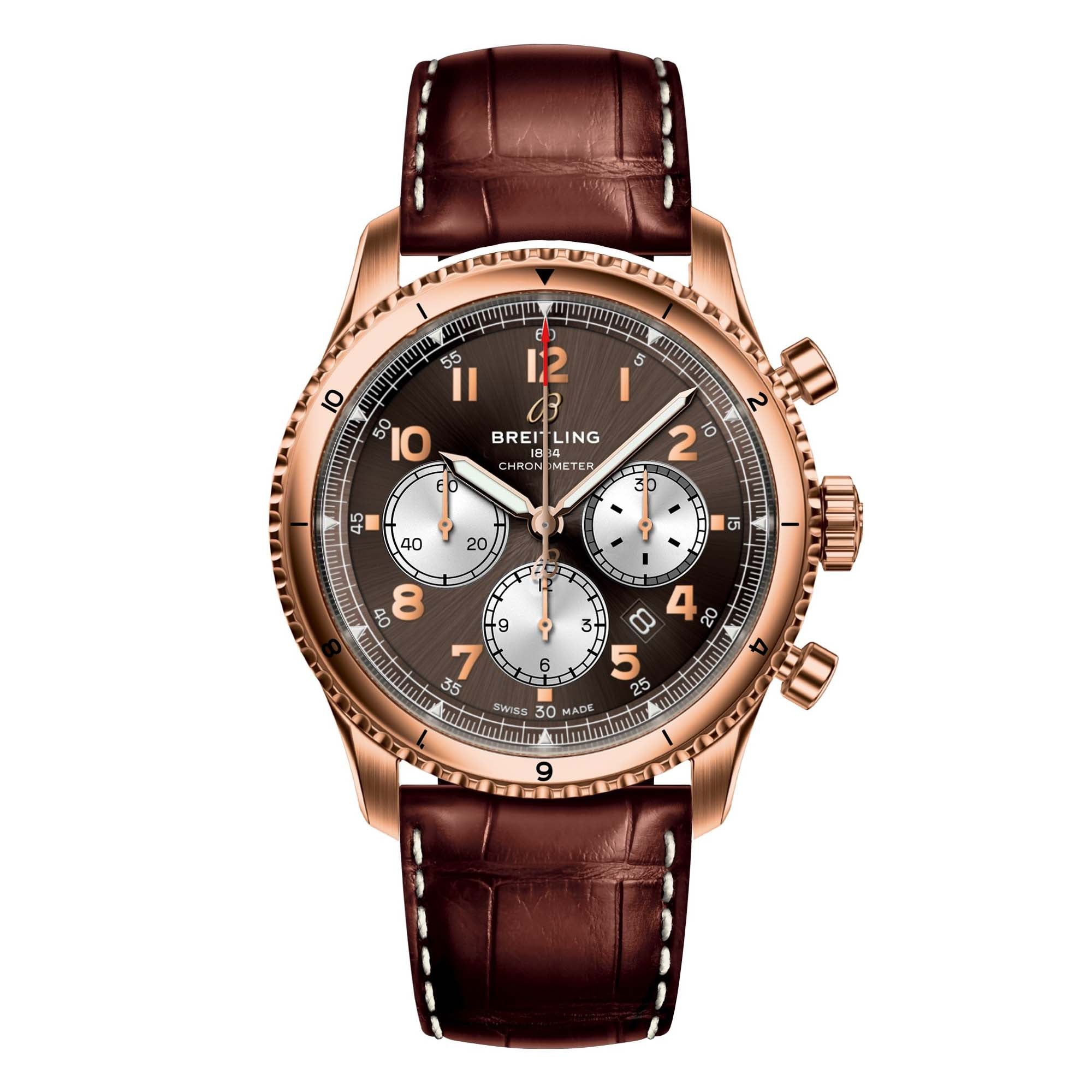 The Aviator 8 B01 Chronograph 43 is powered by the in-house Breitling Manufacture Caliber 01. The self-winding 43 mm watch has a ratchet-wheel chronograph with vertical coupling and an impressive power reserve of more than 70 hours. The display features 30-minute and 12-hour counters as well as a date window. The highlight of this new range, the Aviator 8 B01 Chronograph 43, is available in steel with a black or blue dial, or in 18k red gold with a bronze dial, each with the distinctive design elements of contrasting sub-dials. Presented on a steel bracelet or on an alligator leather strap, the COSC-certified chronometer features a transparent sapphire caseback.