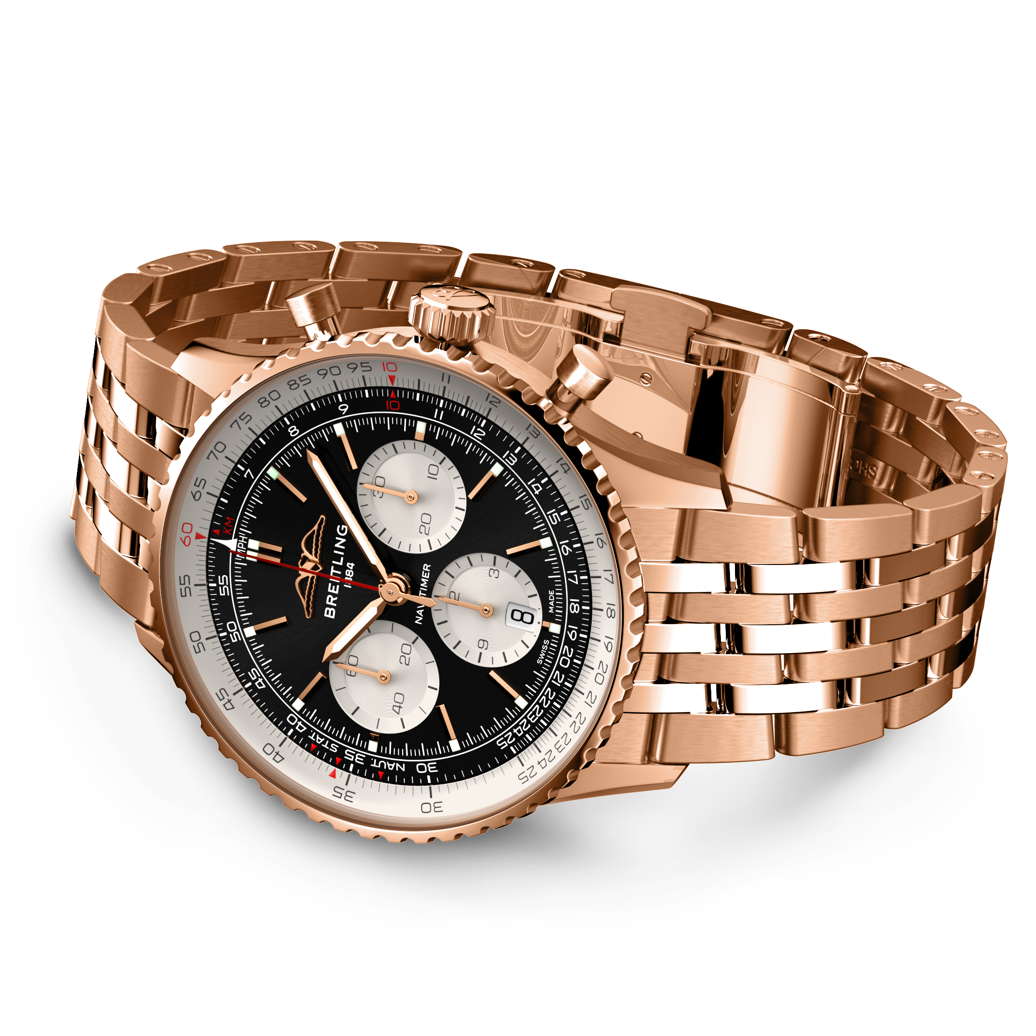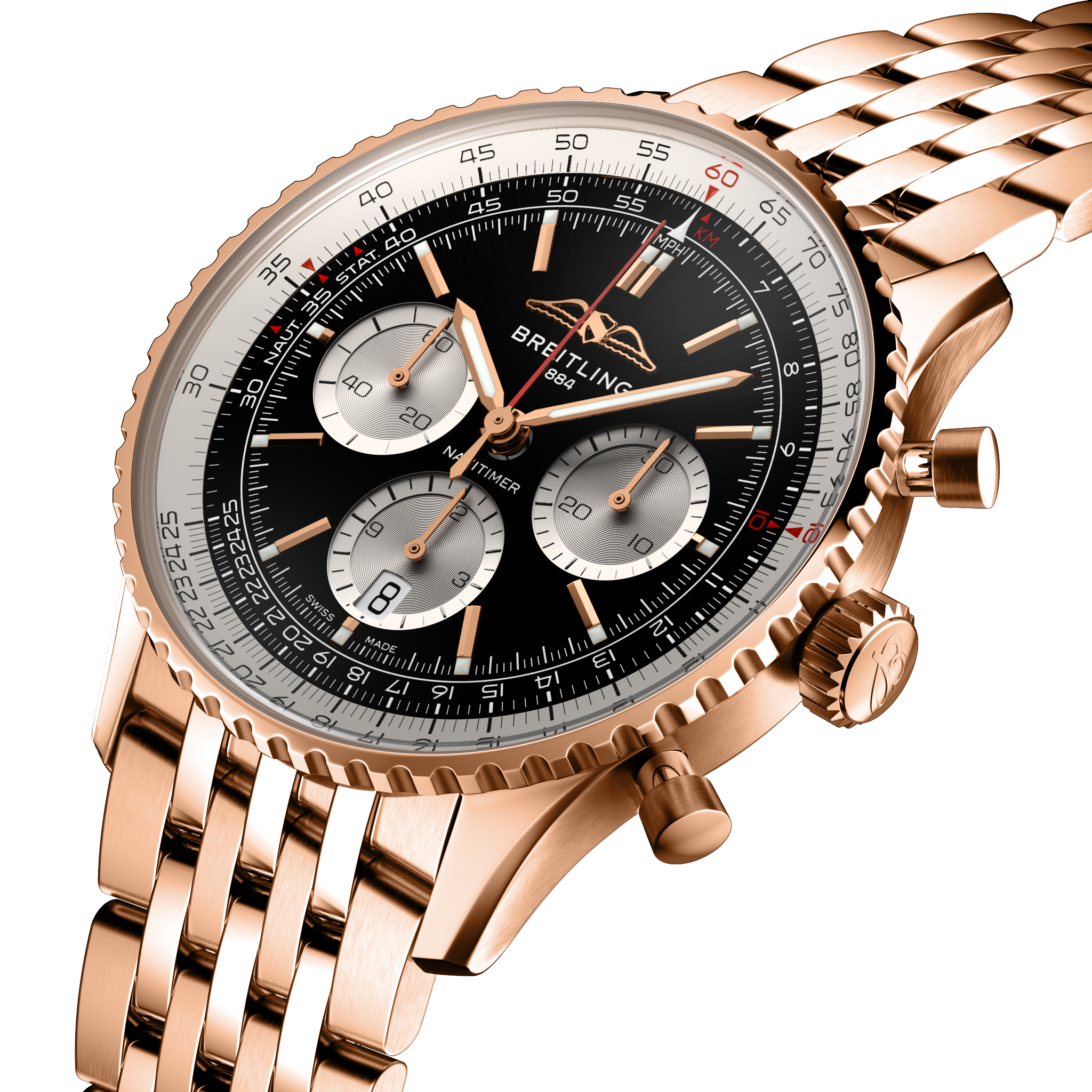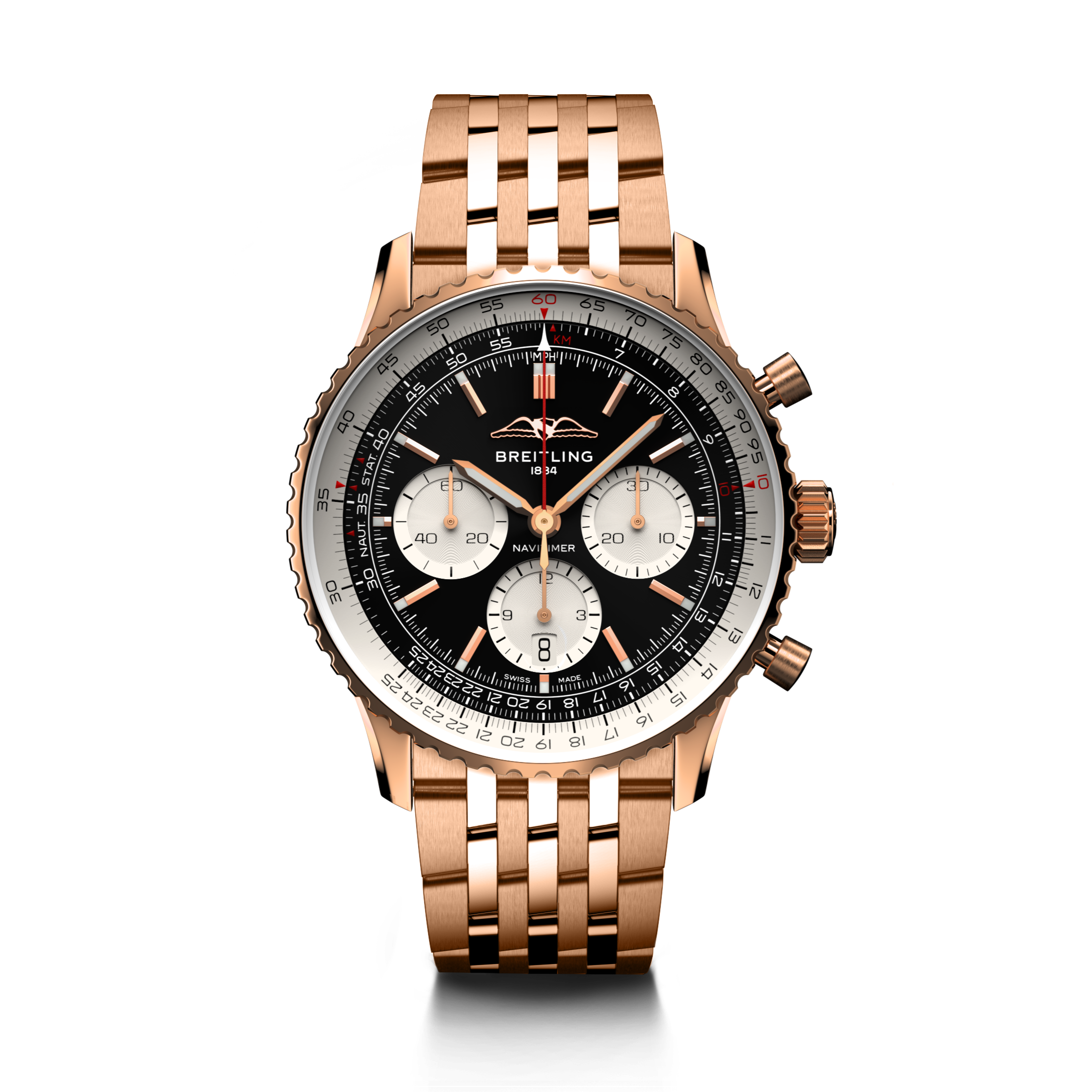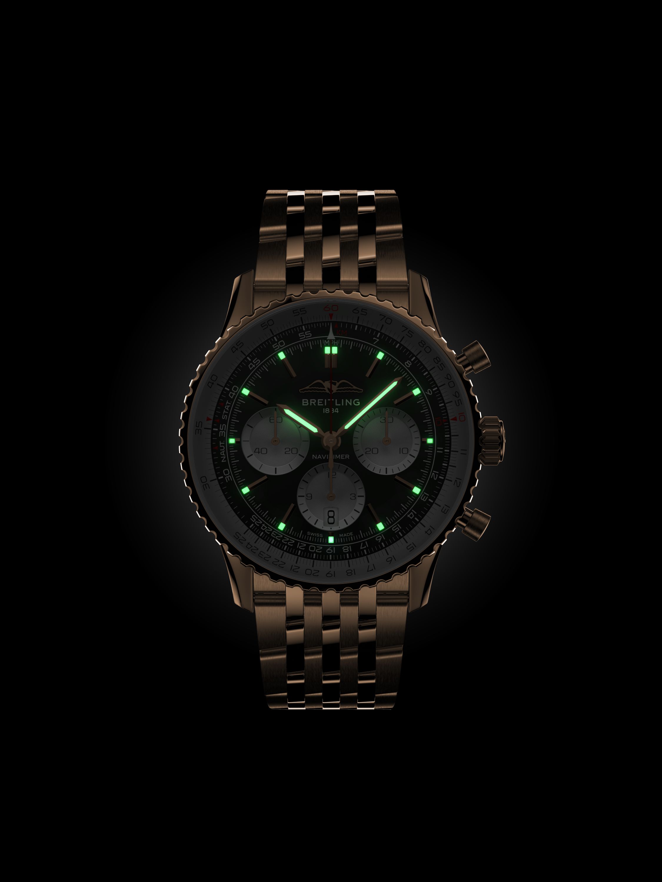 Breitling’s iconic pilot’s chronograph – for the journey. In 1952, Willy Breitling developed a wrist-worn chronograph with a circular slide rule that would allow pilots to perform all necessary flight calculations. Two years later, the Aircraft Owners and Pilots Association (AOPA) announced the design as its official timepiece. The “navigation timer” – or Navitimer – was born. The AOPA was (and remains) the largest pilots’ club in the world, counting nearly every US aviator among its ranks. As the defacto pilot’s watch throughout the glory days of civil aviation, the Navitimer was worn by airline captains and aircraft enthusiasts. It even made its way into space on the wrist of astronaut Scott Carpenter in 1962. And it wasn’t only pilots drawn to the watch’s irrepressible aesthetic. Celebrities of the day such as Miles Davis and Serge Gainsbourg were devotees, proving that the Navitimer had style as well as function. There have been many iterations of Breitling’s icon since its debut 70 years ago, but this new Navitimer captures its most classic features, while enhancing them with modern refinements. A flattened slide rule and a domed crystal create the illusion of a sleeker profile. Alternating polished and brushed metal elements give a lustrous, yet understated finish. Most notably, new colors in shades of blue, green and copper, define the updated dial options. And if there is one update sure to spark nostalgia, it’s the return of the AOPA wings to their original position at 12 o’clock. For 70 years, Breitling’s original pilot’s watch has been beloved by aviators and tastemakers in equal measure. Worn by astronauts in space and the biggest stars on earth, it is Breitling’s most iconic timepiece and one of the most recognizable watches of all time.