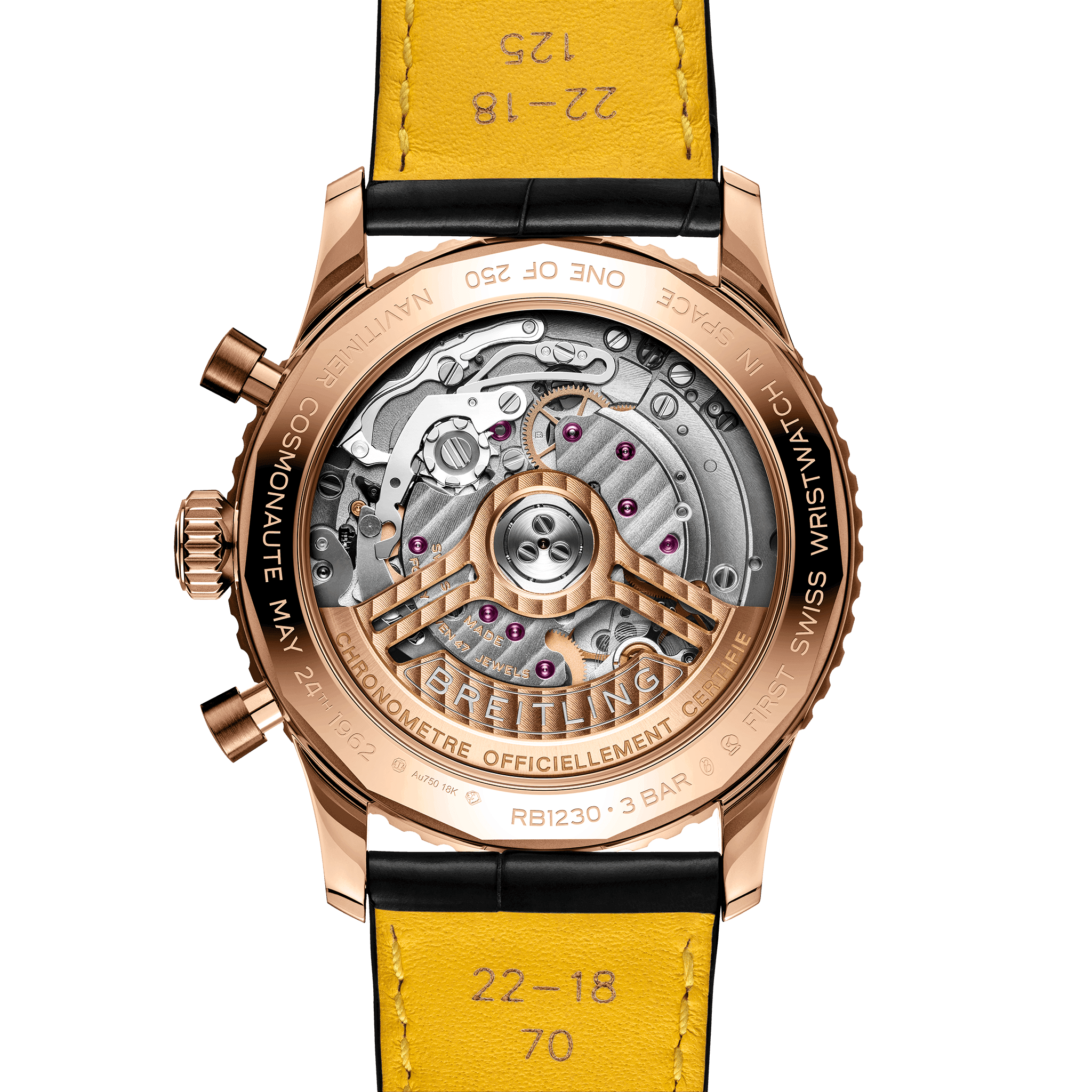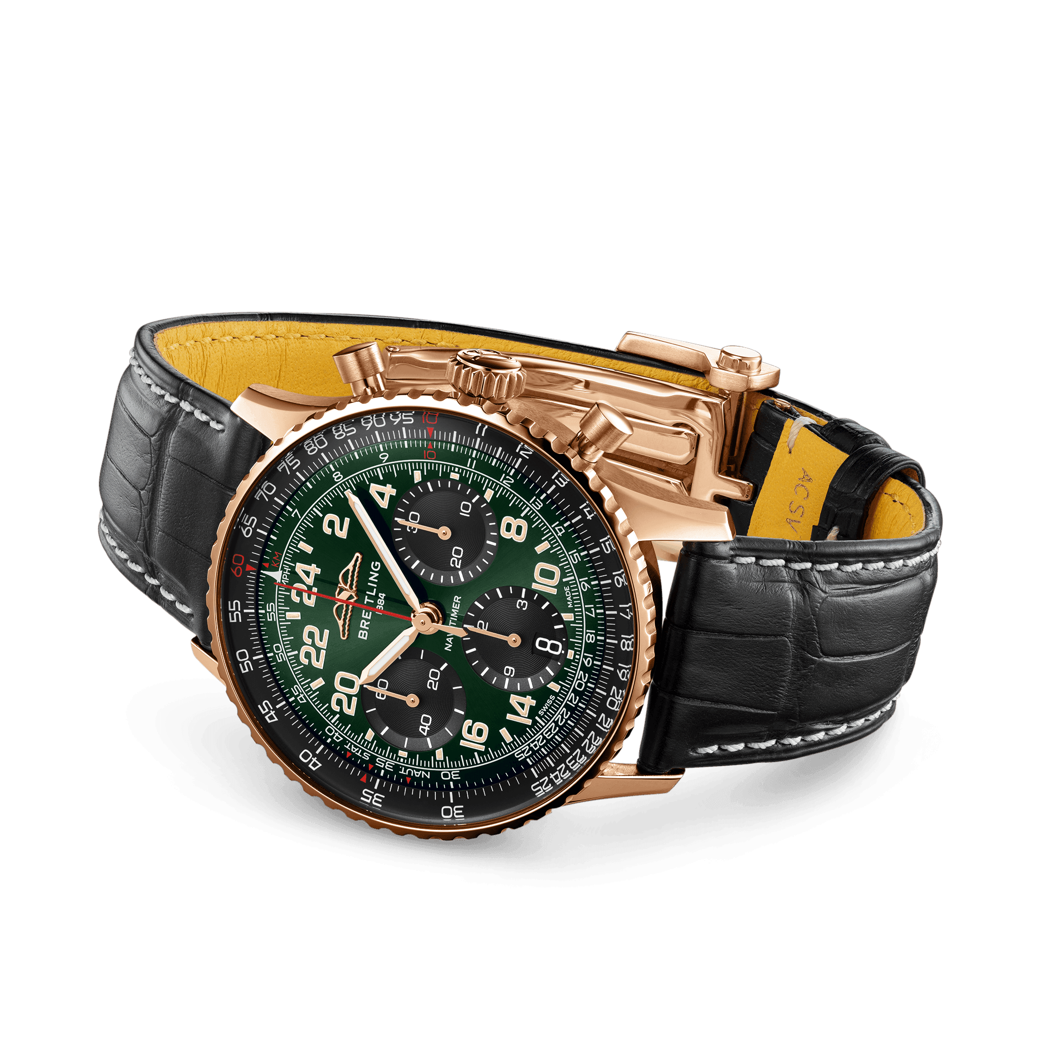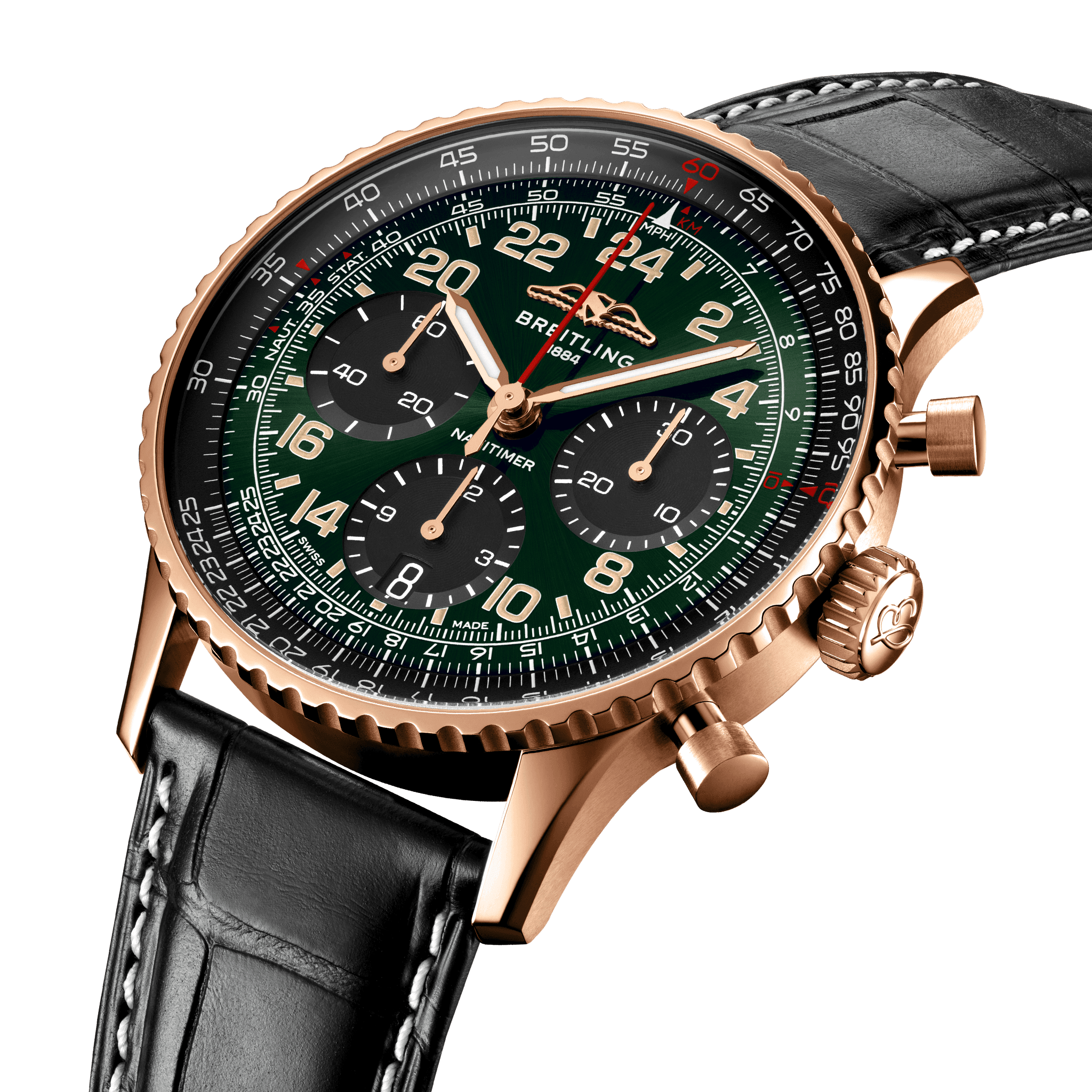 Breitling’s iconic pilot’s chronograph—fit for space travel. By the early 1960s, Breitling’s Navitimer, with its circular slide rule for performing in-flight calculations, had become the undisputed pilots’ watch. But in the era of the Space Race, another competition was quietly underway, this time between watchmakers vying to be the first on astronauts’ wrists. Breitling showed its chops in the air once again, officially becoming the first Swiss wrist-worn chronograph in space on May 24th, 1962, when Scott Carpenter blasted off in the Mercury-Atlas 7 spacecraft wearing the Navitimer Cosmonaute. The watch was his personal request, a variation on the iconic Navitimer with the addition of a 24-hour dial to distinguish day from night in orbit. Mercury-Atlas 7 circled the earth three times before it splashed down in the Atlantic, making aeronautic—and watchmaking—history. Our Cosmonaute tribute, limited to 250 pieces, modernizes the aesthetics of the original with a green dial and 18 k red gold case. And this time, the main modification isn’t for zero-g but for everyday life: a self-winding chronograph movement, the Breitling manufacture caliber B12. As a further tribute, the caseback is engraved with Carpenter’s mission date, the limitation to 250 pieces and the phrase “First Swiss wristwatch in space.”