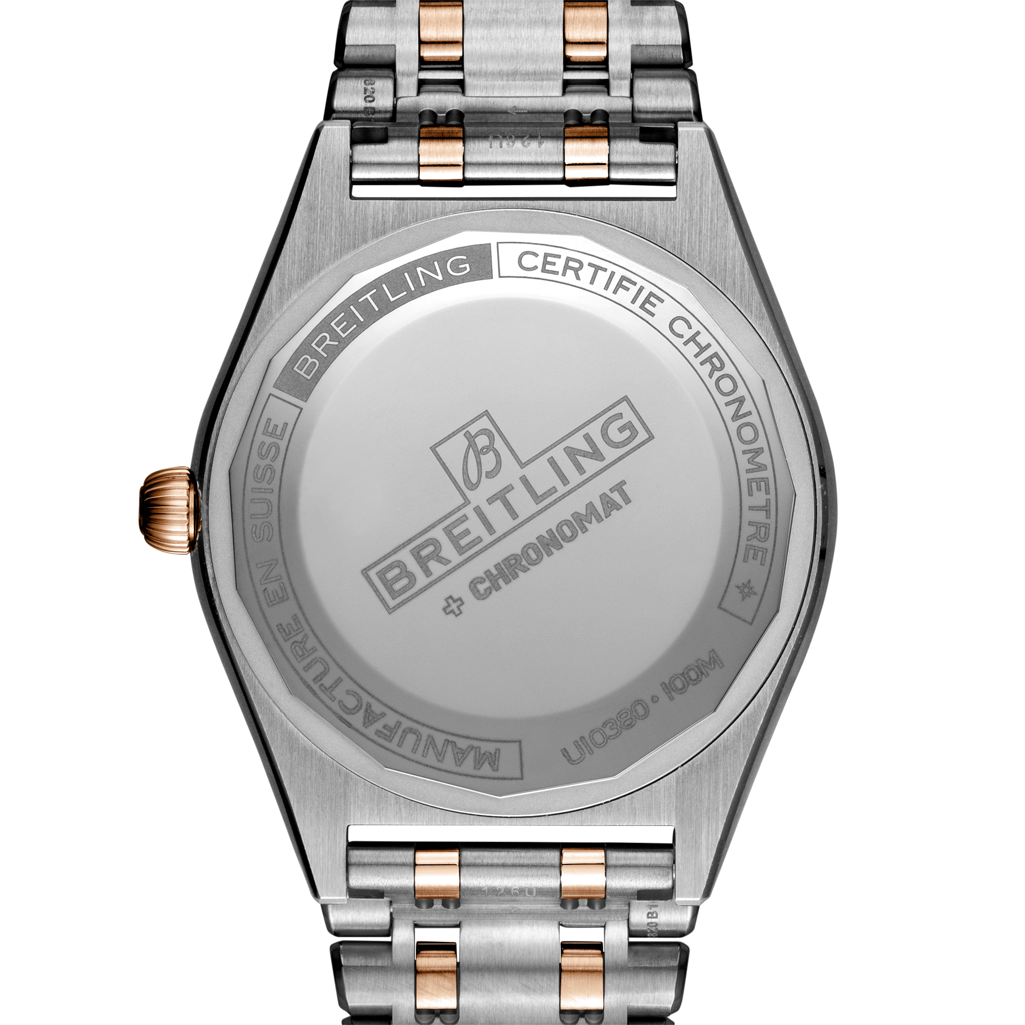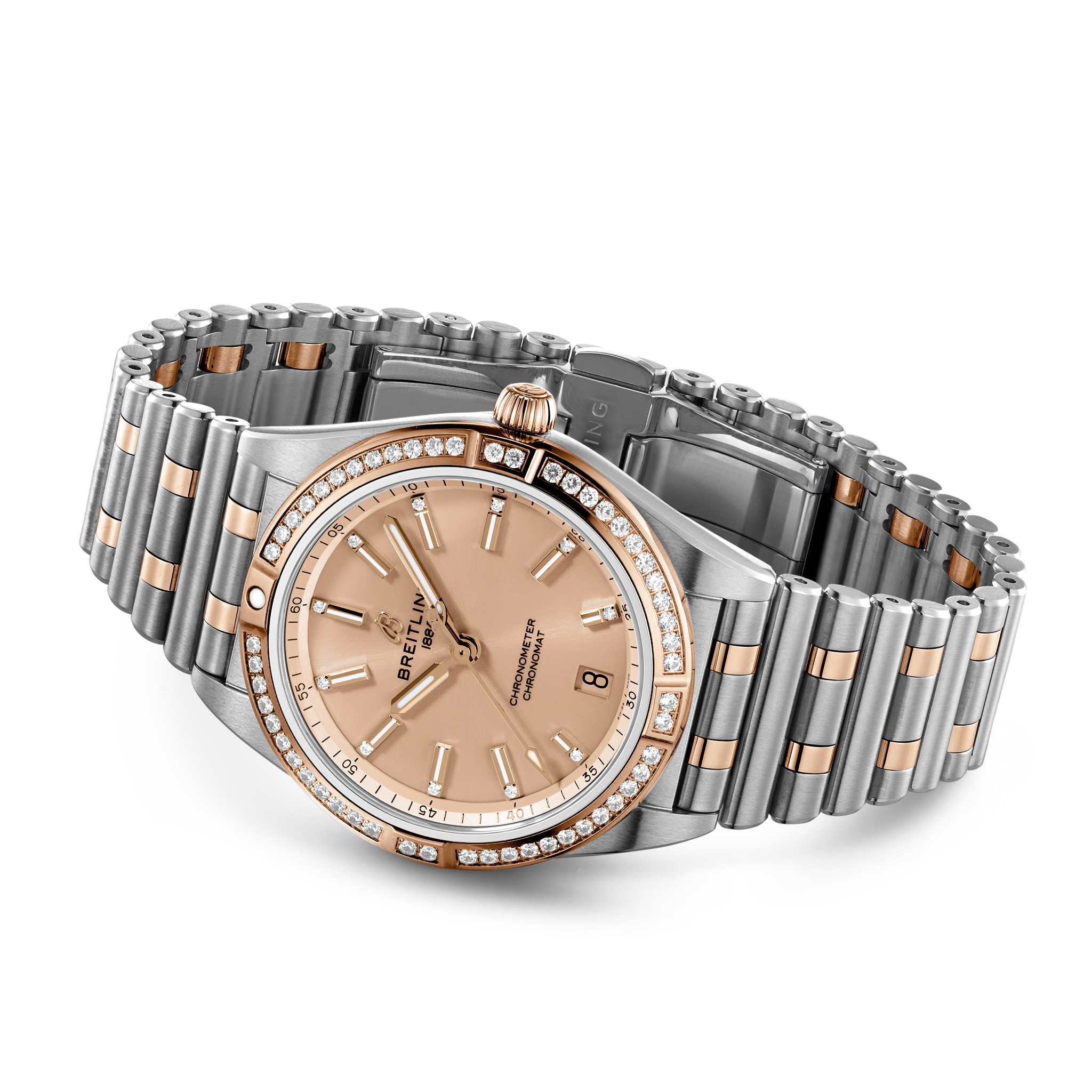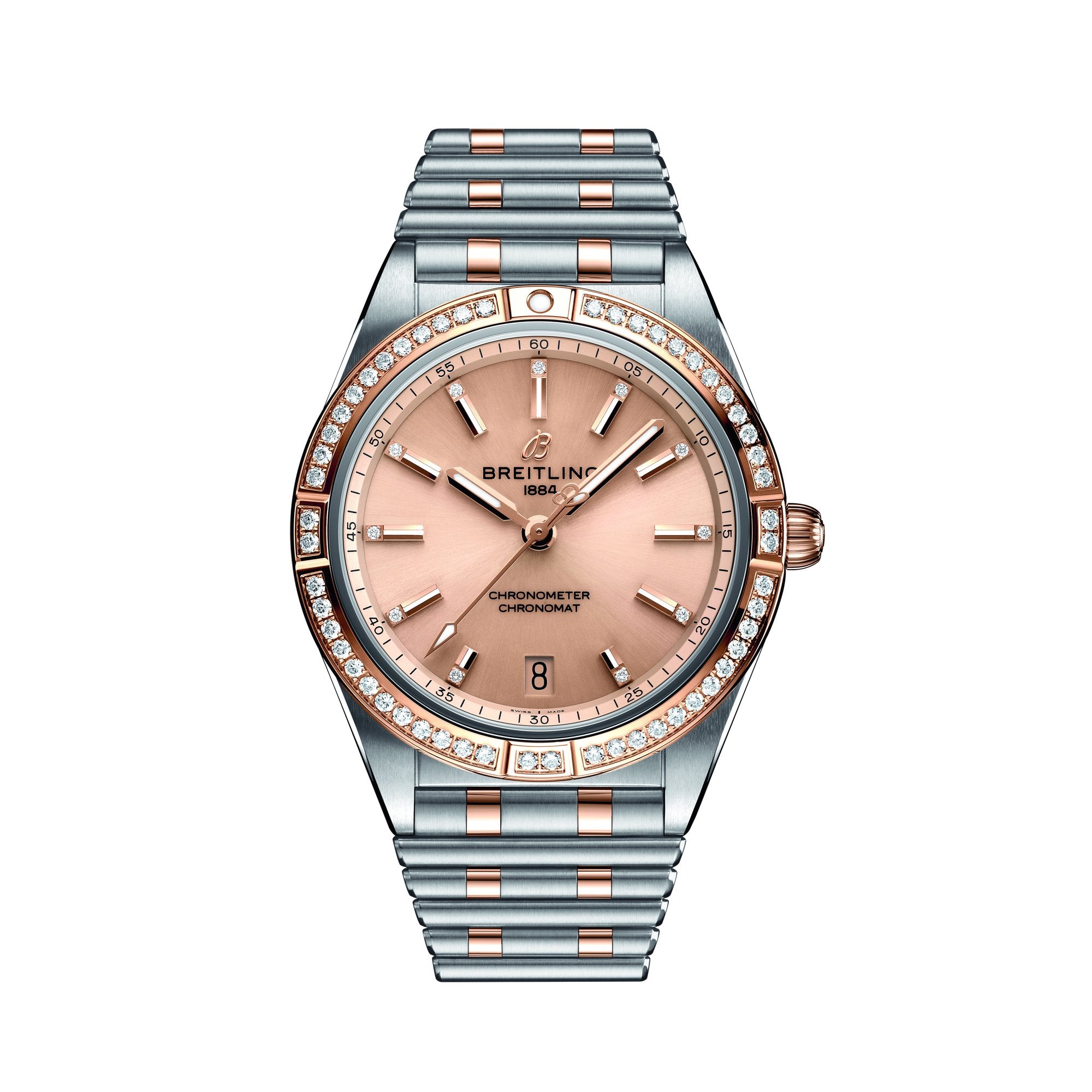 Stylish yet elegant, the modern-retro inspired Chronomat Automatic 36 is the versatile sporty and chic watch for any occasion. It is available in an array of metal cases, from cool stainless steel, to goes-with-everything bicolor, or even luxurious 18k red gold. Women craving extra sparkle will also be able to opt for diamond-set bezels, indices, and colorful dials. Featuring Breitling’s iconic and comfortable “Rouleaux” bracelet with a butterfly clasp, the Chronomat Automatic 36 is powered by the Breitling Caliber 10, a COSC-certified chronometer.