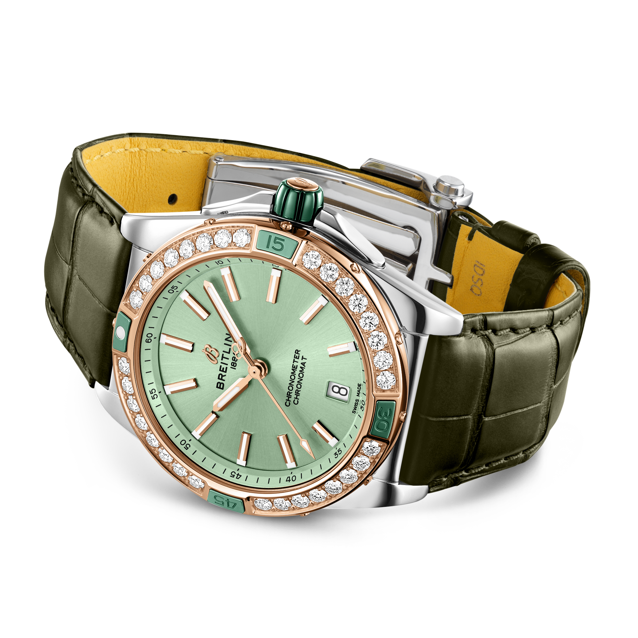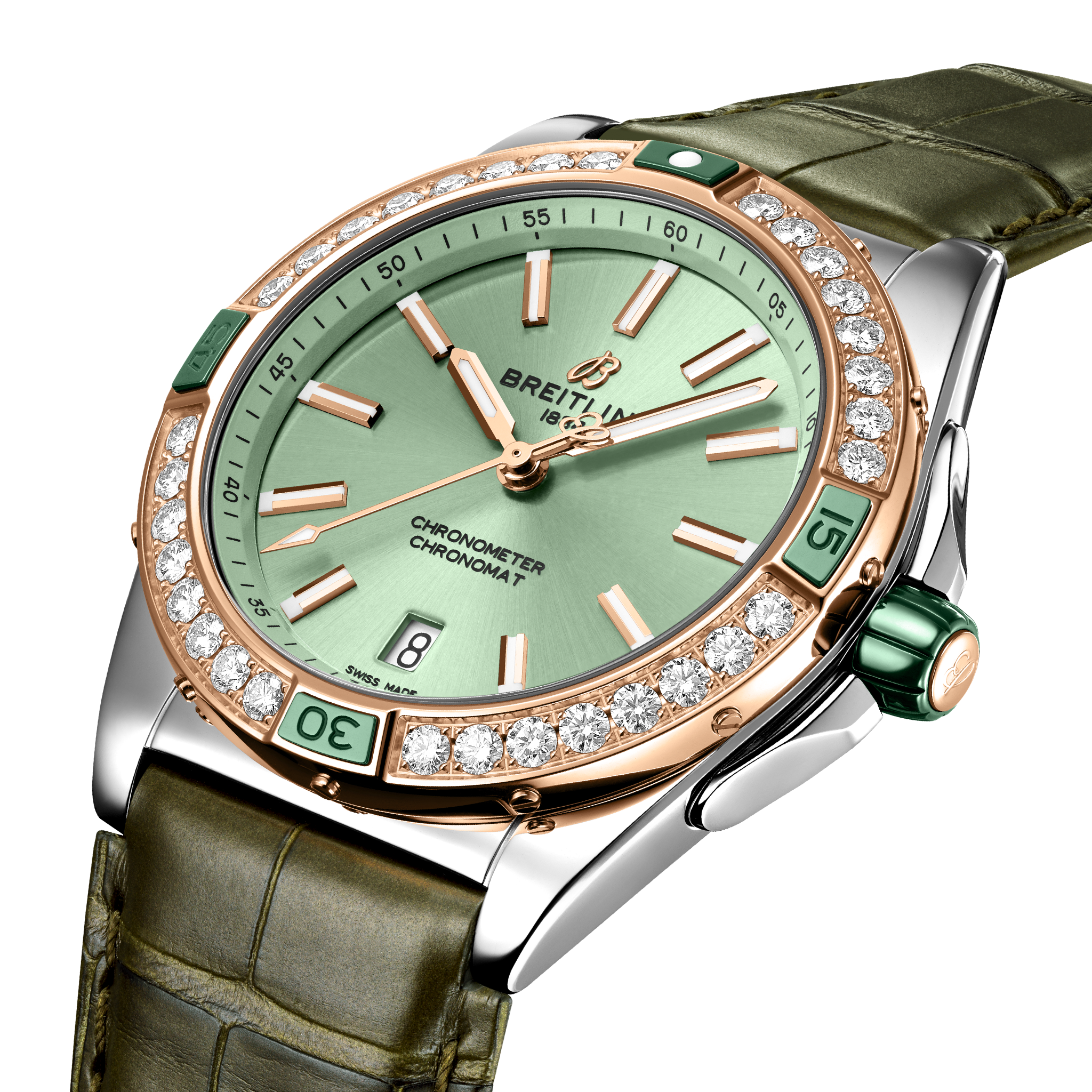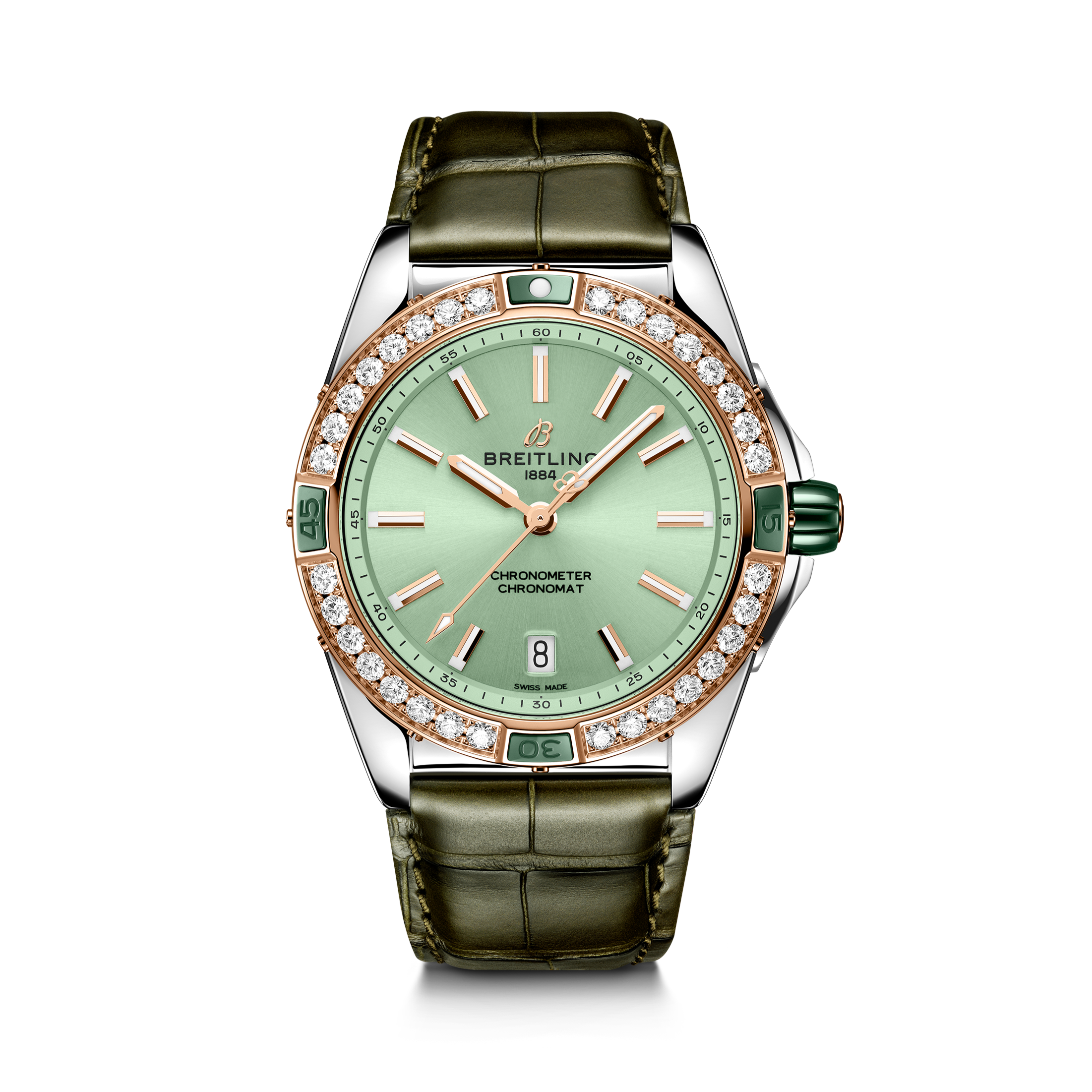 The Super Chronomat Automatic 38 is designed to make a statement, whether paired with a power suit or a t-shirt and jeans. You can tell a Super from the rest of the Chronomat family by the ceramic rider tabs and crown, and the rubber rouleaux bracelet only available with this supercharged line. Aside from its enhanced presence, the Automatic 38 also has a radiant side. Oversized lab-grown diamonds make the rounds of its 18k red gold or stainless-steel bezel. Its dial colors add just the right amount of eye candy. Pair a favorite shade with a choice of bracelet or strap.