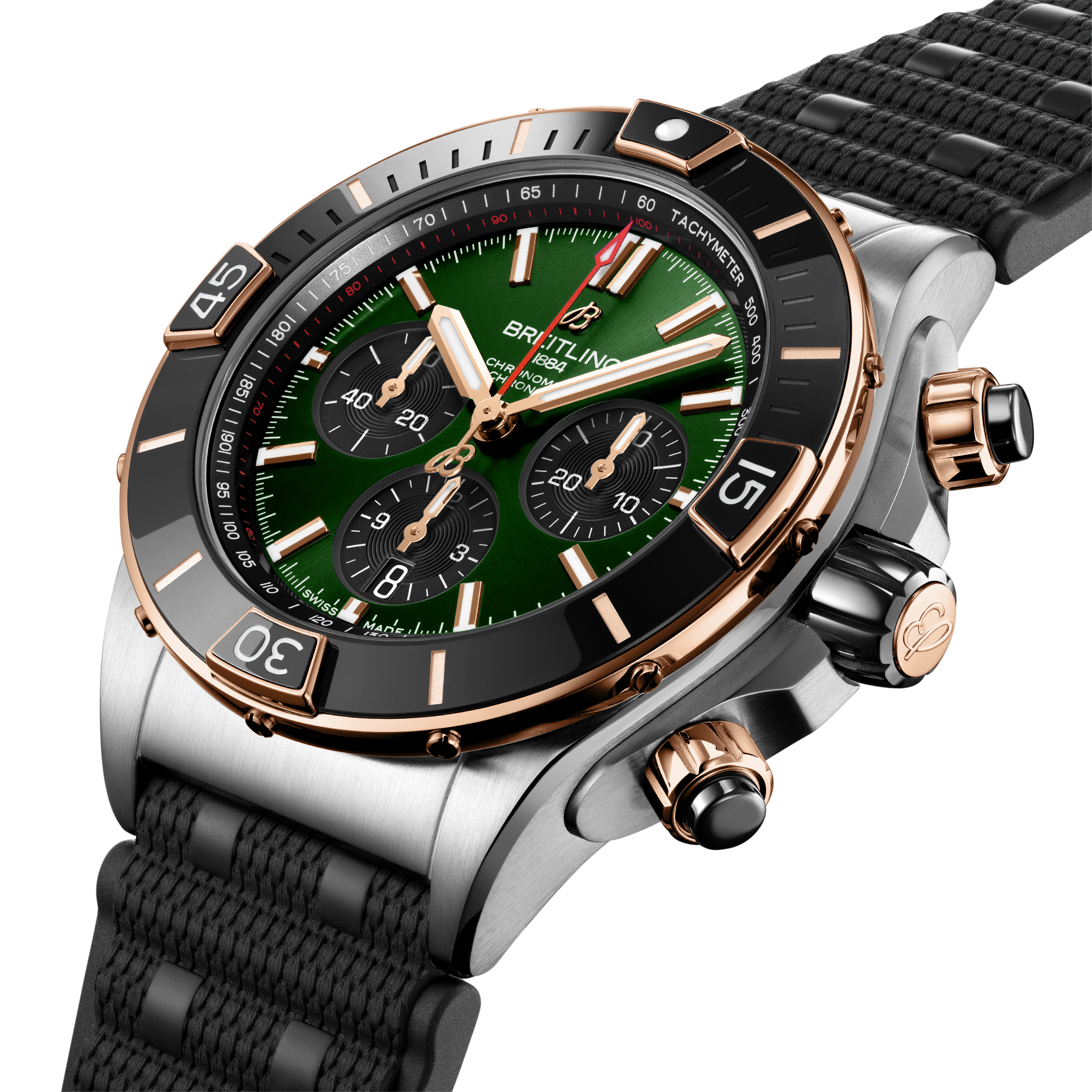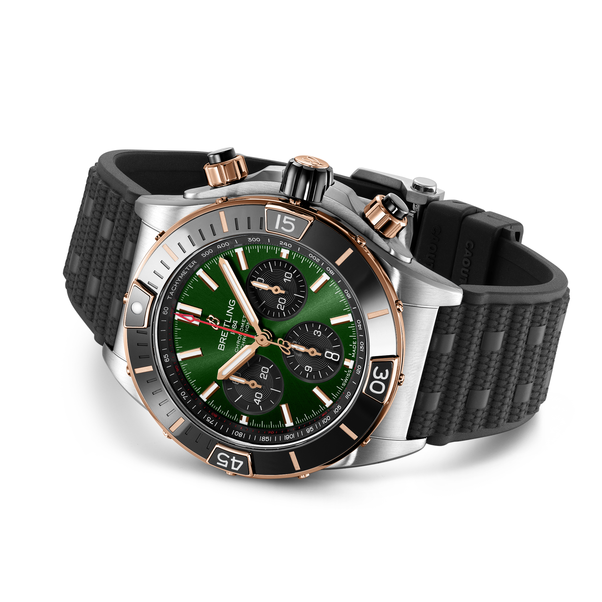 Breitling’s supercharged watch for your every pursuit. The Super Chronomat is inspired by the original 1980s Chronomat that Breitling created for the hotshots of aerobatic squadrons. The boldest of all Chronomat watches, the Super Chronomat features several ceramic inserts – on the bezel, on the chronograph pushers and on the crown – as well as a Rouleaux-inspired rubber strap. Still, this all-purpose sports watch won’t get in the way of your sense of style. The Super Chronomat comes in several colour and metal variations, from stainless steel to 18 k red gold. It either features the iconic Rouleaux bracelet or a rubber Rouleaux-inspired strap, matched with a folding clasp. The Super Chronomat B01 44 is powered by the Breitling Manufacture Calibre 01, a COSC-certified chronometer.