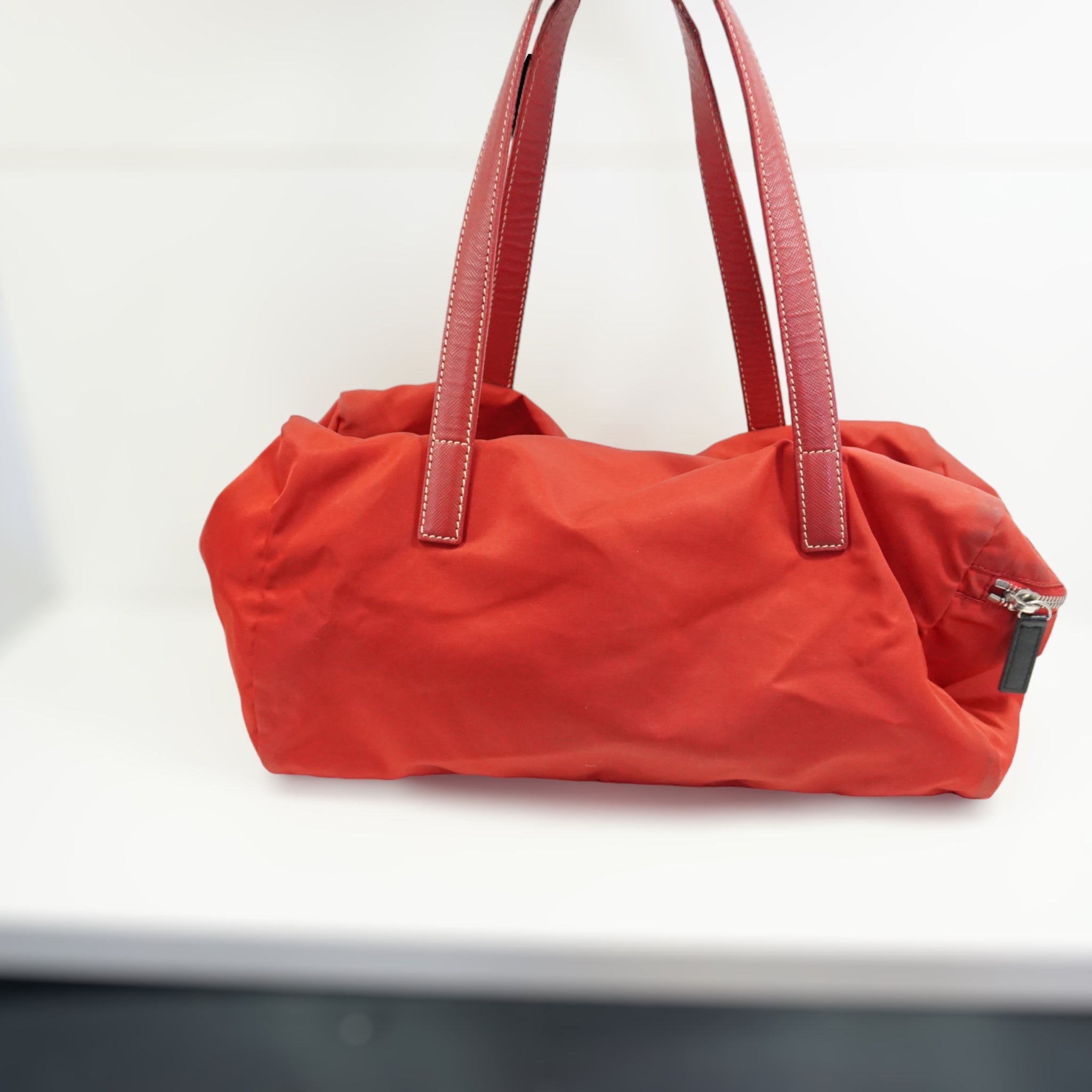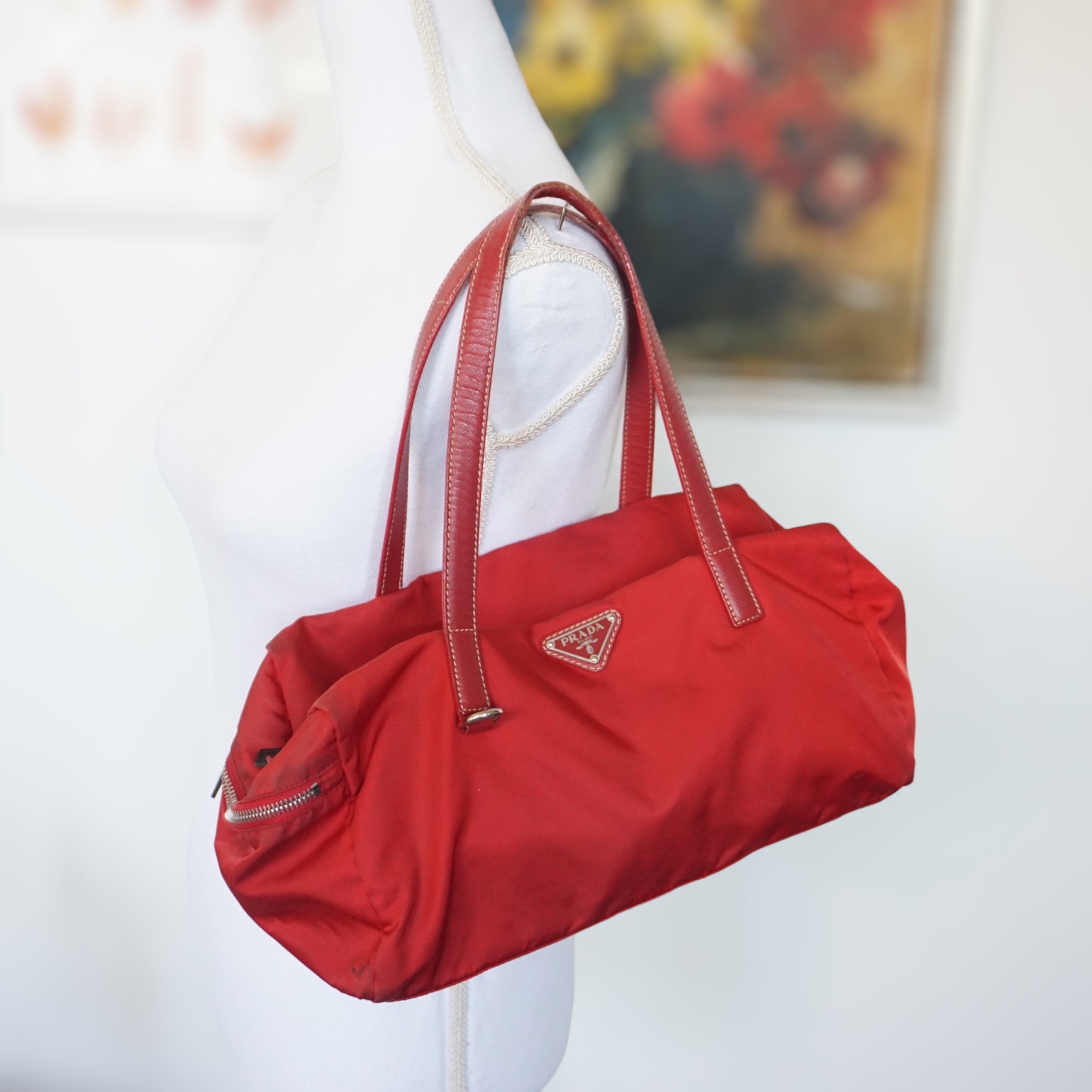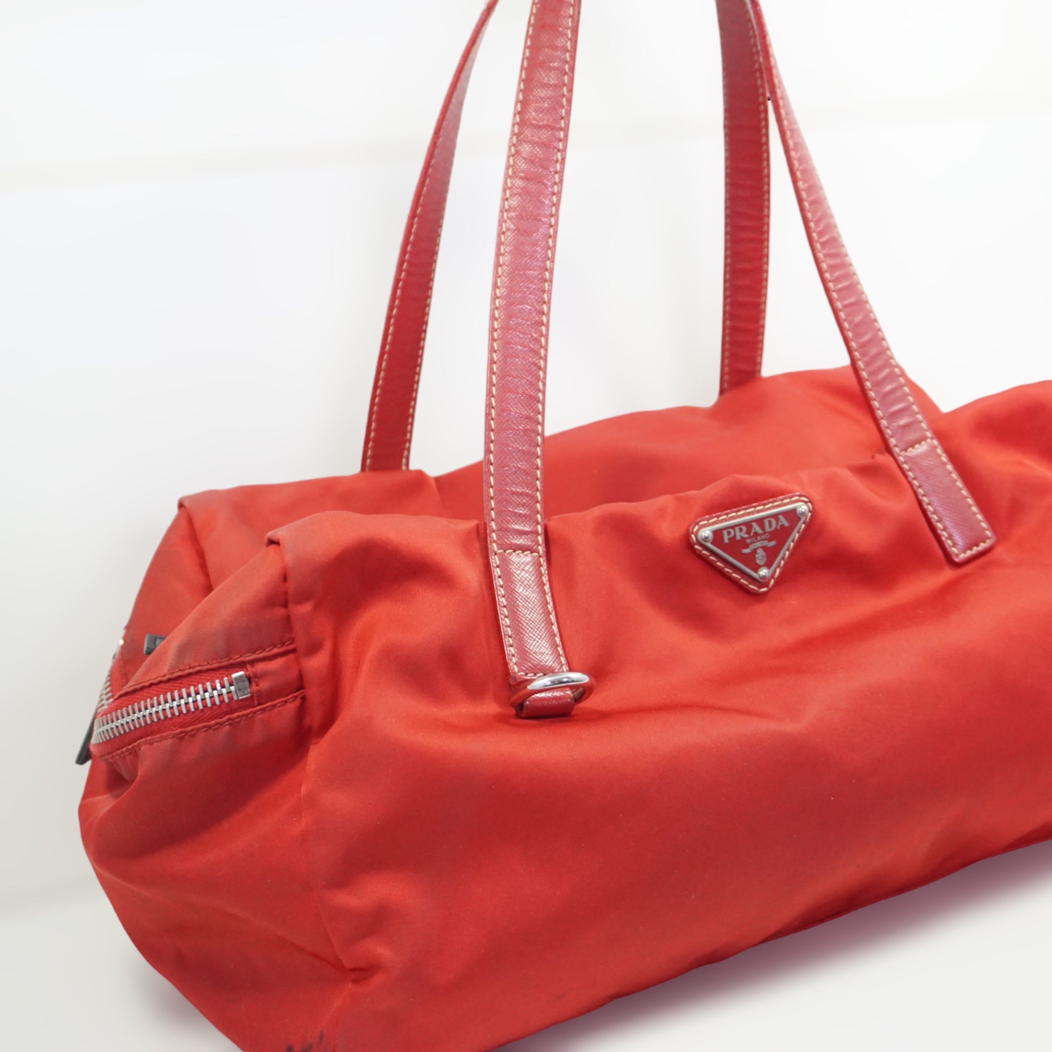 Prada skuldertaske i rød nylon med læder skulderrem.