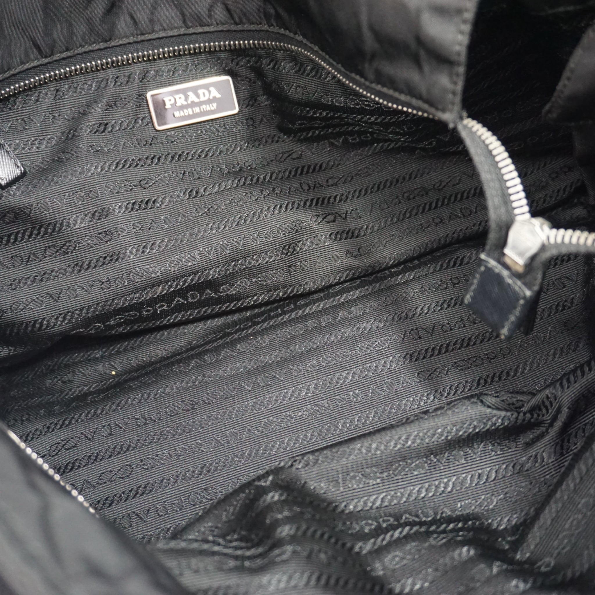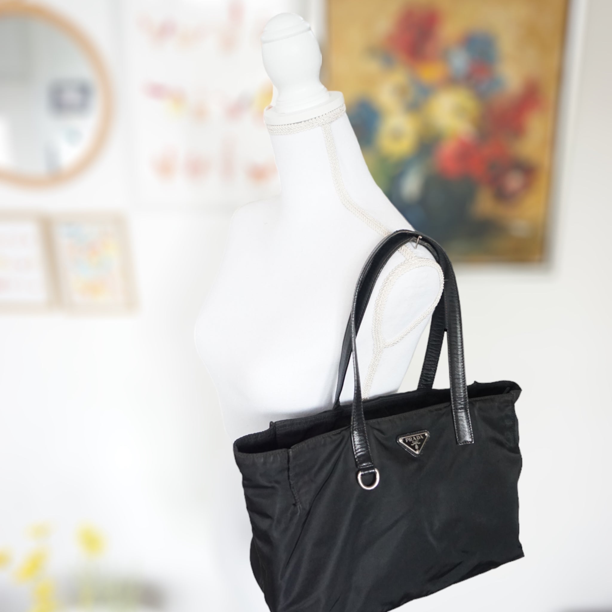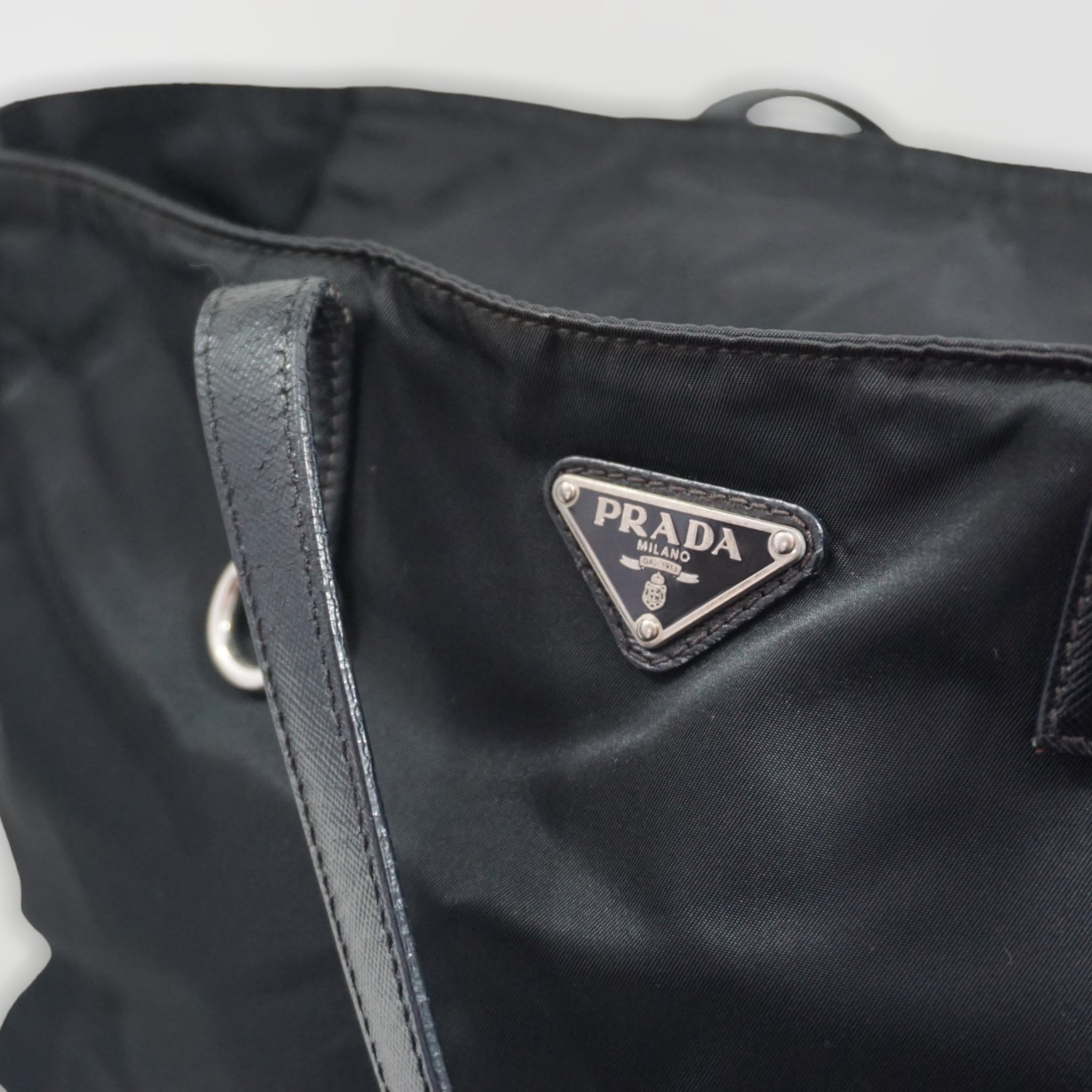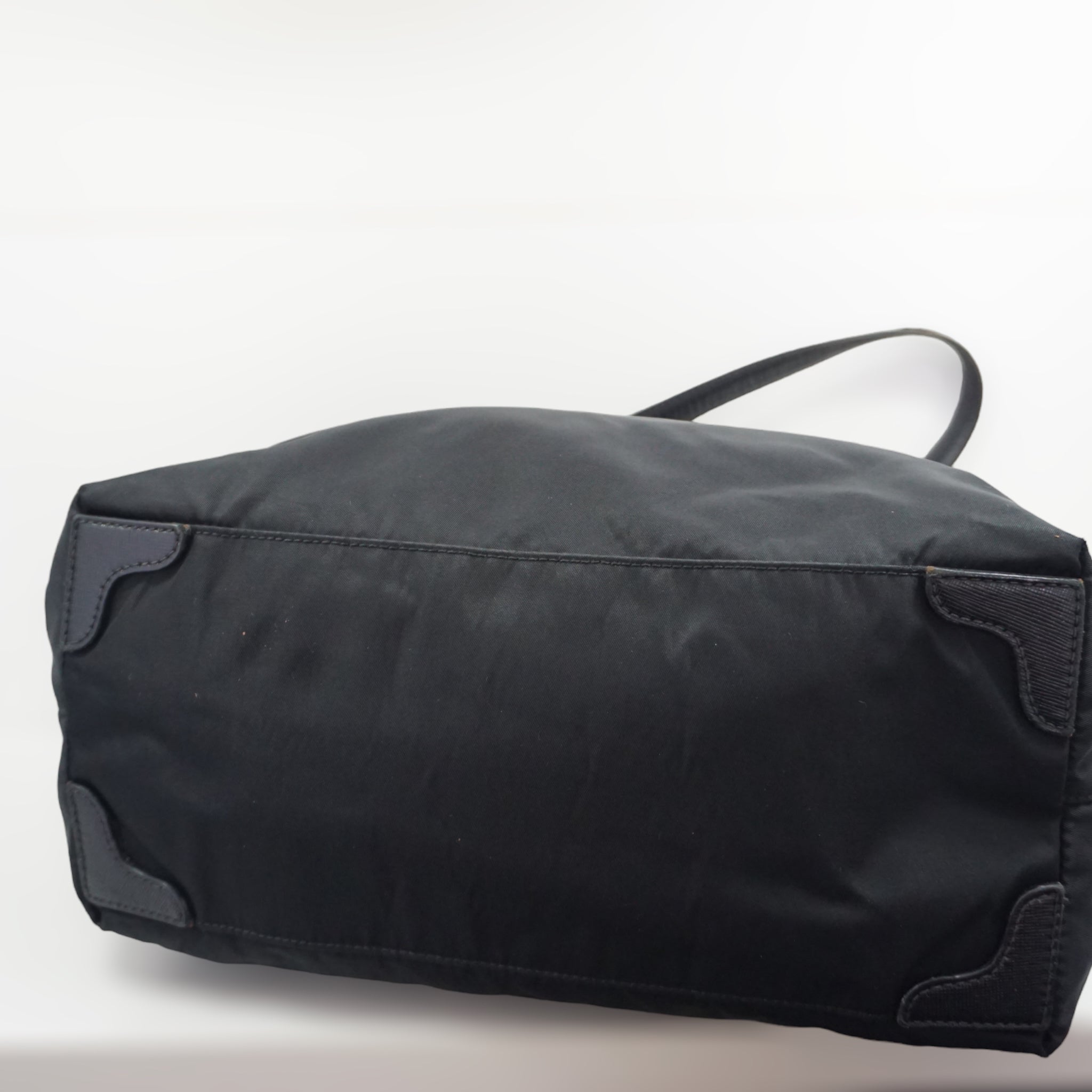 Klassisk sort Prada skuldertaske i nylon og læder.