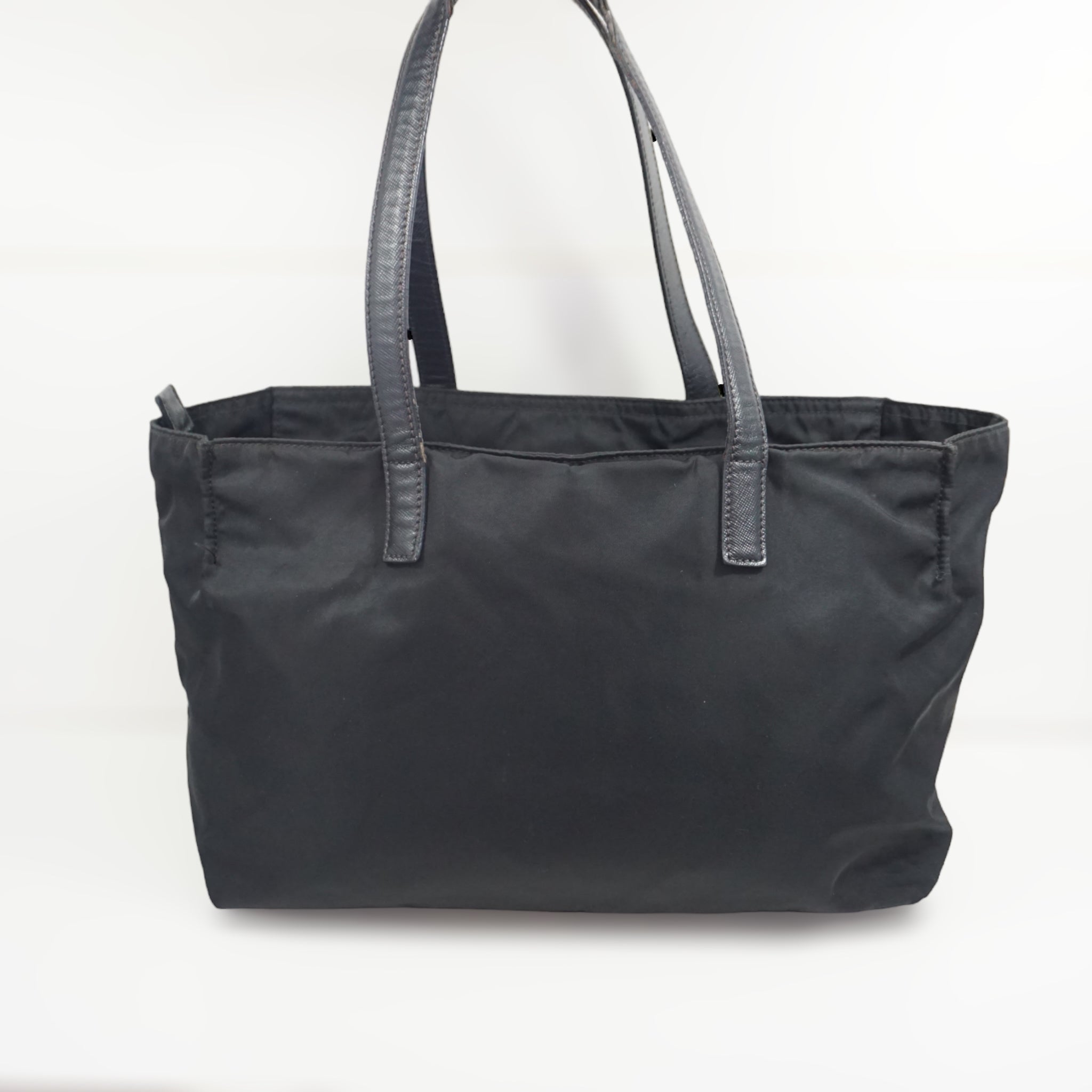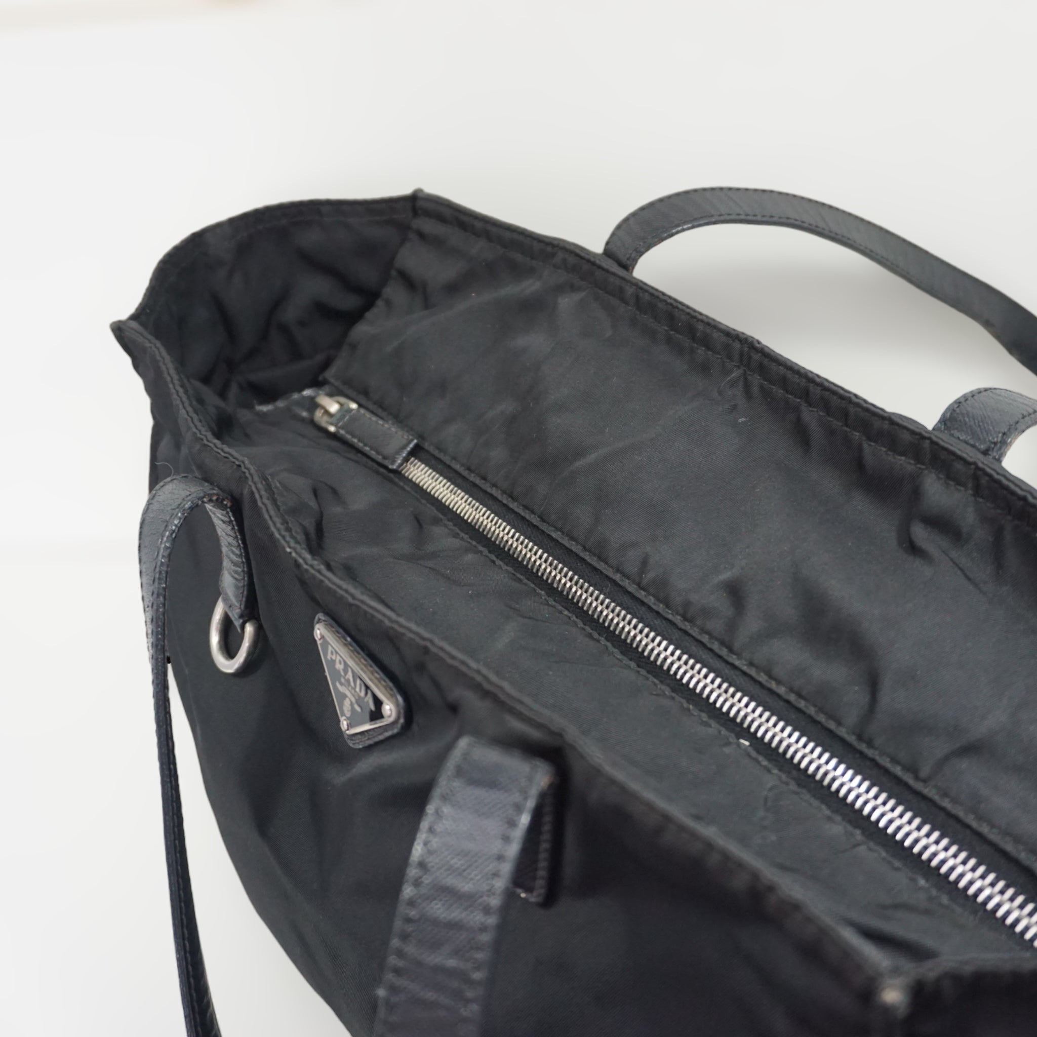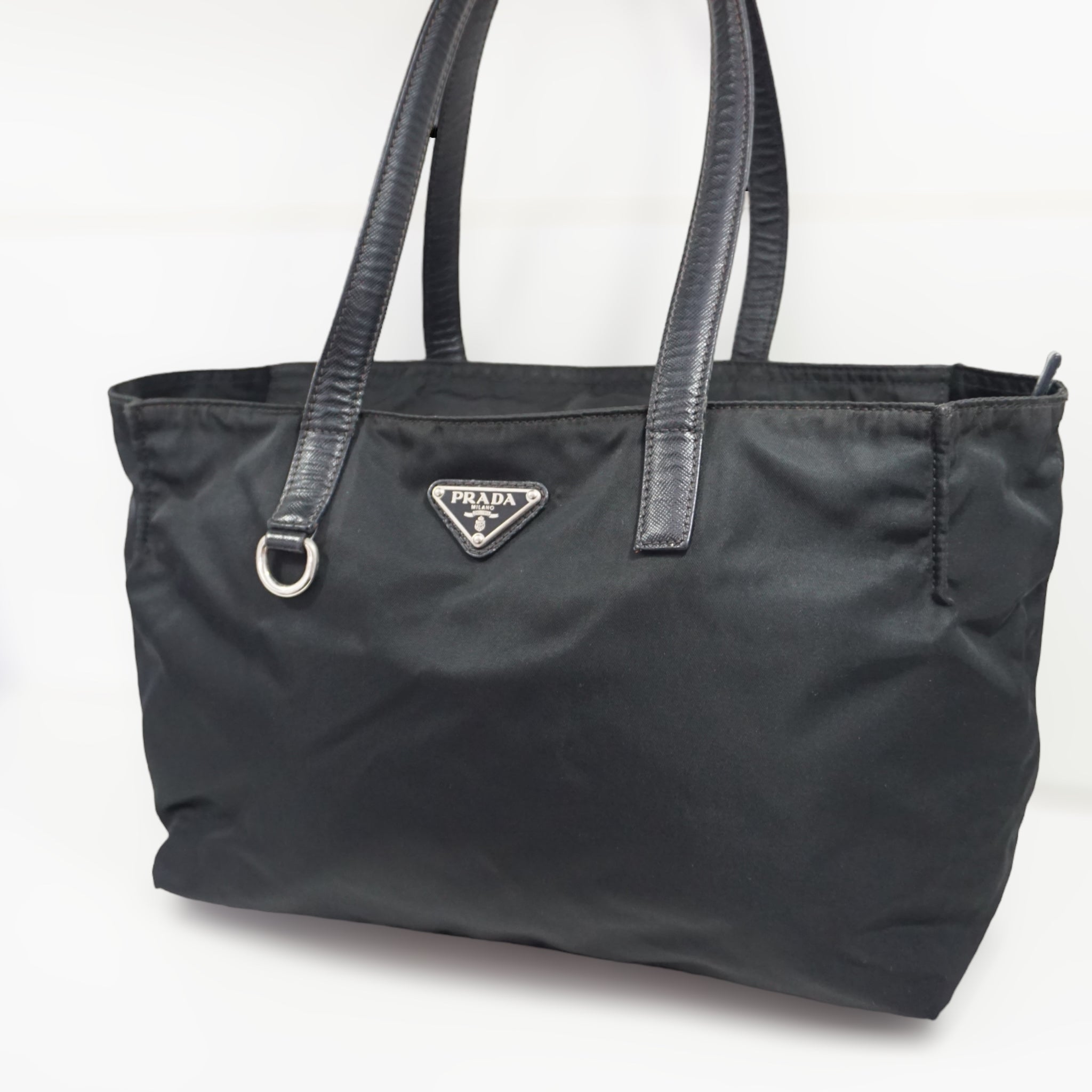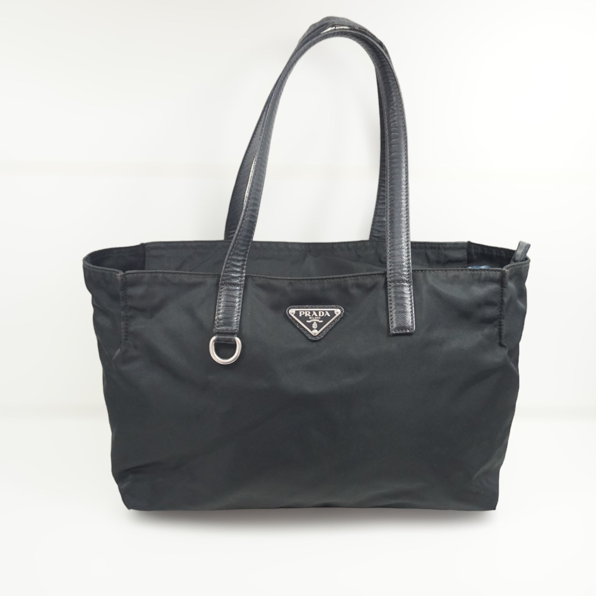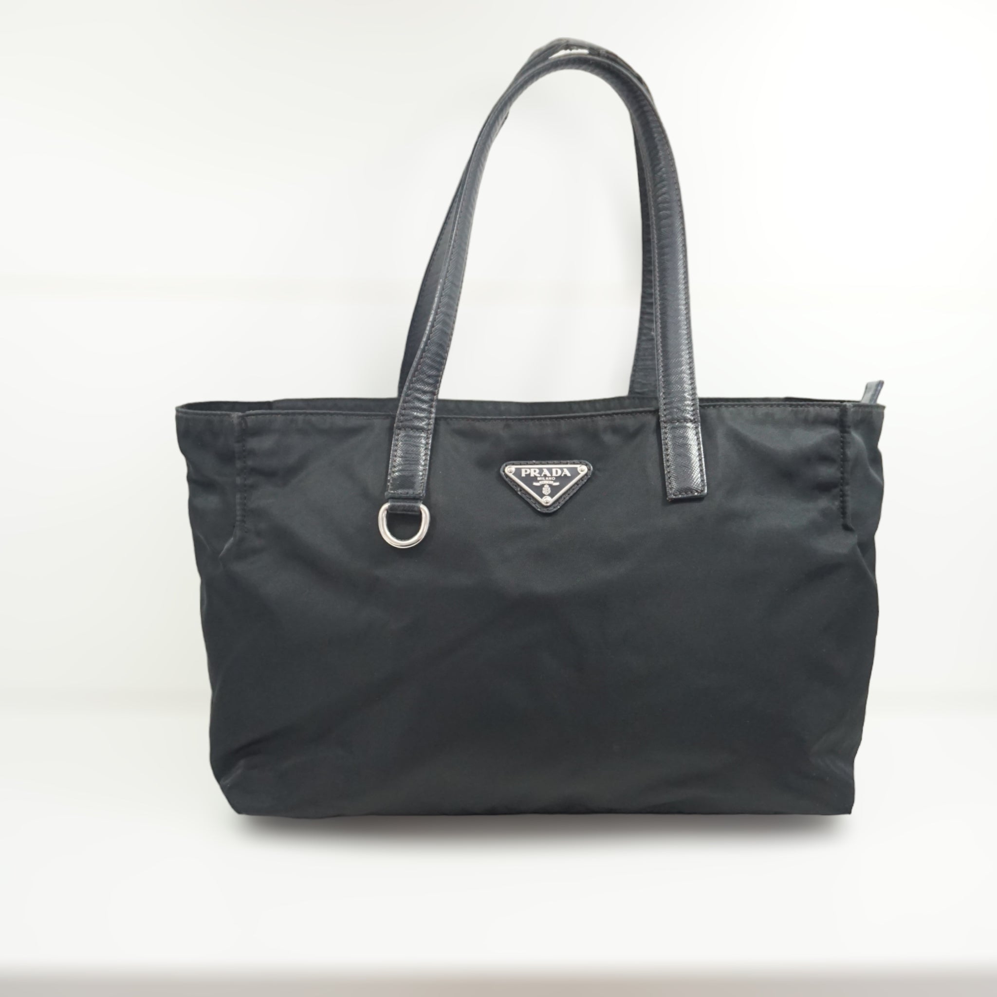 Klassisk sort Prada skuldertaske i nylon og læder.