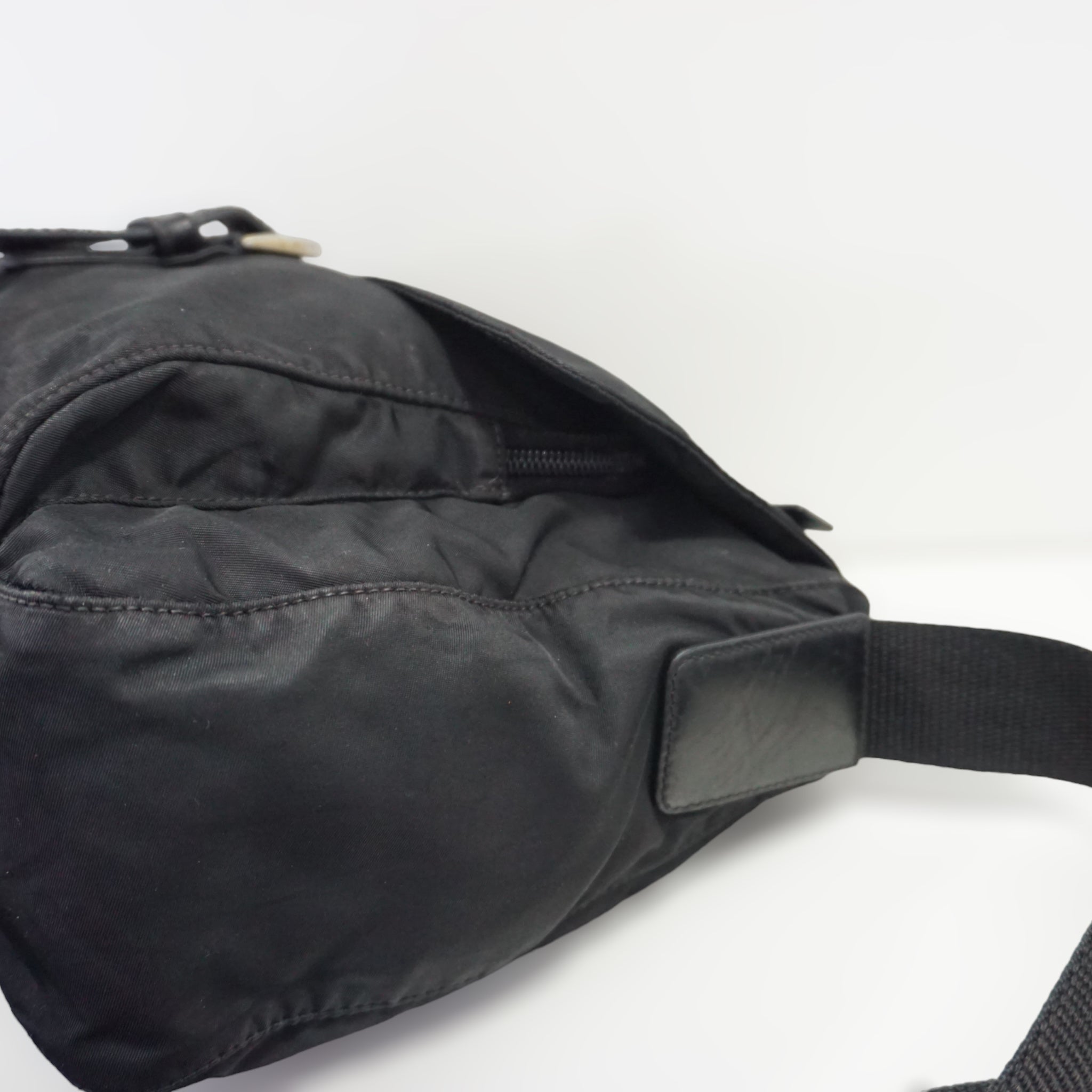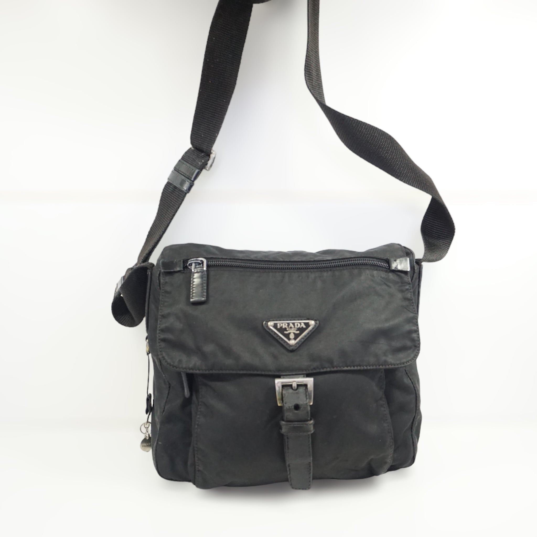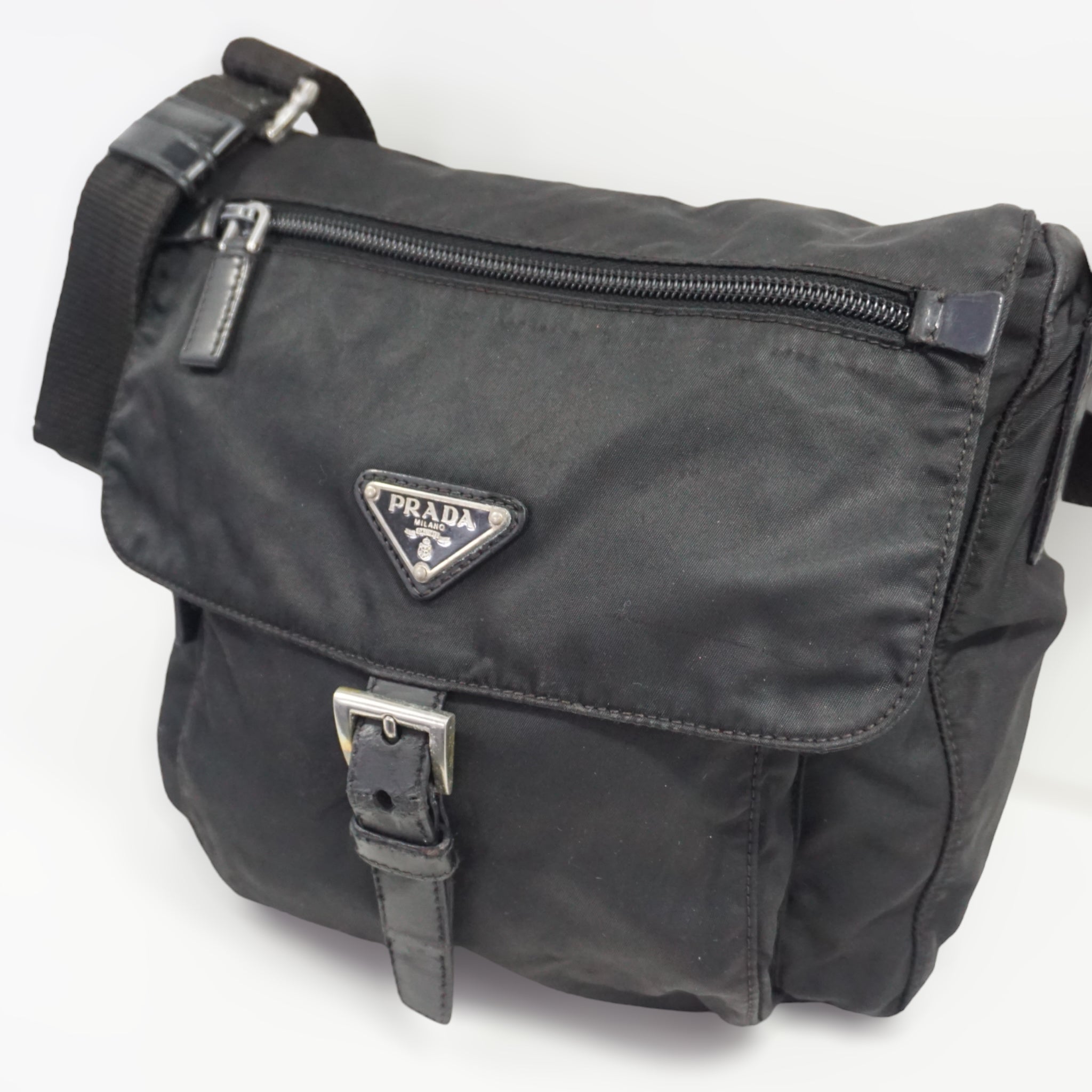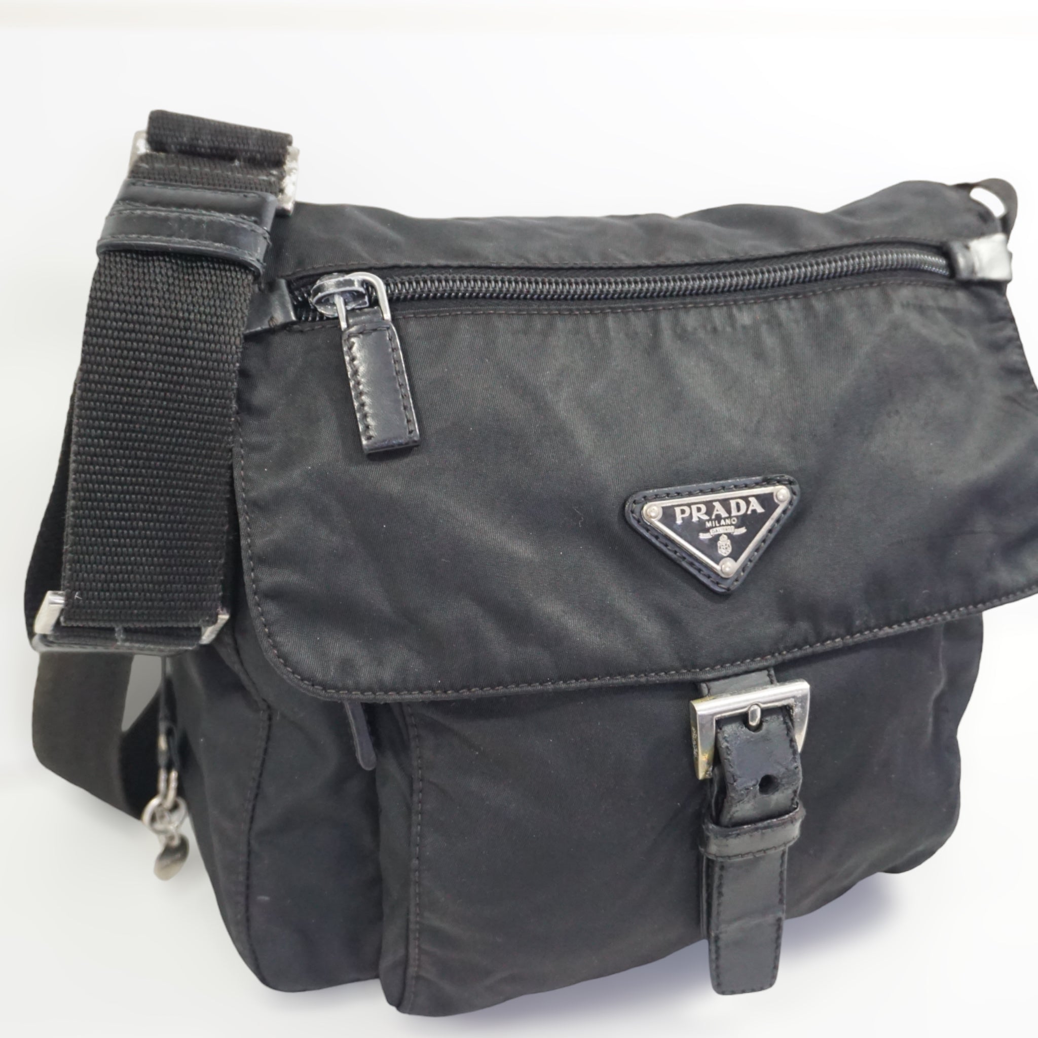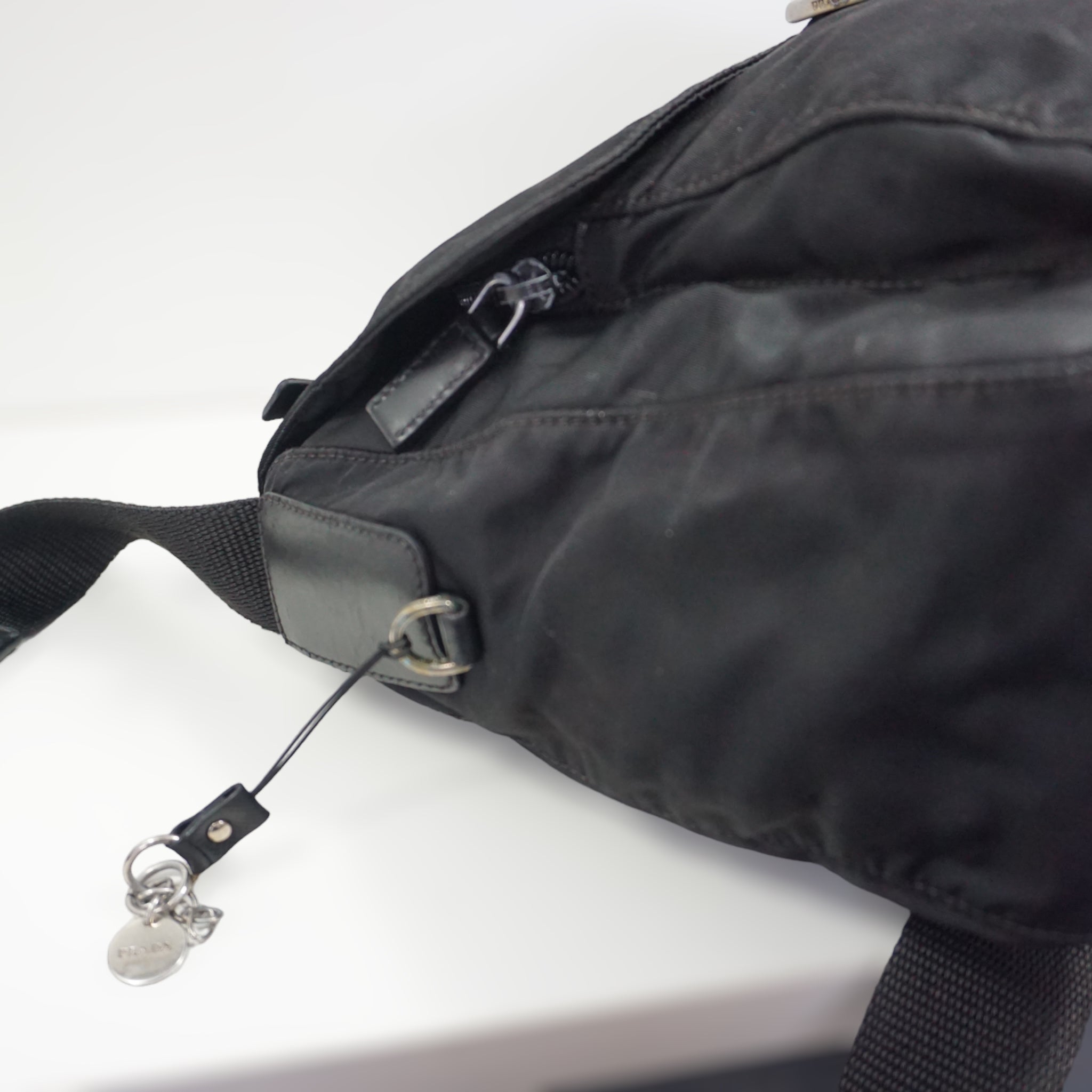 Klassisk Prada Tessuto Crossbody i sort nylon og læder. Skulderremmen er justerbar