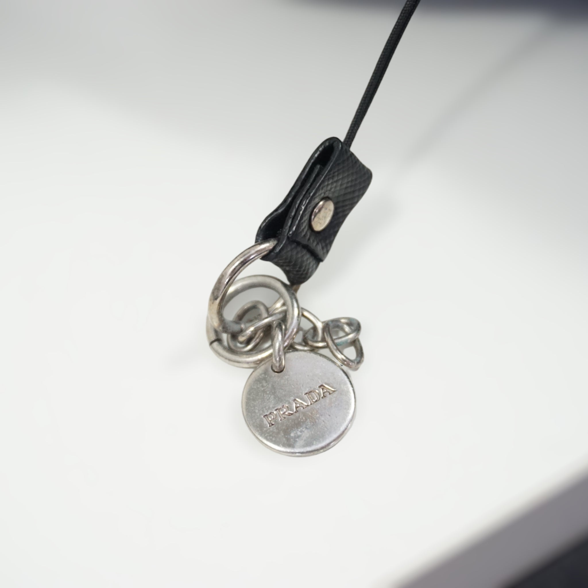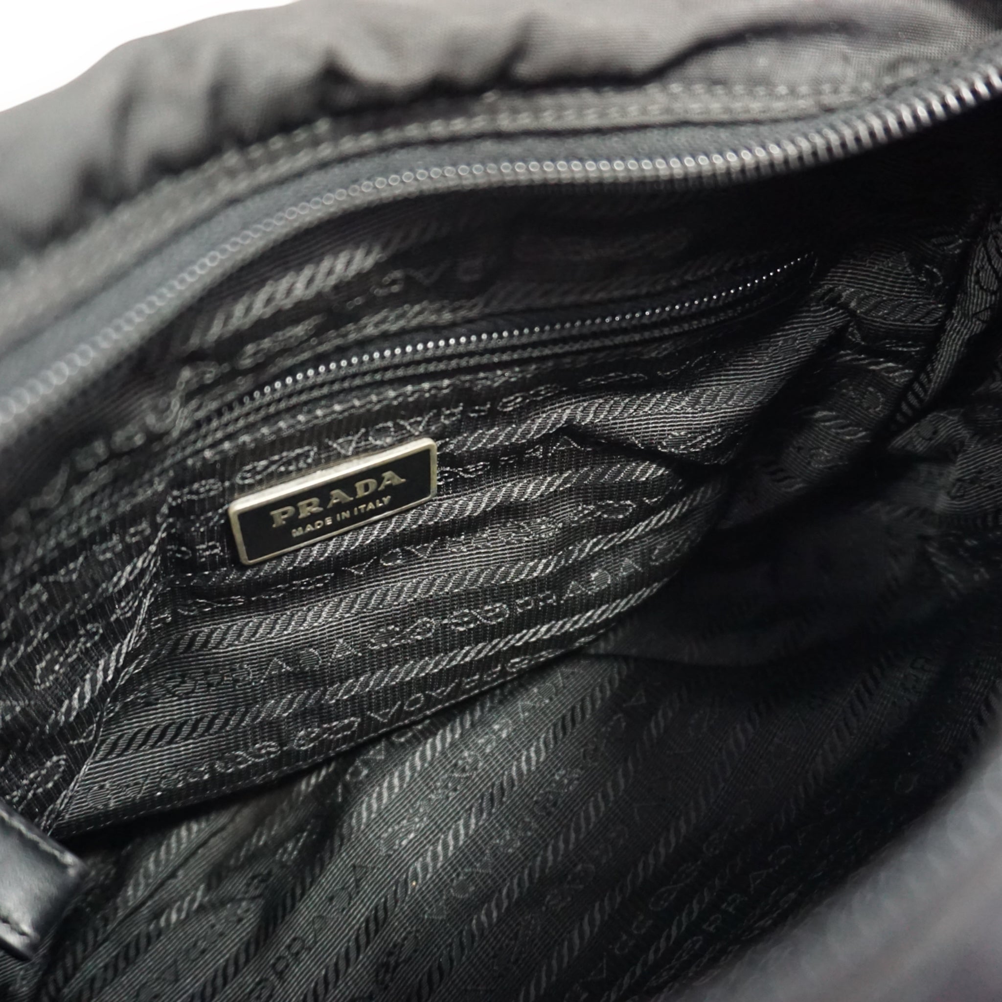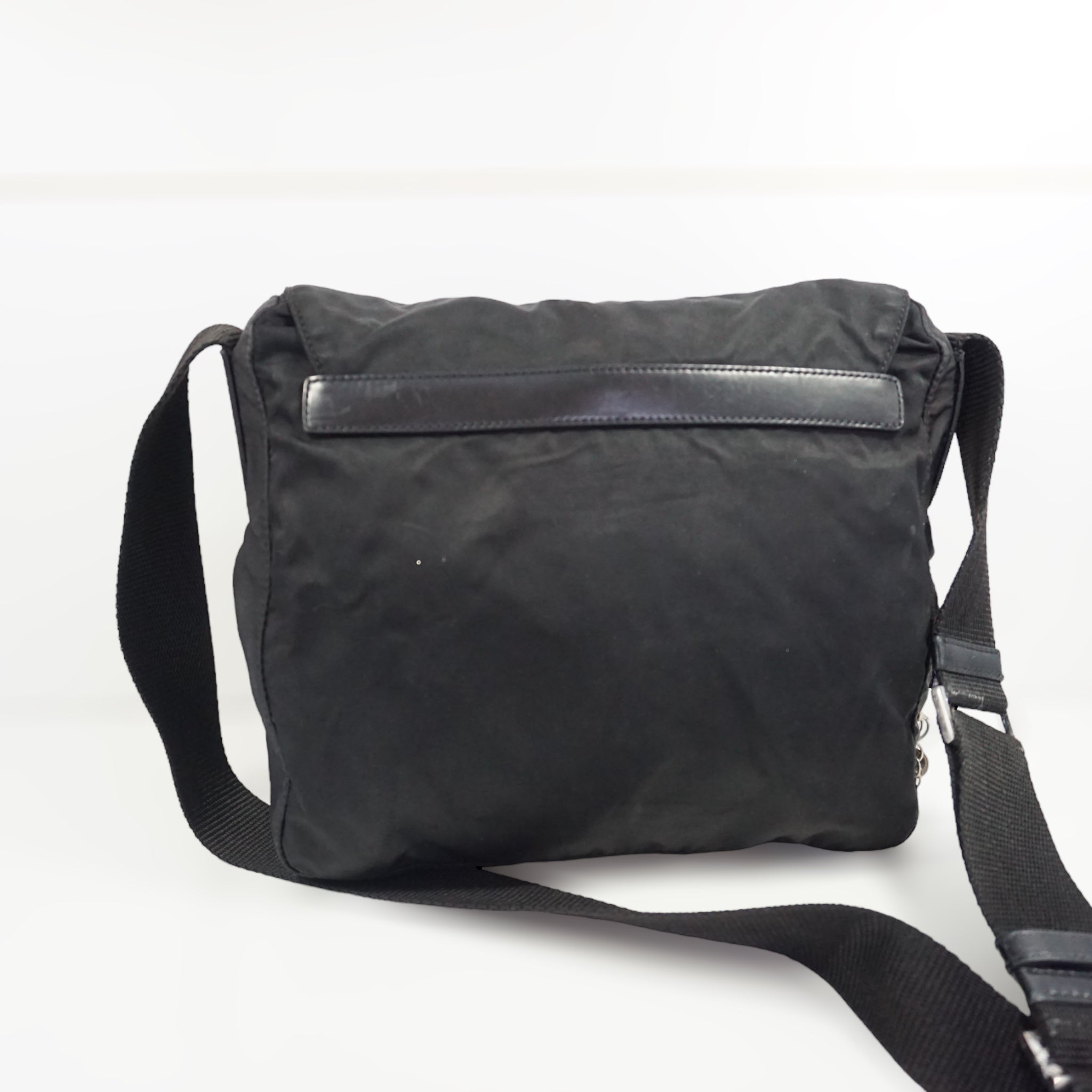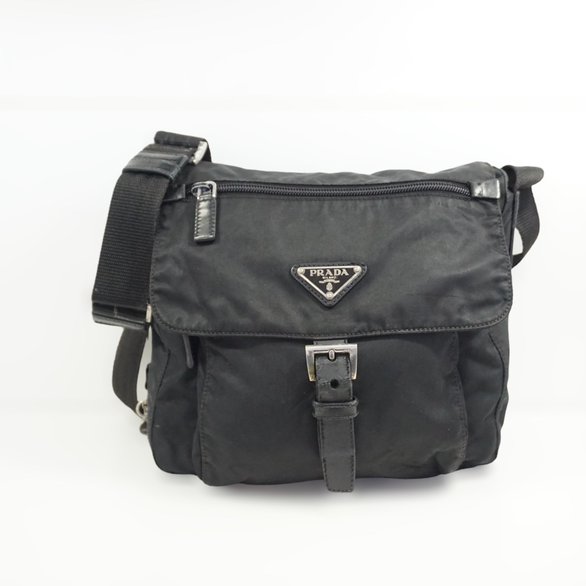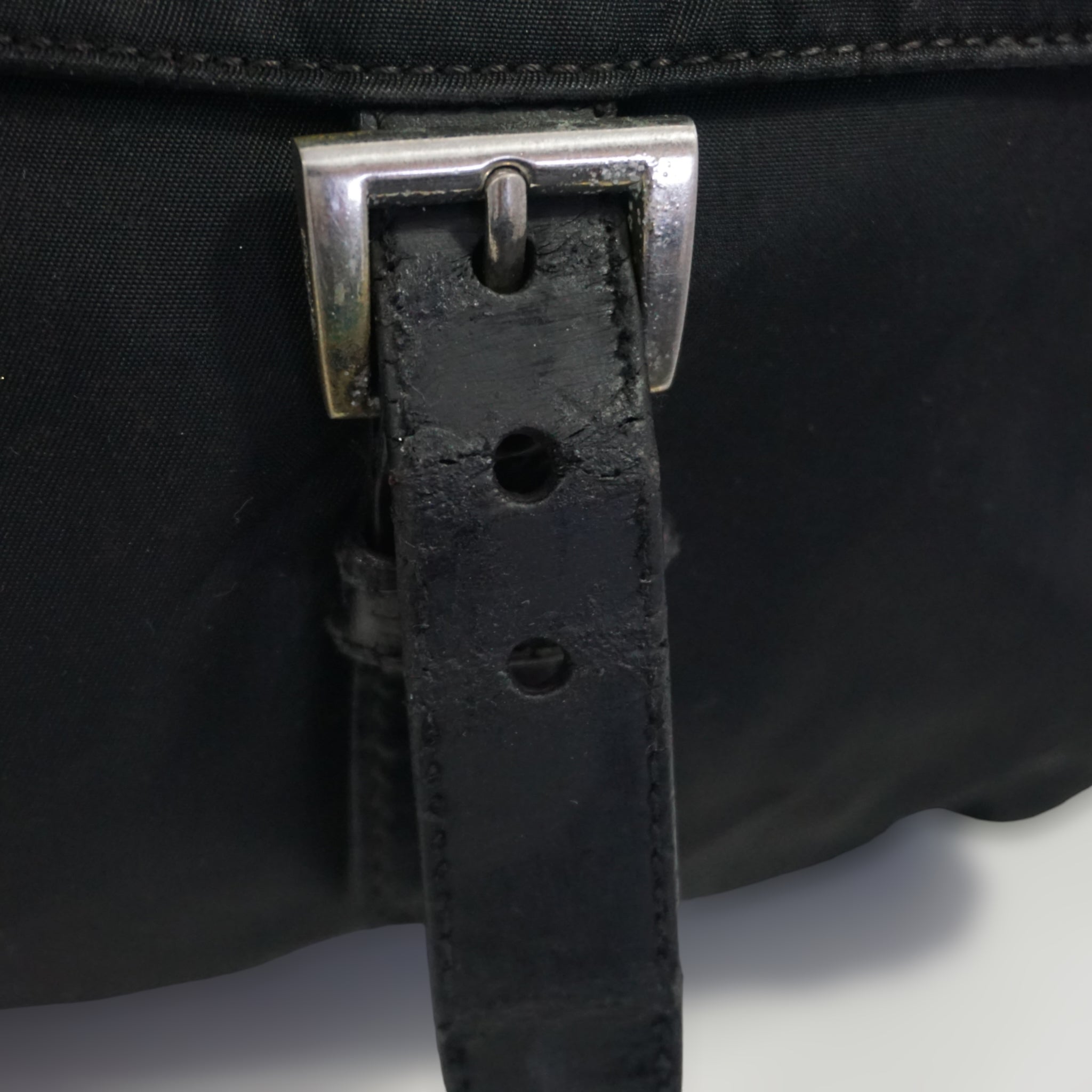 Klassisk Prada Tessuto Crossbody i sort nylon og læder. Skulderremmen er justerbar